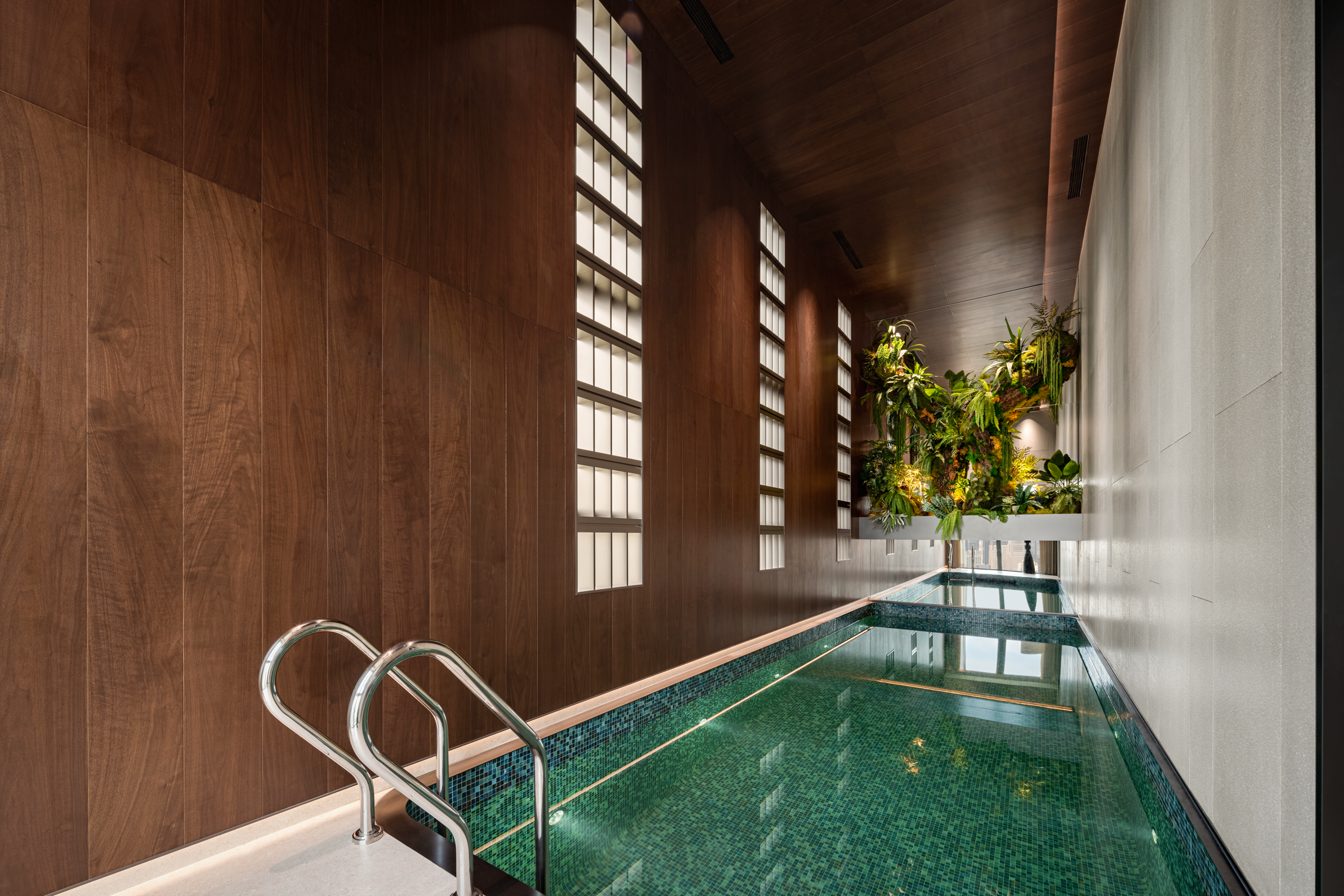 池边的深绿马赛克与绿植相映成趣,选的是雨林溪涧的色调,水下灯一打开,水色裹着绿植的影,游起来像钻在自然的溪谷里,而非冷冰冰的“游泳容器”。