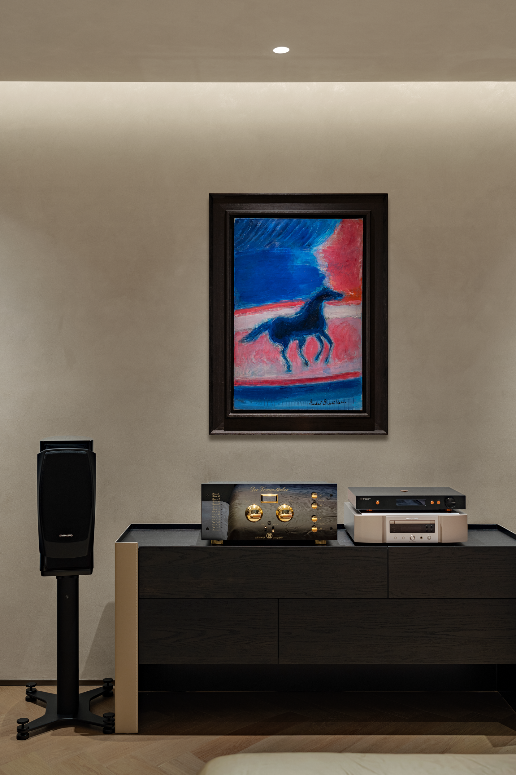 而墙上的画与黑胶音响搭得刚好,画里的动与音响的静裹在一块儿,睡前放首歌,像连画都跟着旋律轻晃,把冷调空间焐软了。