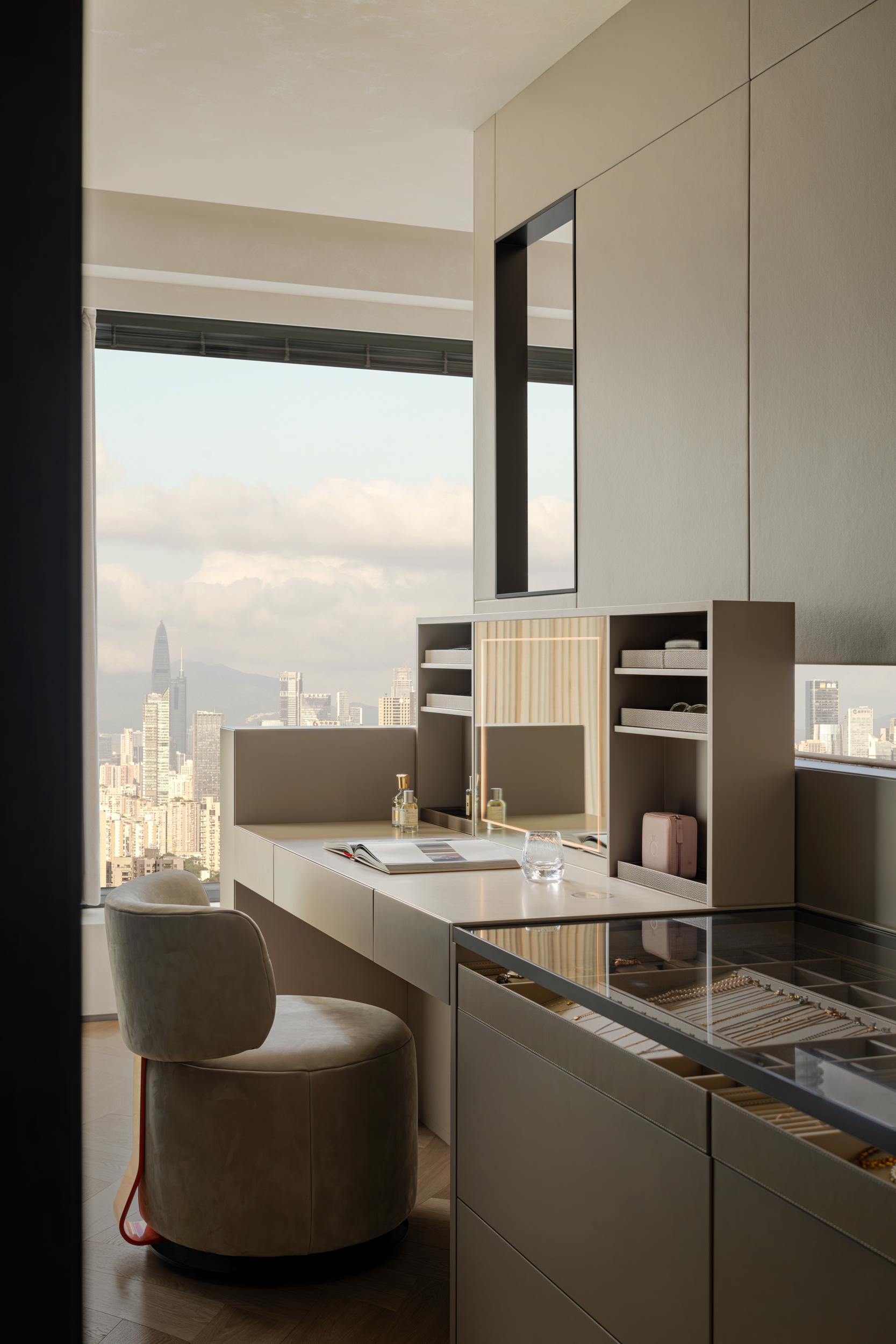 化妆台的玻璃收纳是女业主的心头好,首饰和香水瓶能一眼瞧见,不用摸黑翻柜,镜子的灯嵌在框里,不晃眼更贴心。墙上悬挂的Andre Brasilier画作,粉色天空、如梦似幻的蓝,源自对生命的热爱,让空间满是艺术张力。