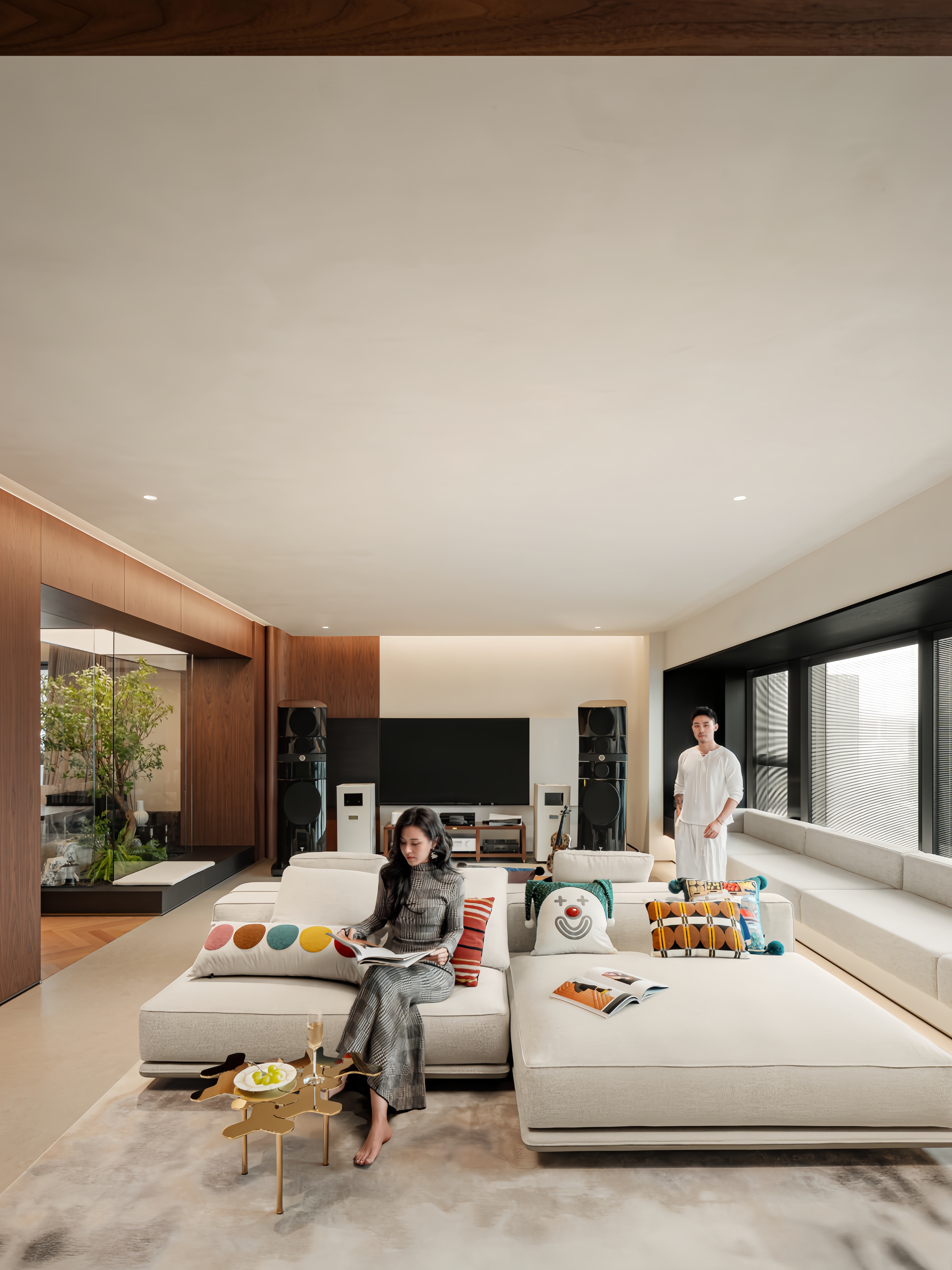 音乐在屋内回放,仿佛回放的是这二十余年恩爱时光的胶片。角落的小水吧丰富了空间的烟火气,卸下所有的疲惫,让每一个晨昏都过得从容安心。