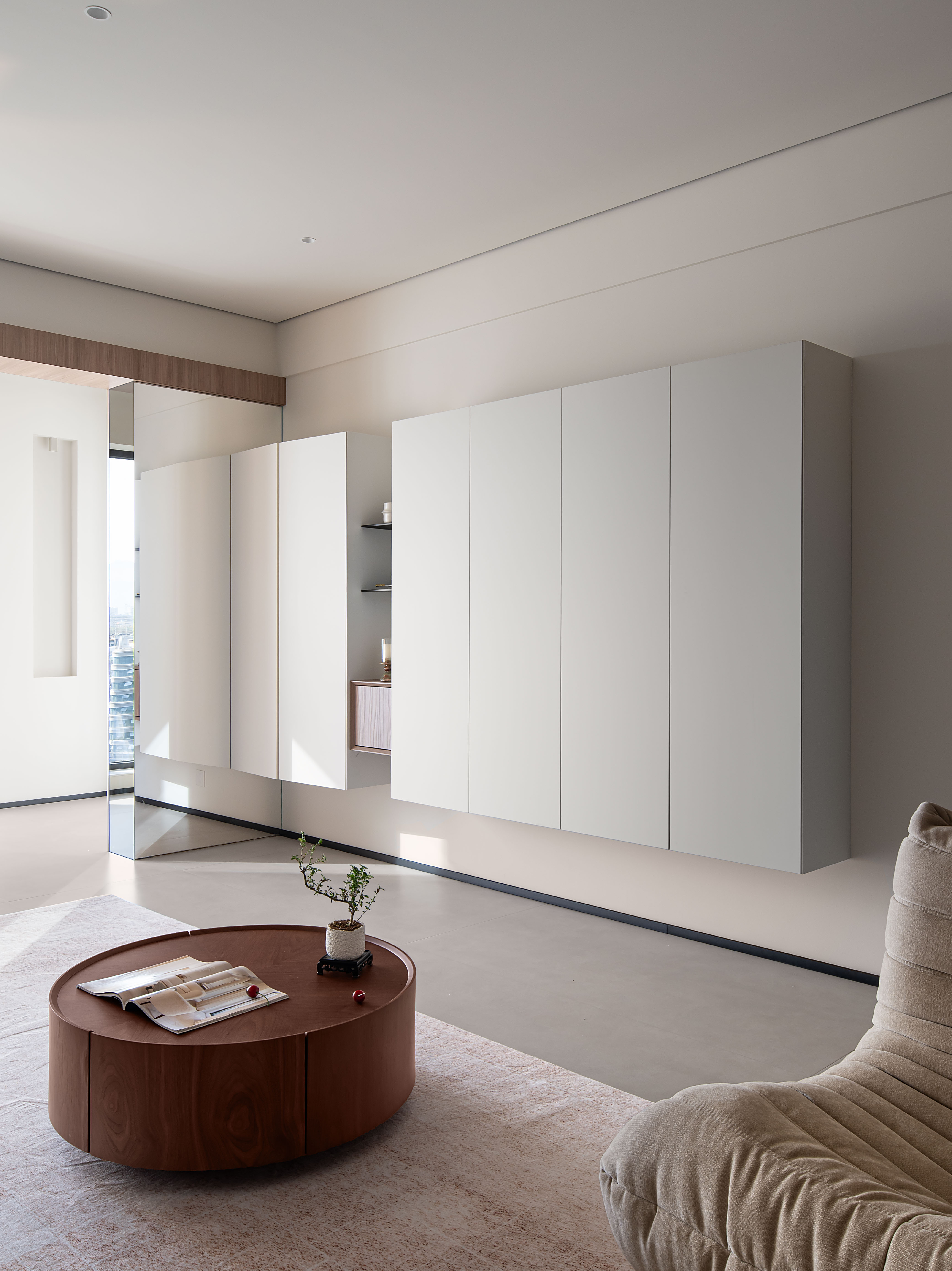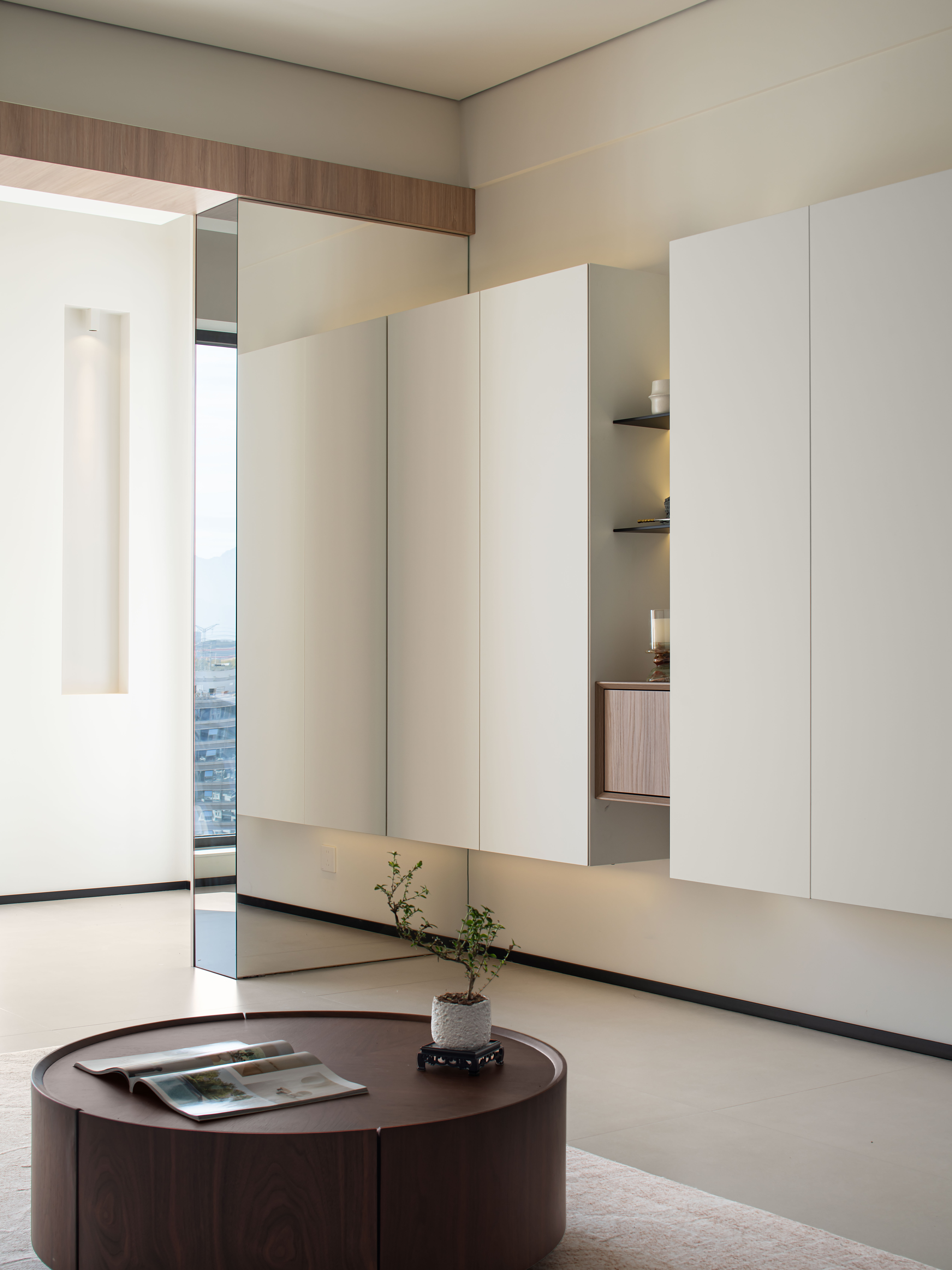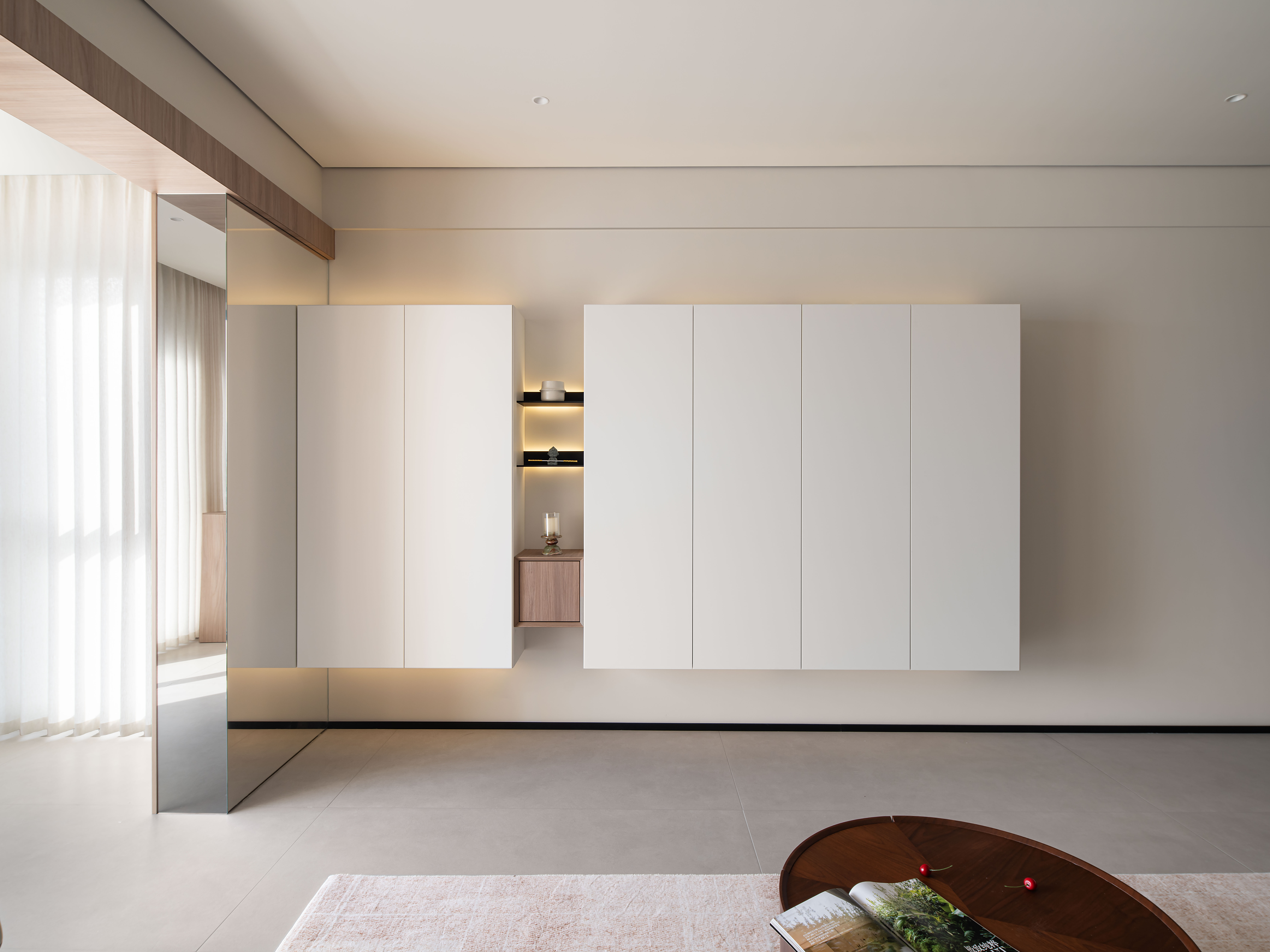 3对阳台承重柱做镜面处理,消隐掉墙体存在感;在沙发背景墙设置壁龛,增加设计层次性