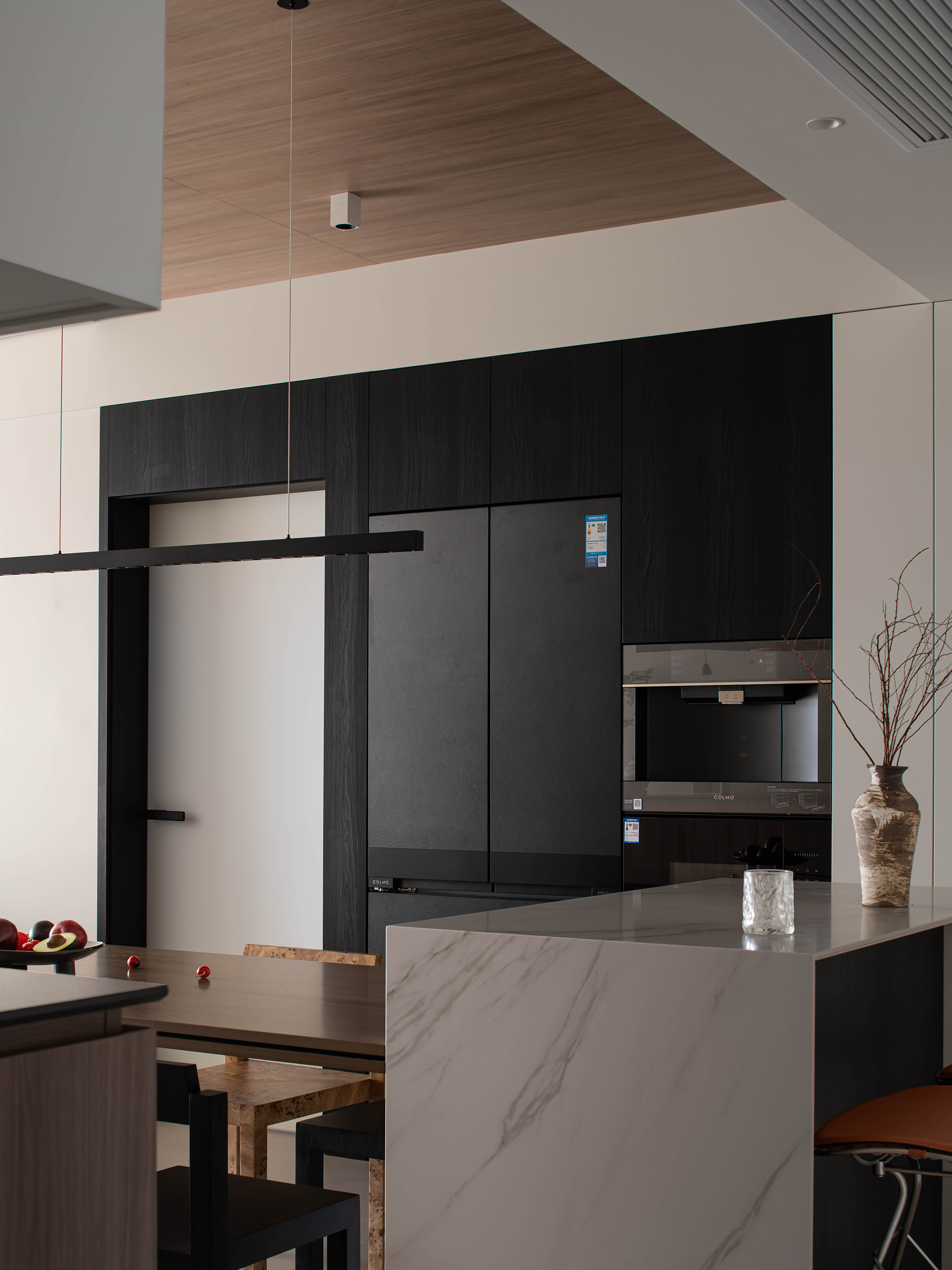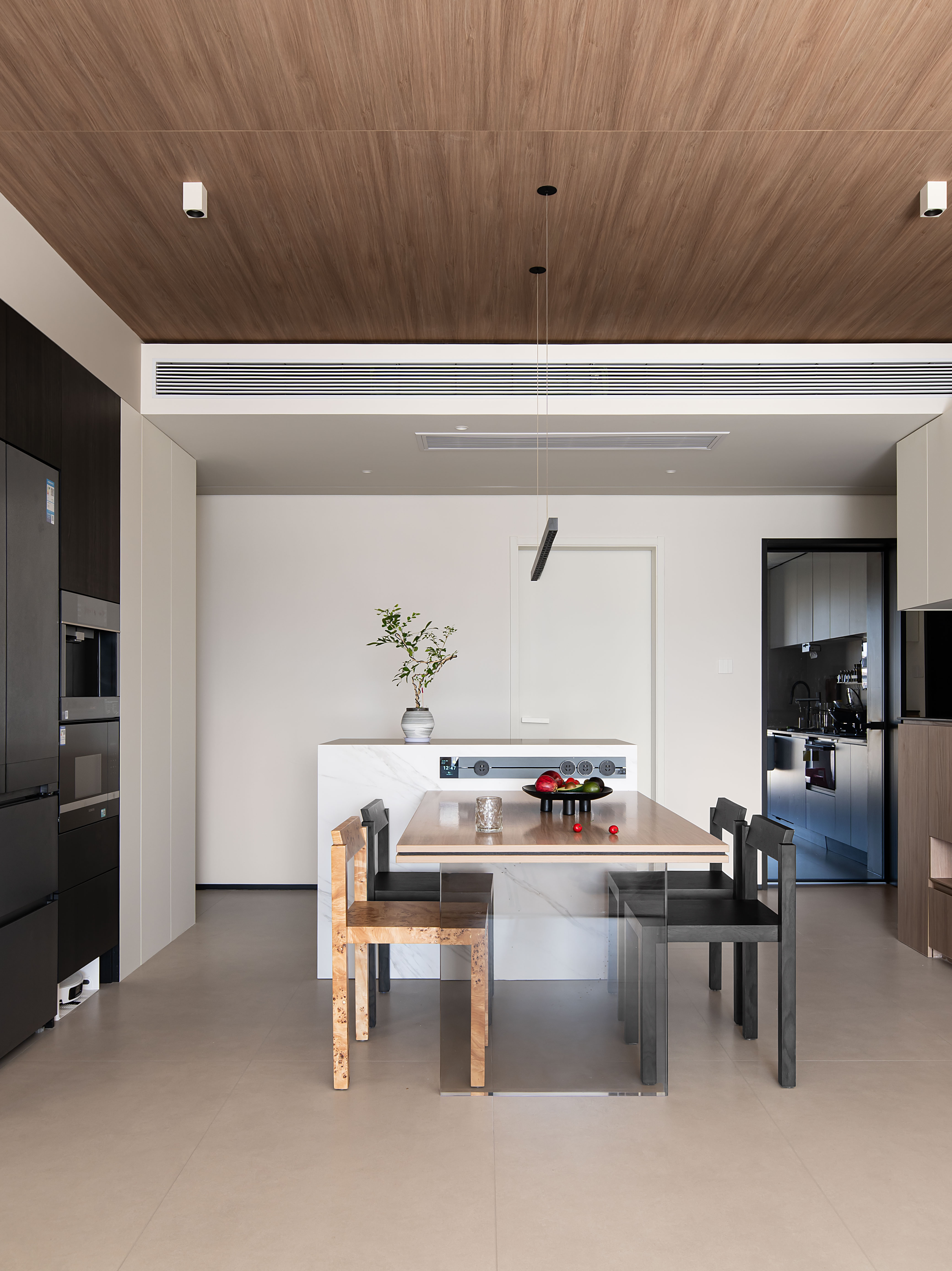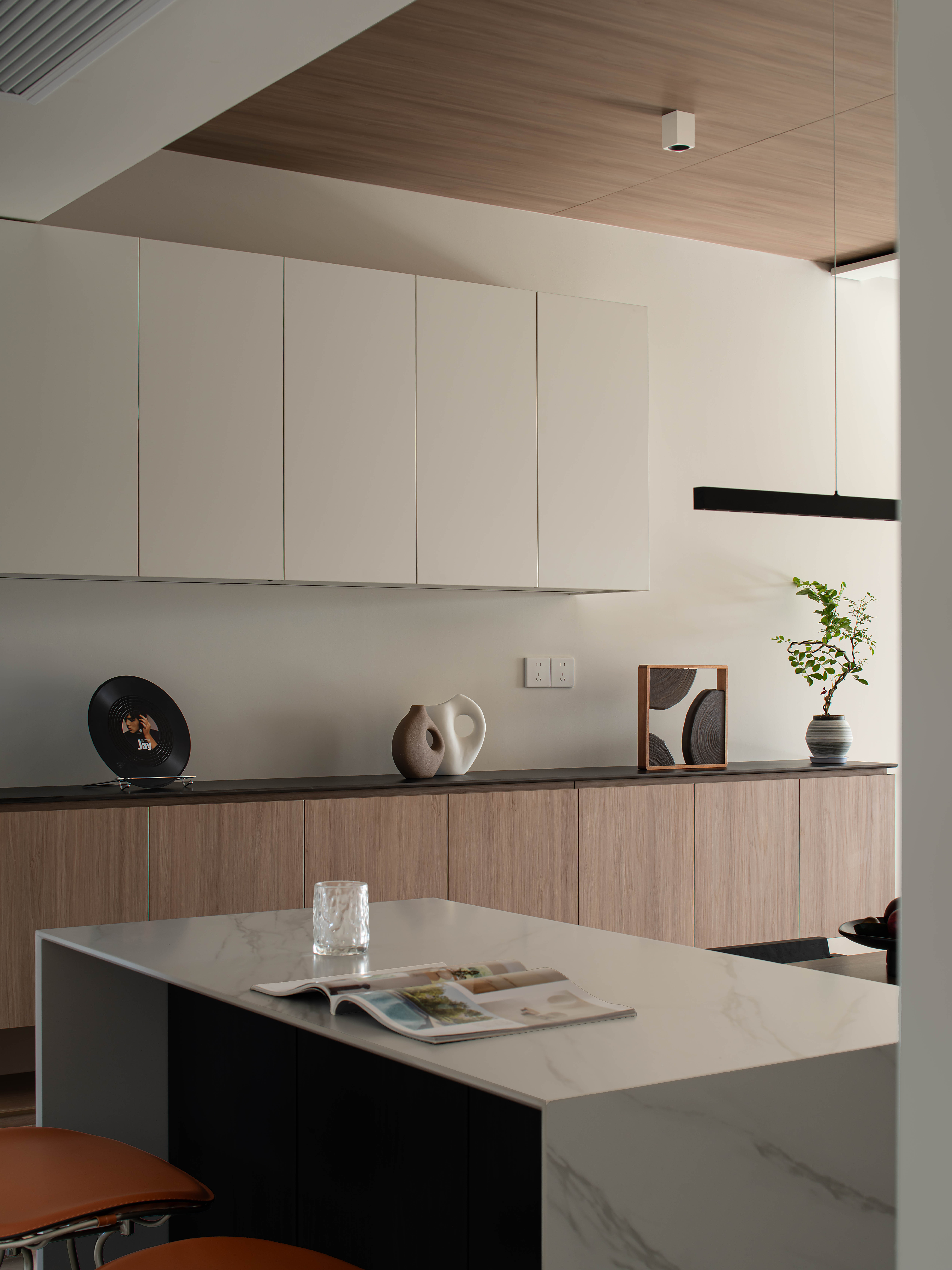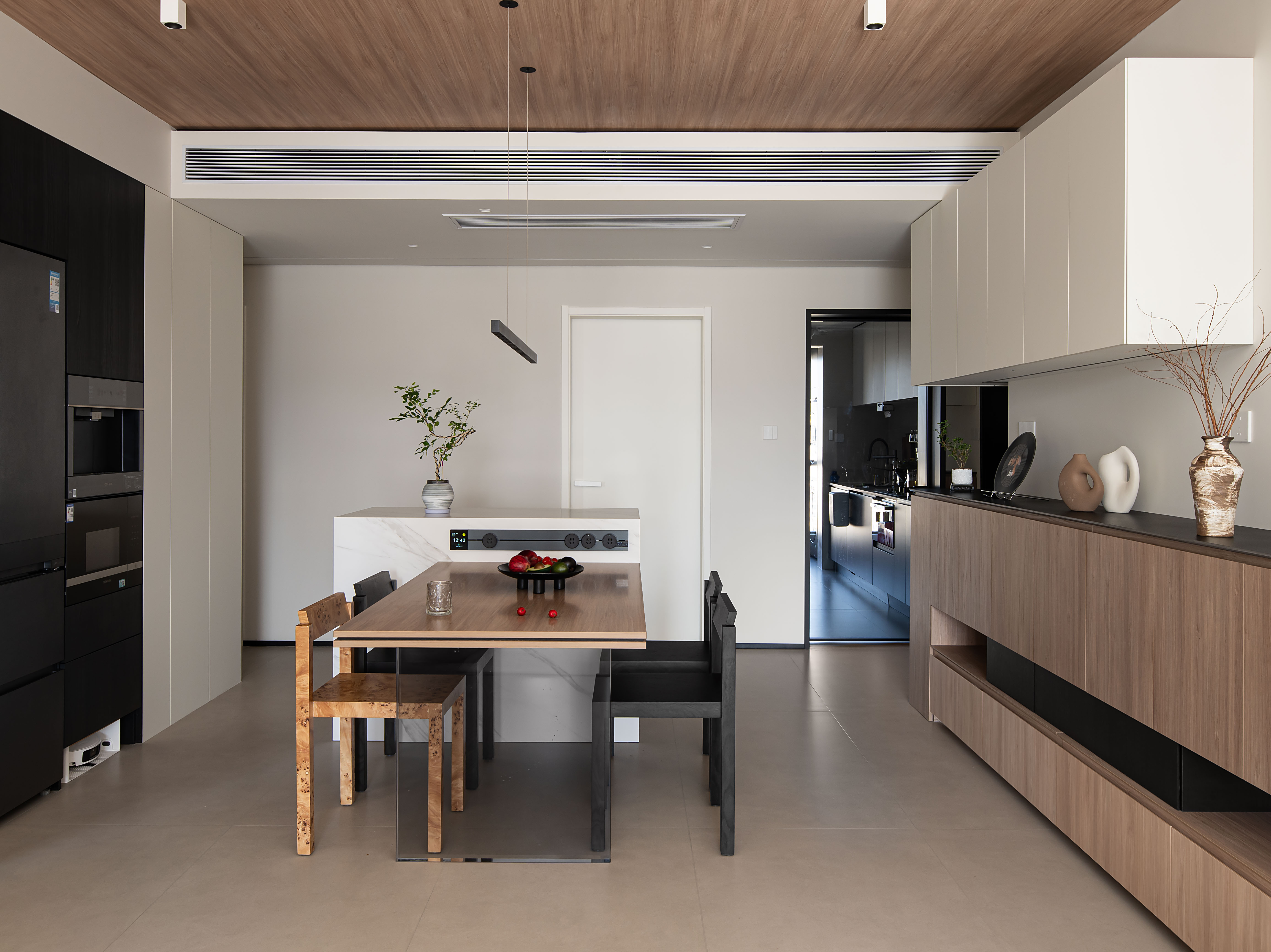 以温润的原木(顶面、柜体)、细腻的微水泥地砖为基底,大胆融入黑色、大理石岛台,冷硬材质与自然材质形成视觉对冲,却通过低饱和度的色彩统一调性,让简约风跳出“单一材质”的刻板印象,增添轻享感。