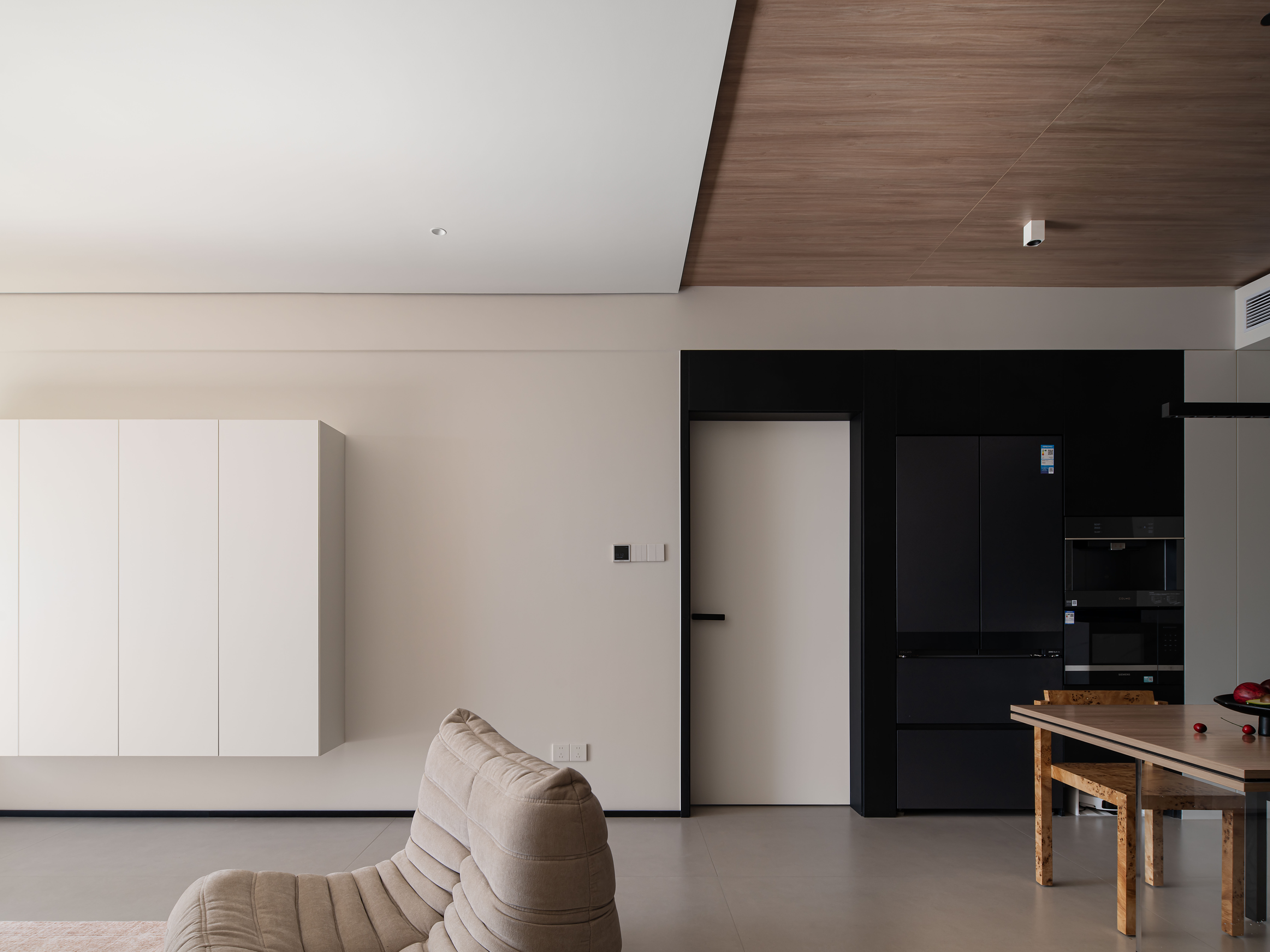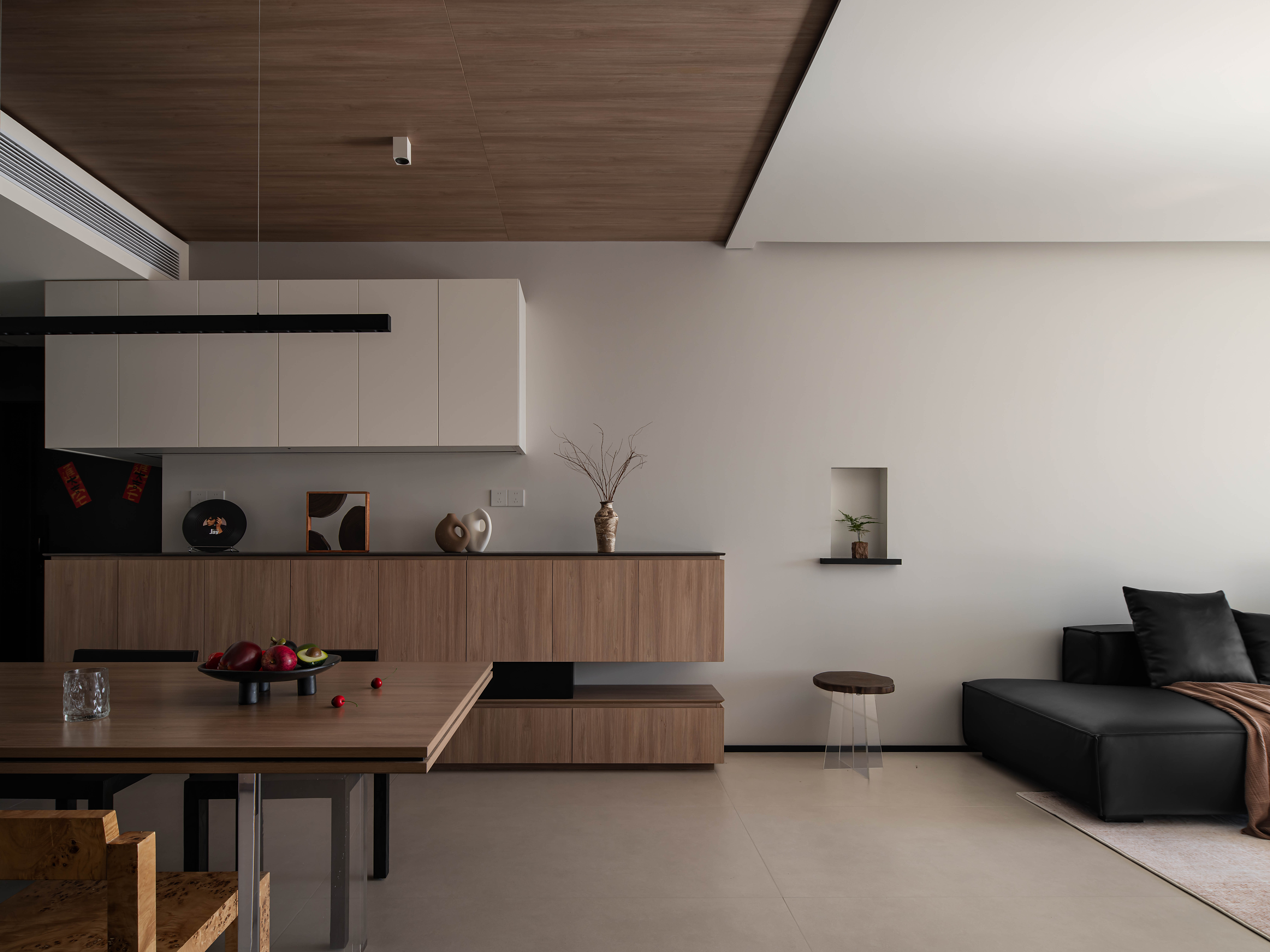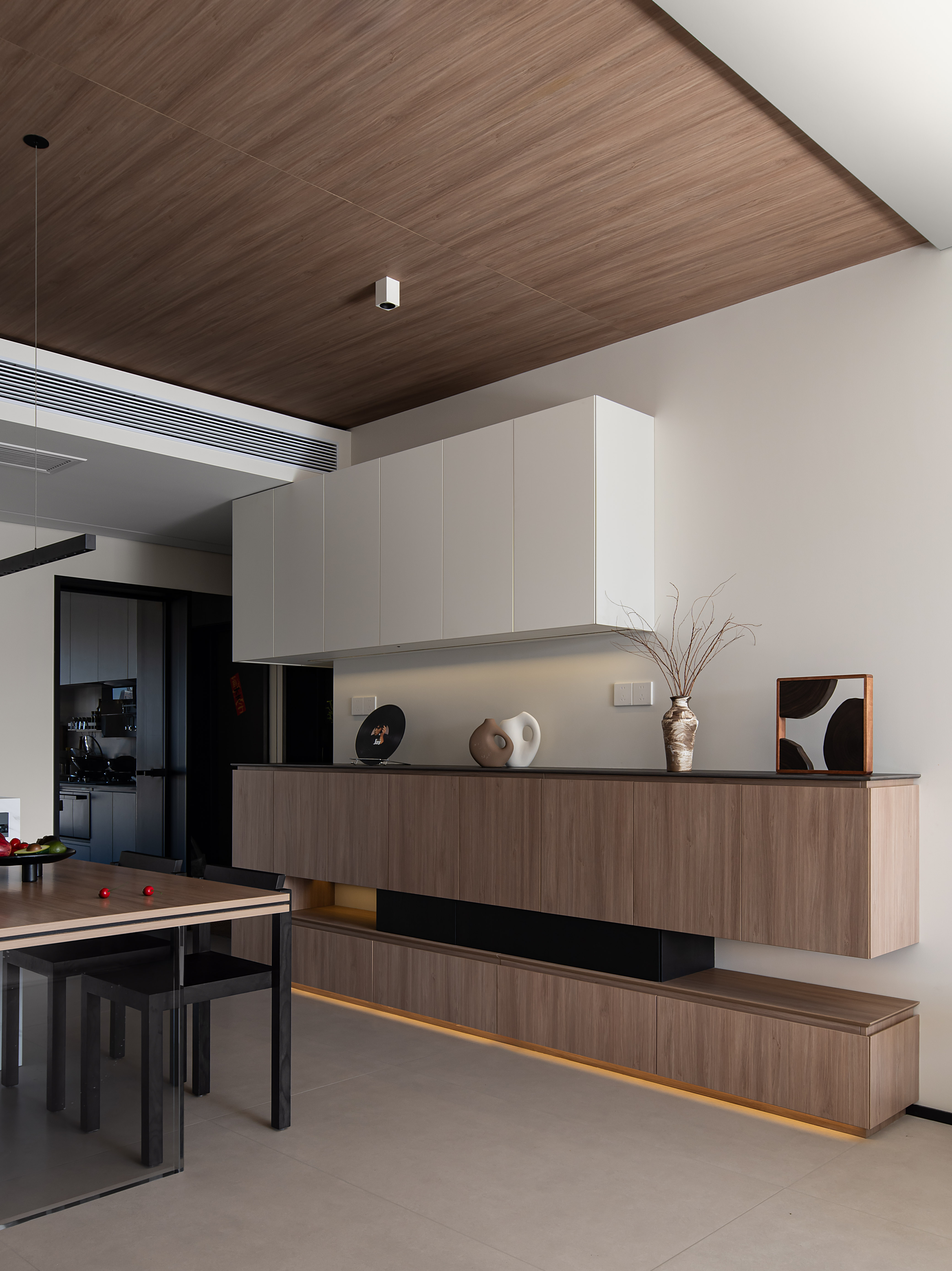 打破客厅、餐厅、厨房的物理隔断,以开放式布局实现空间动线的流畅衔接;同时利用柜体的高低错落、顶面的分区域材质设计,在“无界”中形成视觉分区,既满足现代家庭的互动需求,又保留了各功能区的独立属性,让复合型生活场景更具实用性。