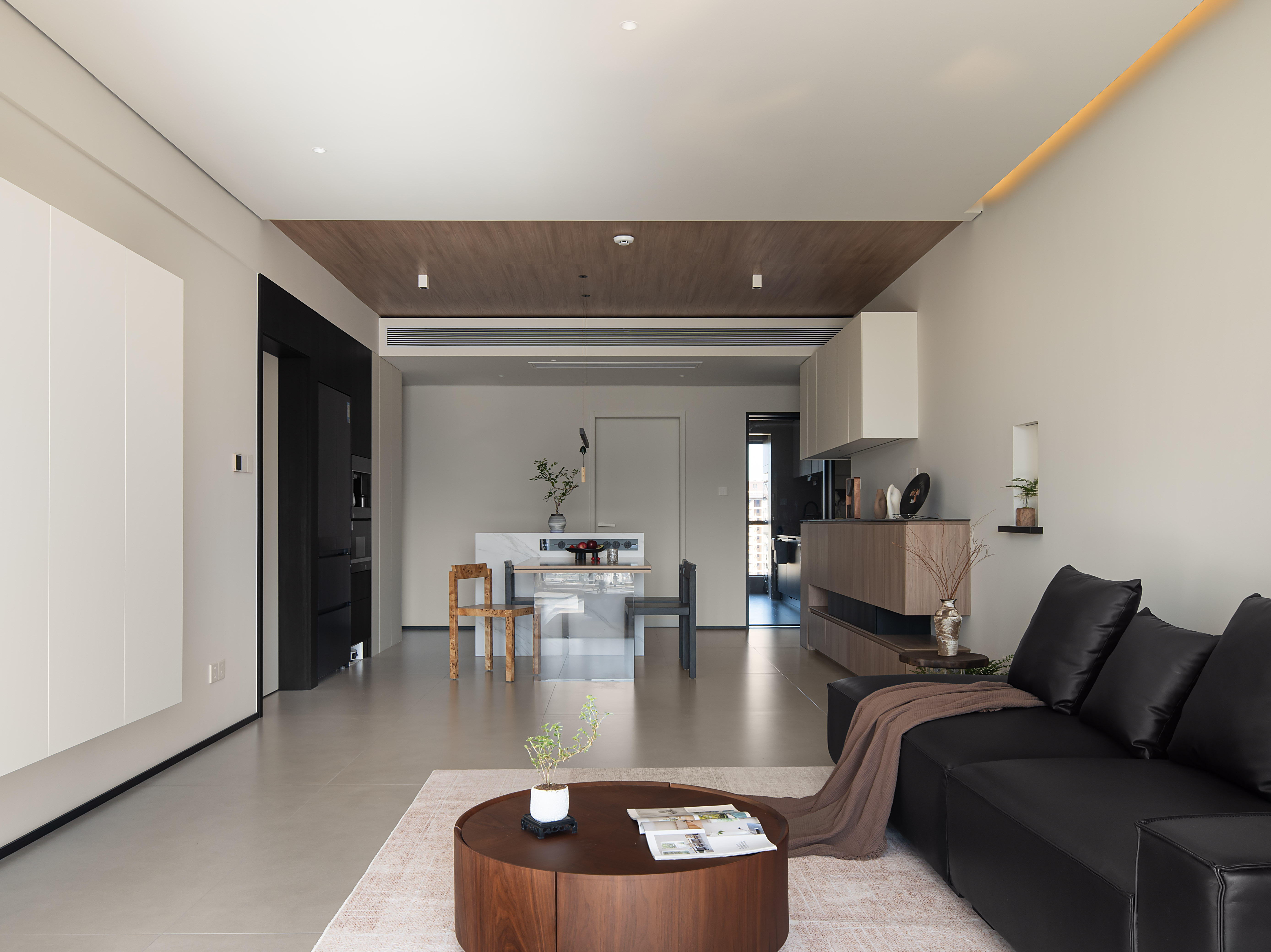 2.视觉引导与弱化,采用三段式吊顶设计,通过材质与高低差异,让空间形成入户走廊、餐厅、客厅三大区域,强化空间递进感与连续性,弱化窄长视觉感受。