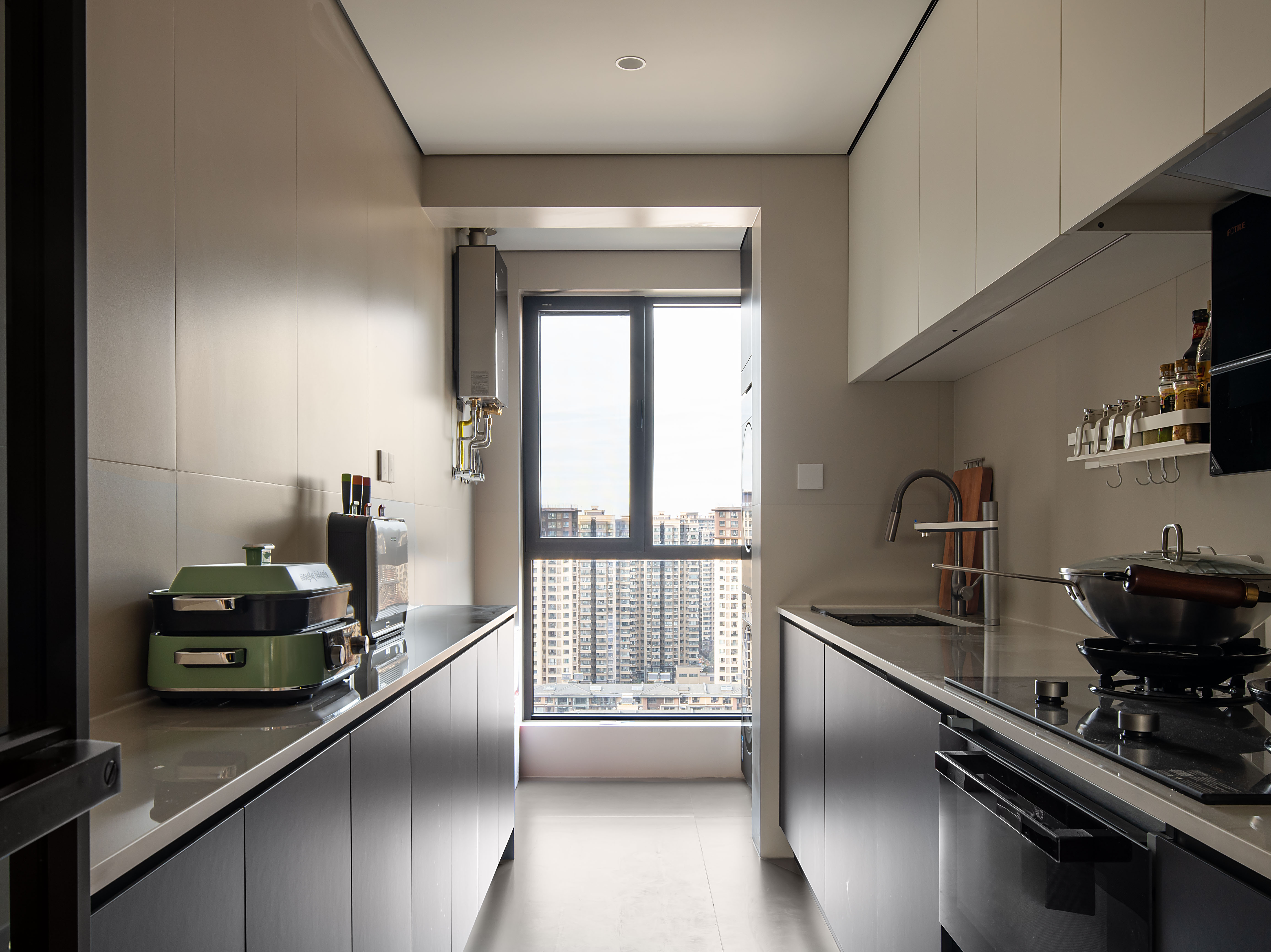 5.拆改厨房墙体,在极限空间里面、为单排橱柜 补充操作台面,满足日常使用需求。