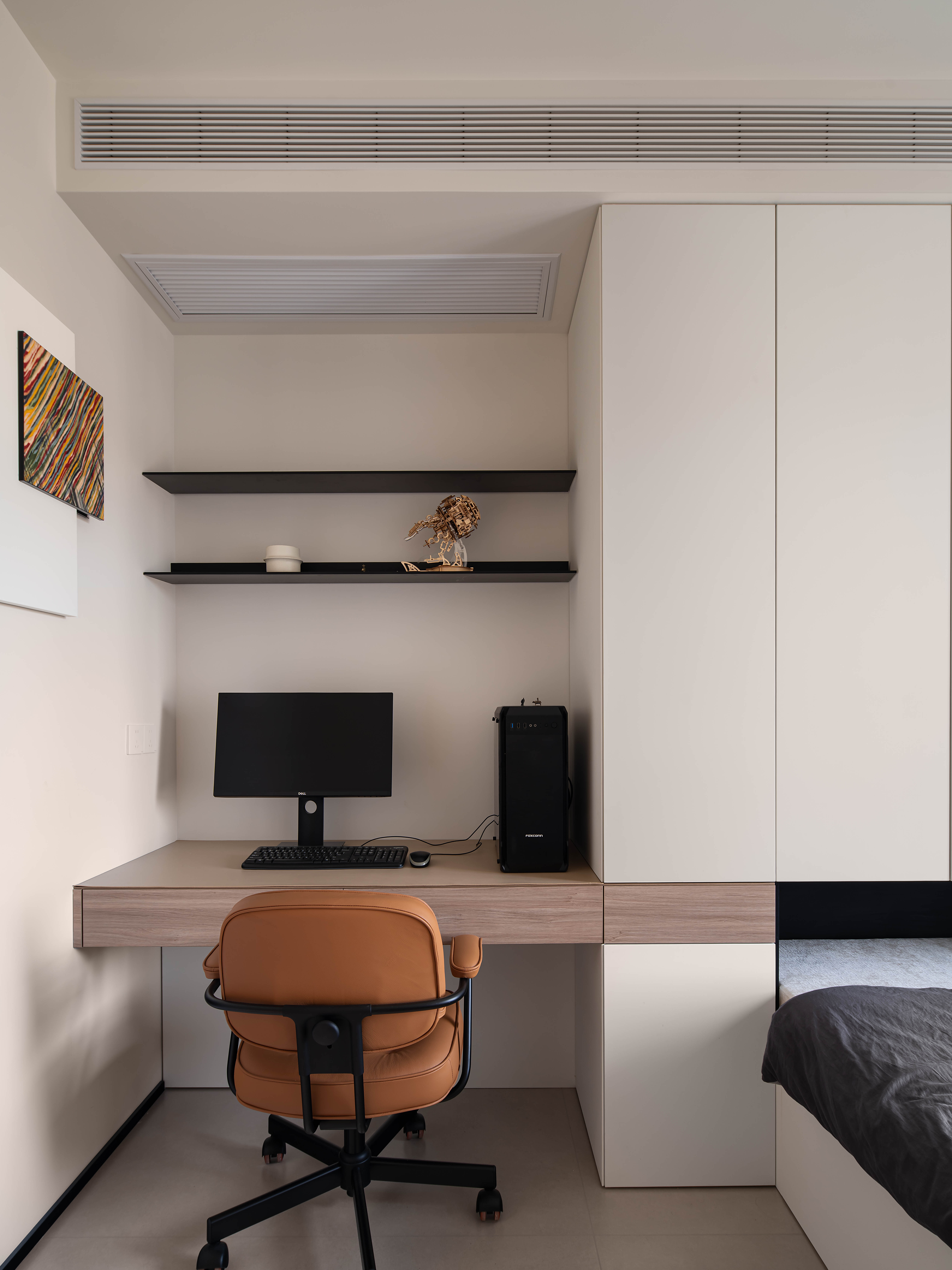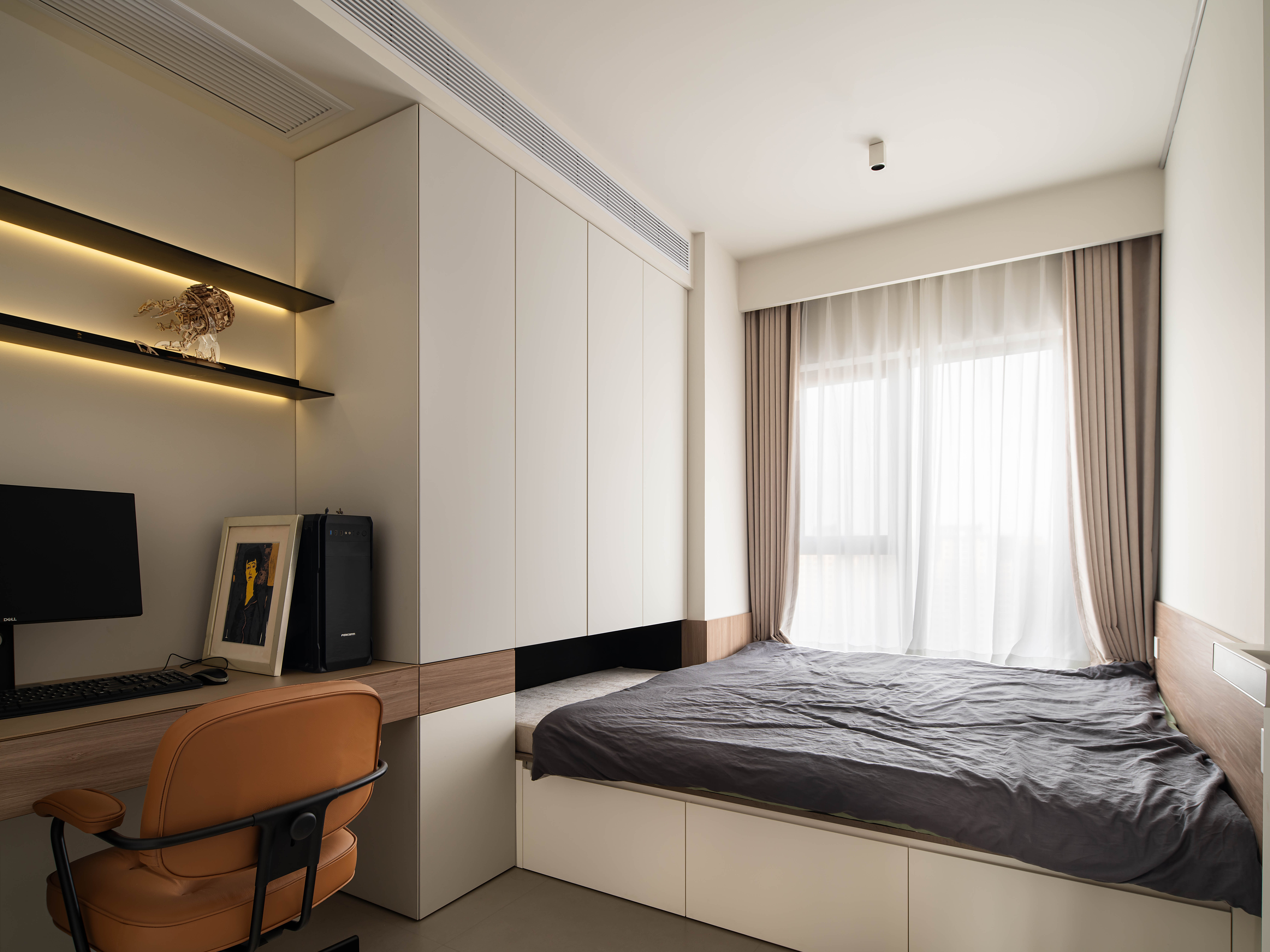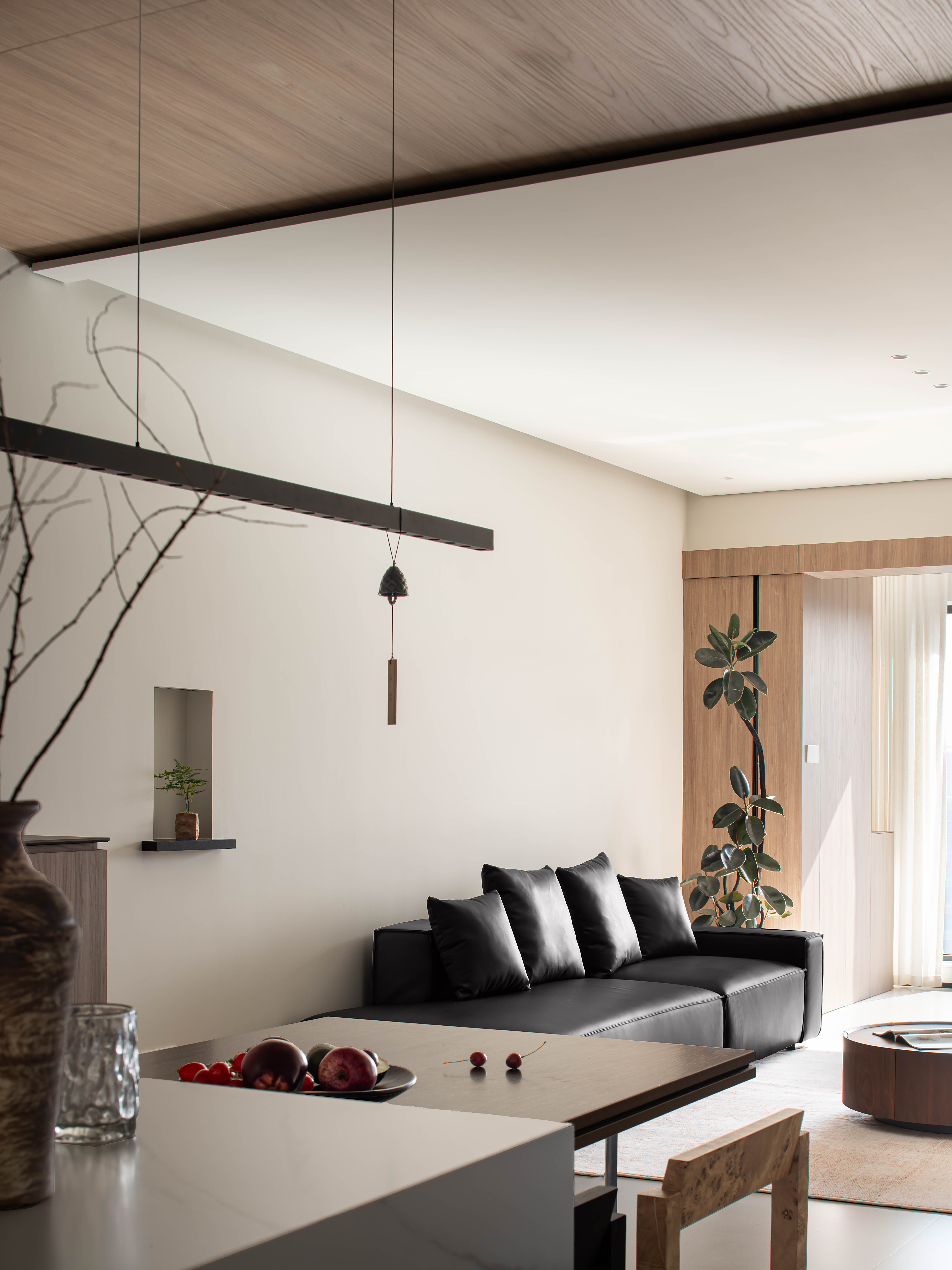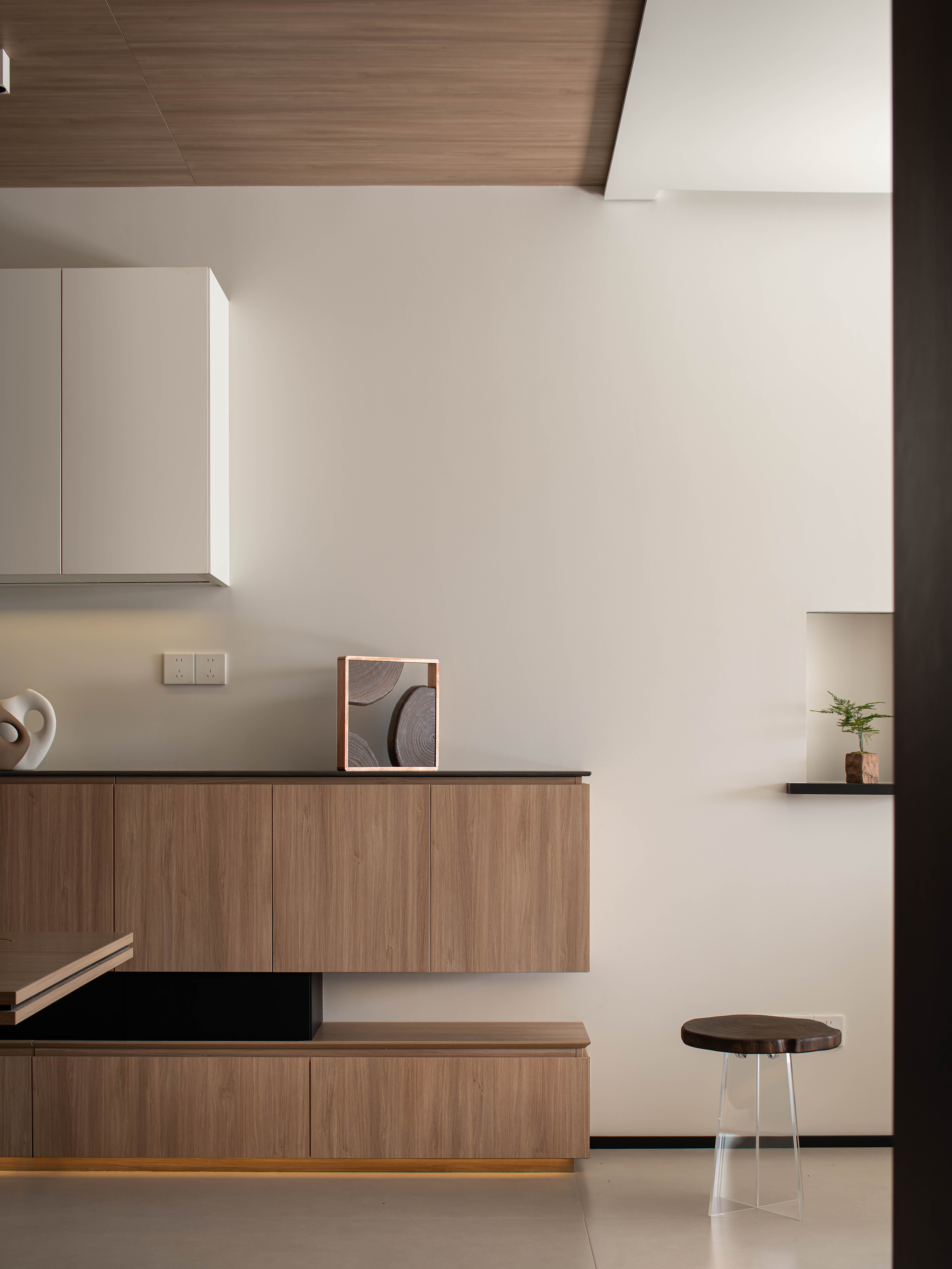 摒弃简约风常见的“极简装饰”,以小众艺术摆件、自然枯枝花艺、嵌入式壁龛绿植作为空间点缀,在极简的硬装框架里注入自然与艺术的叙事感;同时通过隐藏式灯光、隐形门设计强化空间的整体性,让“简约”不再是空洞的形式,而是有细节、有温度的生活载体。 -