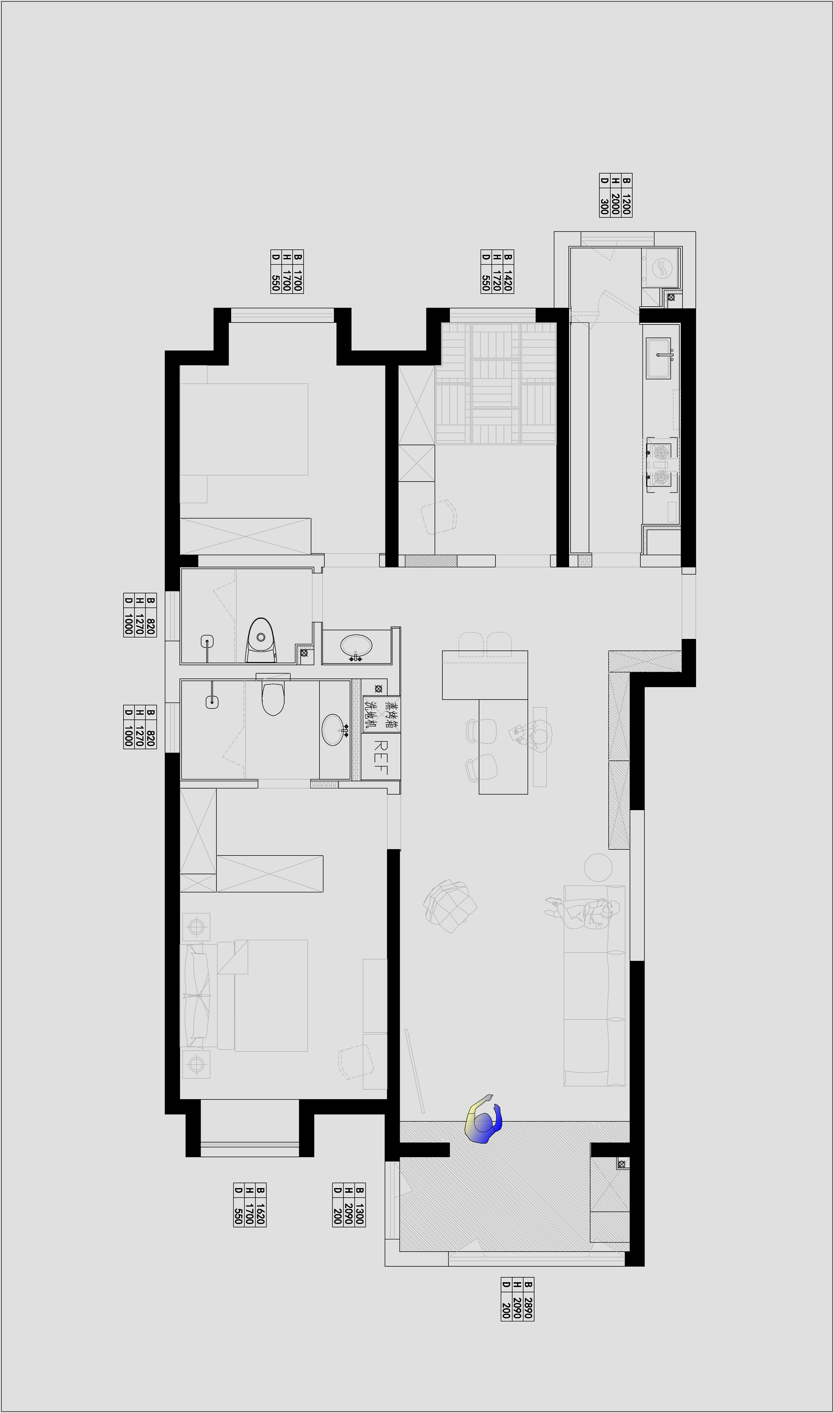 2. 客餐厅阳台空间比例失衡:宽度仅3.7米,长度却近12米,面宽比不足,易给人强烈的压抑感。