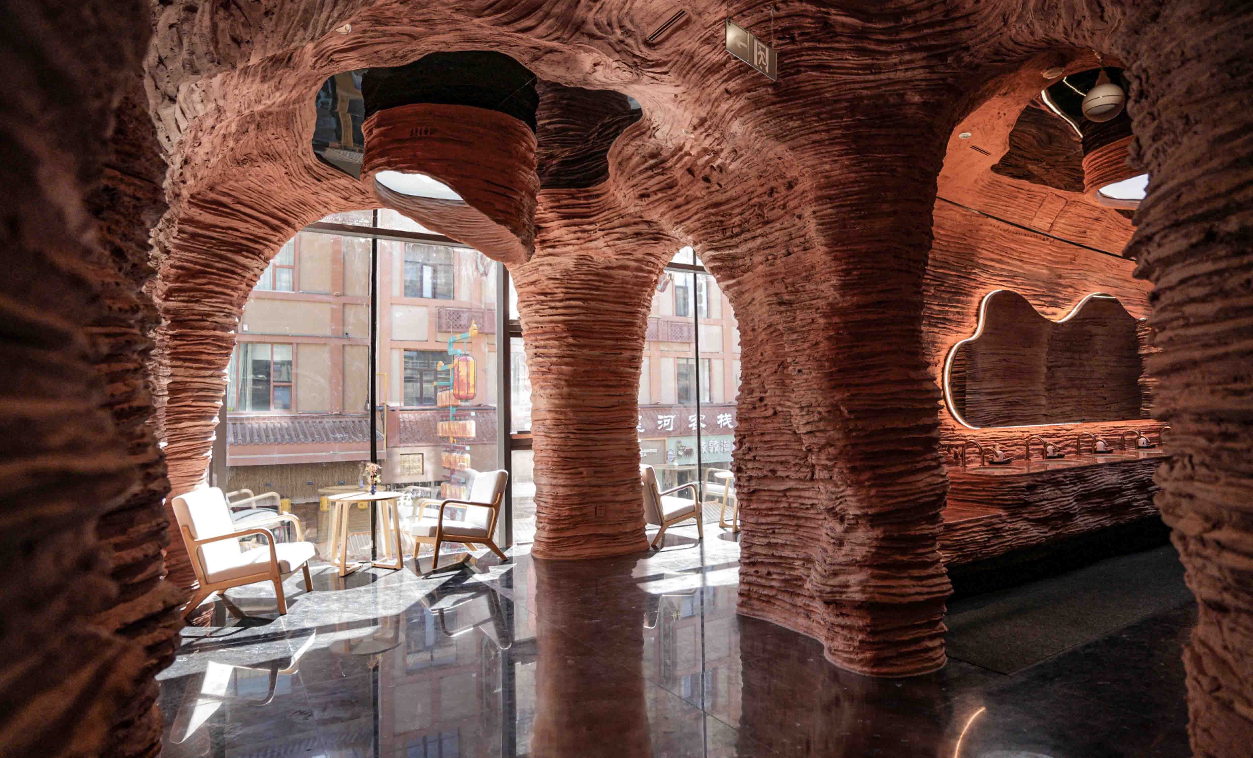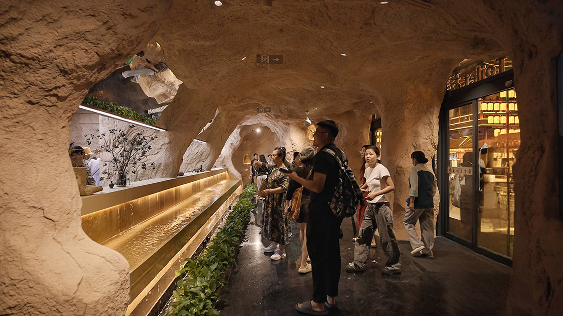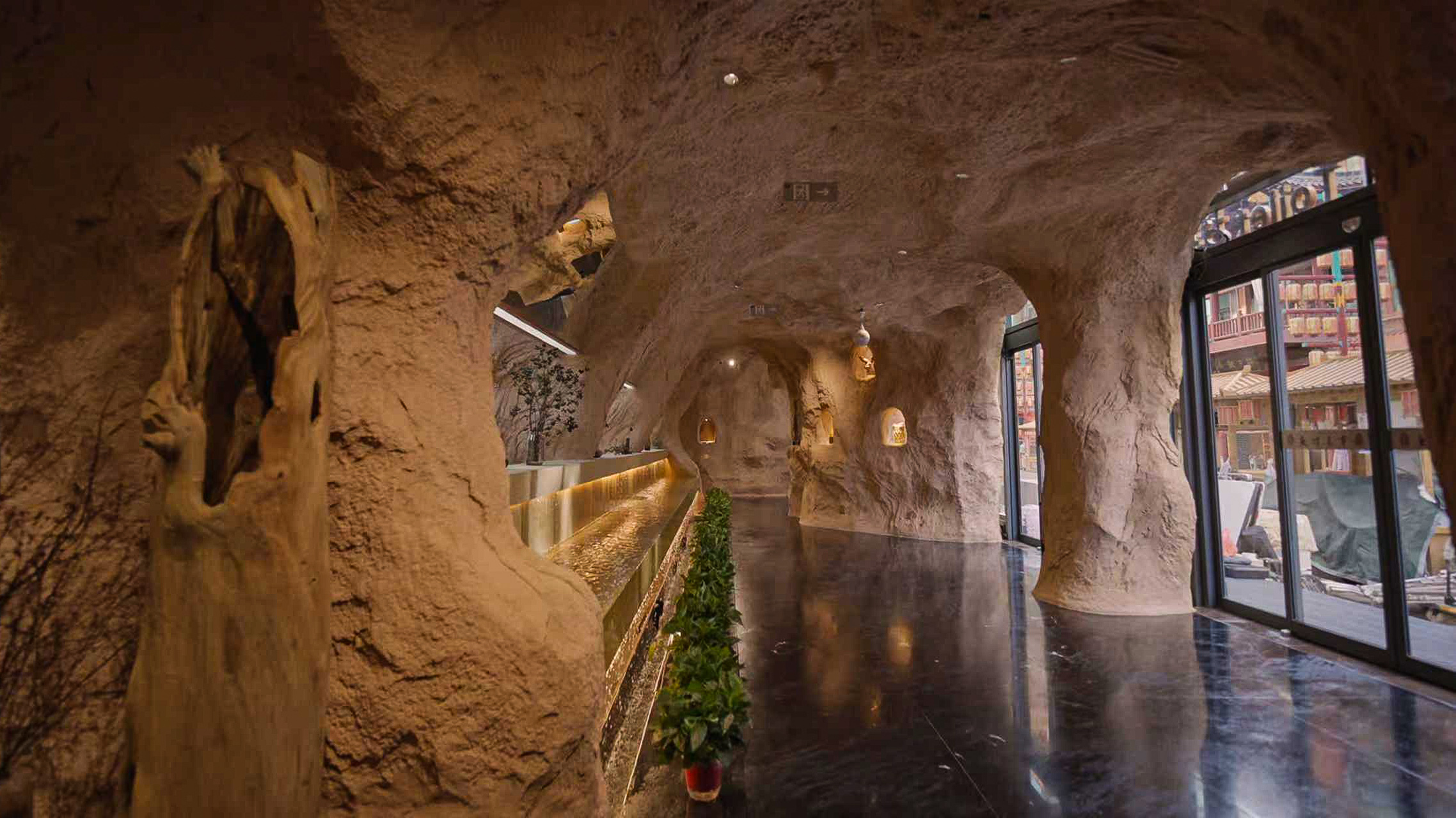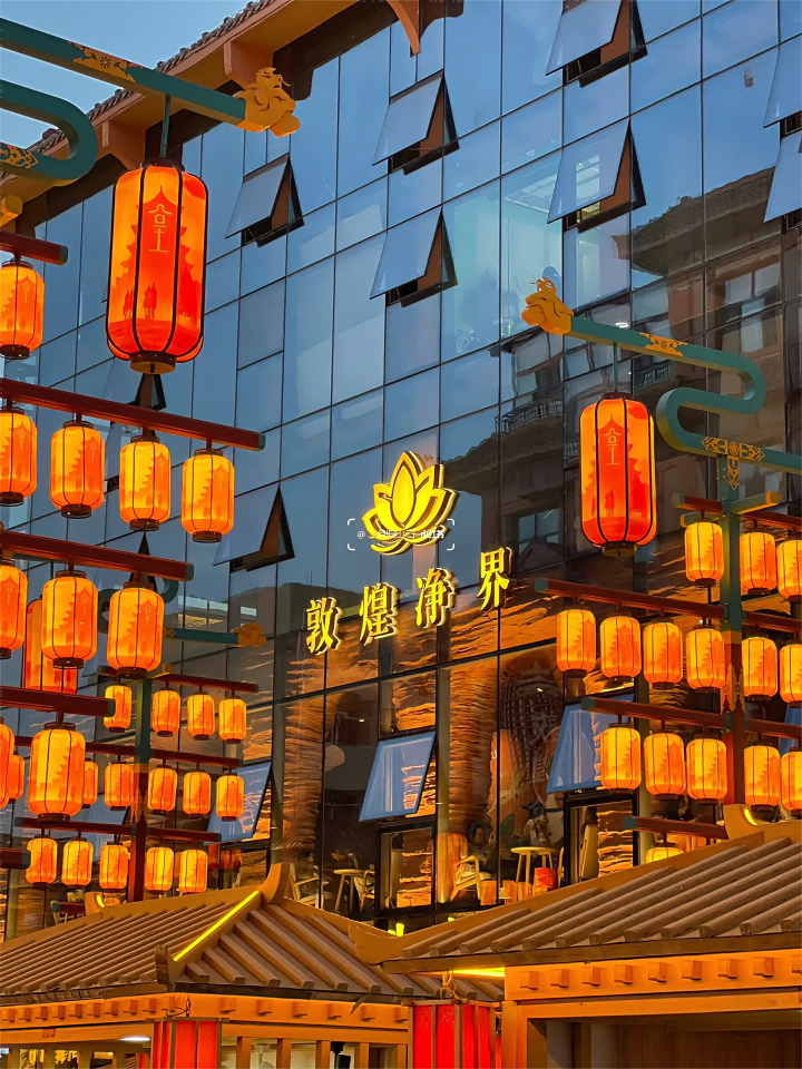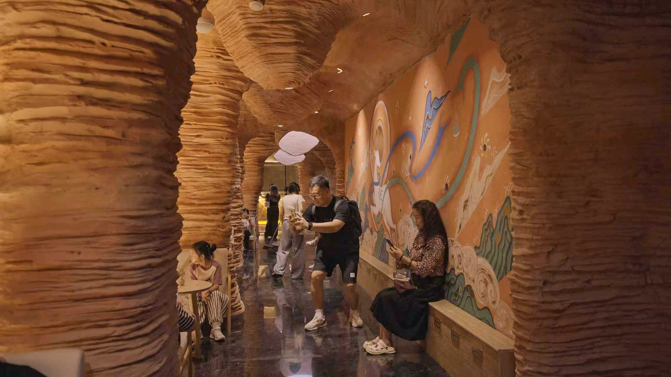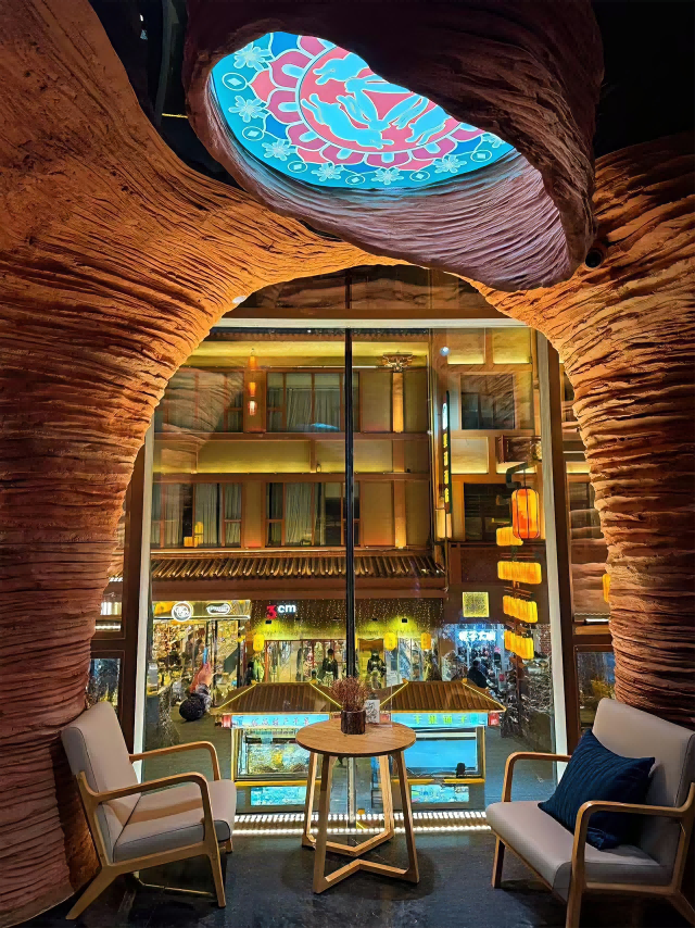 空间布局:1F 以莫高窟风格为灵感,通过石窟镂空窗洞、莫高窟基底质感等设计,营造穿越千年的文化厚重感;