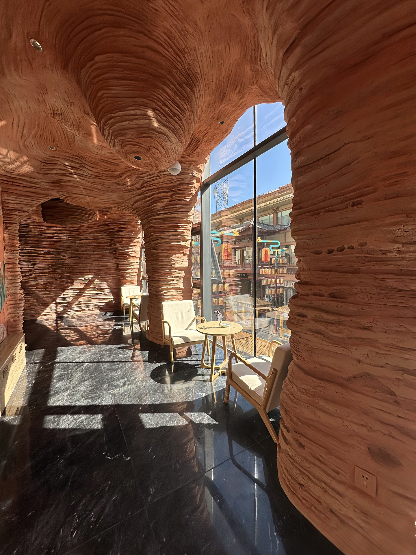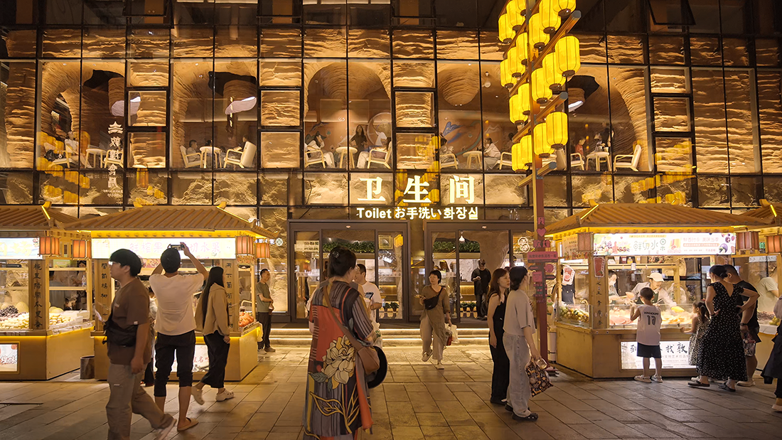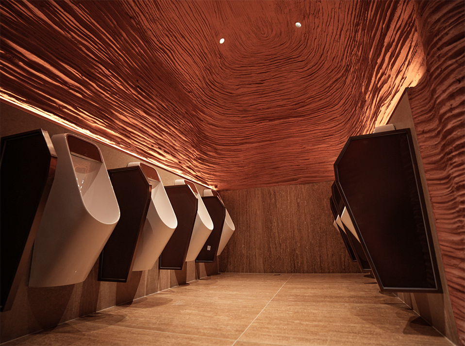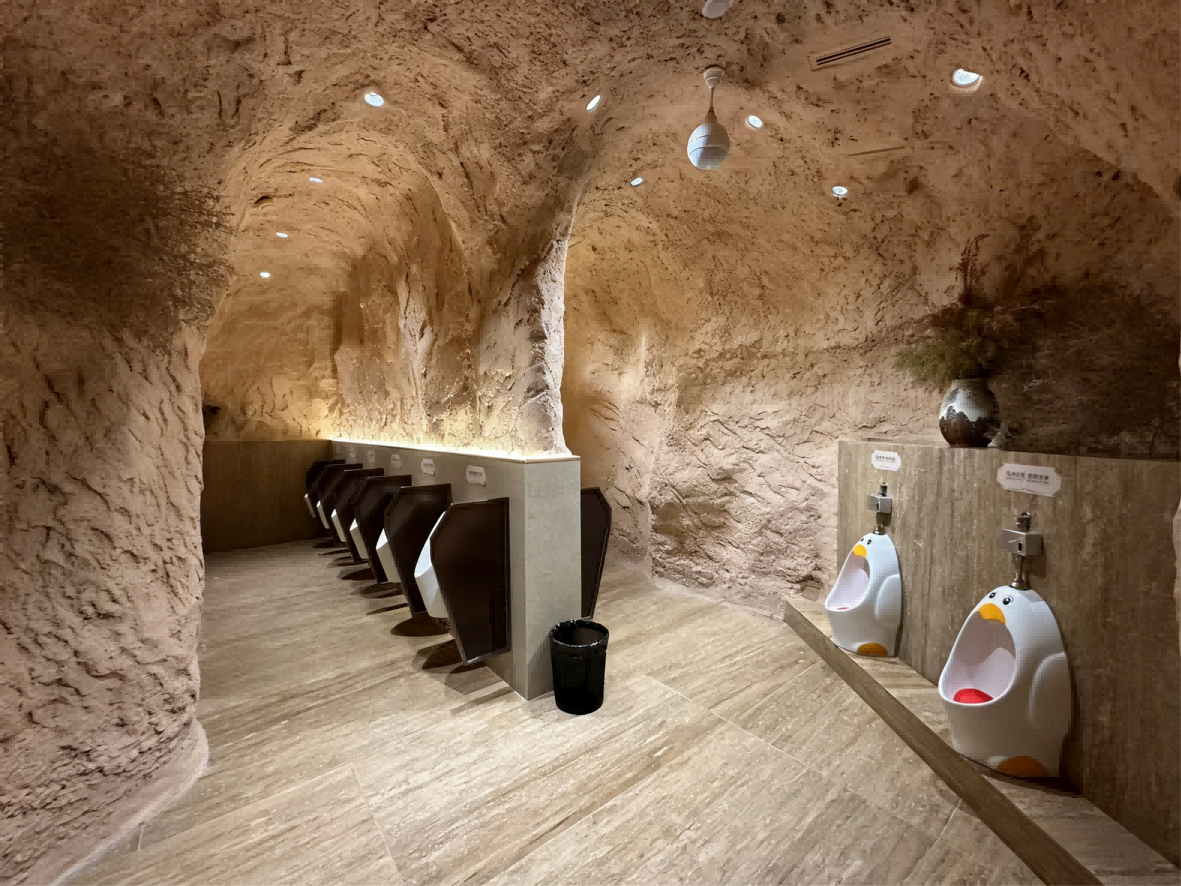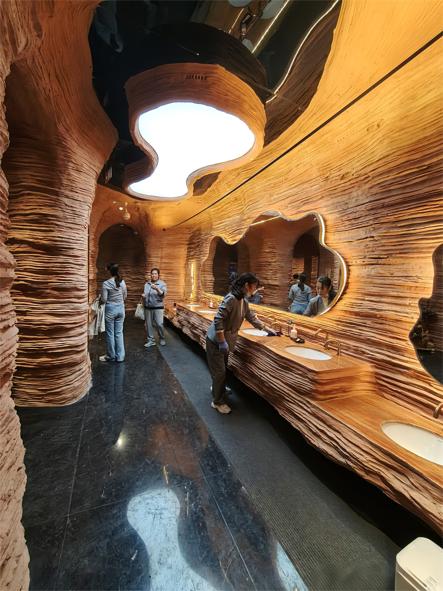 2F 模拟雅丹地貌,用粗糙岩石纹理墙面与不规则灯光,还原自然景观的雄浑奇幻;外立面增设玻璃盒子,将内部文化景观通透呈现,让卫生间成为敦煌文化展示窗口。 -