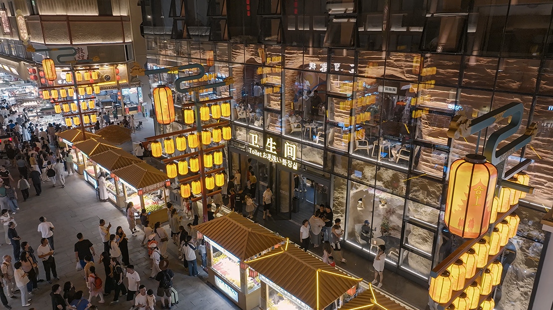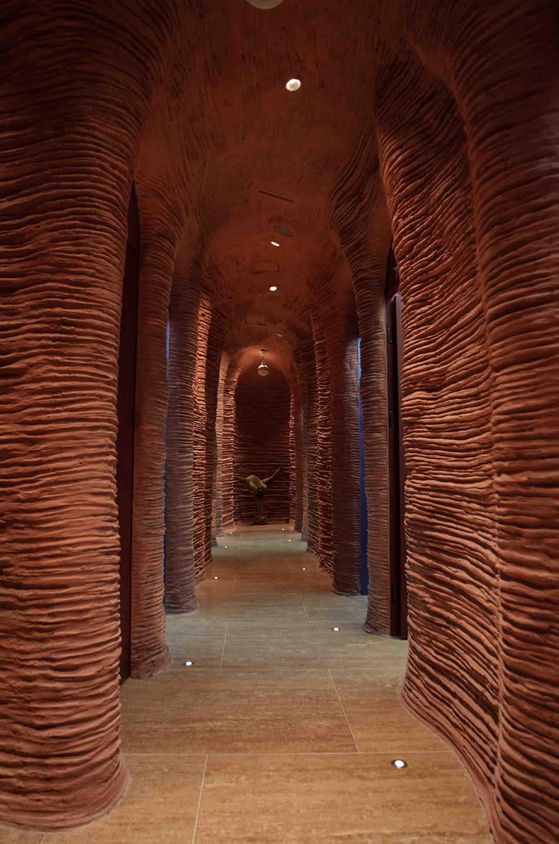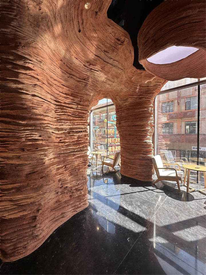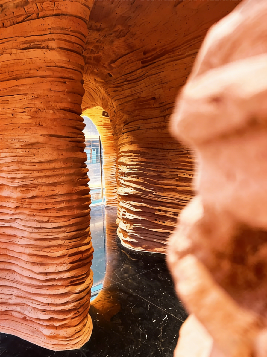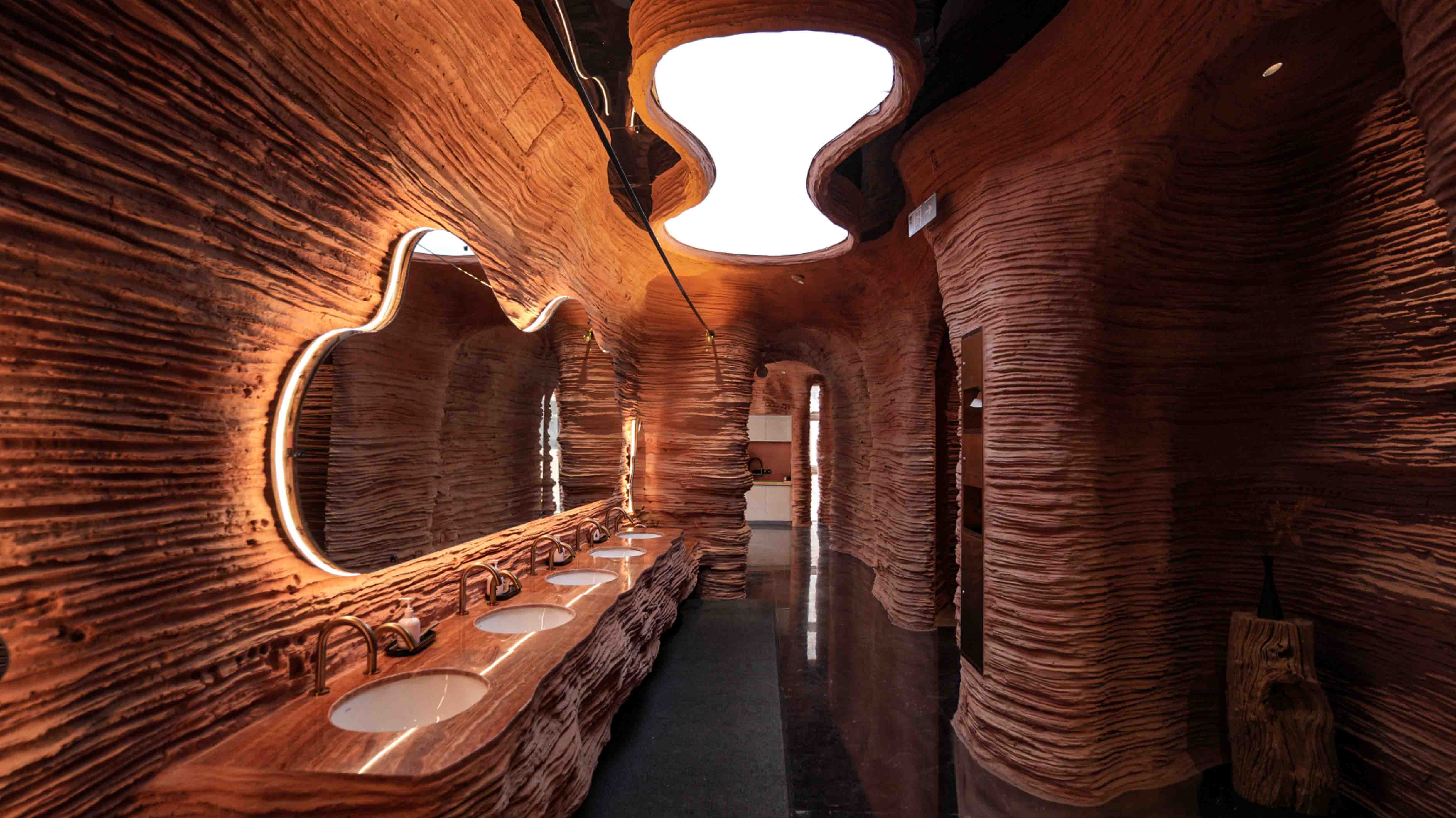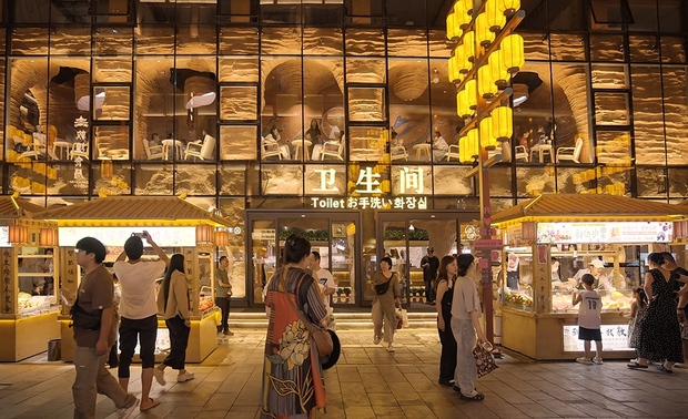 2F 模拟雅丹地貌,用粗糙岩石纹理墙面与不规则灯光,还原自然景观的雄浑奇幻;外立面增设玻璃盒子,将内部文化景观通透呈现,让卫生间成为敦煌文化展示窗口。 -