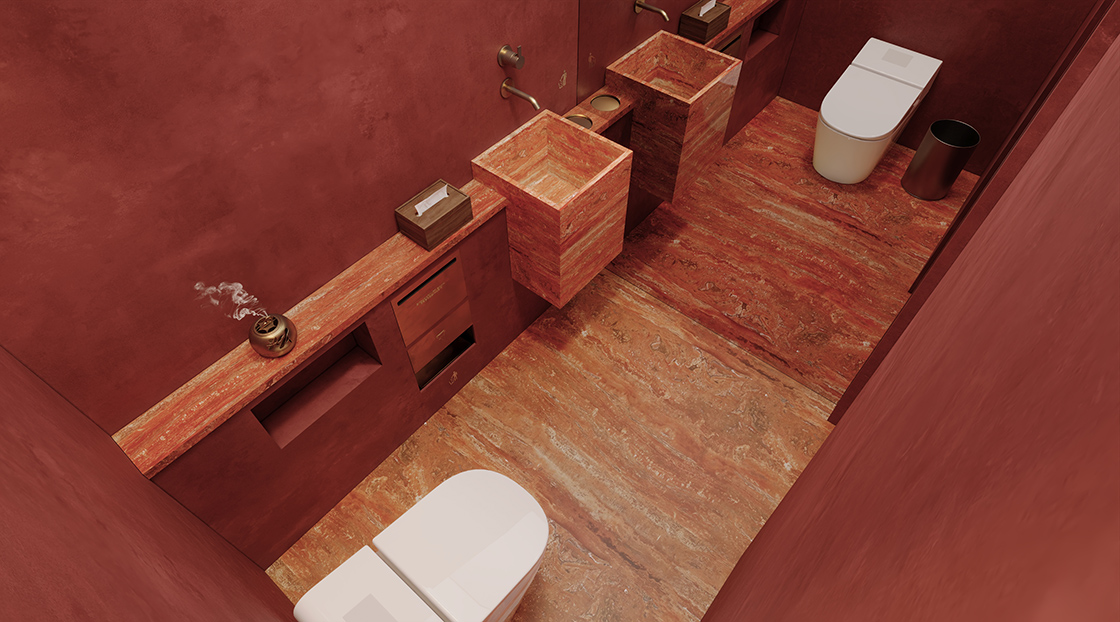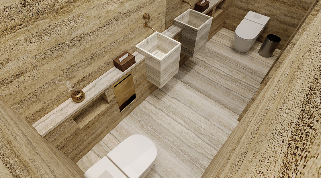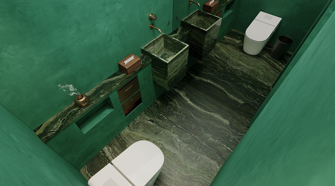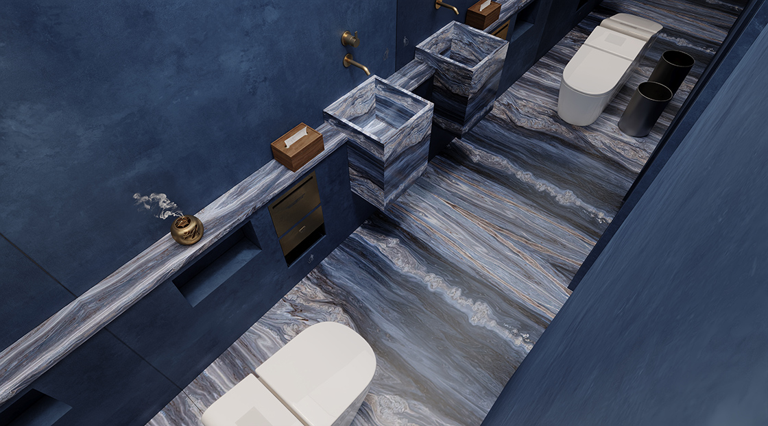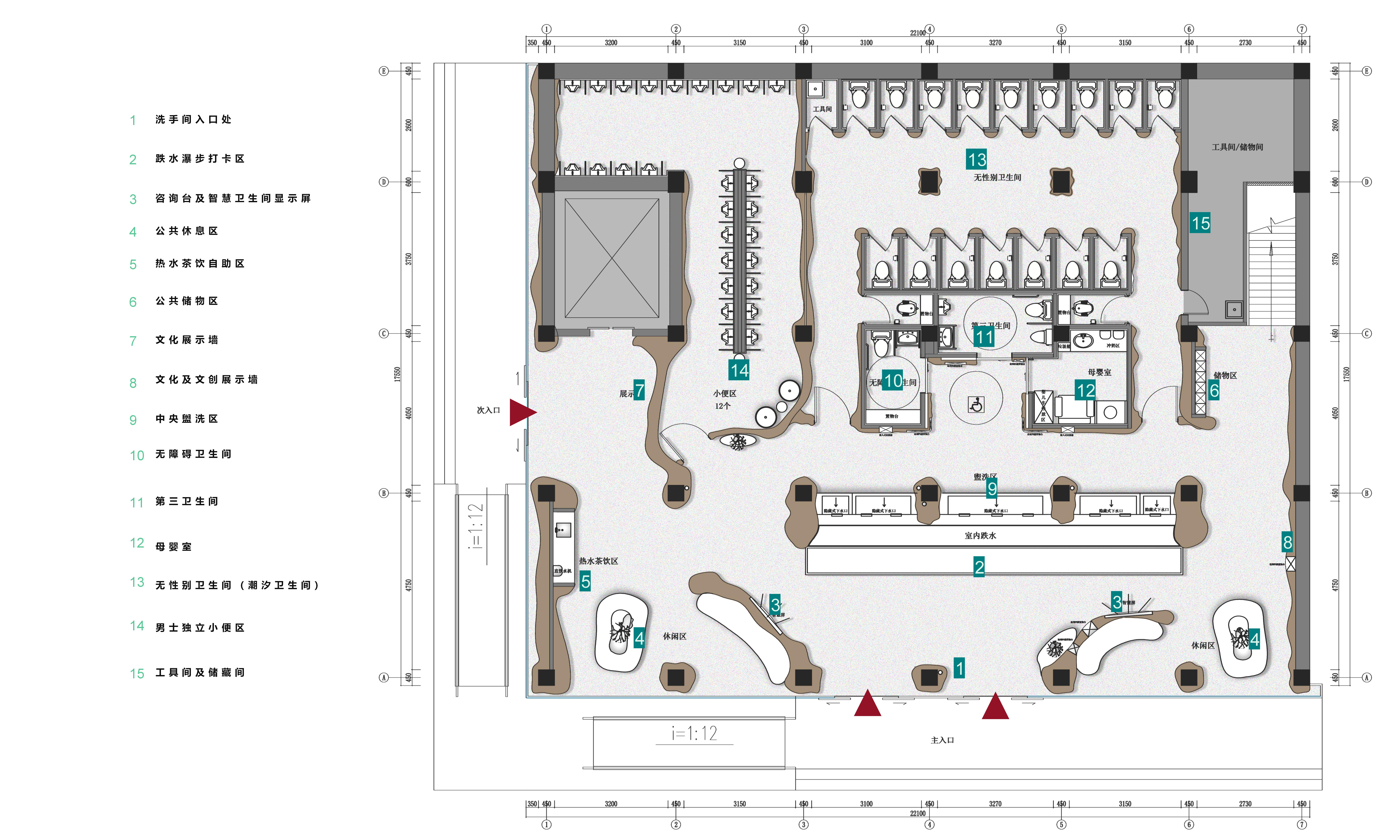 设计选材:通过智慧卫生间系统解决 “找厕难、等待乱” 问题,厕位智能监测系统实时显示厕位占用状态,环境监测系统(温湿度、臭气检测)联动新风系统保障舒适;配置 70 度斜角双面镜(兼顾仪容整理与洗漱需求)、跌水瀑布造景(舒缓压力 + 改善微气候),从功能到体验全方位优化。