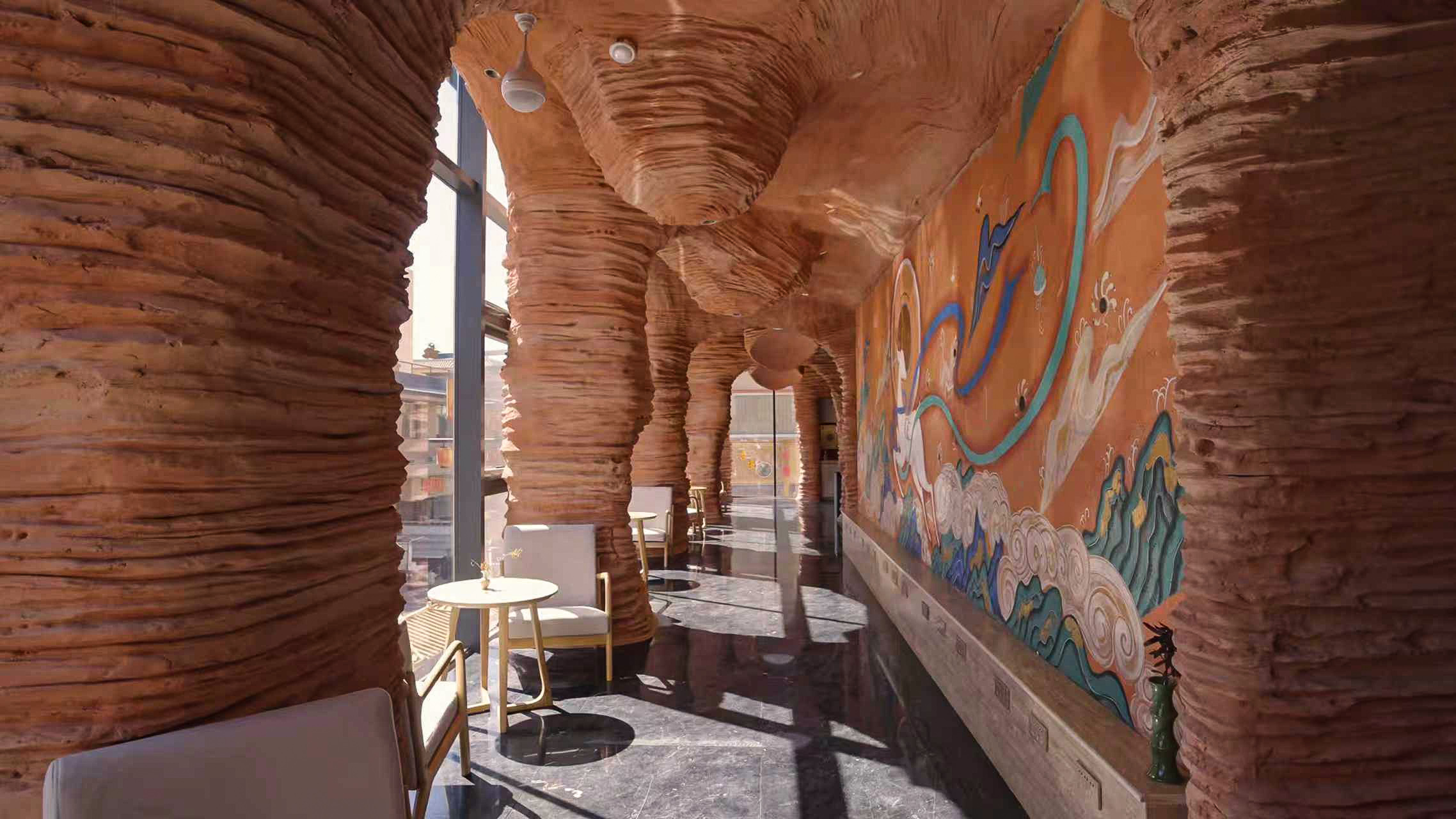 空间意境:从敦煌历史文化与自然景观中提取核心元素,将丝路文化、敦煌壁画、雅丹地貌、沙漠叠石等融入空间,如把雅丹地貌元素设计成兼具展示与隔断功能的艺术造型墙面,模拟莫高窟石窟洞穴饰面打造空间基底,用敦煌壁画色系贯穿各区域,强化在地文化标识。