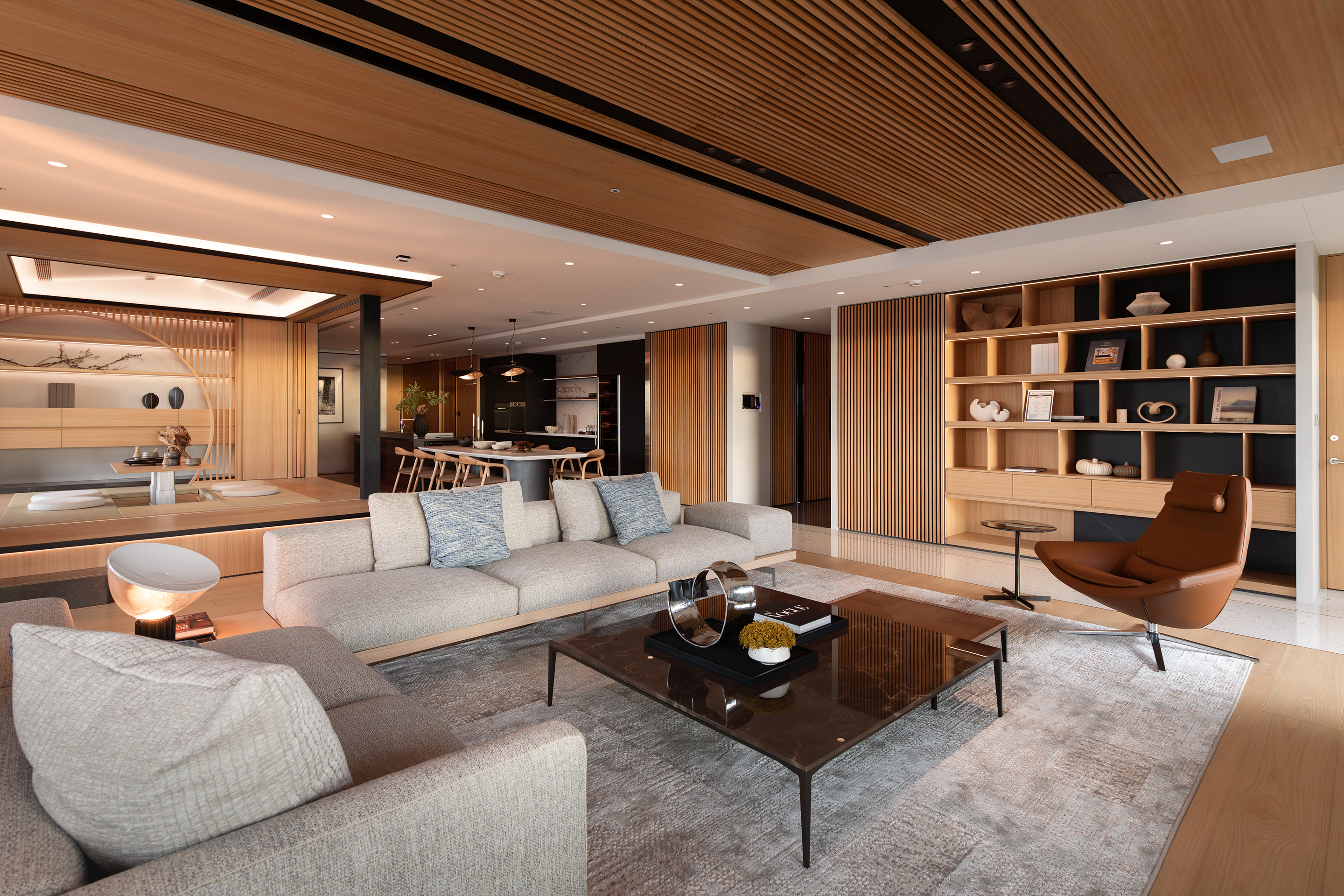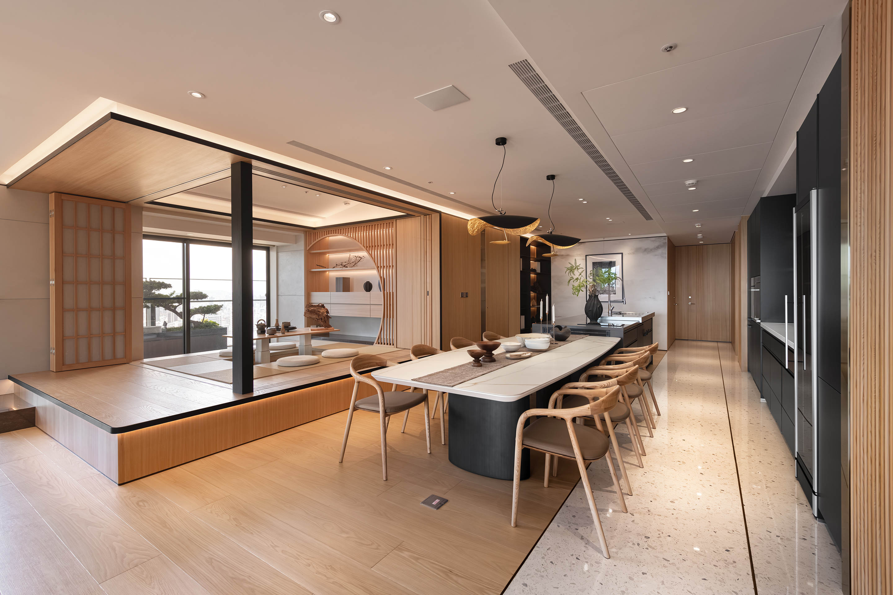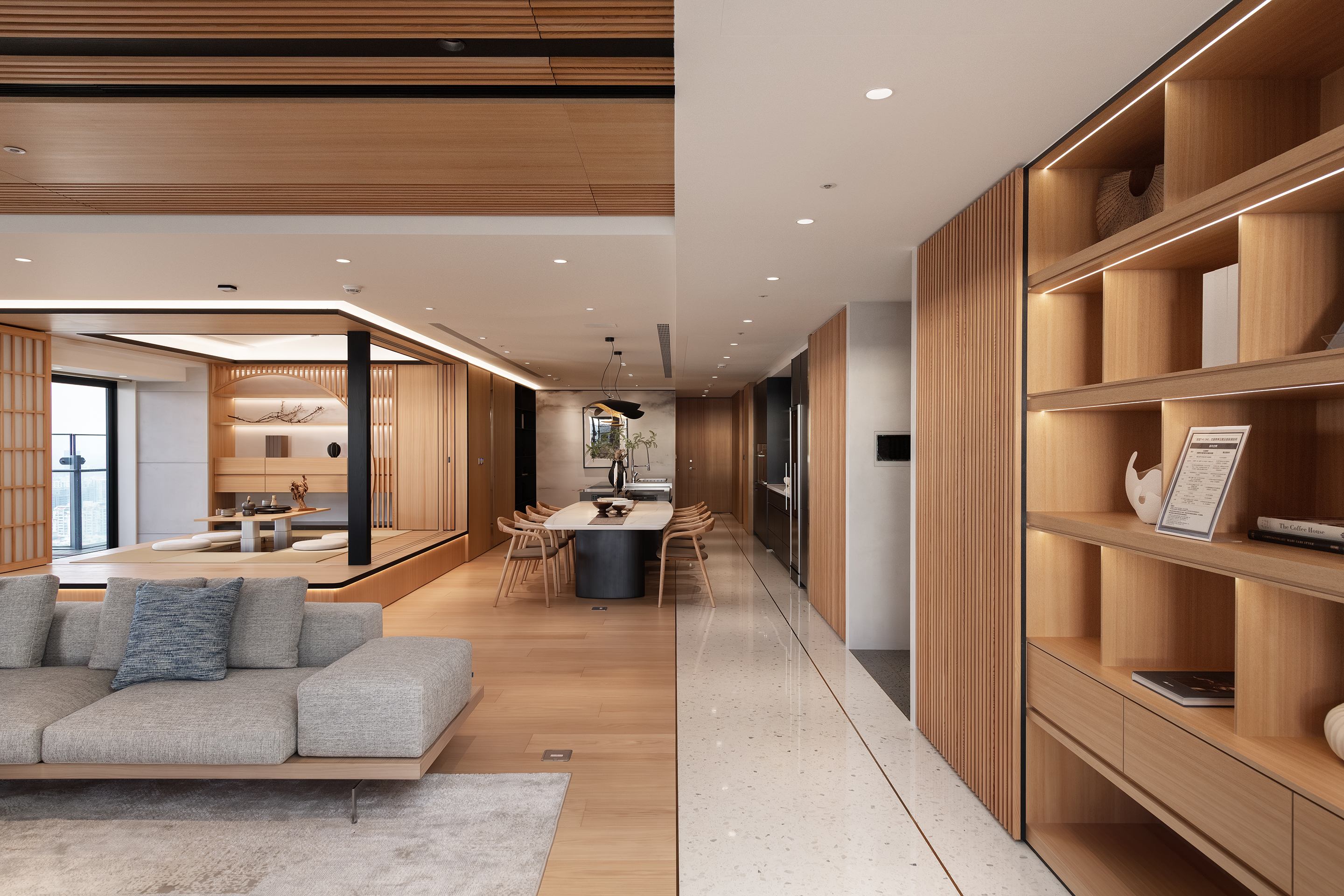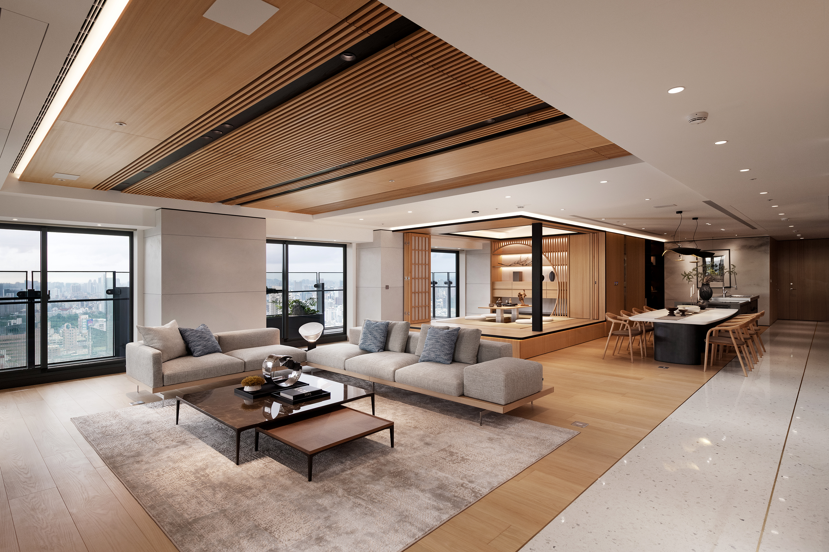 项目定位:AMAN在梵語所代表安靜和平,以森林的實木紋、山壁的岩石灰為背景,延續建築優勢讓落地窗環抱室內,引入日落雲起的禪意。在遼闊的開放空間以「山巒成疊」的視覺層次,漸進鋪陳中島、餐廳與客廳的立體意象。