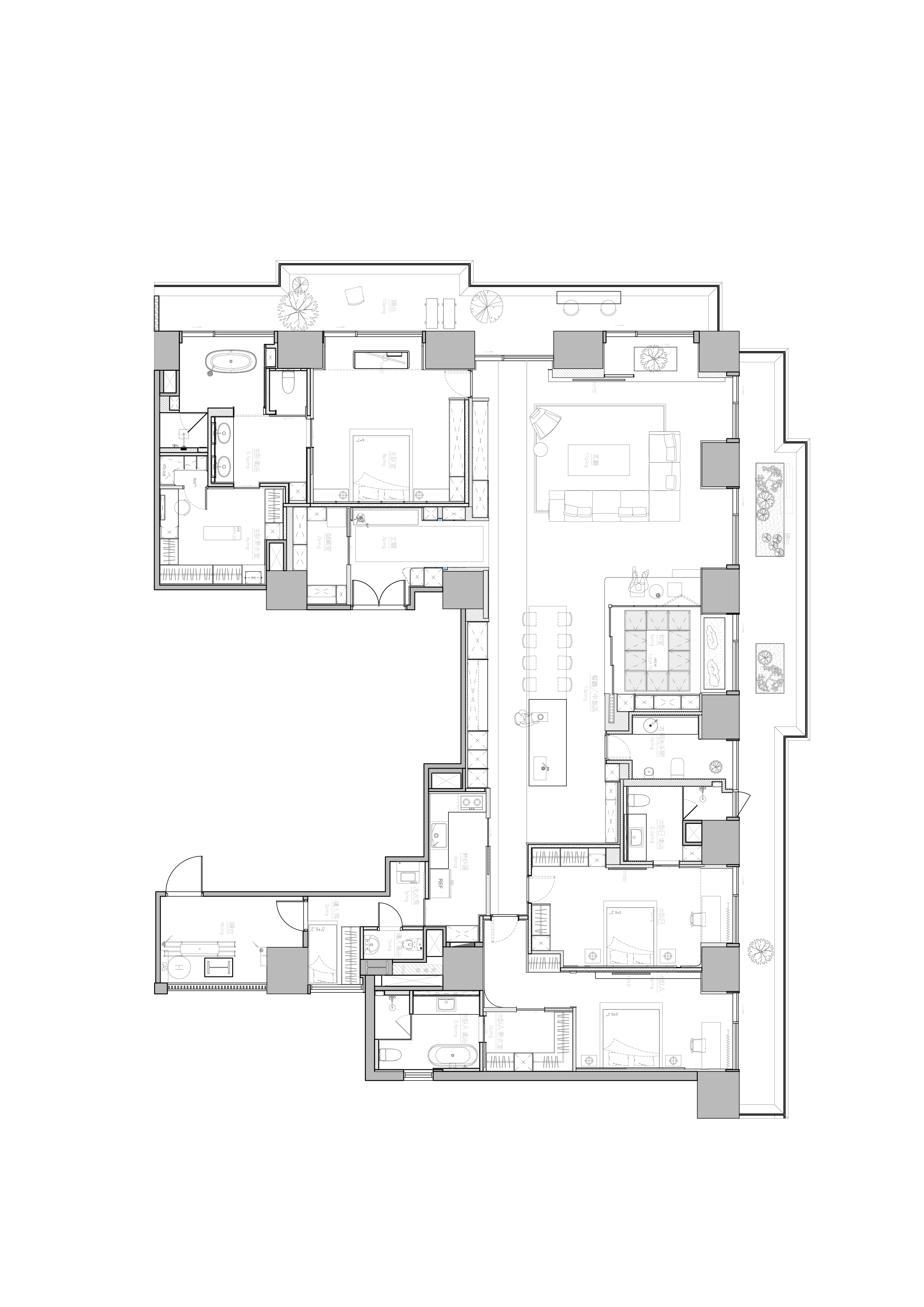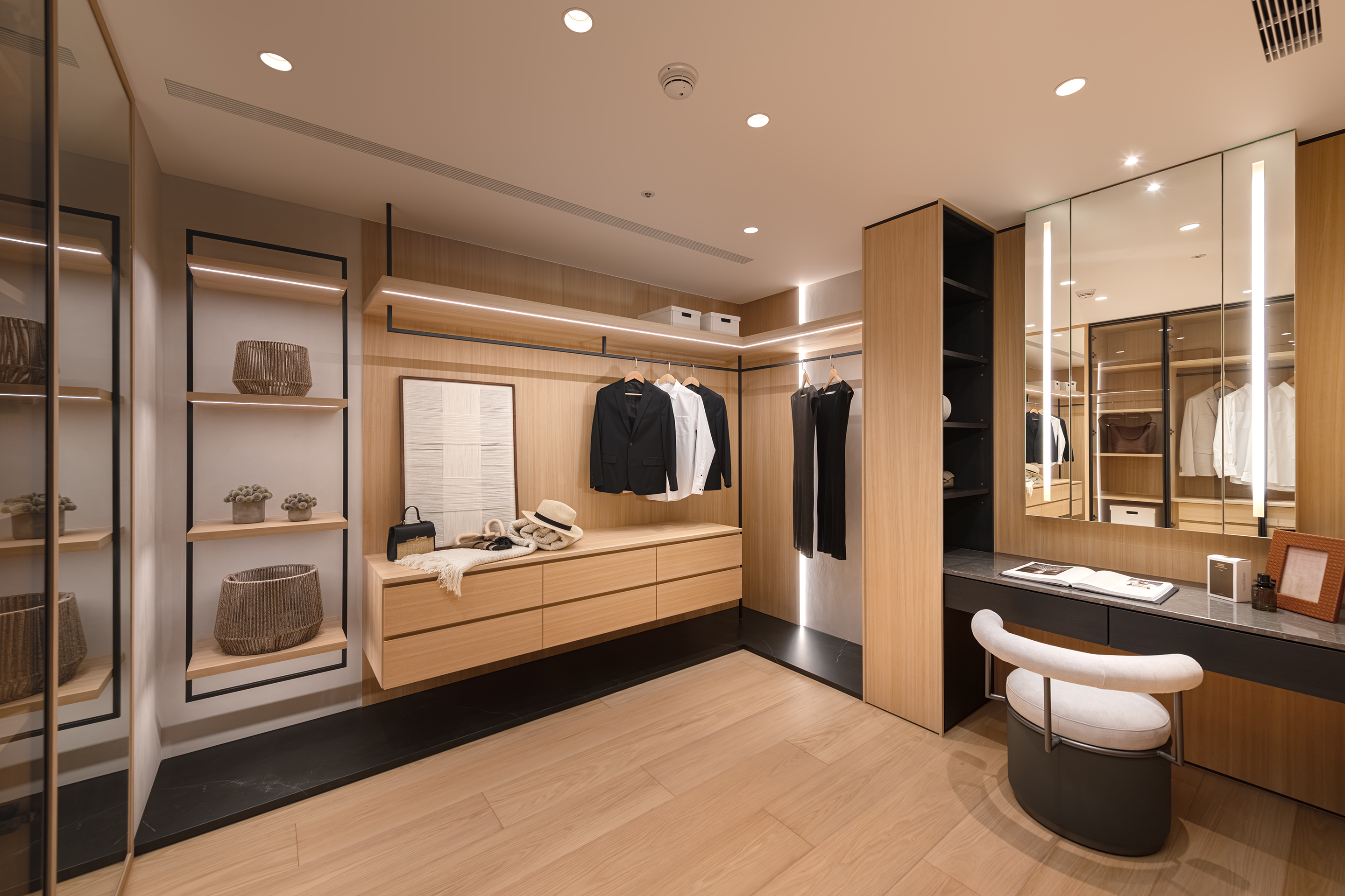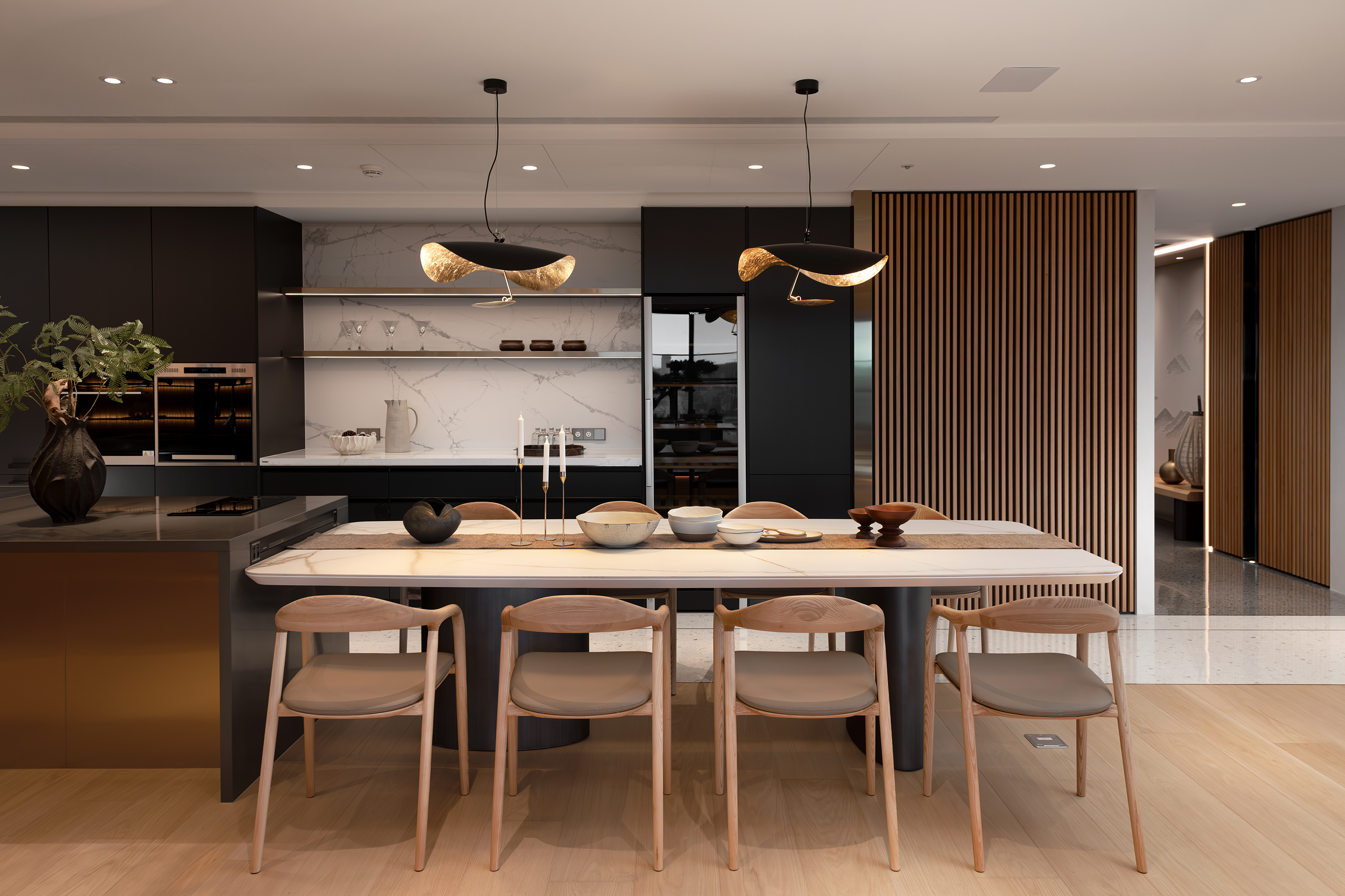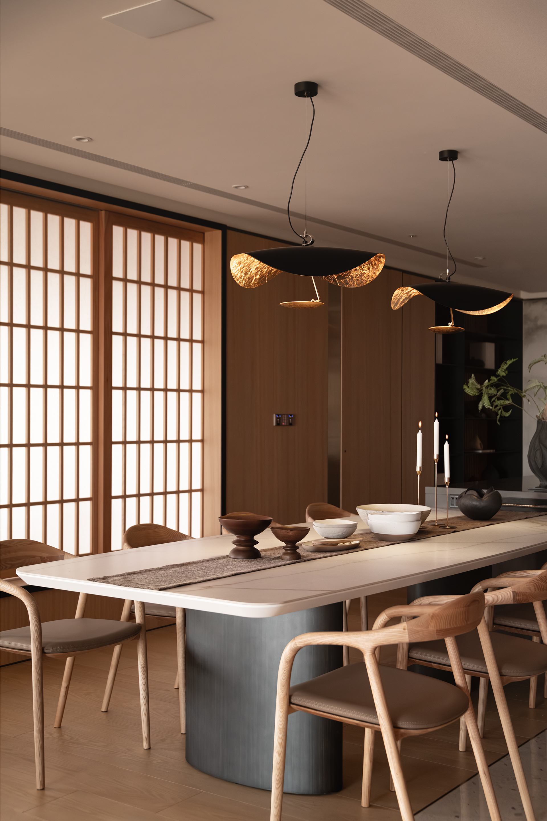 项目定位:AMAN在梵語所代表安靜和平,以森林的實木紋、山壁的岩石灰為背景,延續建築優勢讓落地窗環抱室內,引入日落雲起的禪意。在遼闊的開放空間以「山巒成疊」的視覺層次,漸進鋪陳中島、餐廳與客廳的立體意象。