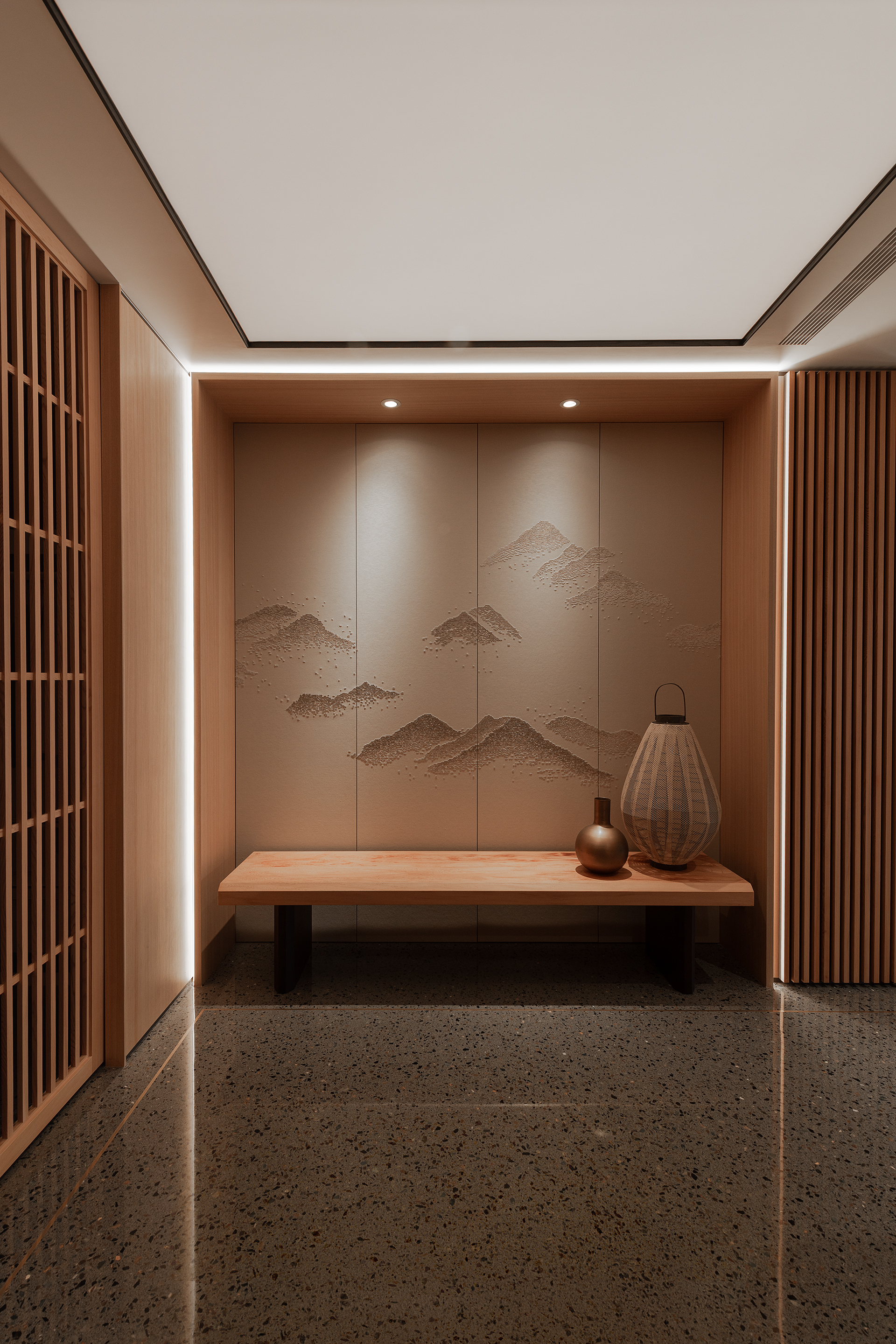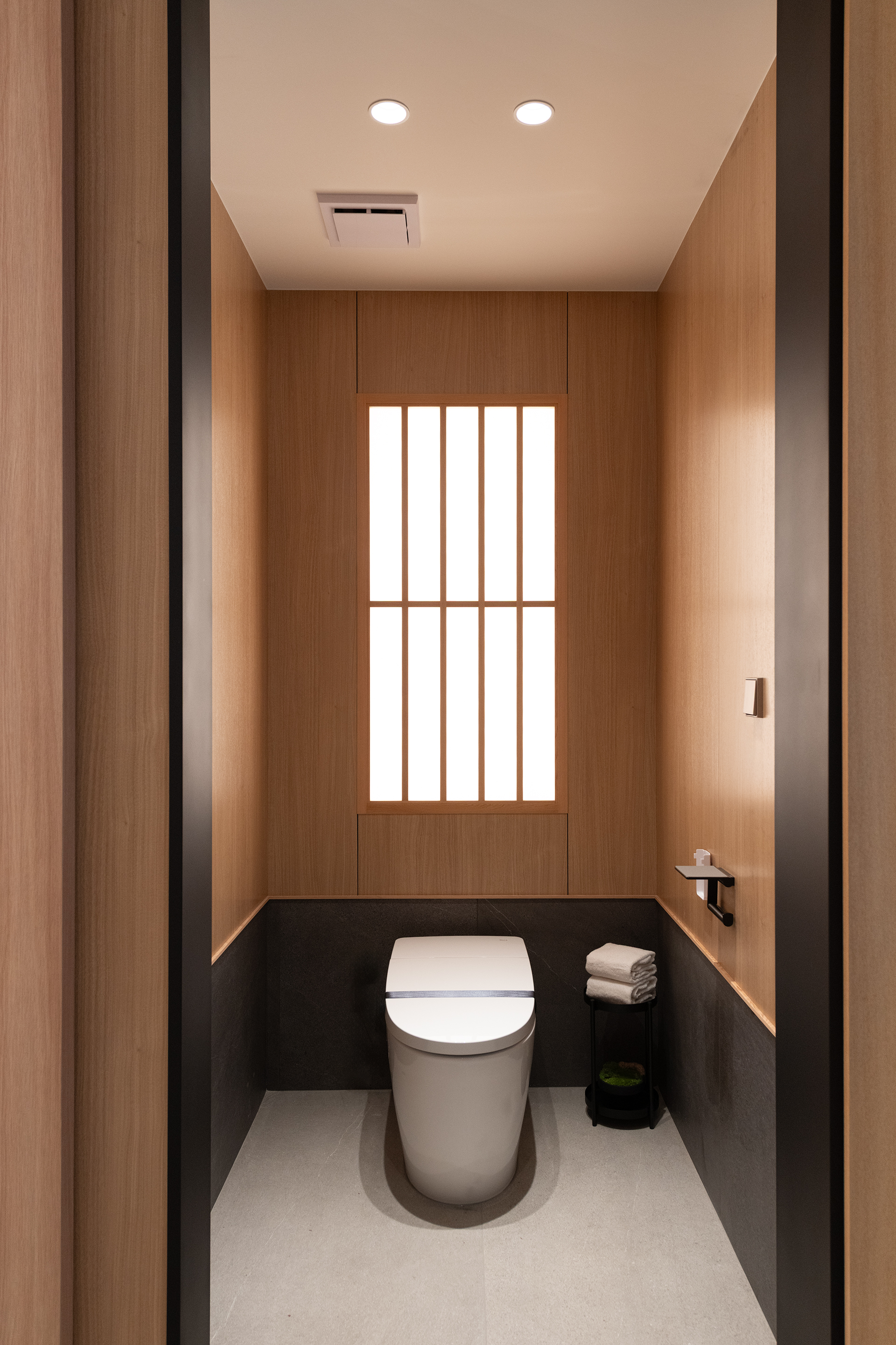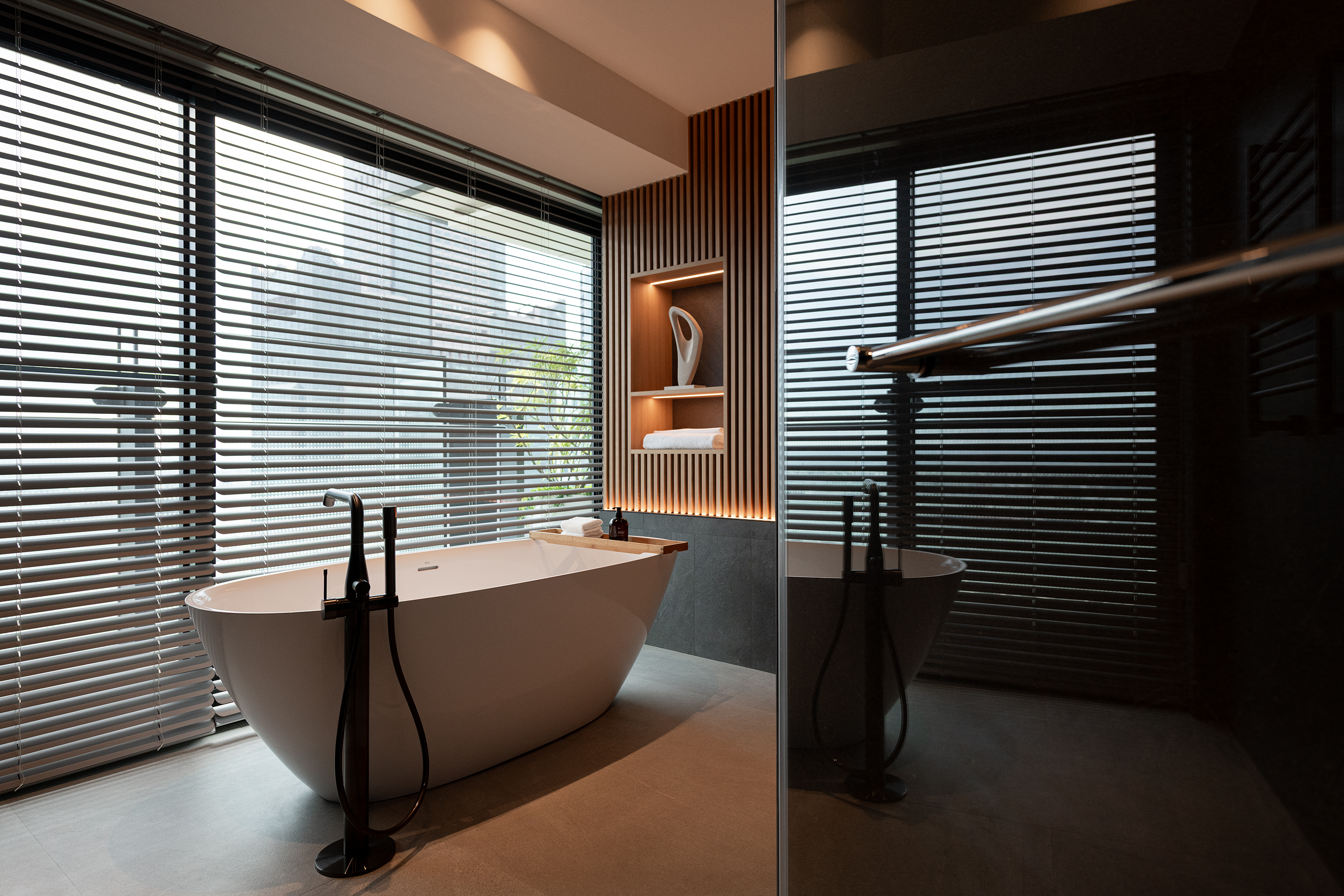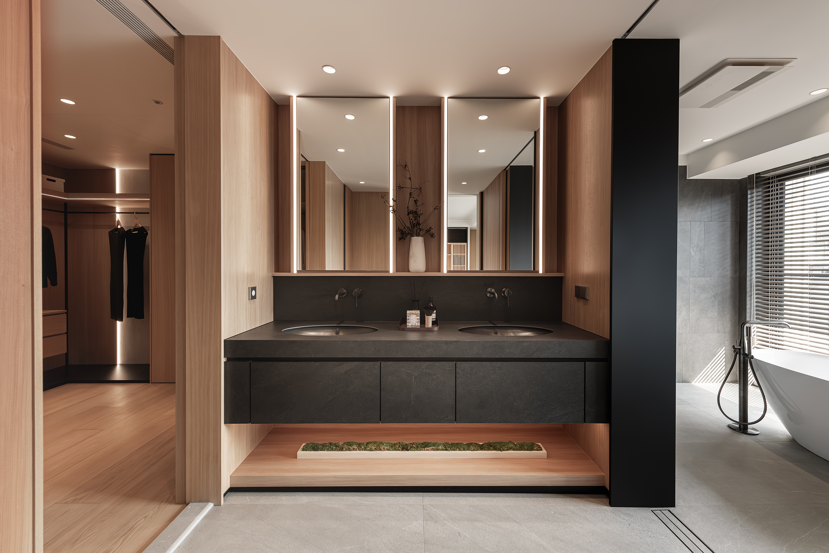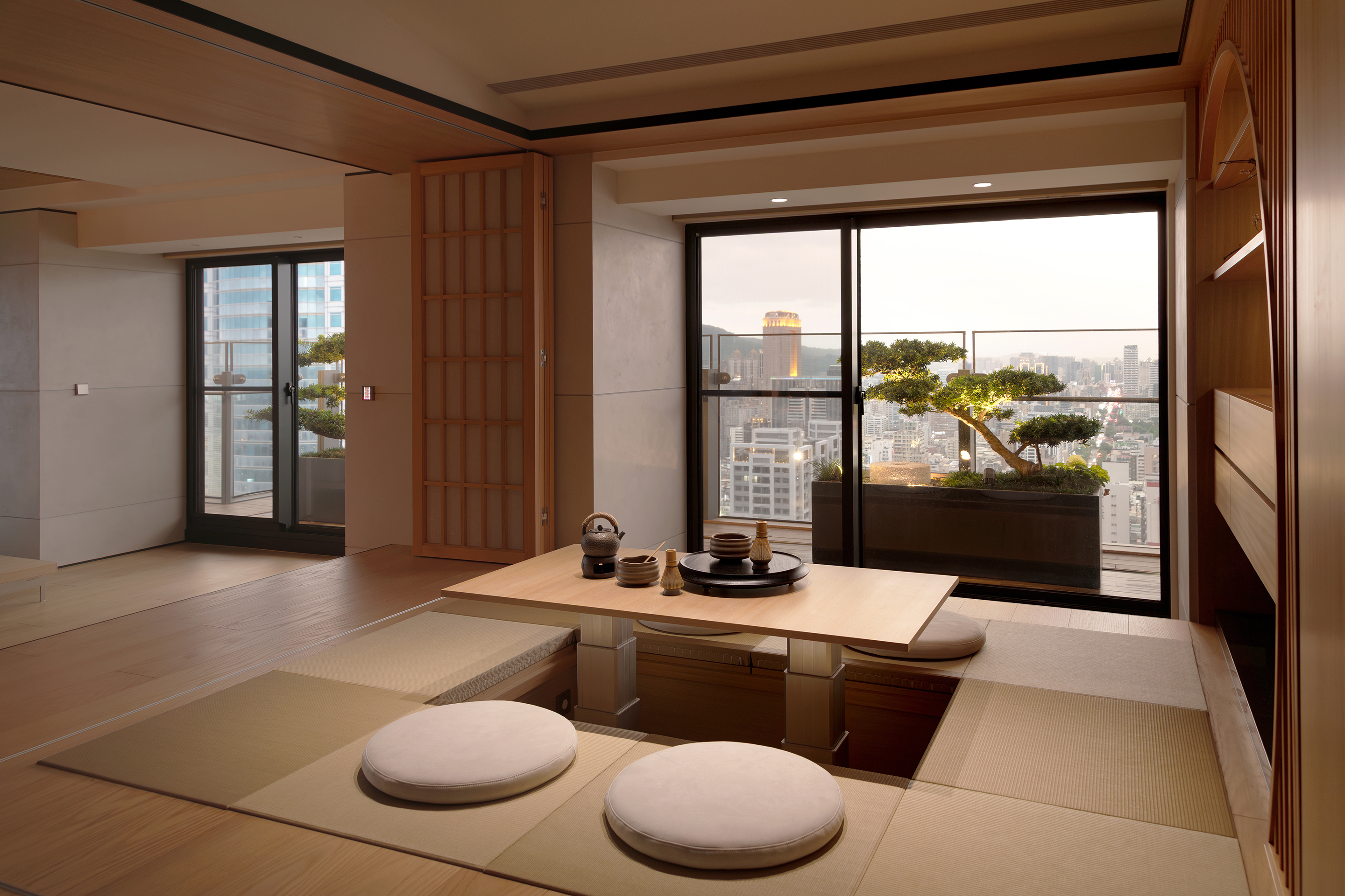 原木加入灰黑色系,實驗性加入日式風格鮮少出現的金屬與石材,企圖以當代設計揉和傳統日式的矜持,藉由自然與文化元素提升靜謐奢華的新層次。 -