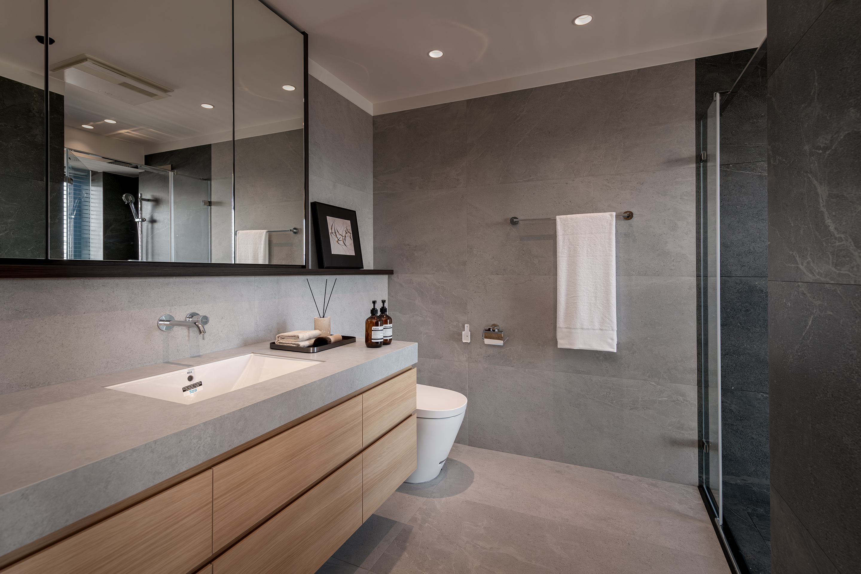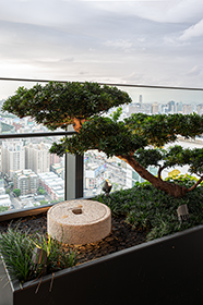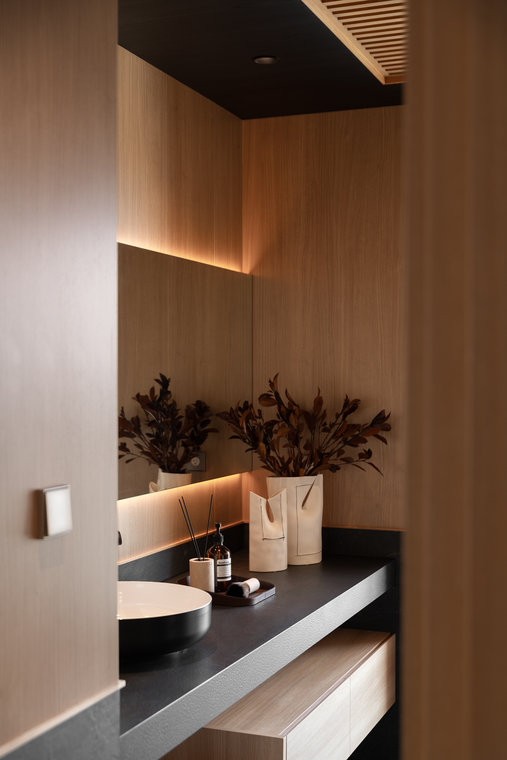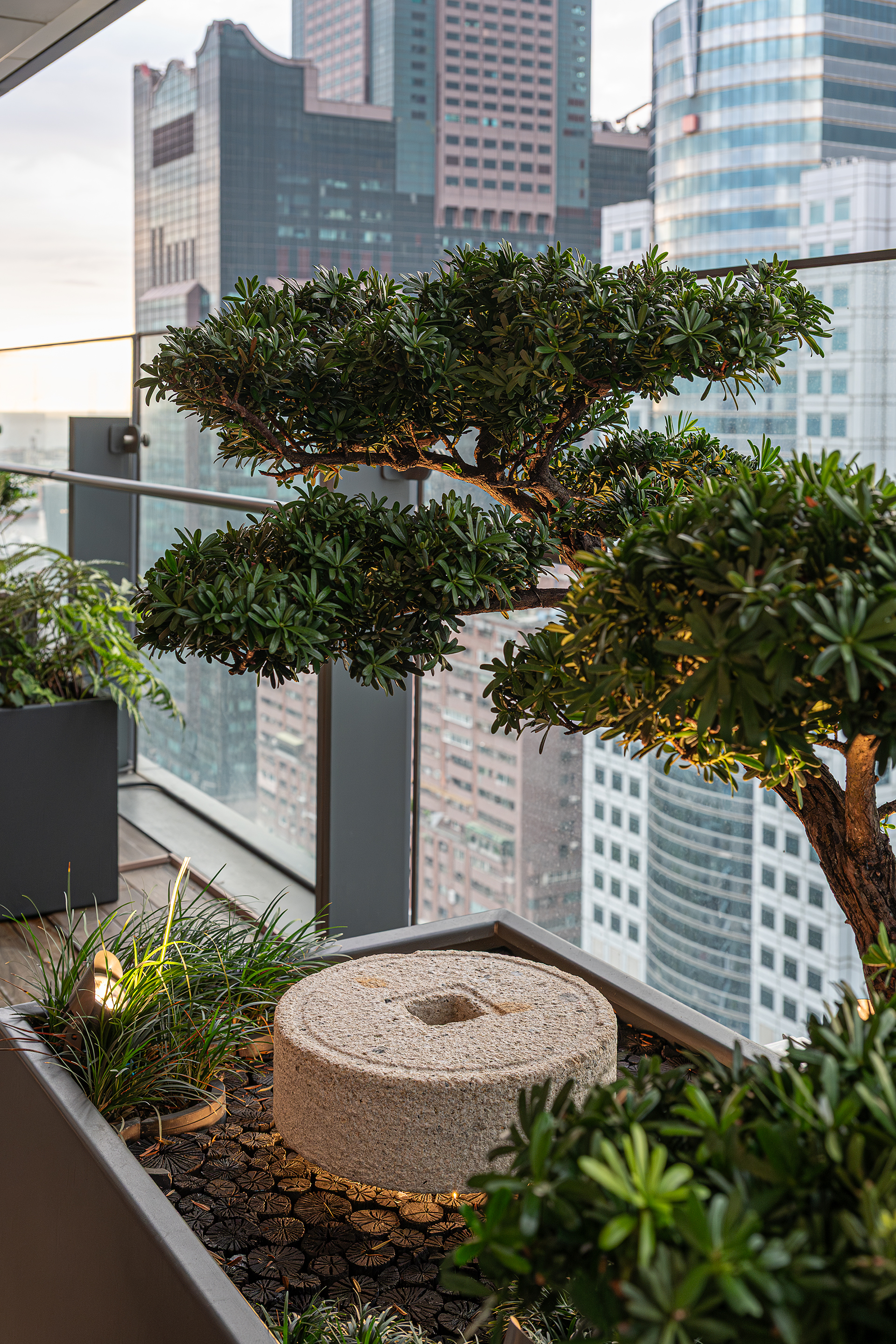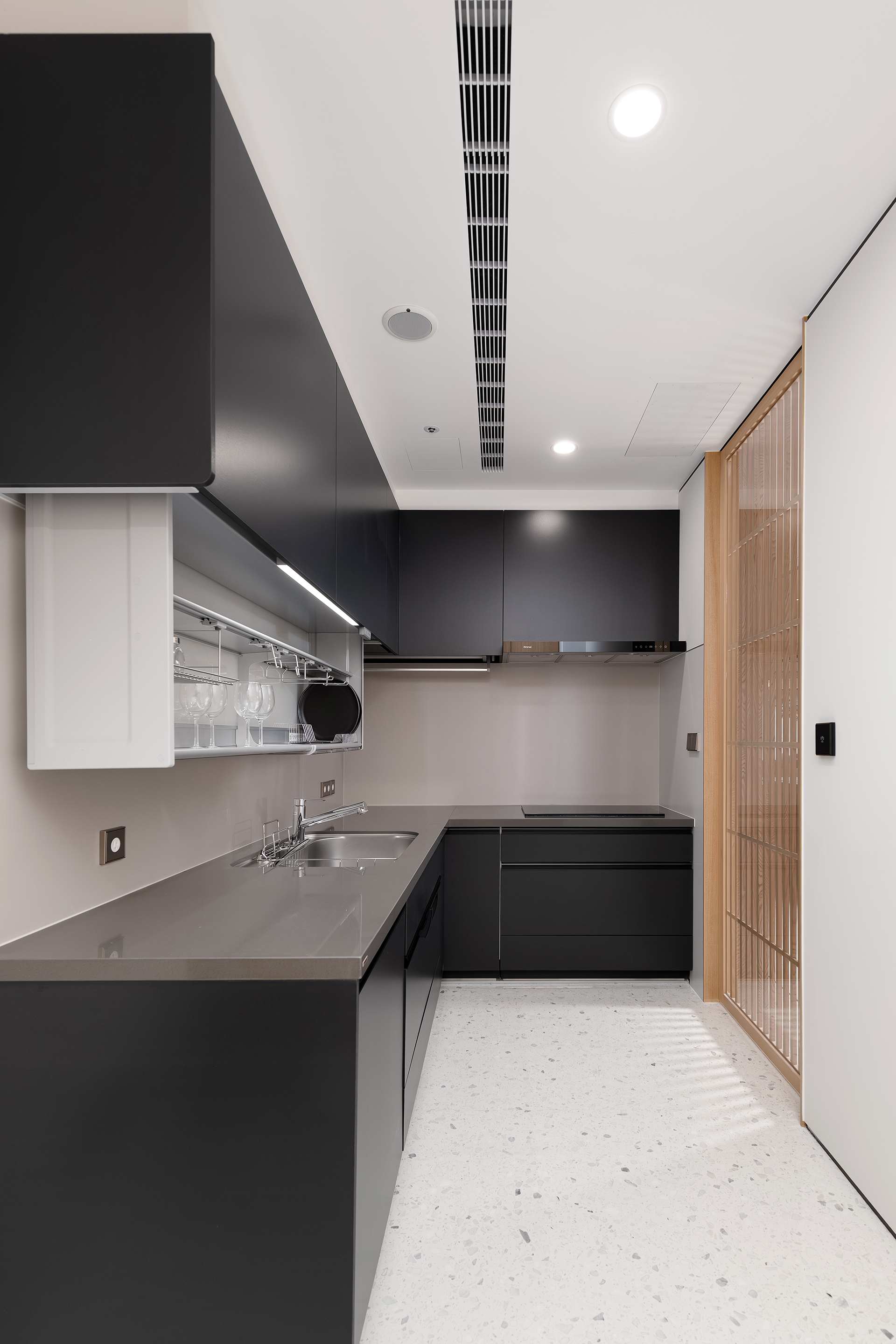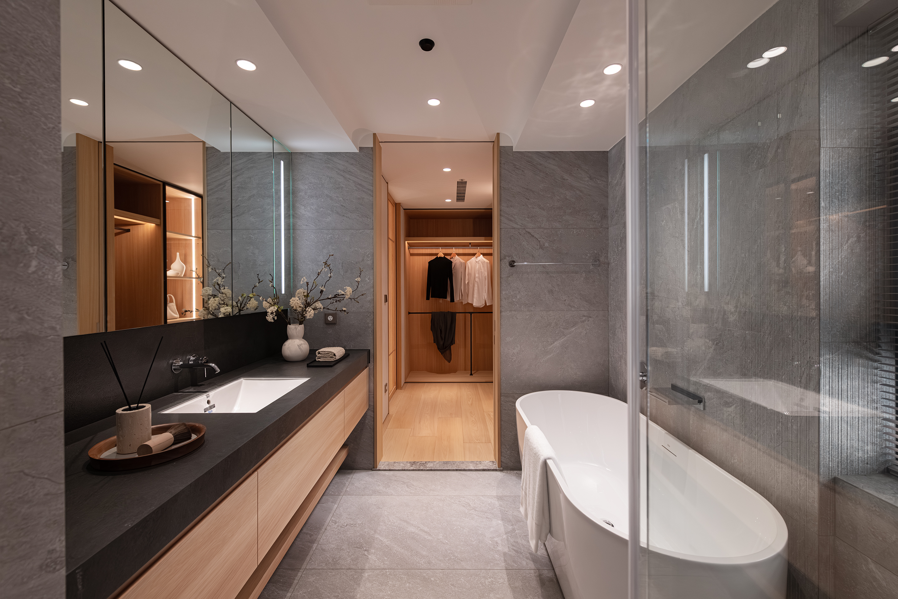 原木加入灰黑色系,實驗性加入日式風格鮮少出現的金屬與石材,企圖以當代設計揉和傳統日式的矜持,藉由自然與文化元素提升靜謐奢華的新層次。 -