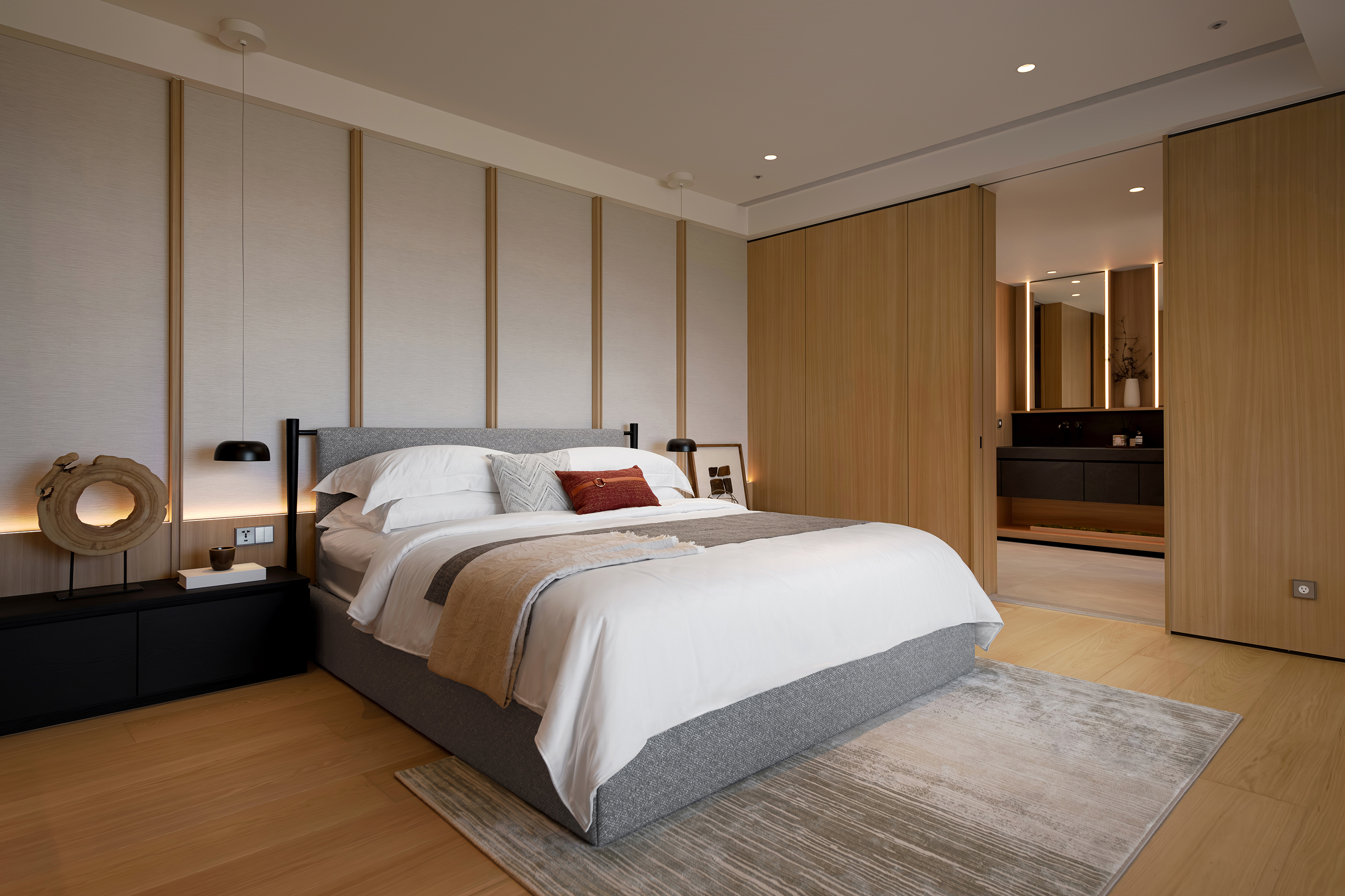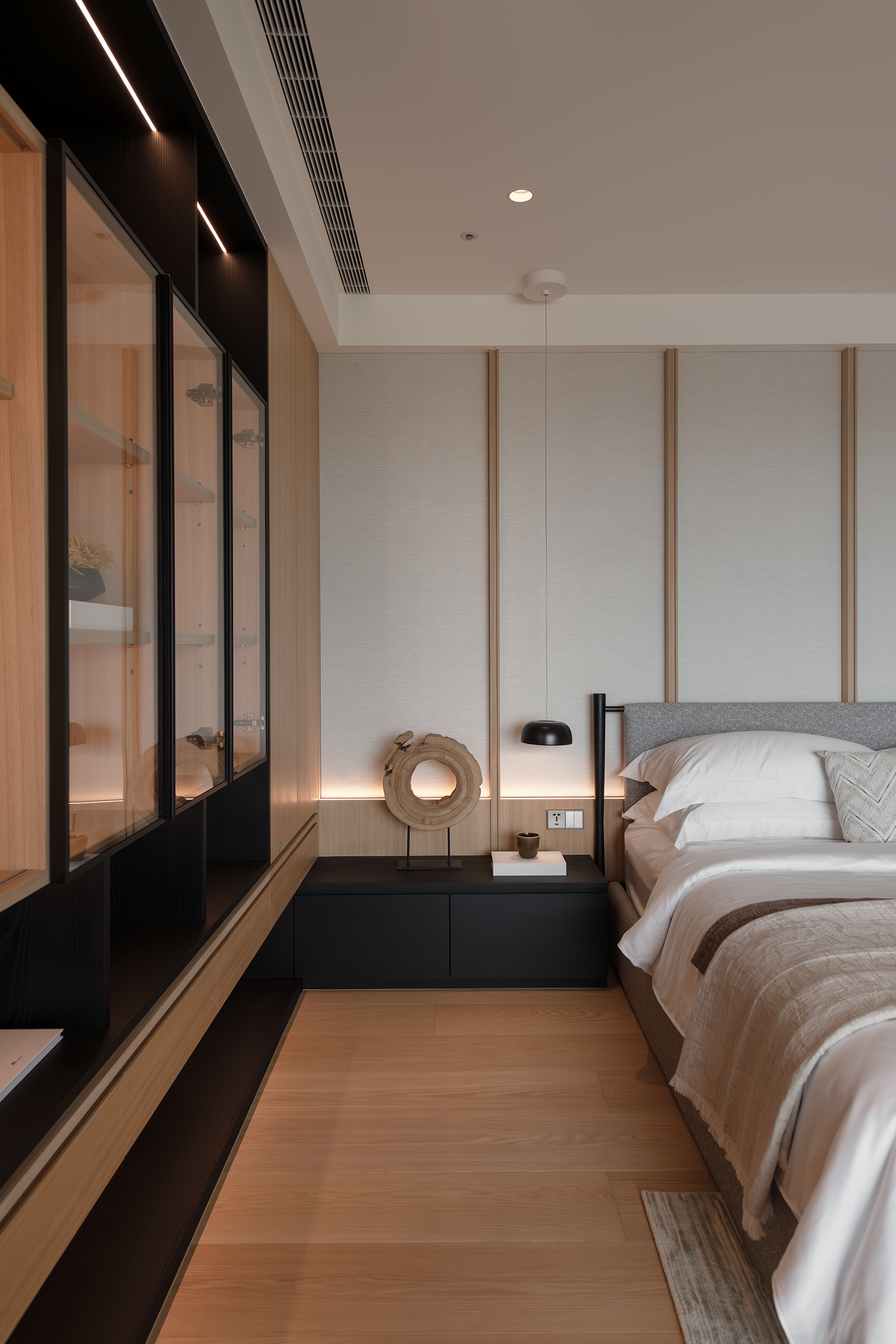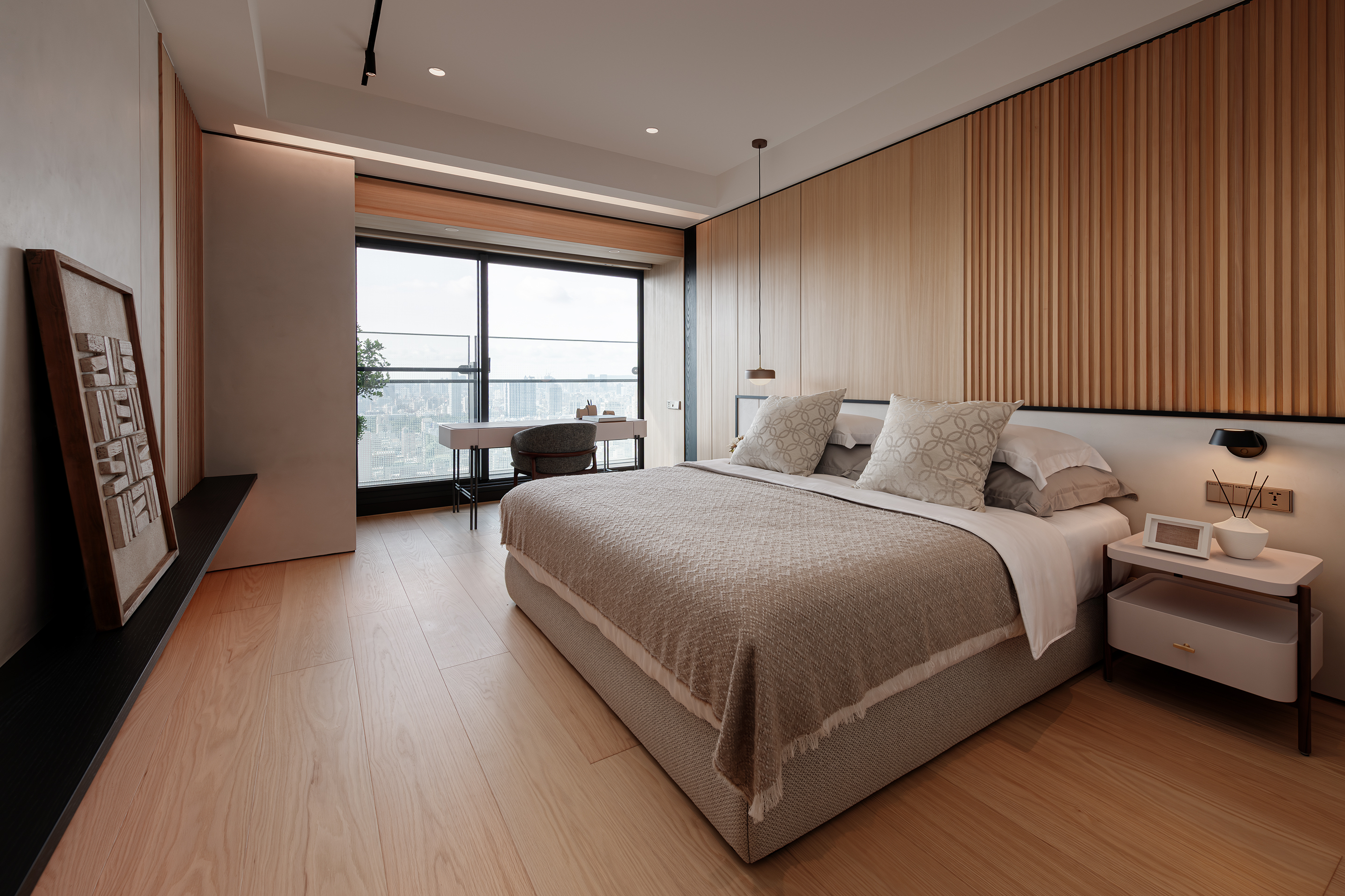 大地色系中,軟裝依循JAPANDI手法為空間刻劃著色,軟裝材質上選用自然中性色調,營造出寧靜而不冷清的基底,並透過質地豐富的天然材質(如實木、亞麻、藤編、陶器等)堆疊層次,賦予每一處角落細膩的觸感與溫度。