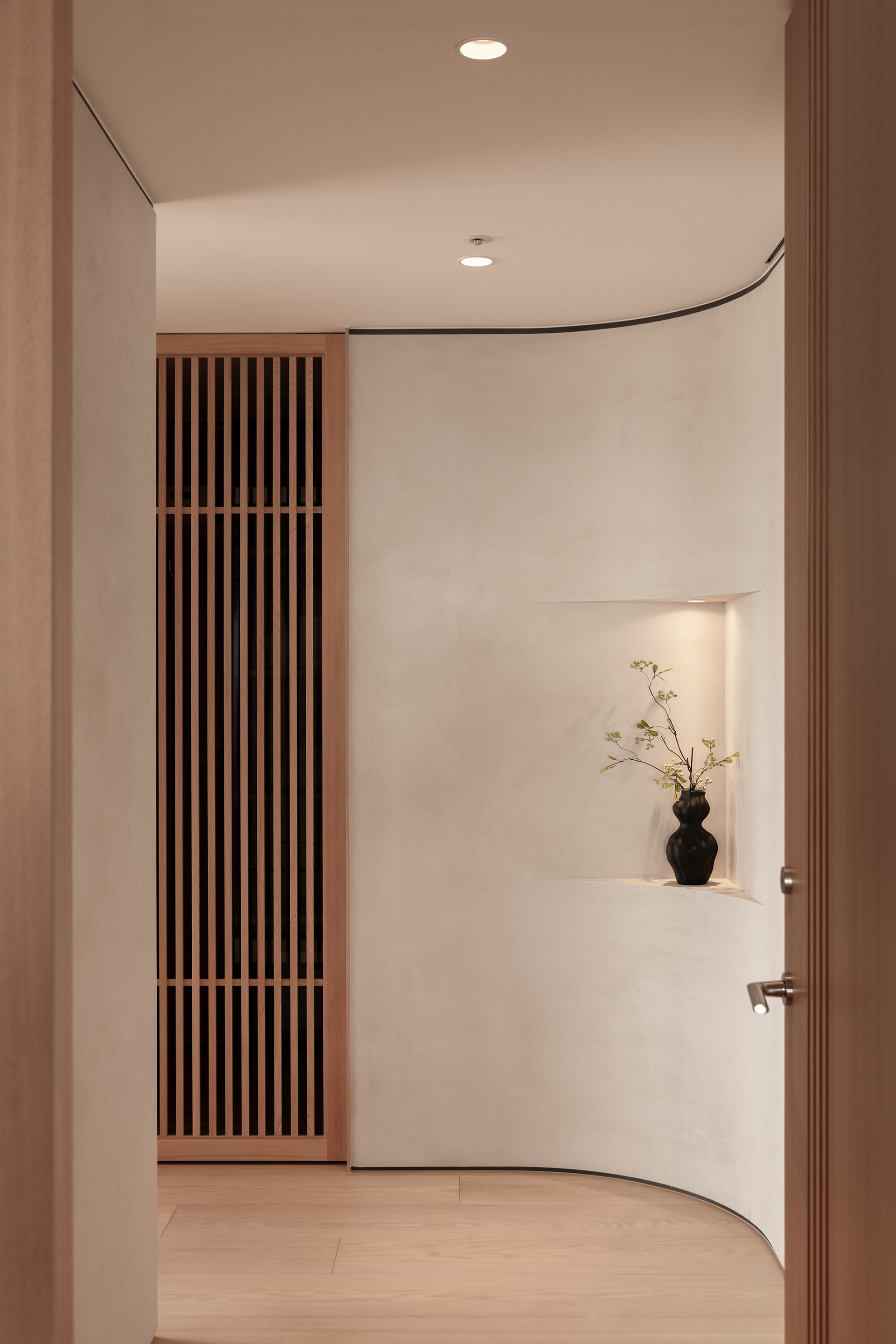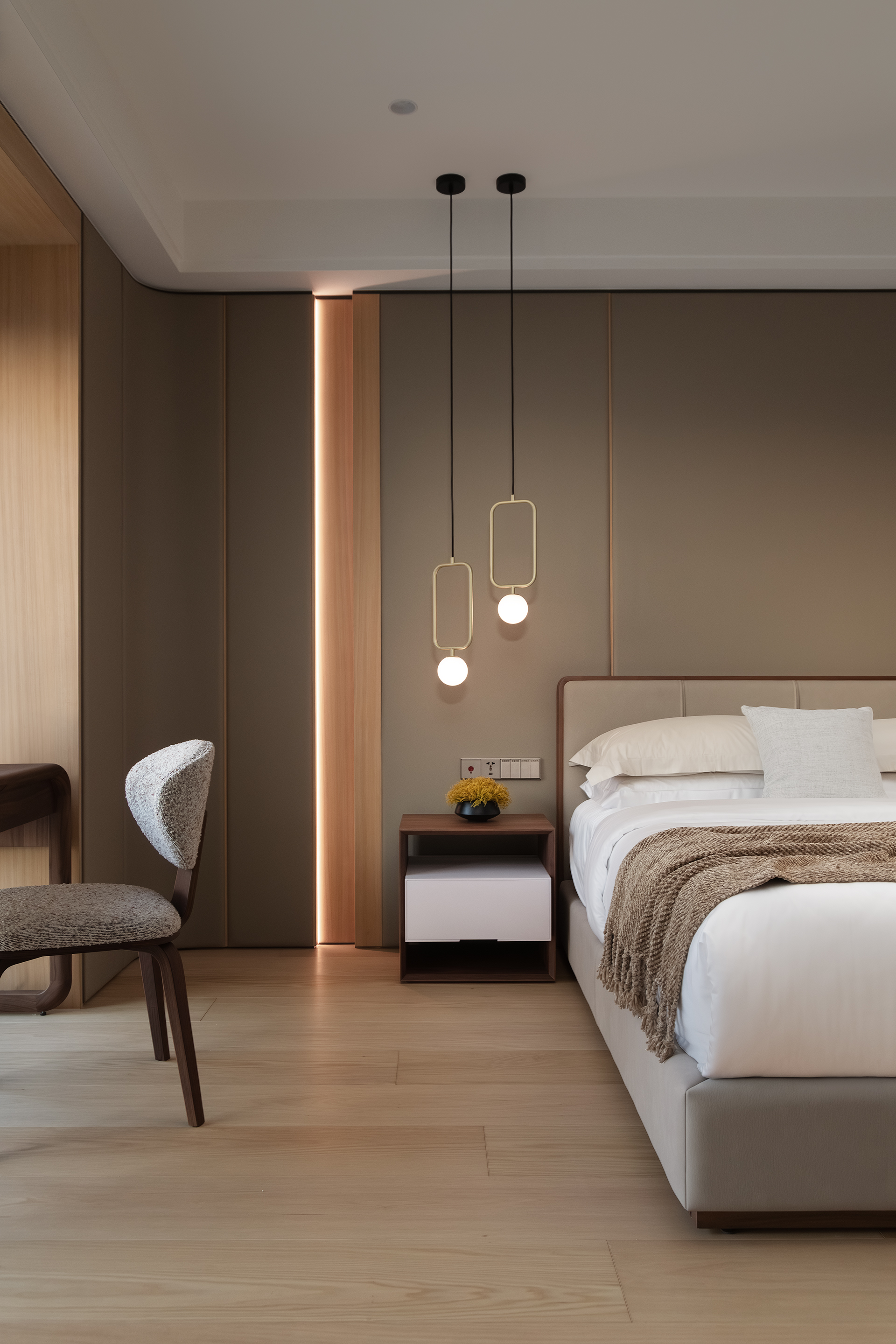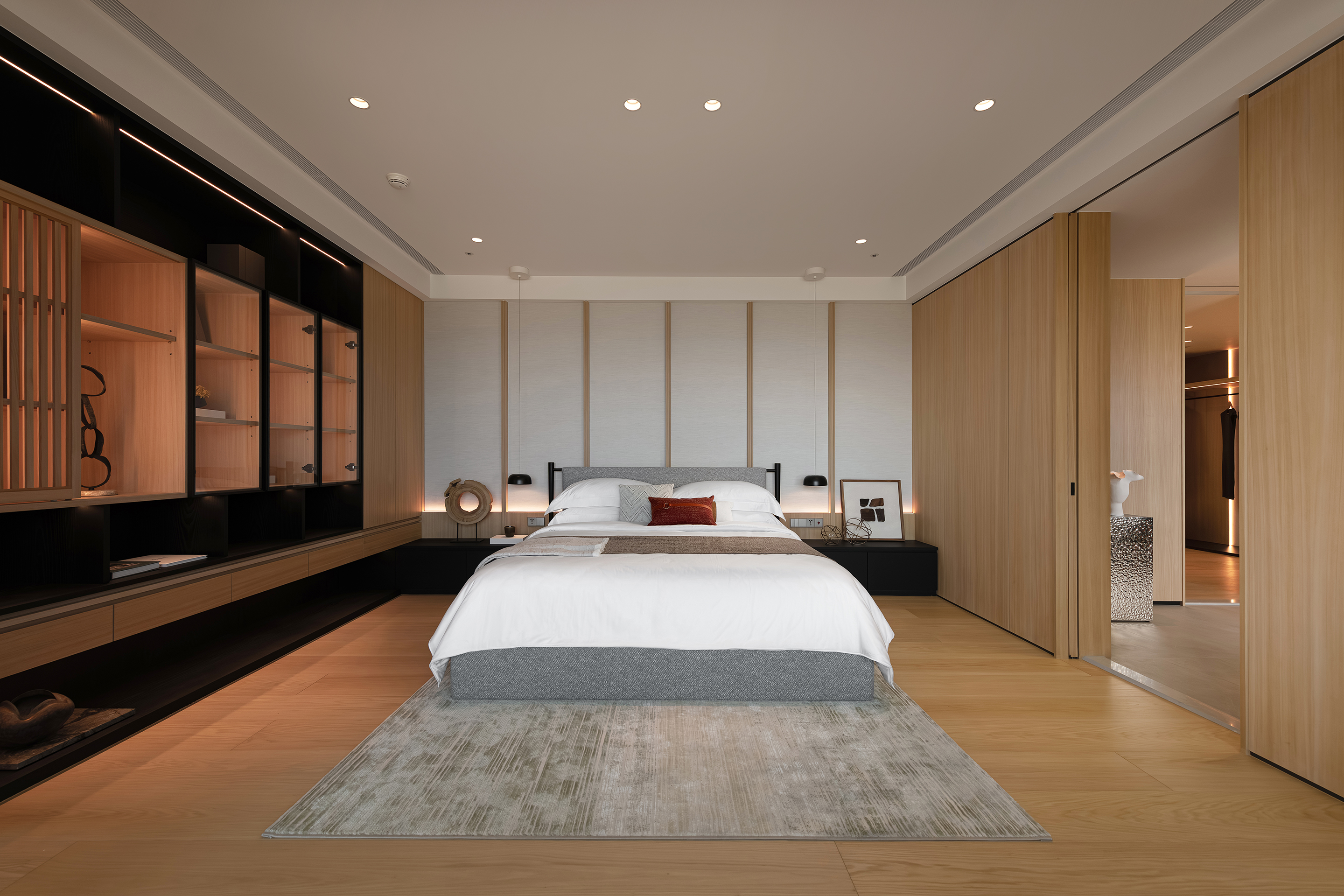 大地色系中,軟裝依循JAPANDI手法為空間刻劃著色,軟裝材質上選用自然中性色調,營造出寧靜而不冷清的基底,並透過質地豐富的天然材質(如實木、亞麻、藤編、陶器等)堆疊層次,賦予每一處角落細膩的觸感與溫度。