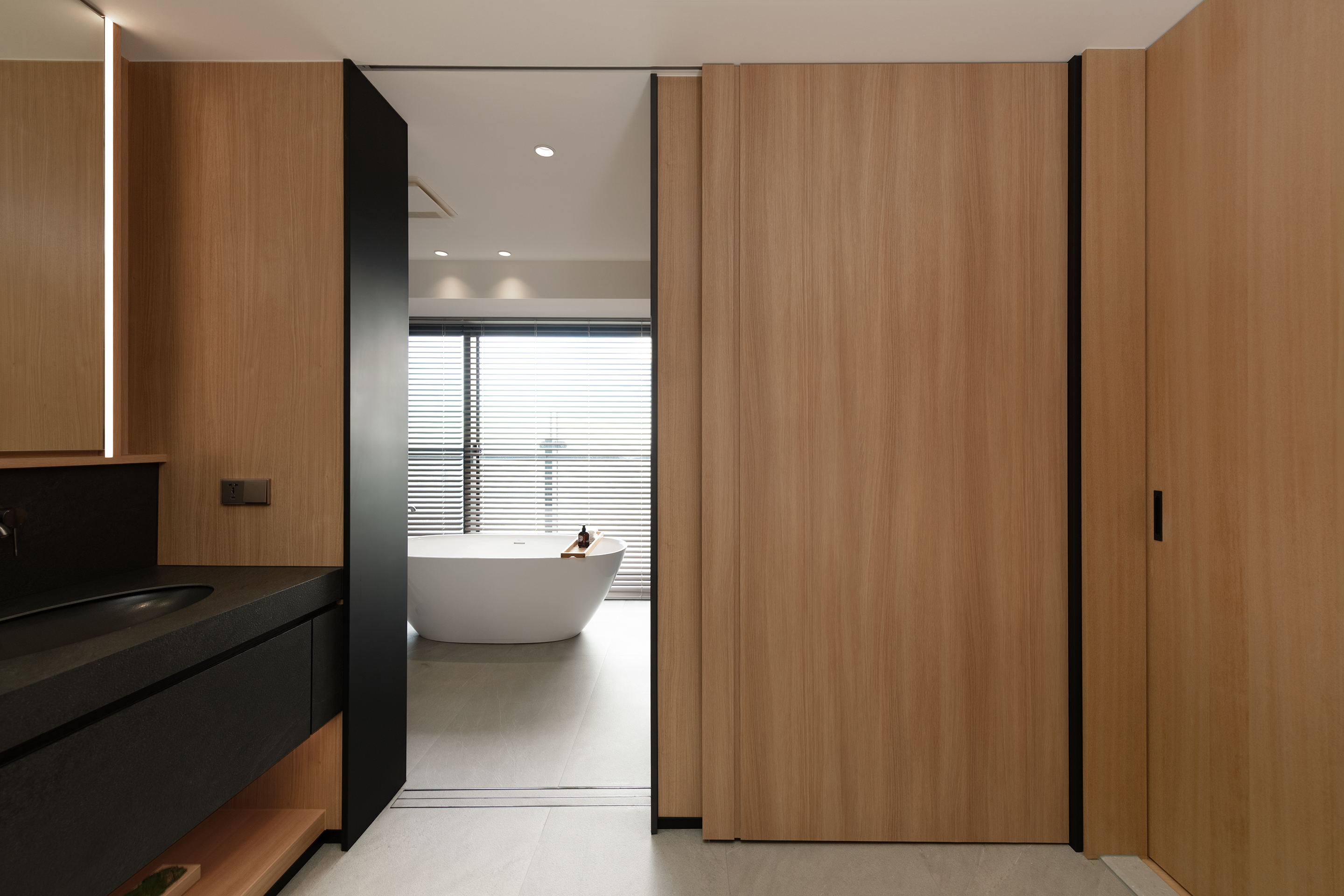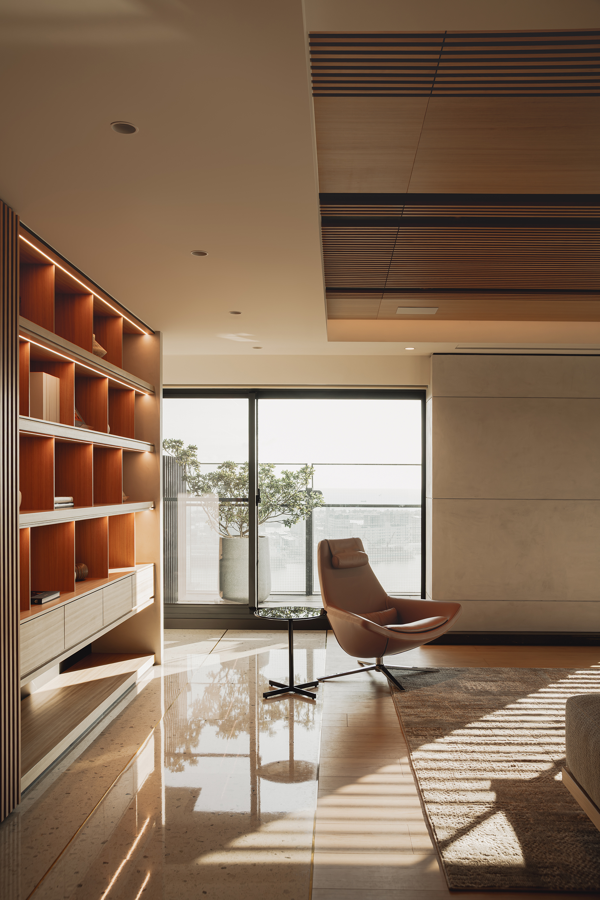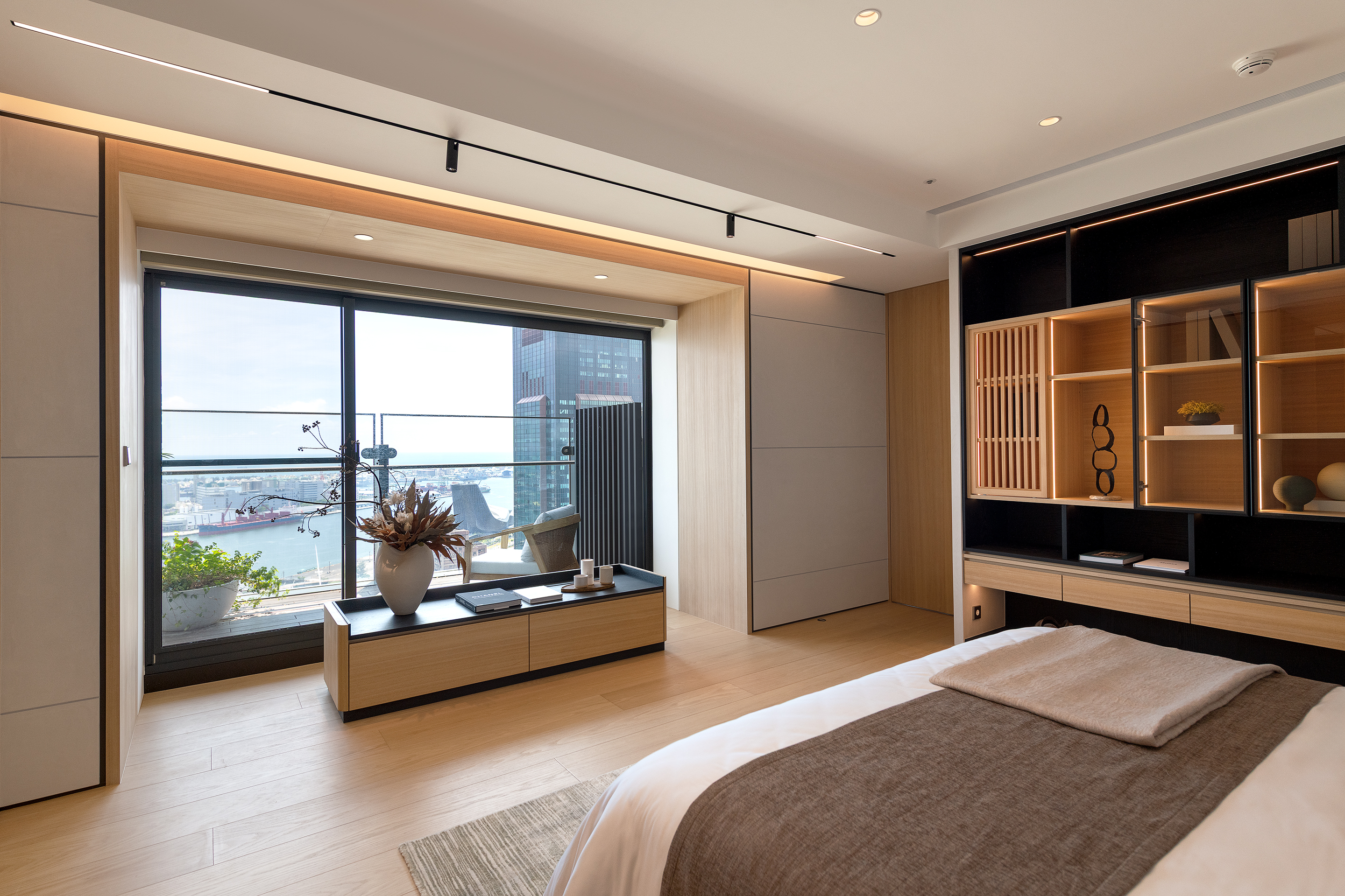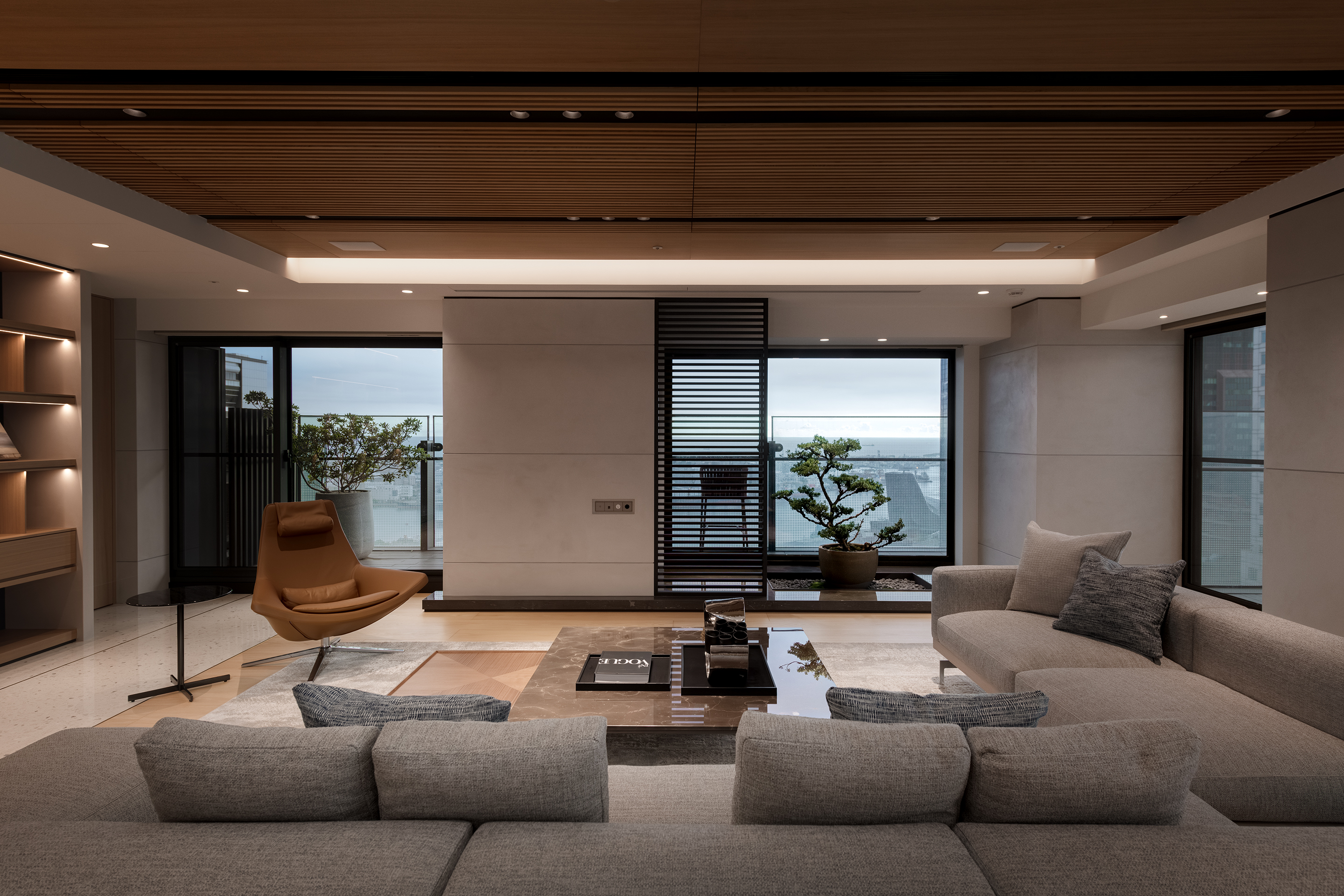 空间意境:「Aman」在梵語中代表著安靜、平和,我們以此為核心,運用檜木及石材的紋理,以及藝術塗料的特殊岩紋質感,堆疊空間本體的自然氛圍,並透過借景手法,由落地窗引入市景與海景,替代傳統電視牆,配合室內園藝設置前、中、後景,營造具有深度、層次的空間。