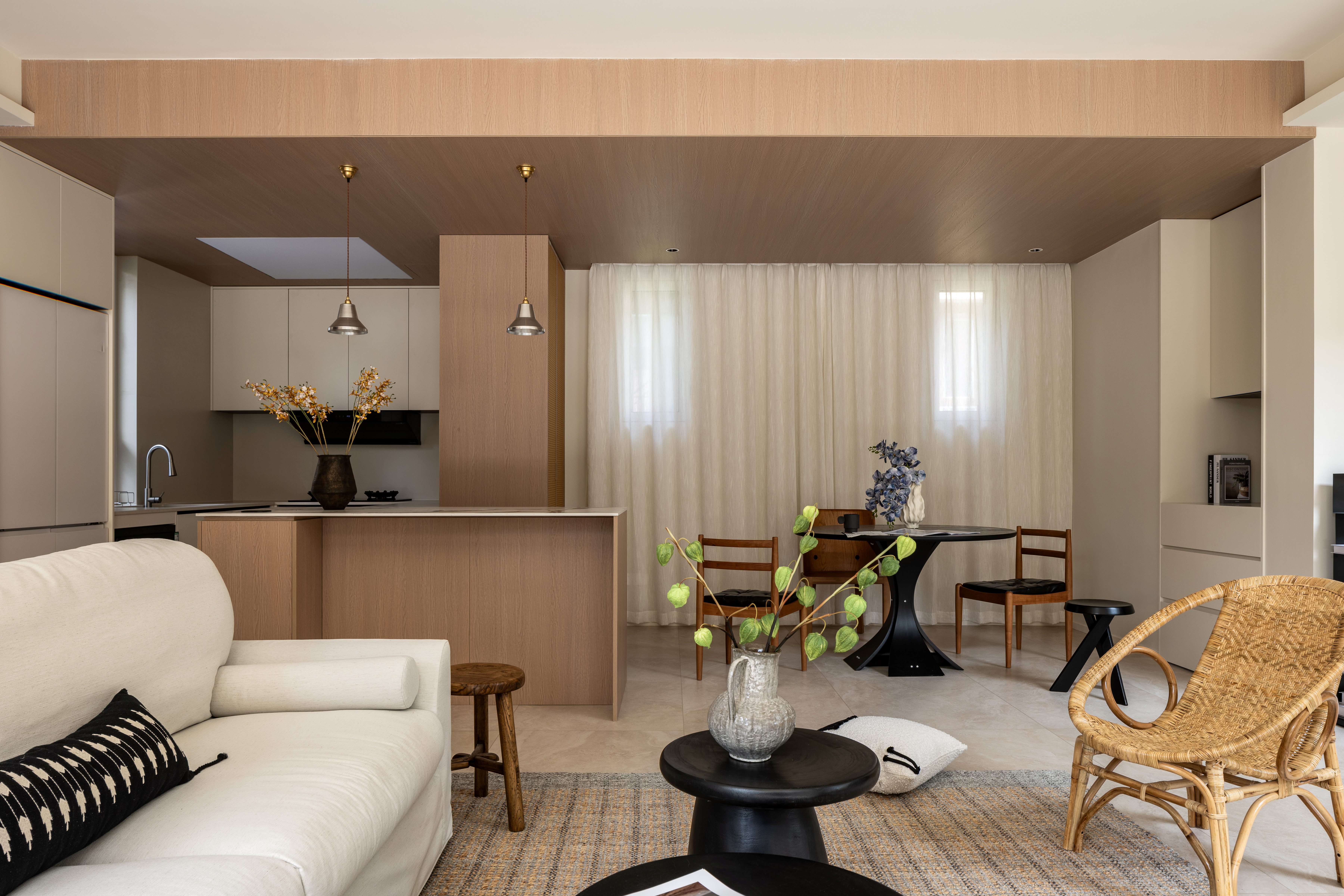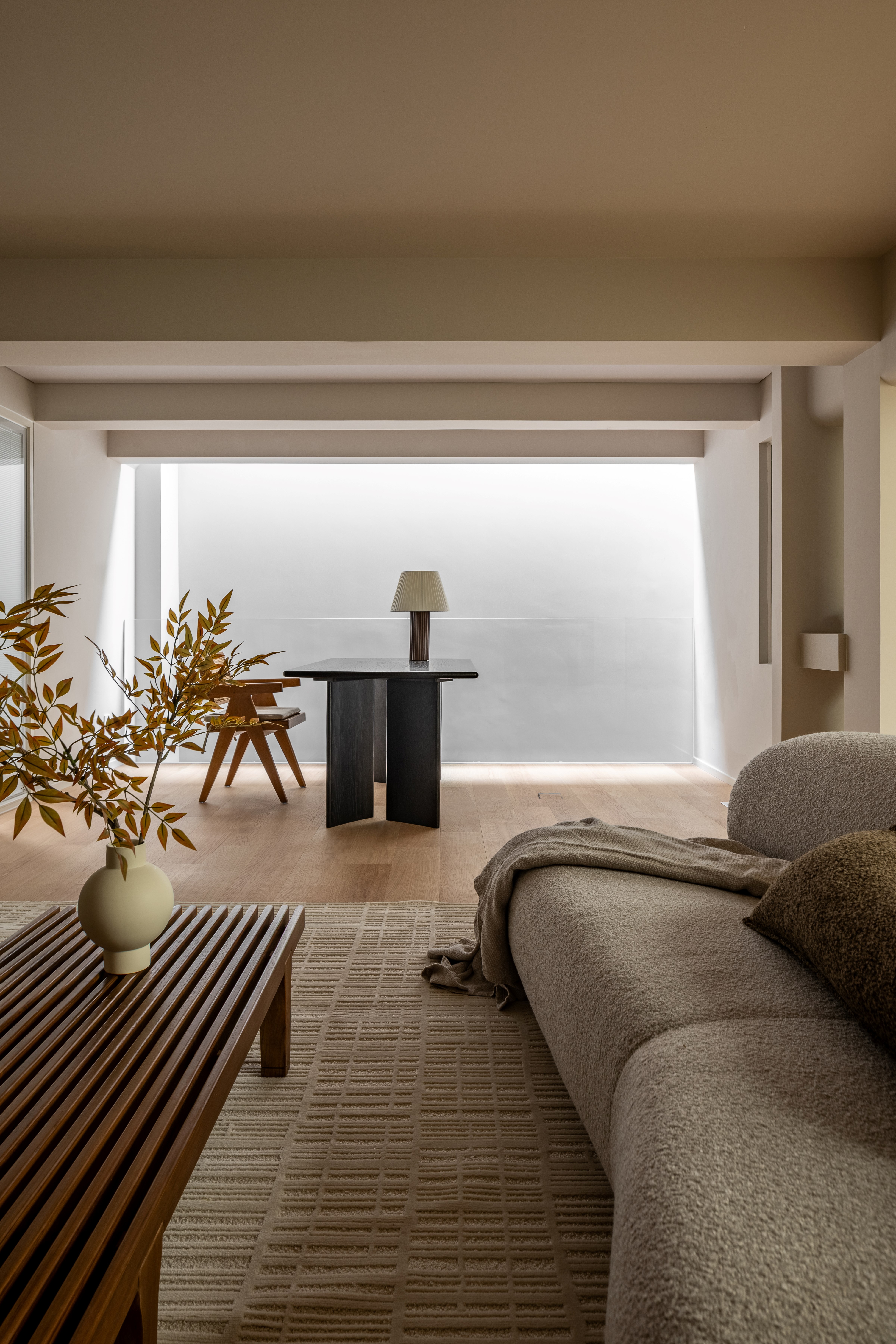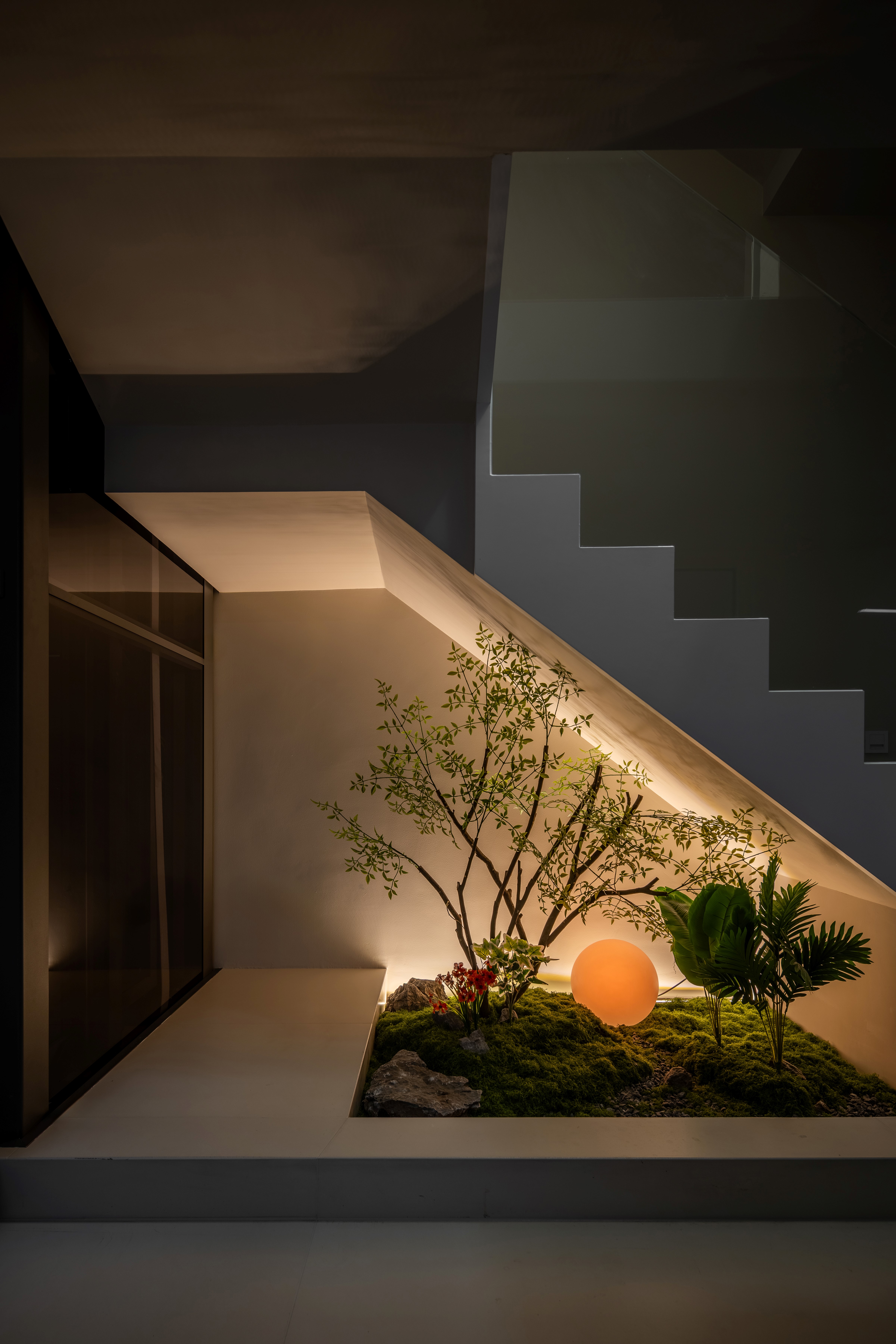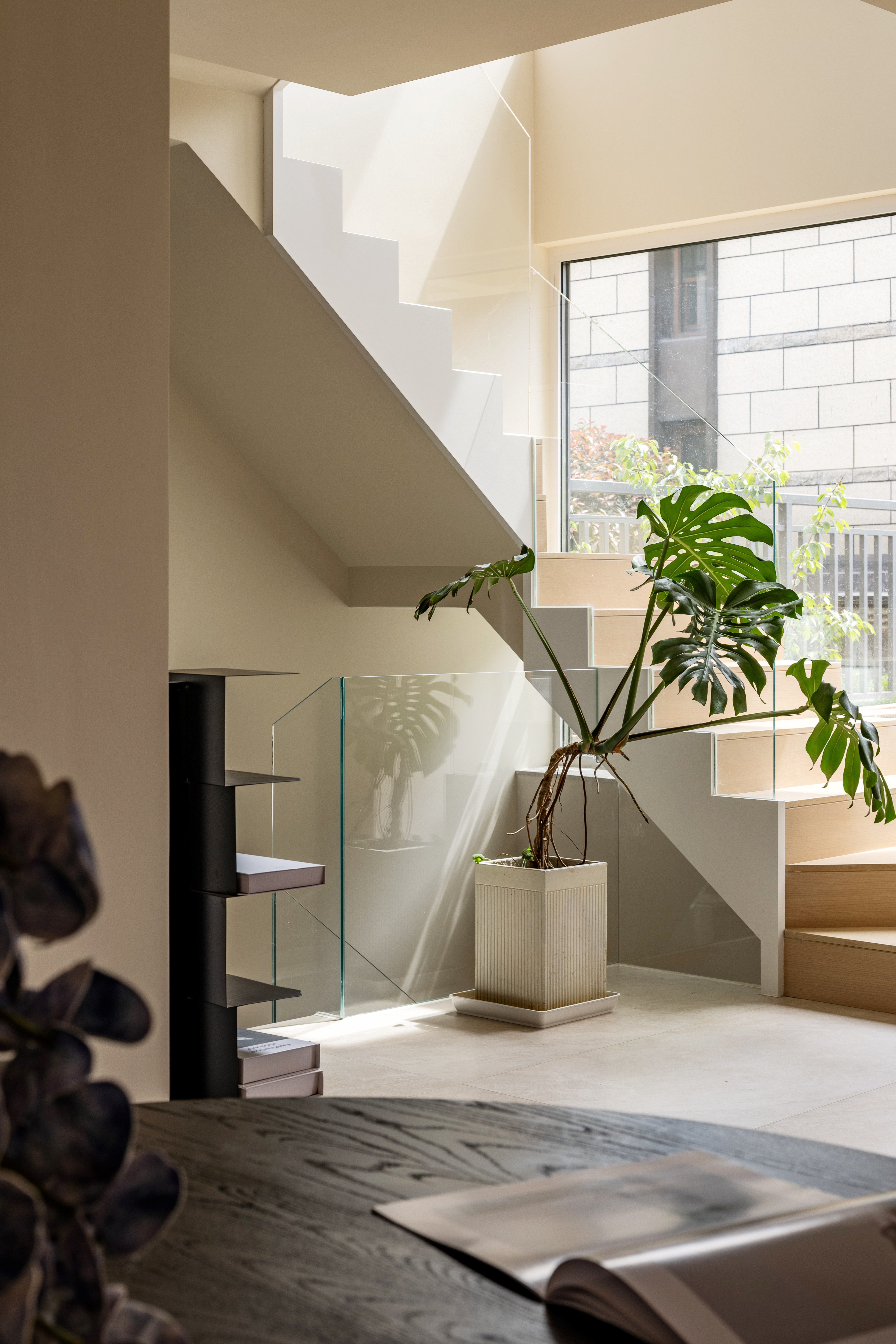 设计选材:选材策略强调“实用耐久与自然质感”,注重性价比与后期维护。在关键高频使用区(如楼梯、厨房、卫生间)采用优质耐用的材料,确保长期品质。大量运用玻璃、浅色材质增强光线反射,减少人工照明依赖。利用天井绿植、原木元素等软化空间,呼应自然主题,在控制造价的同时营造温暖质朴的宜居感。