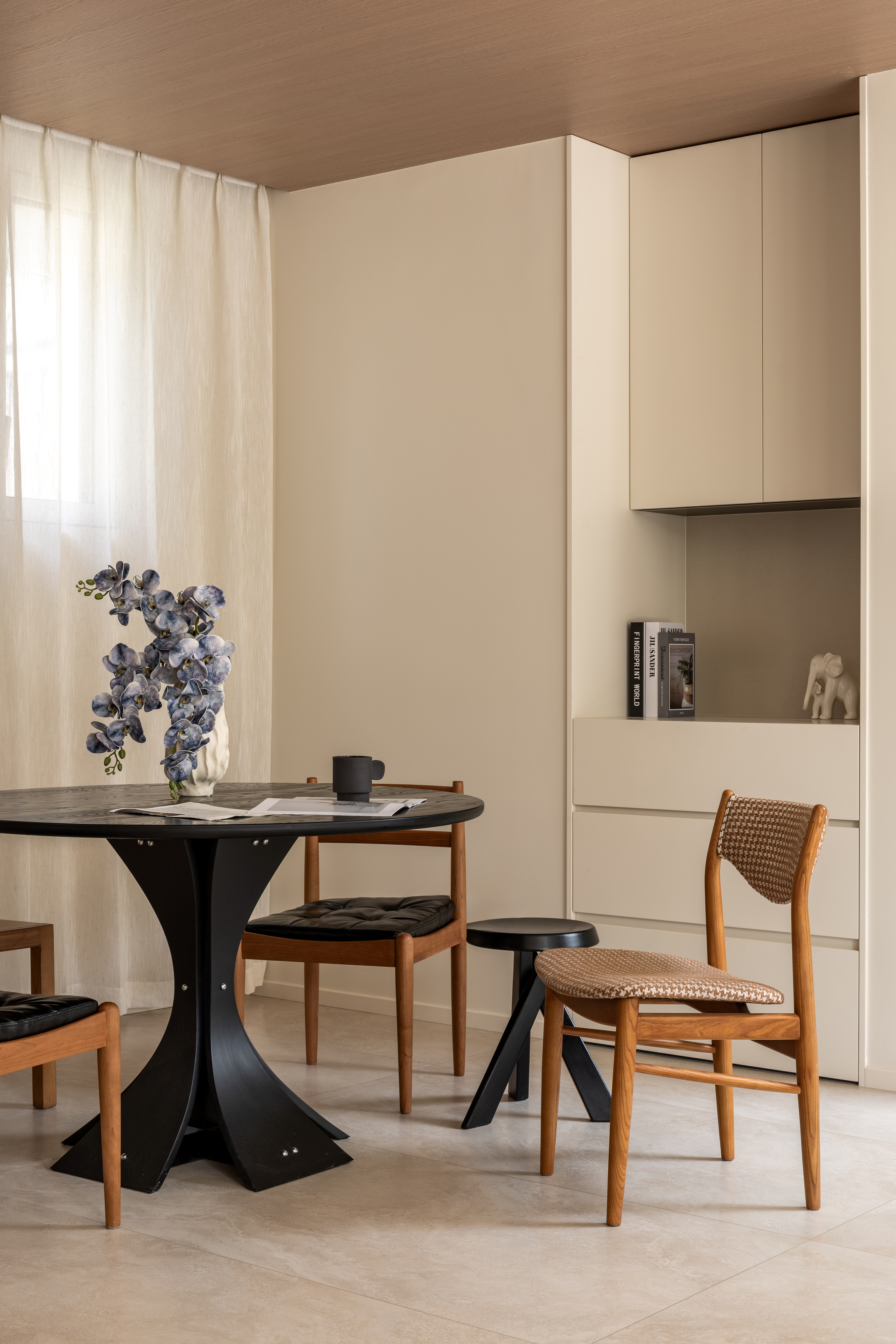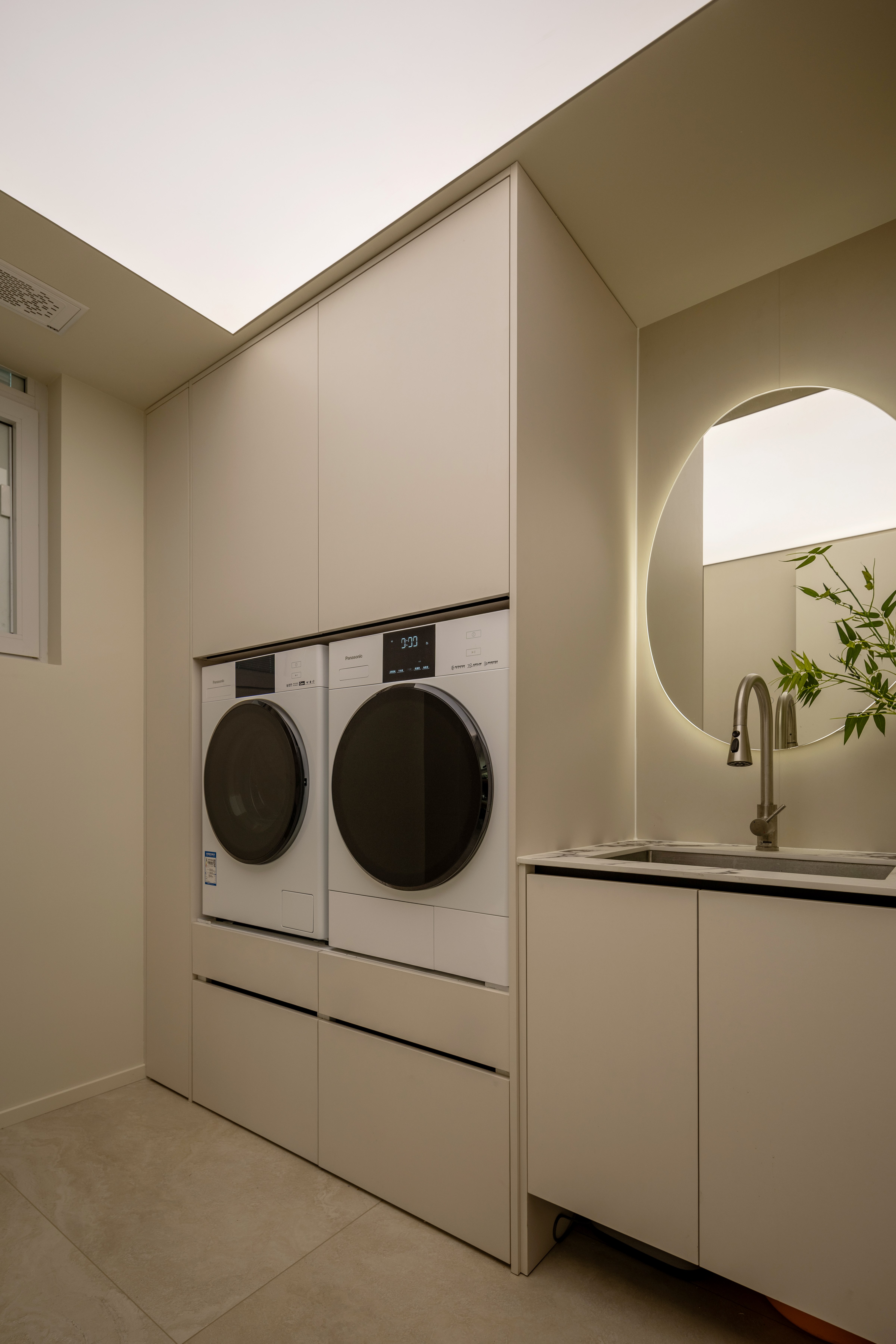 空间布局:布局核心创新在于“竖向功能重构与动线再造”。将4.9米层高地下室现浇隔为两层,倍增功能空间;移位楼梯并加装电梯,形成高效垂直动线,解放首层空间,实现餐厨厅院一体化。二楼成功实现两房变三房,并为主卧嵌入独立衣帽间。全案以“一层活动、二层居住、地下拓展”清晰划分,实现空间价值最大化。