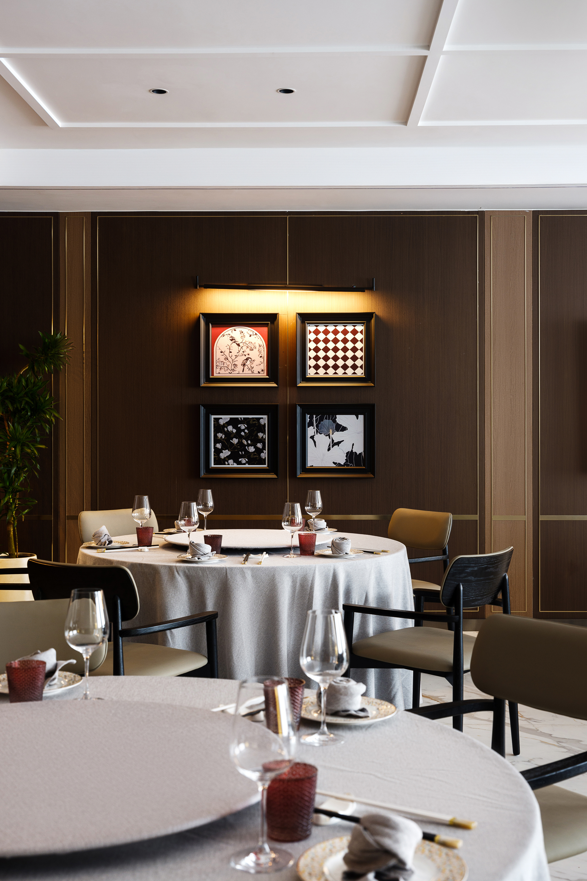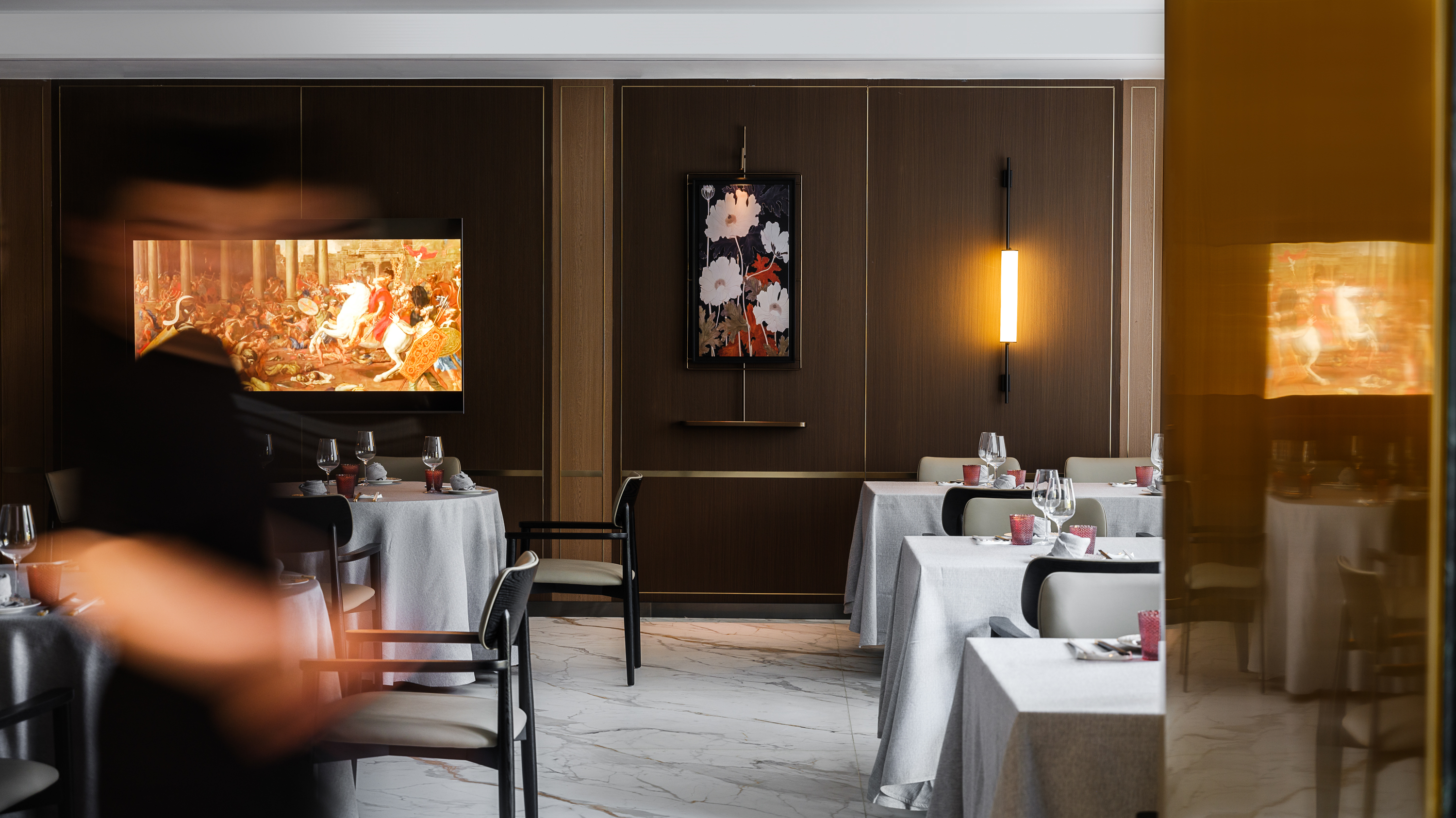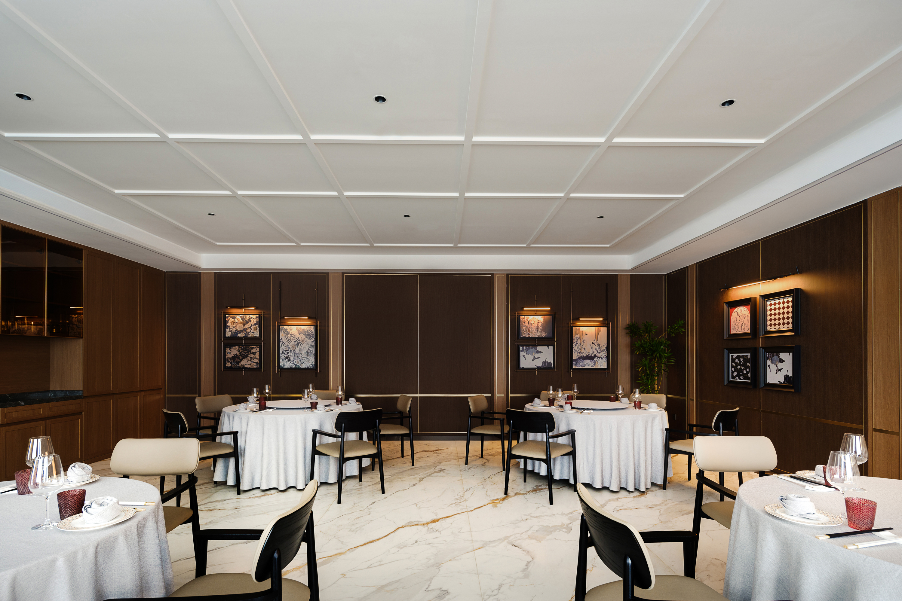 创新加入细窄金属边框与金属杆挂画,灯光下折射出低调的轻奢质感,诠释“食不厌精”的当代表达。