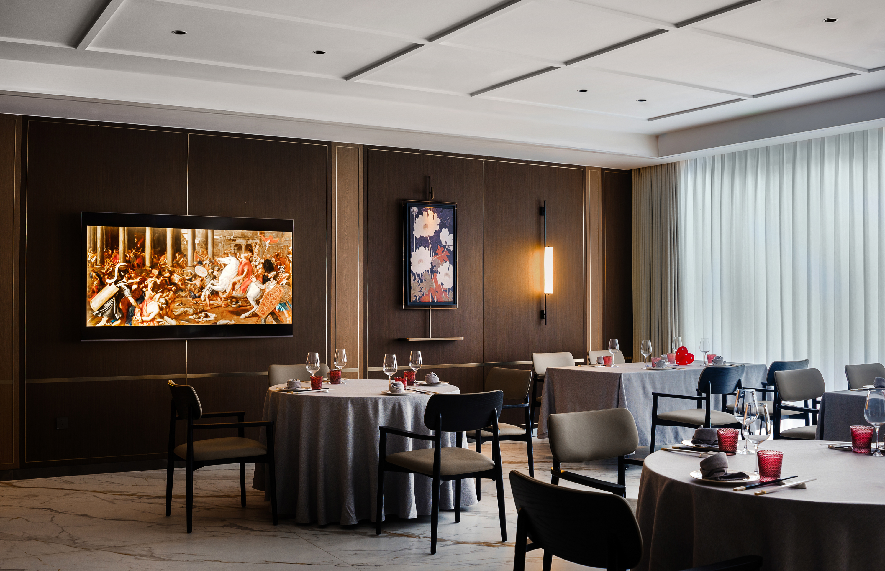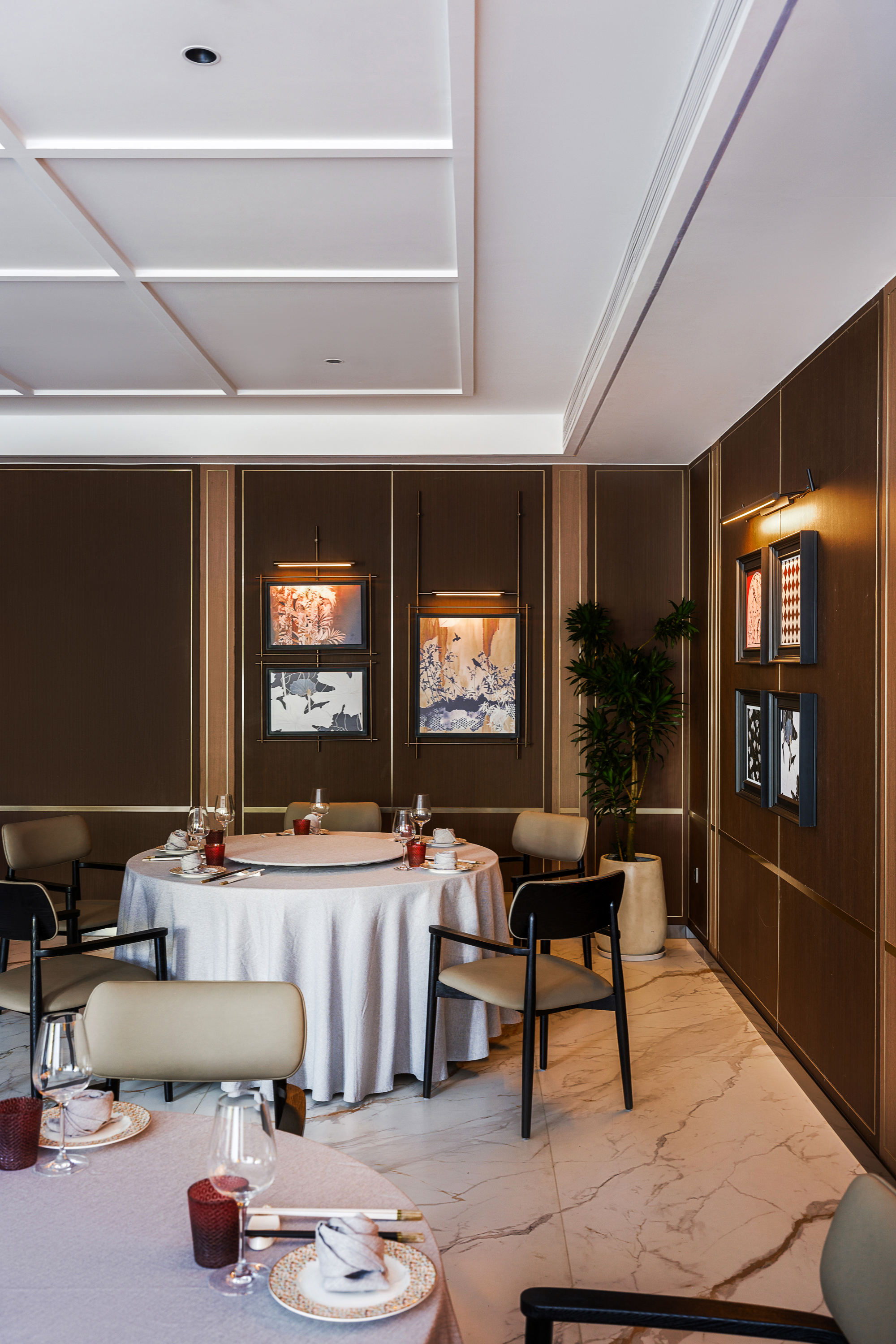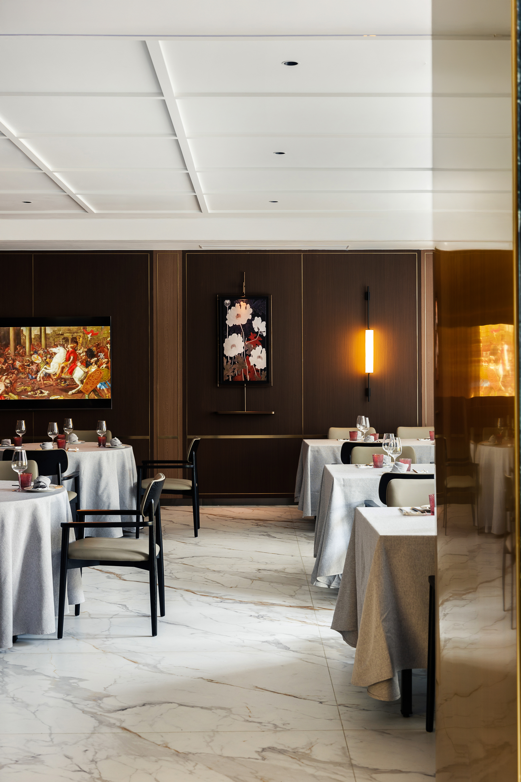 创新加入细窄金属边框与金属杆挂画,灯光下折射出低调的轻奢质感,诠释“食不厌精”的当代表达。