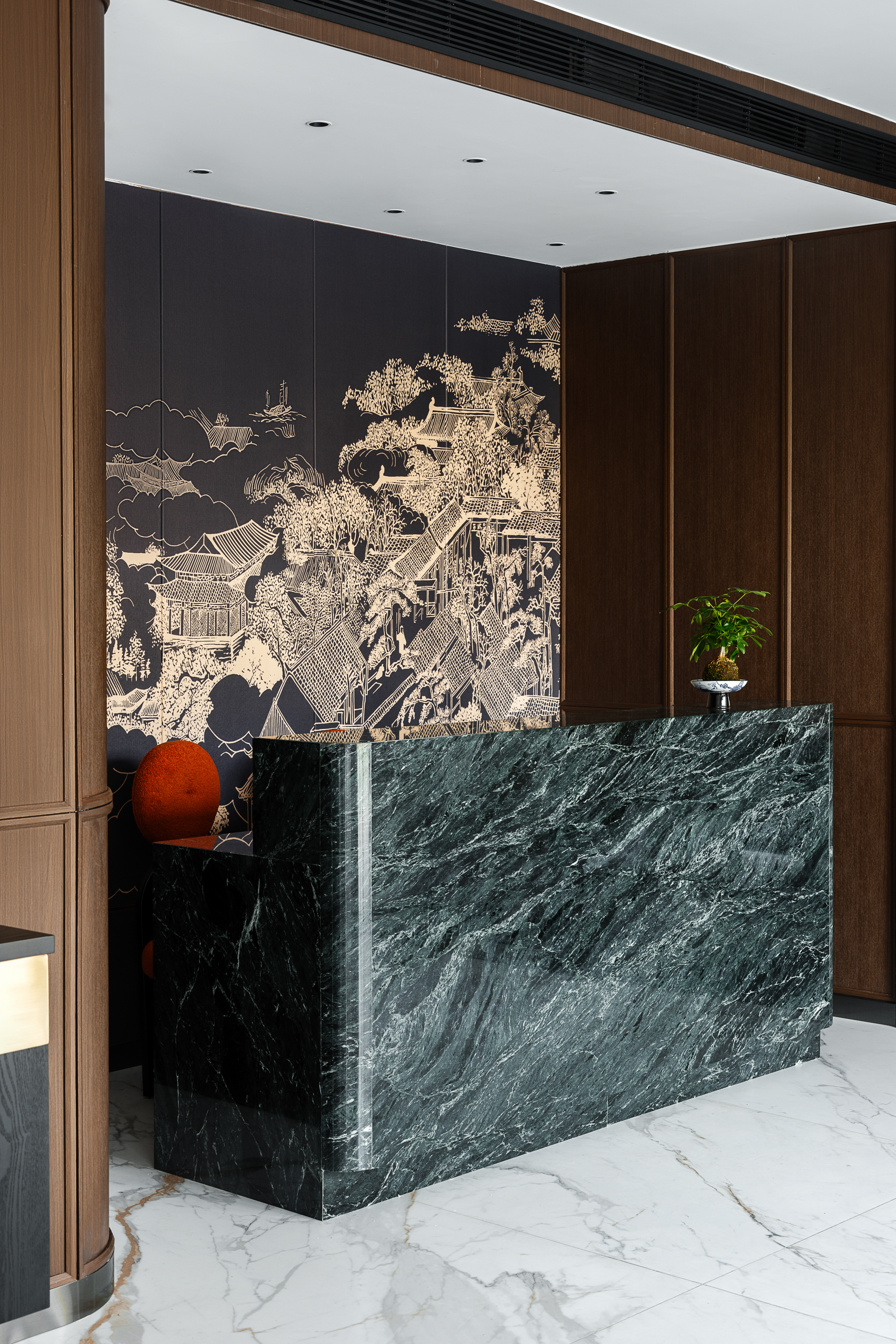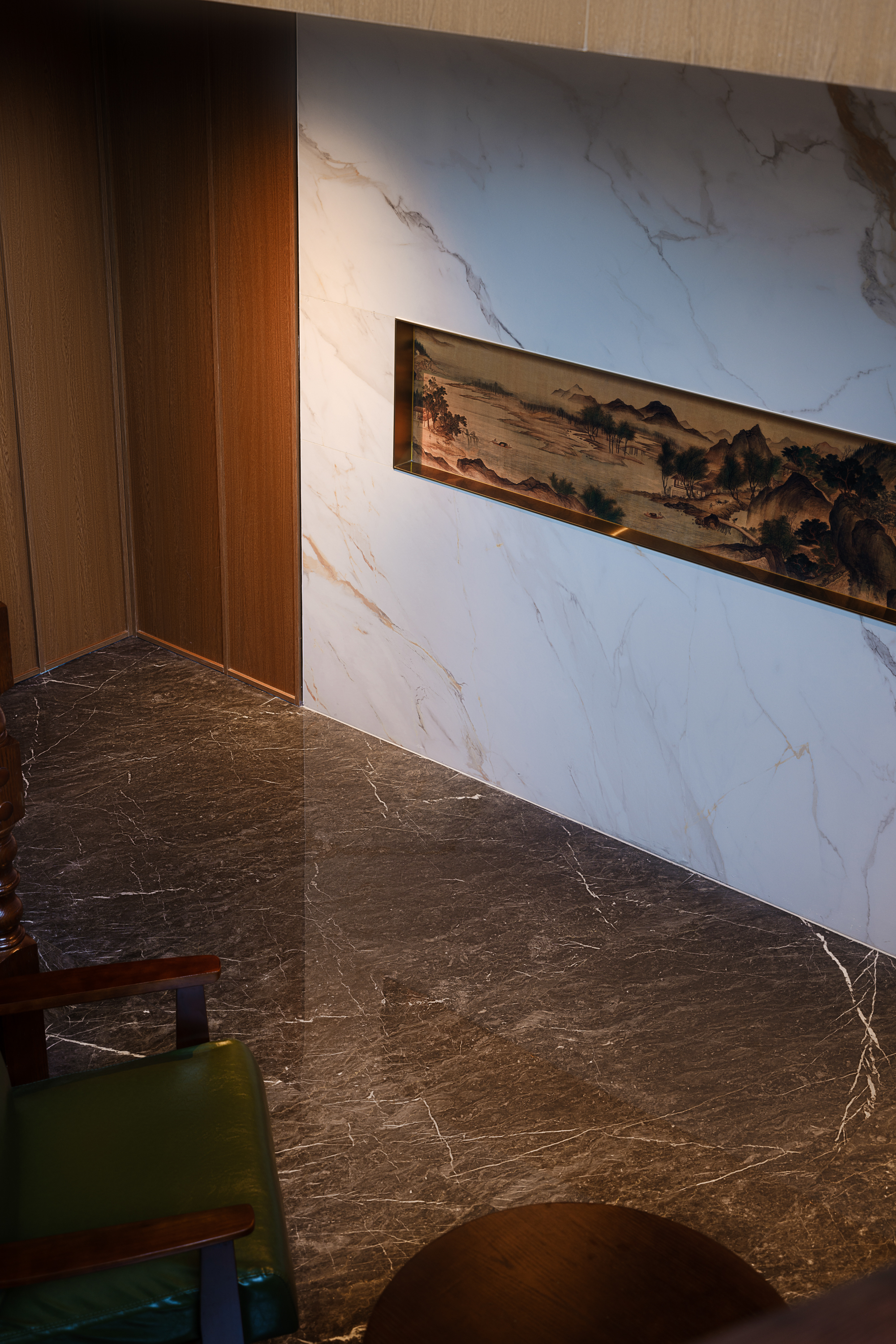 楼梯转折处的夹层化身“微型园林”:墨绿皮质沙发搭配胡桃木圆几,深咖大理石地砖如砚台墨迹,白色大理石墙面悬挂中式山水横幅,方寸之间自成天地。