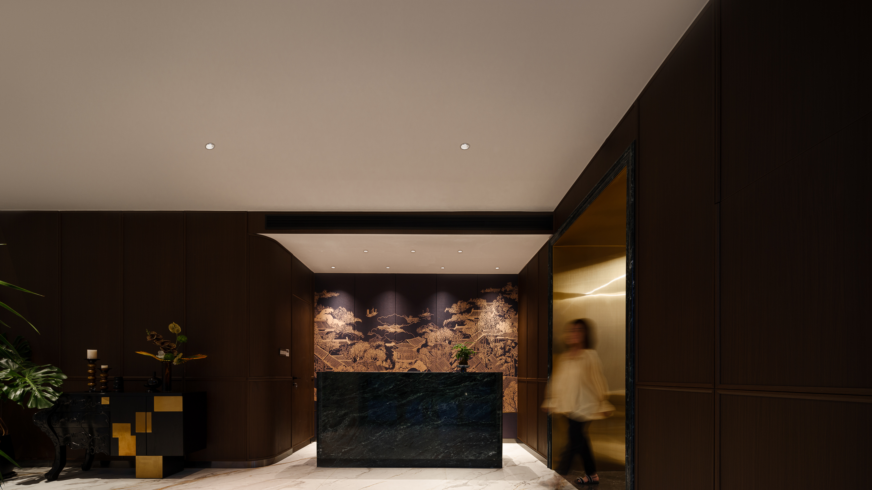 电动门开启,映入眼帘的是整块绿色奢石前台,纹理如泼墨山水;背景墙以胡桃木饰面为底,嵌入宋式五联拼版画,几何拼接的立体层次与设计师款不对称餐边柜碰撞,古铜色金属垭口衔接大厅,东方雅韵与现代摩登在此无声交锋。