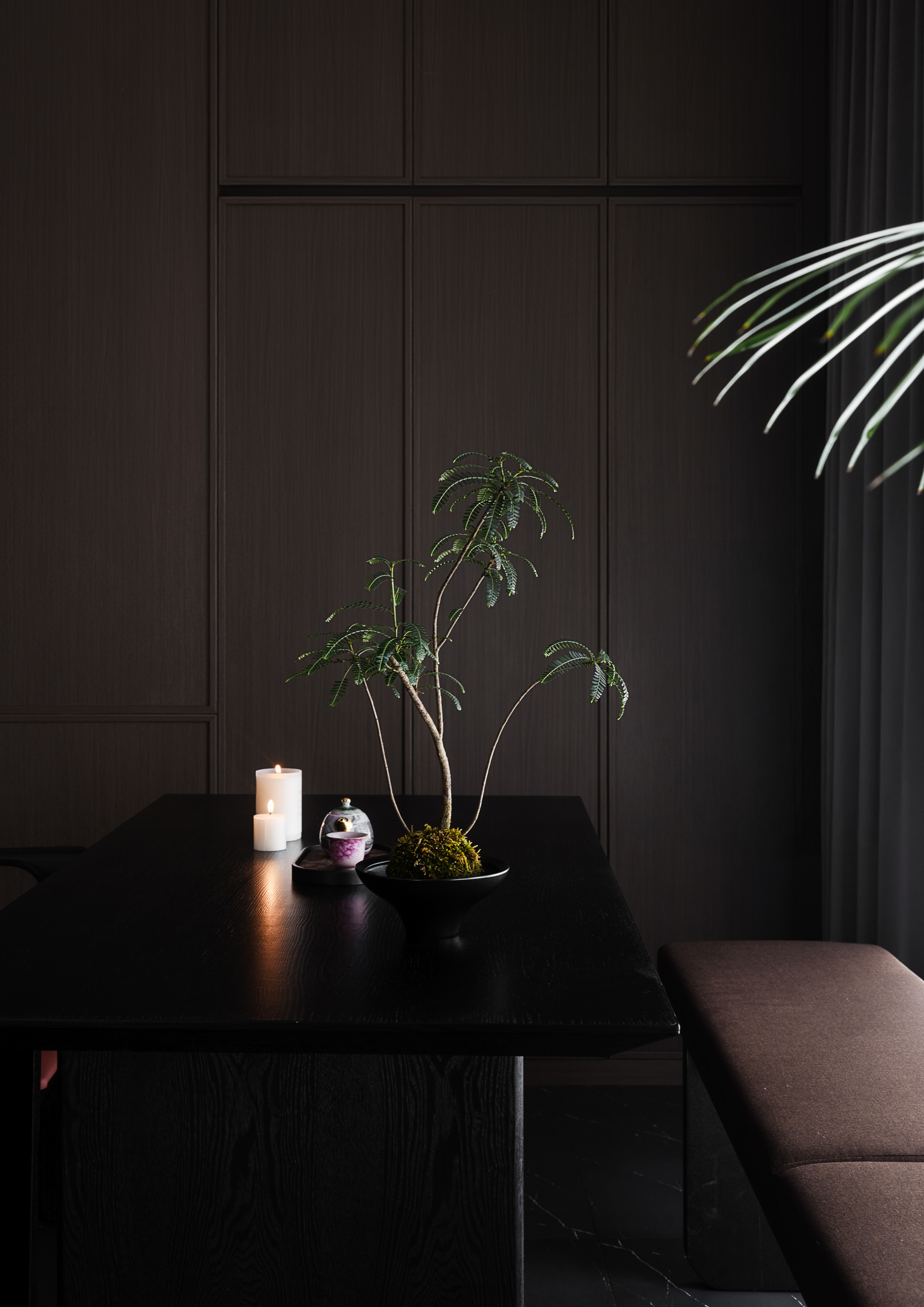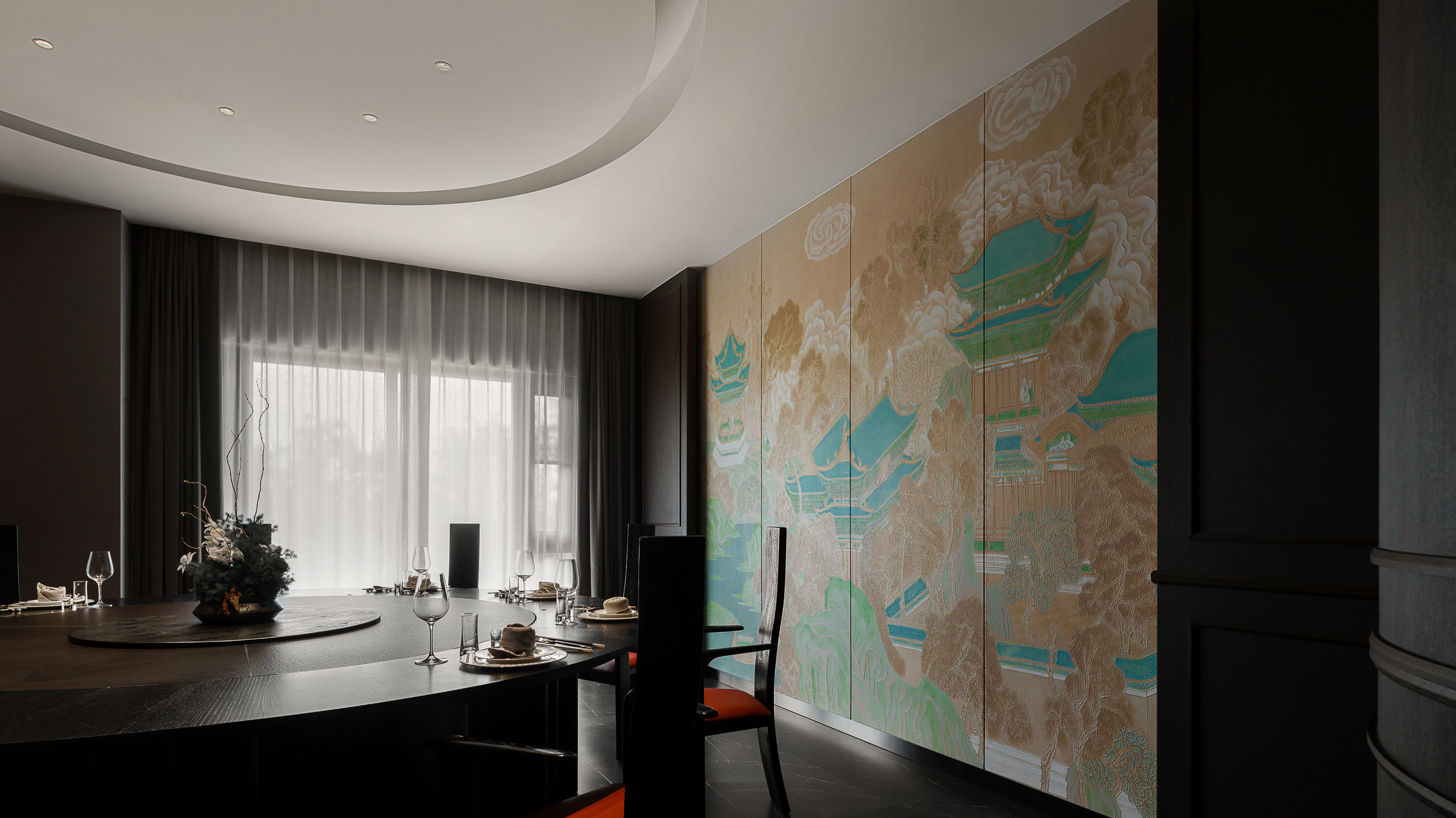 将军椅配独立茶台,背景墙用立体亭台楼阁画,黑红主色调彰显威仪,茶香与珍馐共叙江南风骨。
