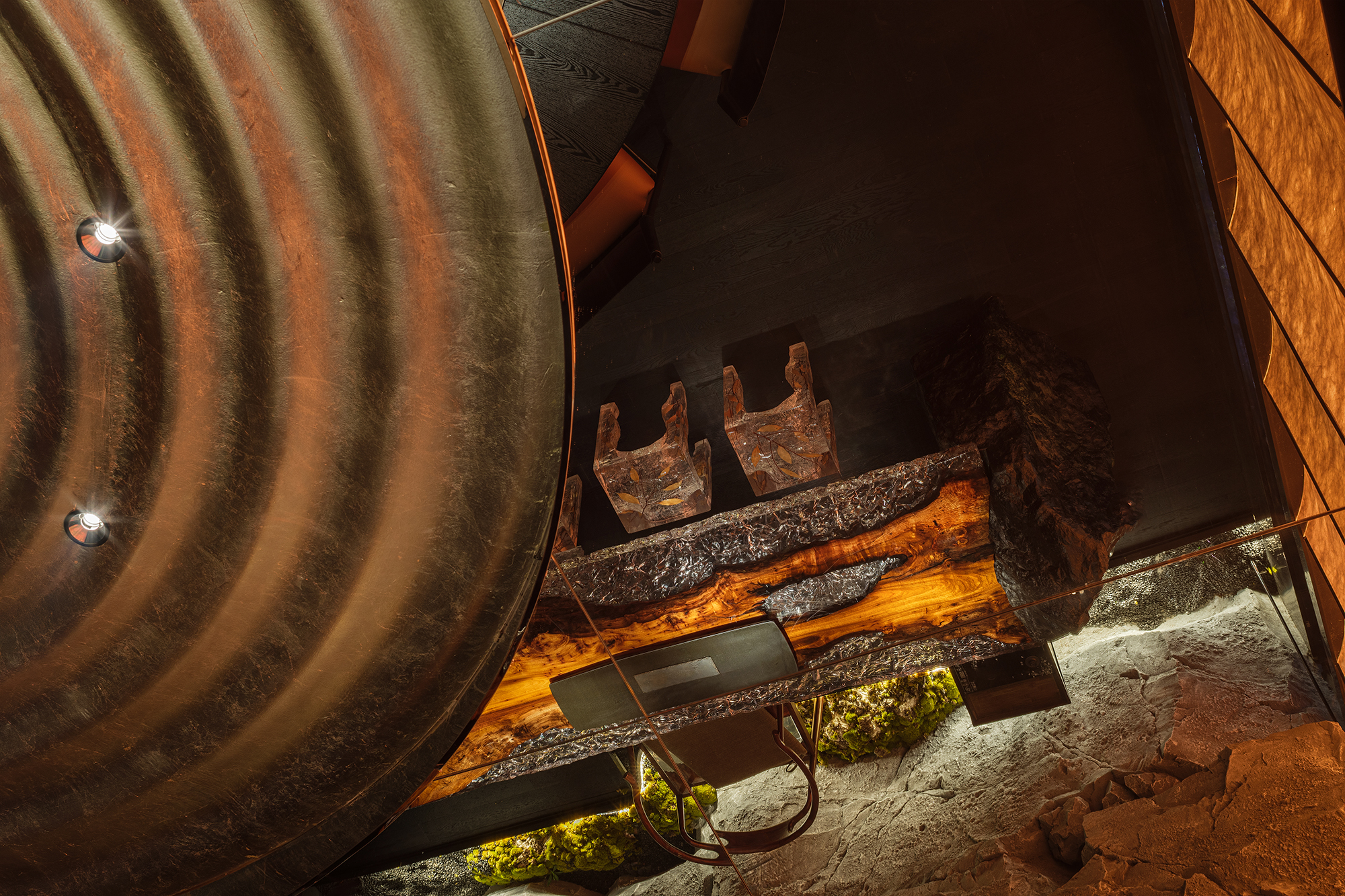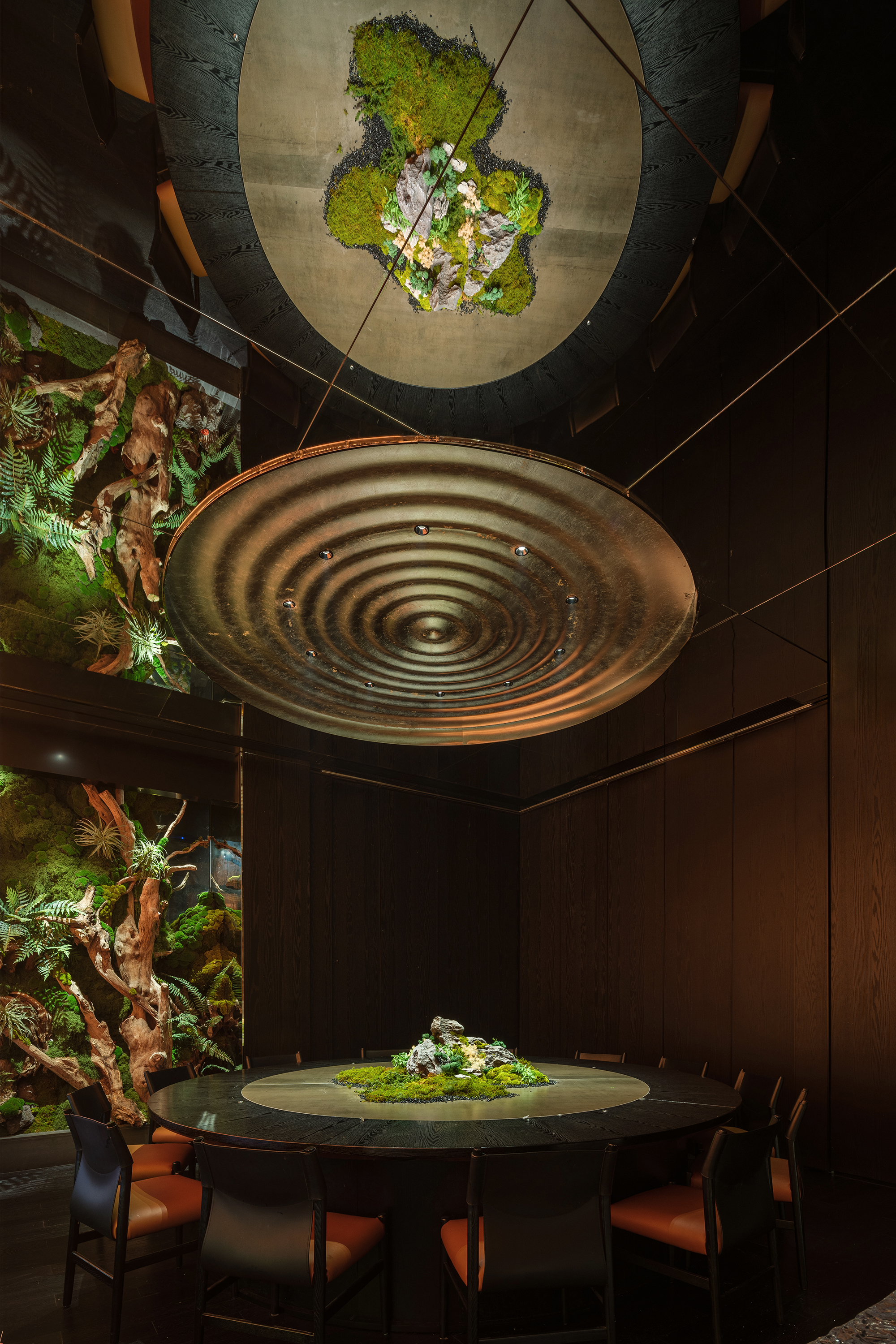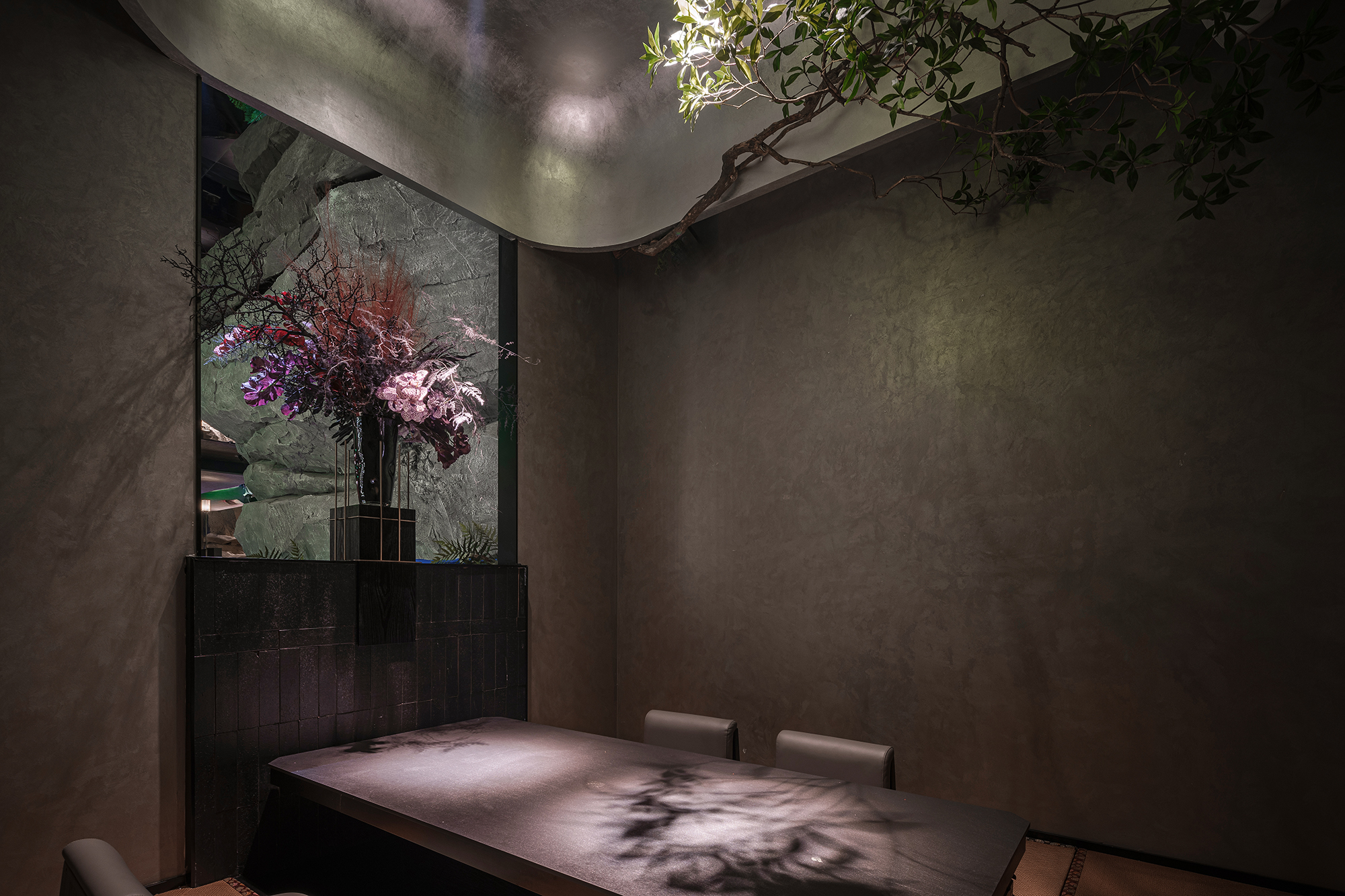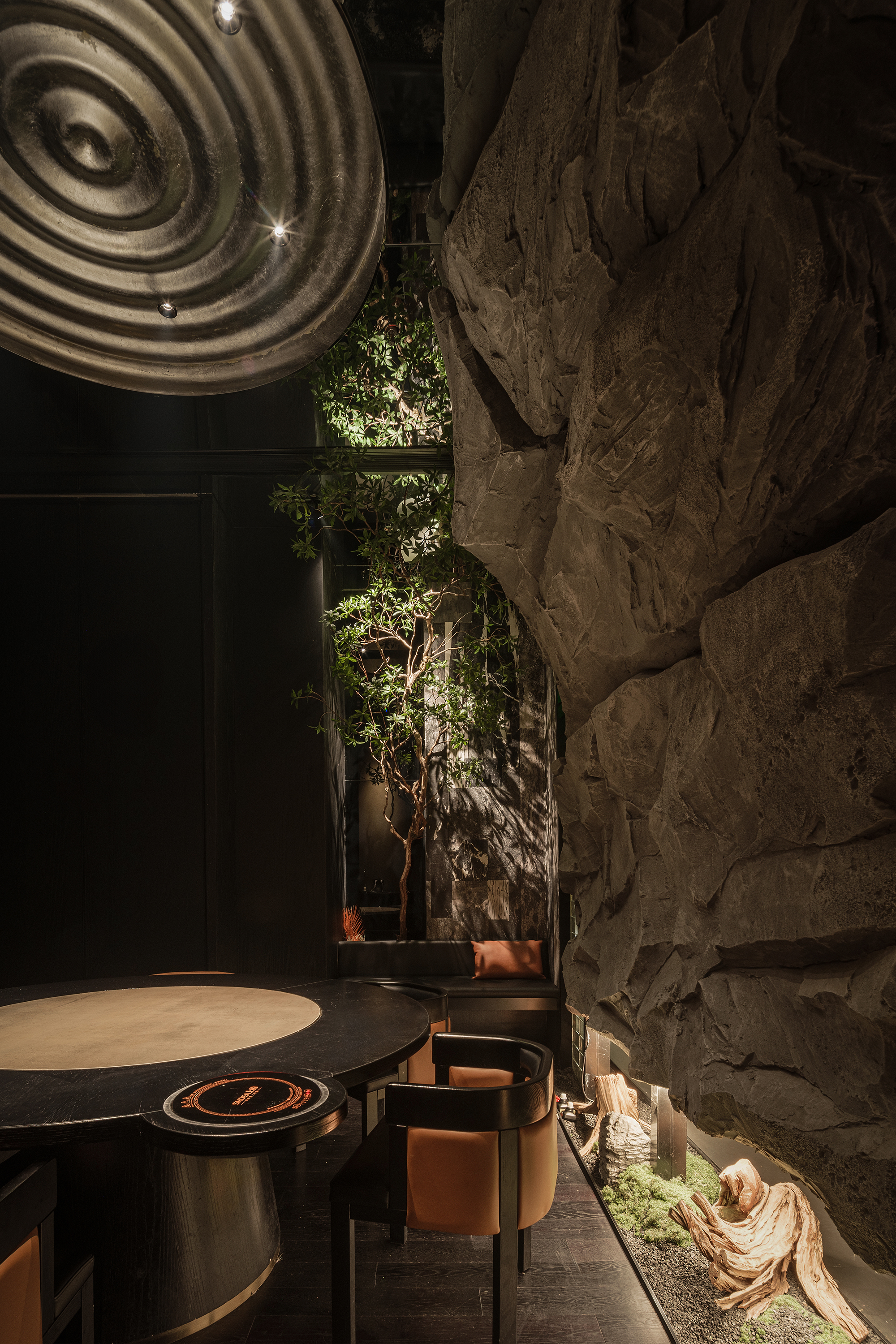苍劲枯木缠满苔藓,如从“山明水丽”的画中生长而出,石隙间绿意盎然,似把去年春游的山野气息凝于室内;暗奢长桌静立其间,与原生态的草木山石碰撞出野奢张力,恰是“往来游宴”的雅致落进了秘境深处。