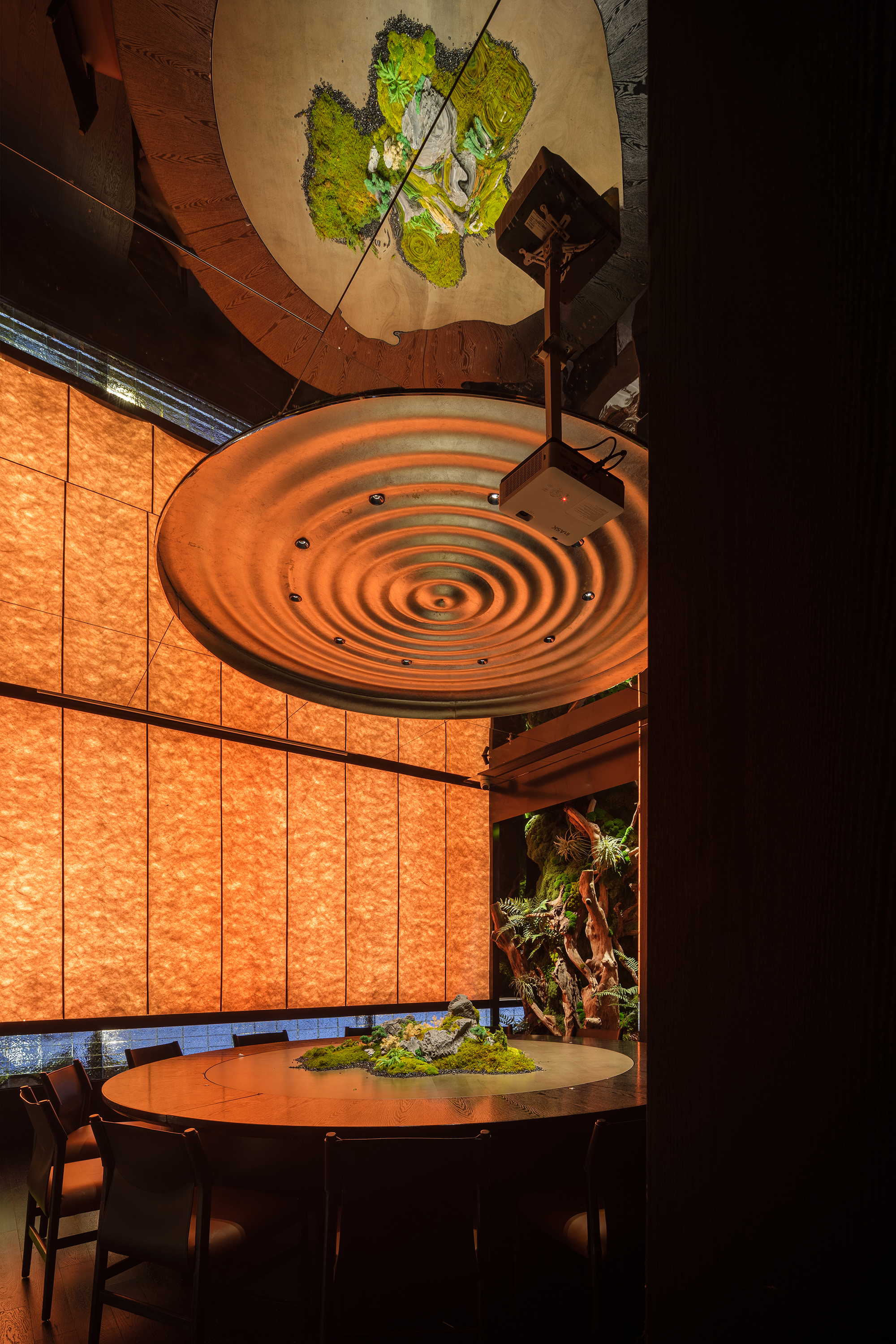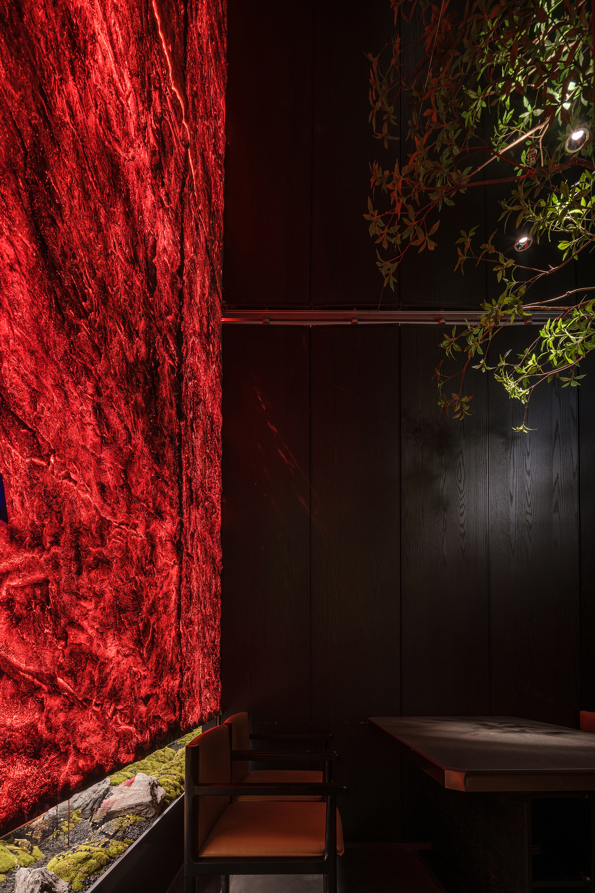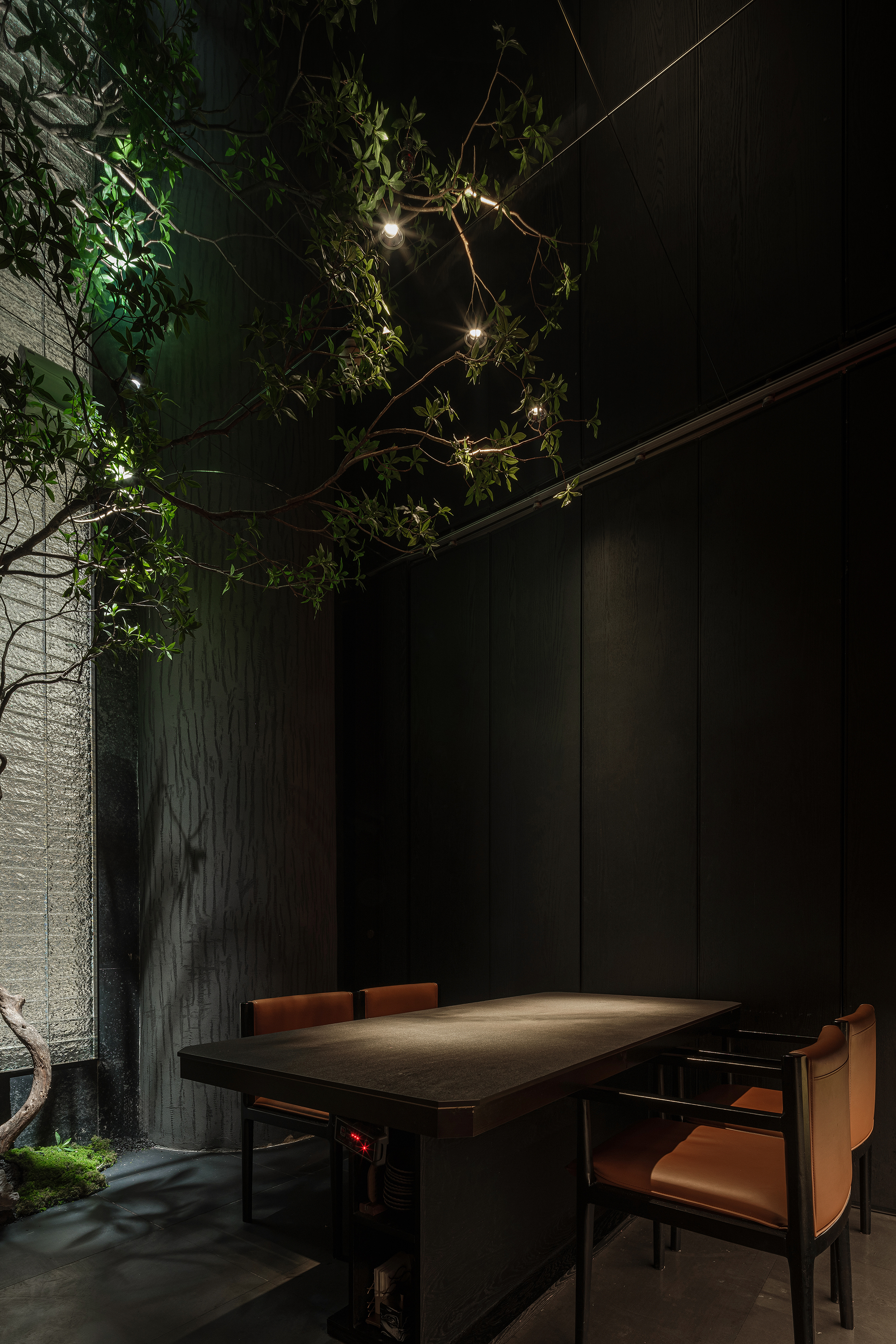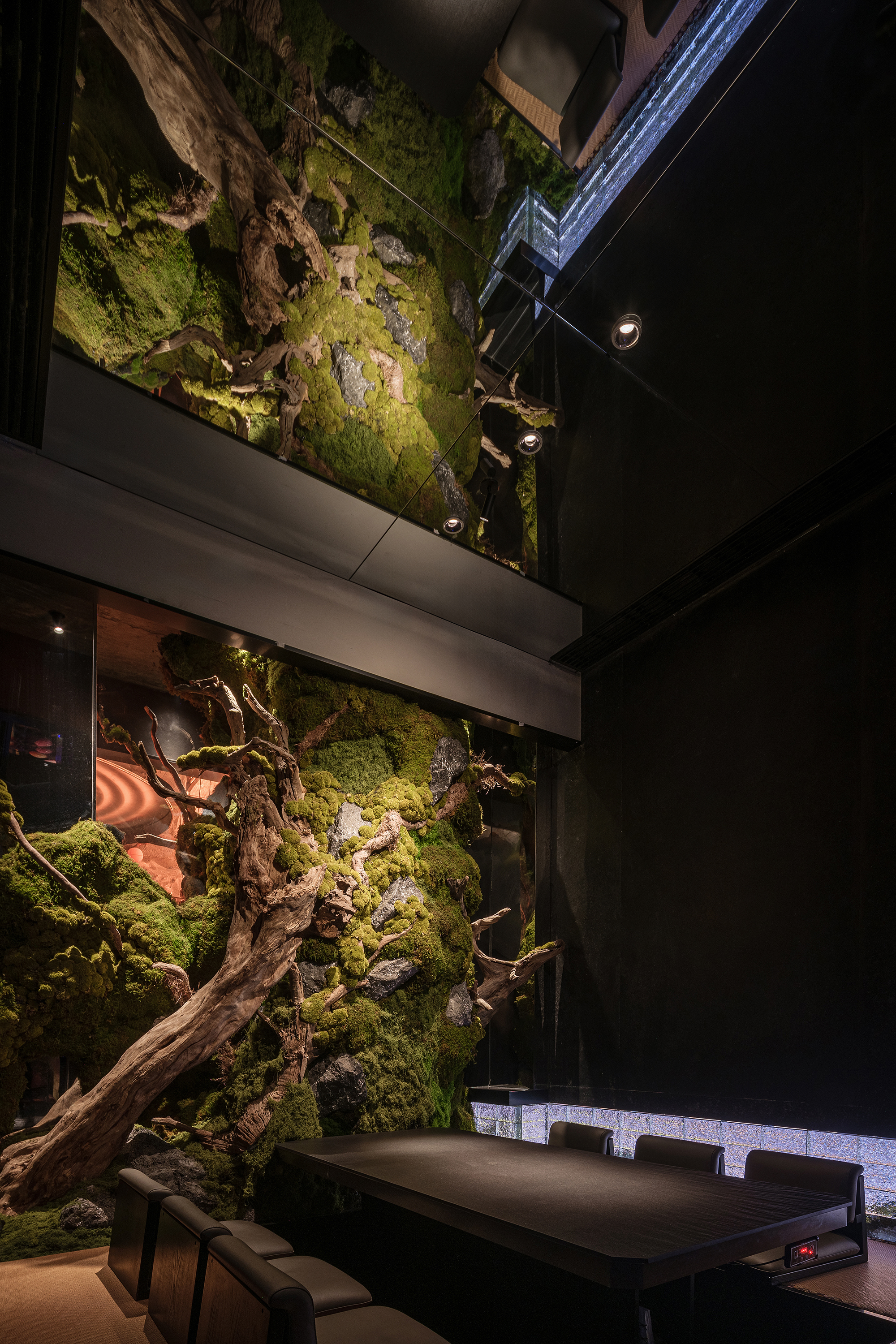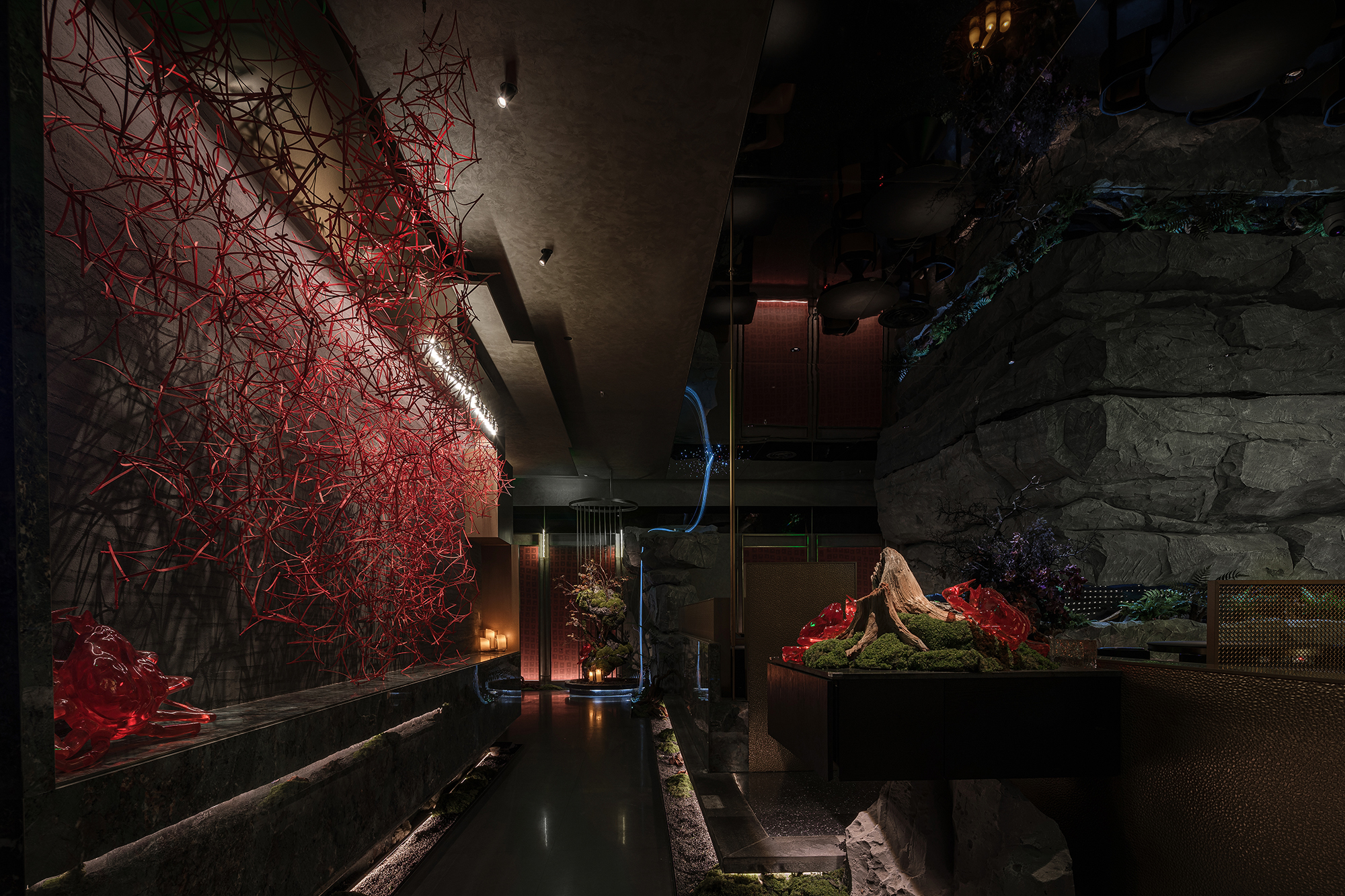 苍劲枯木缠满苔藓,如从“山明水丽”的画中生长而出,石隙间绿意盎然,似把去年春游的山野气息凝于室内;暗奢长桌静立其间,与原生态的草木山石碰撞出野奢张力,恰是“往来游宴”的雅致落进了秘境深处。