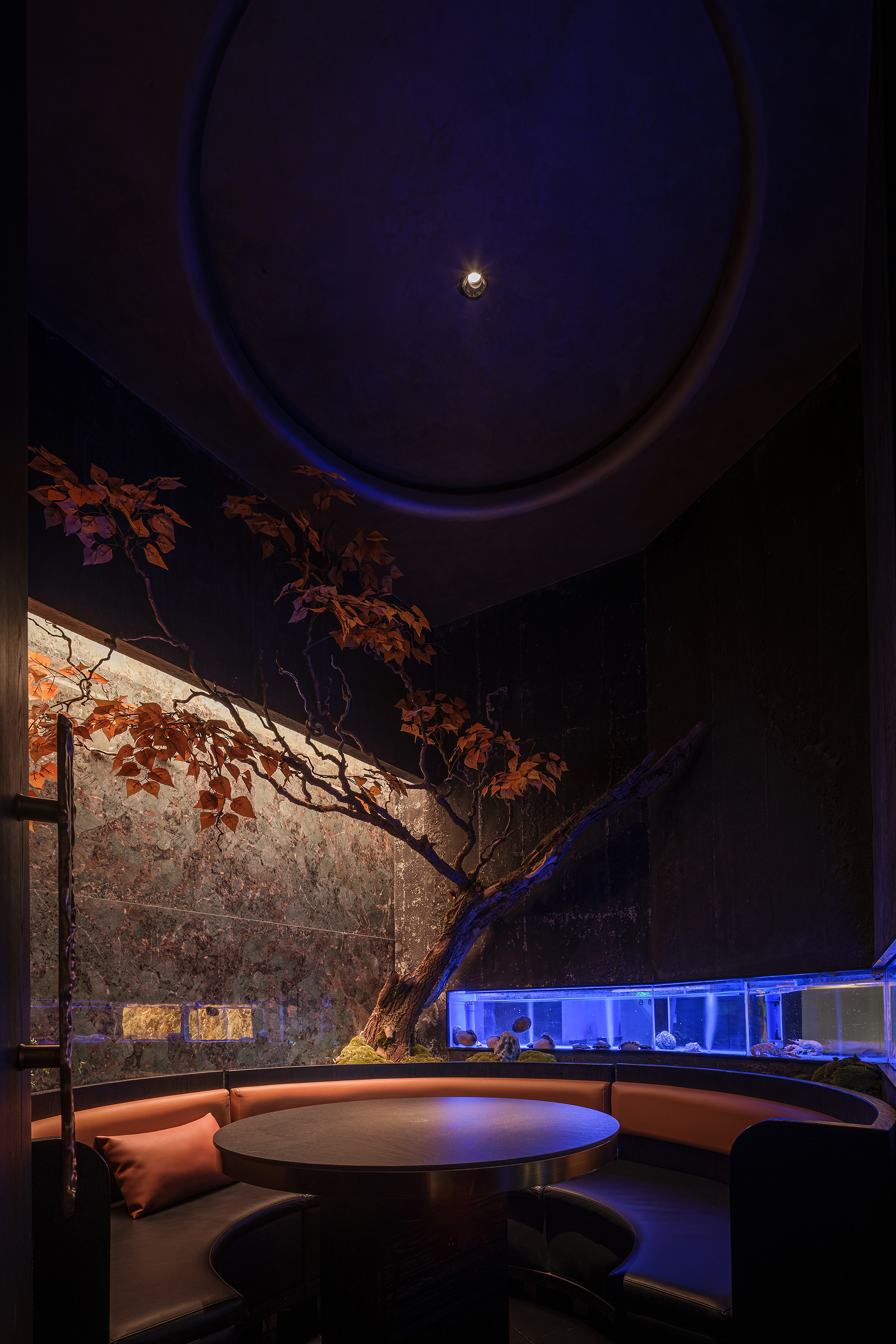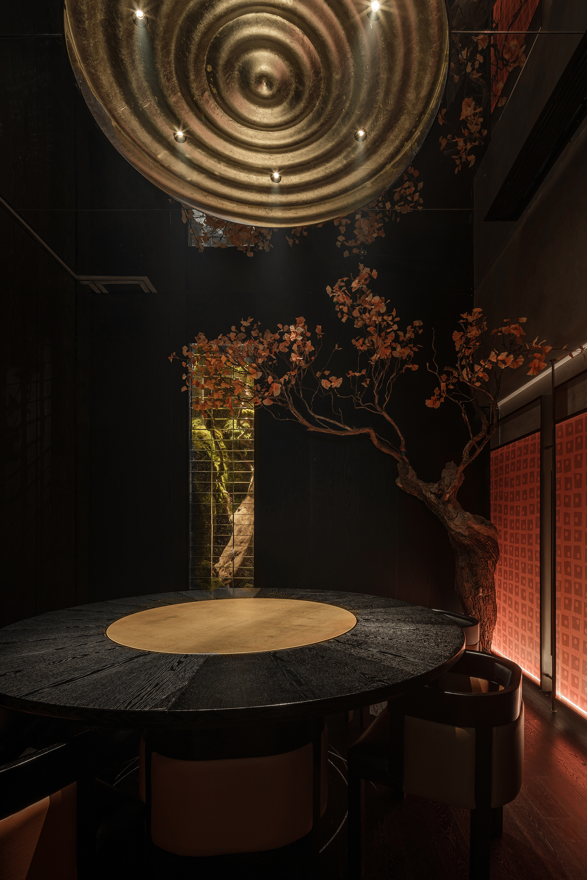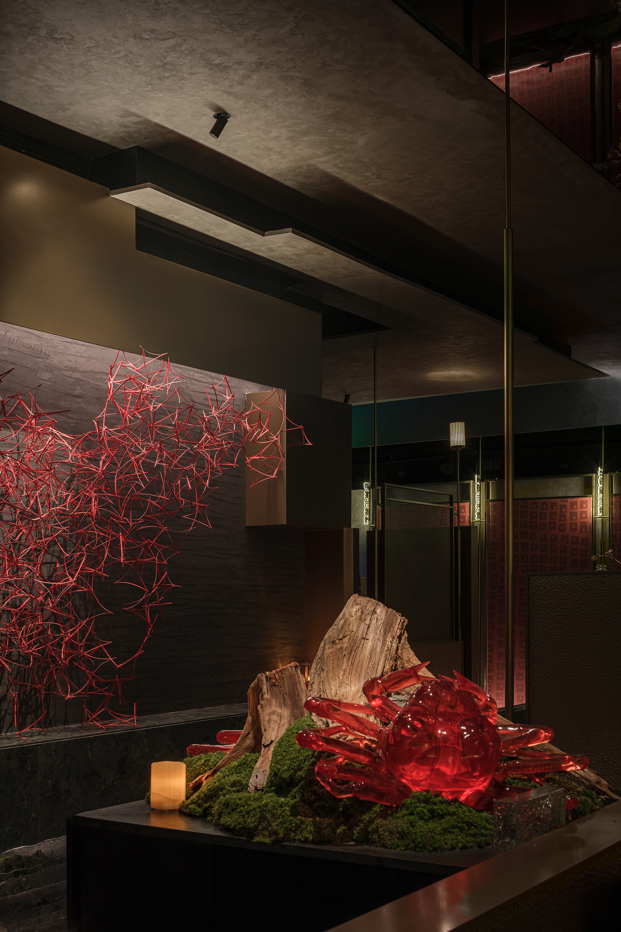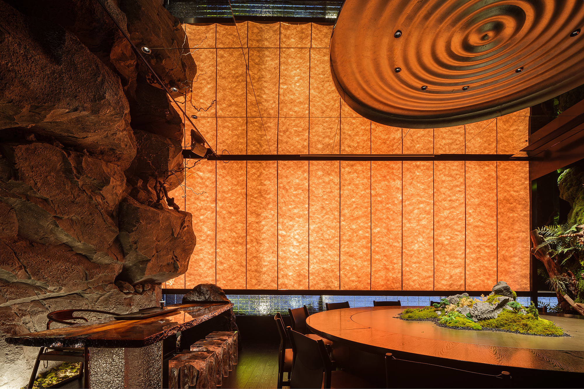 苍劲枯木缠满苔藓,如从“山明水丽”的画中生长而出,石隙间绿意盎然,似把去年春游的山野气息凝于室内;暗奢长桌静立其间,与原生态的草木山石碰撞出野奢张力,恰是“往来游宴”的雅致落进了秘境深处。