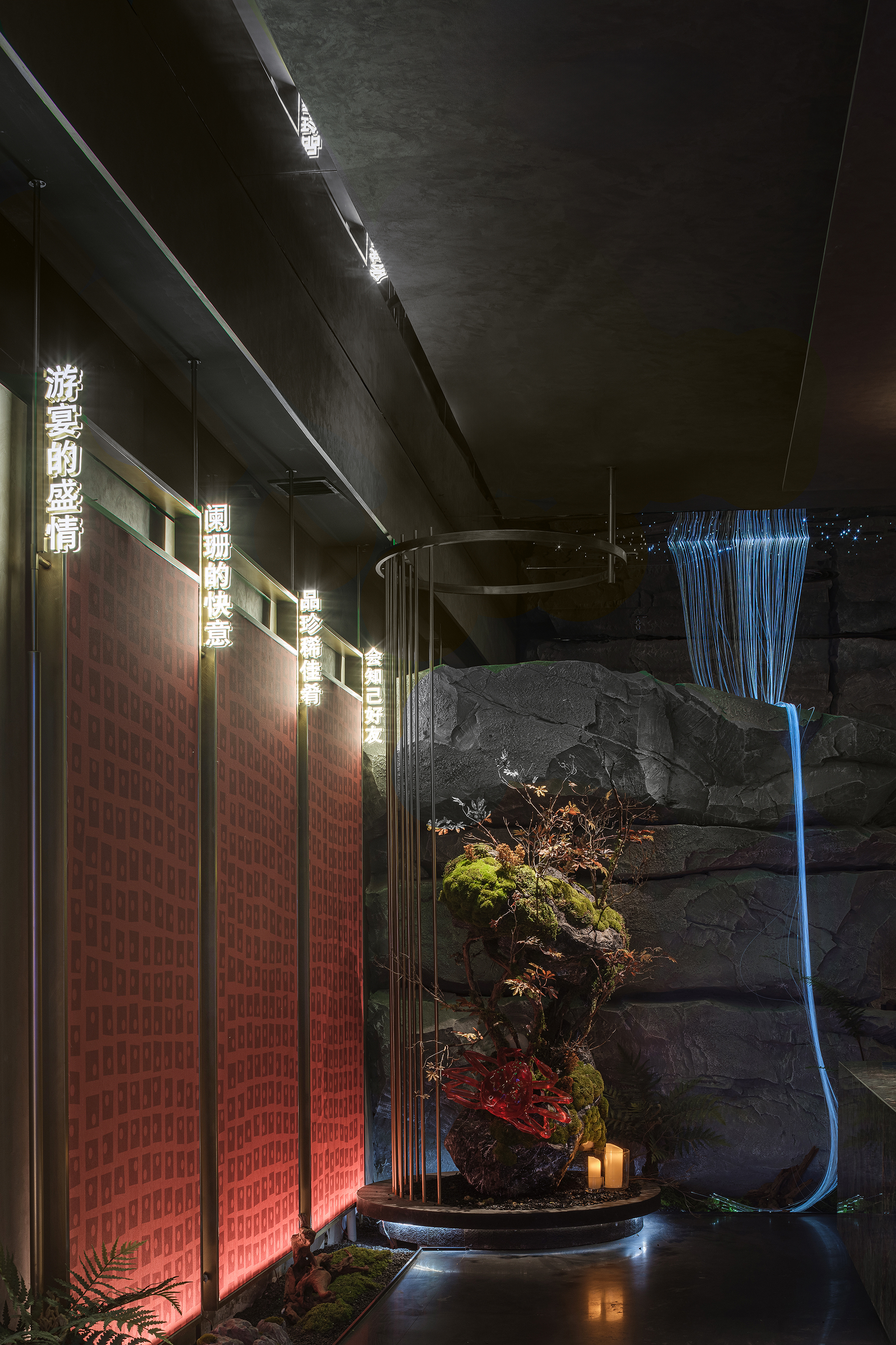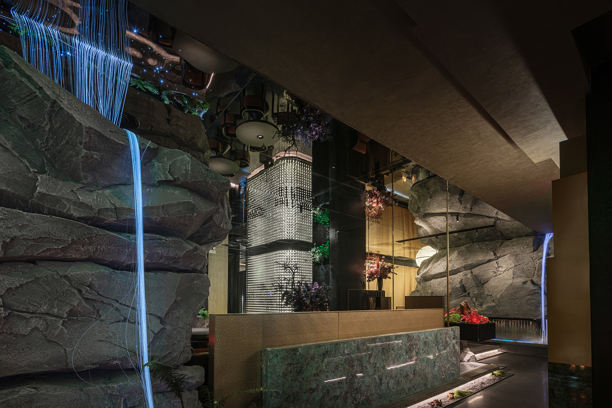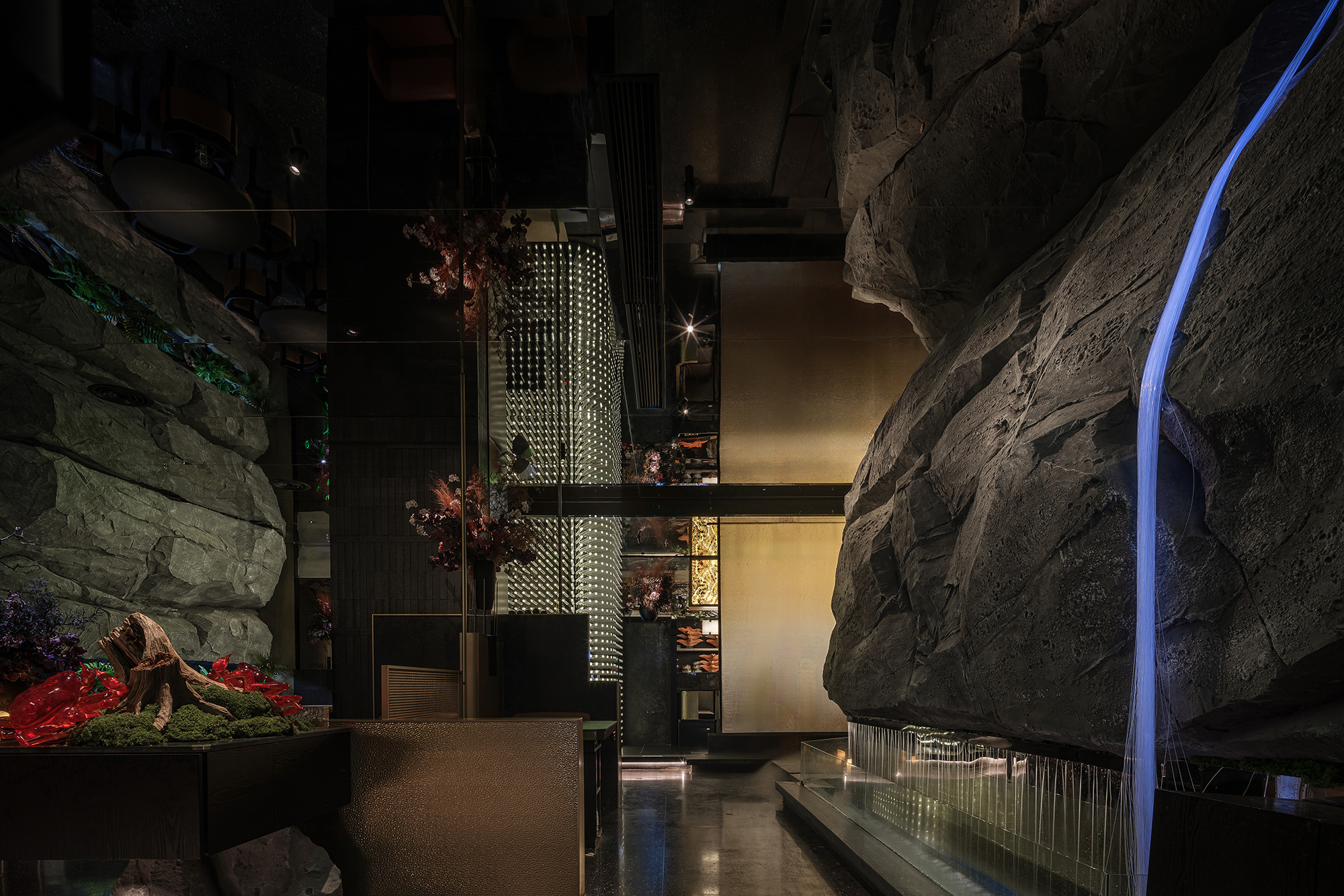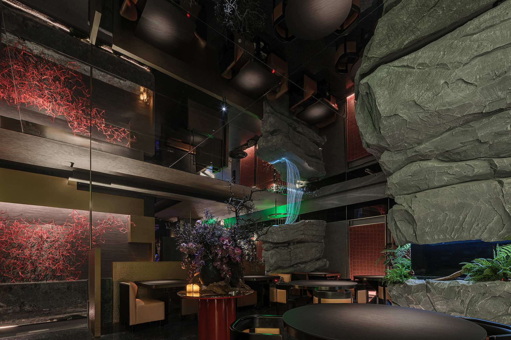 嶙峋山石如春山破墙而来,光纤水瀑似钱塘浪涛奔涌,镜面天花将这野趣盛景加倍铺展,恍若游宴时的“水天共色”红韵装置似花潮涌动,与暗金桌椅的雅致碰撞;奢石吧台泛着沉绿光泽,与花树装置的明艳交辉,恰似“花娇柳娜”的春景落进了繁华场。
