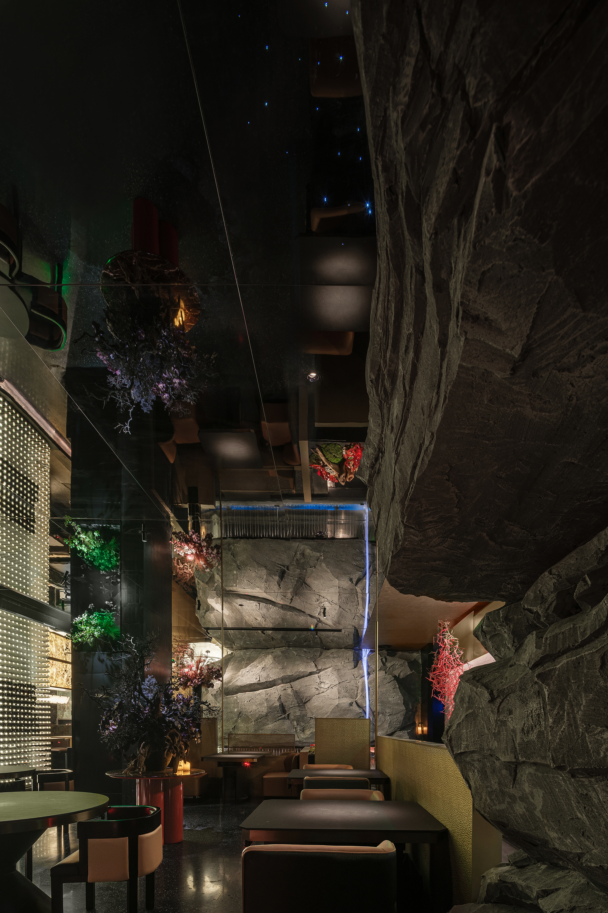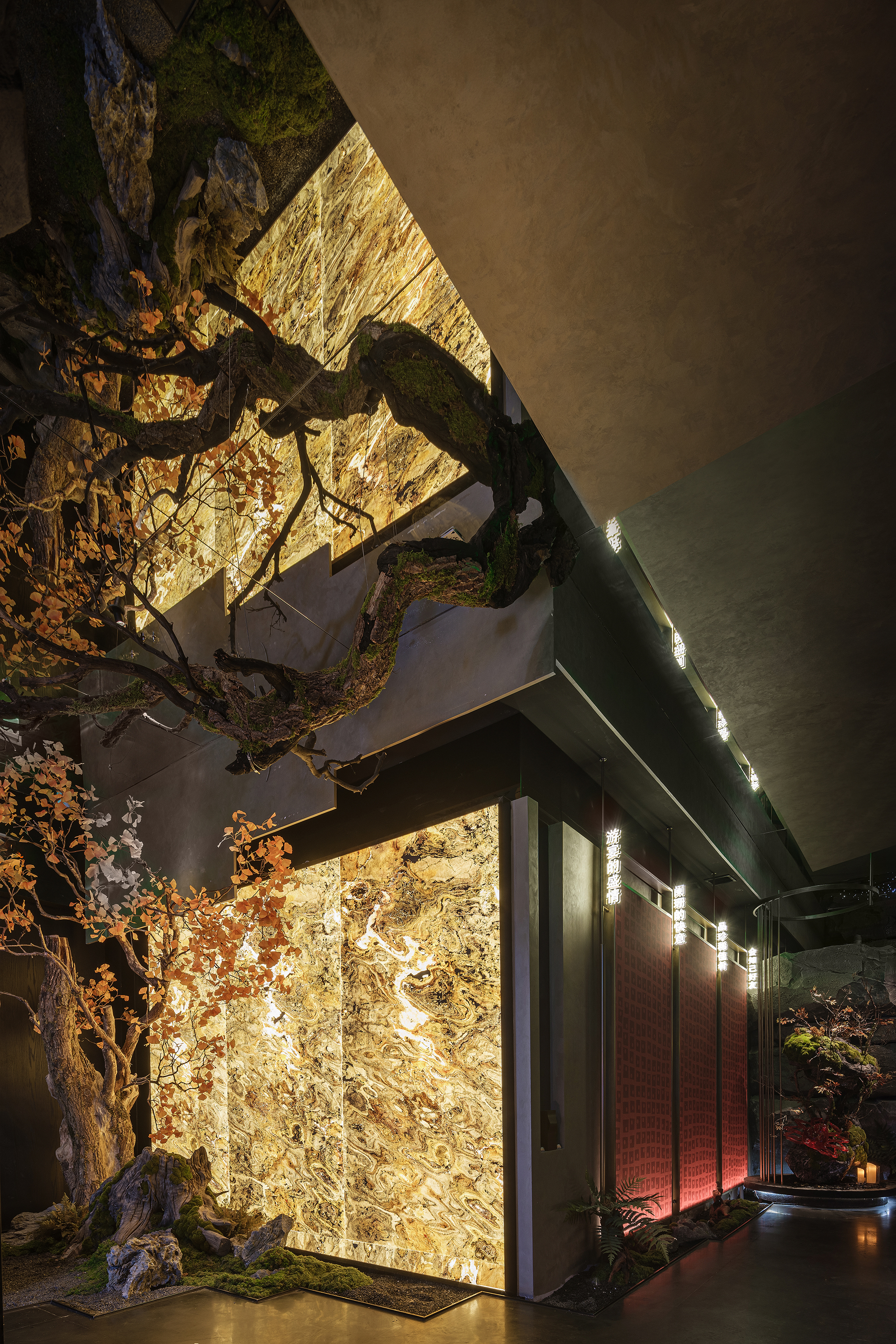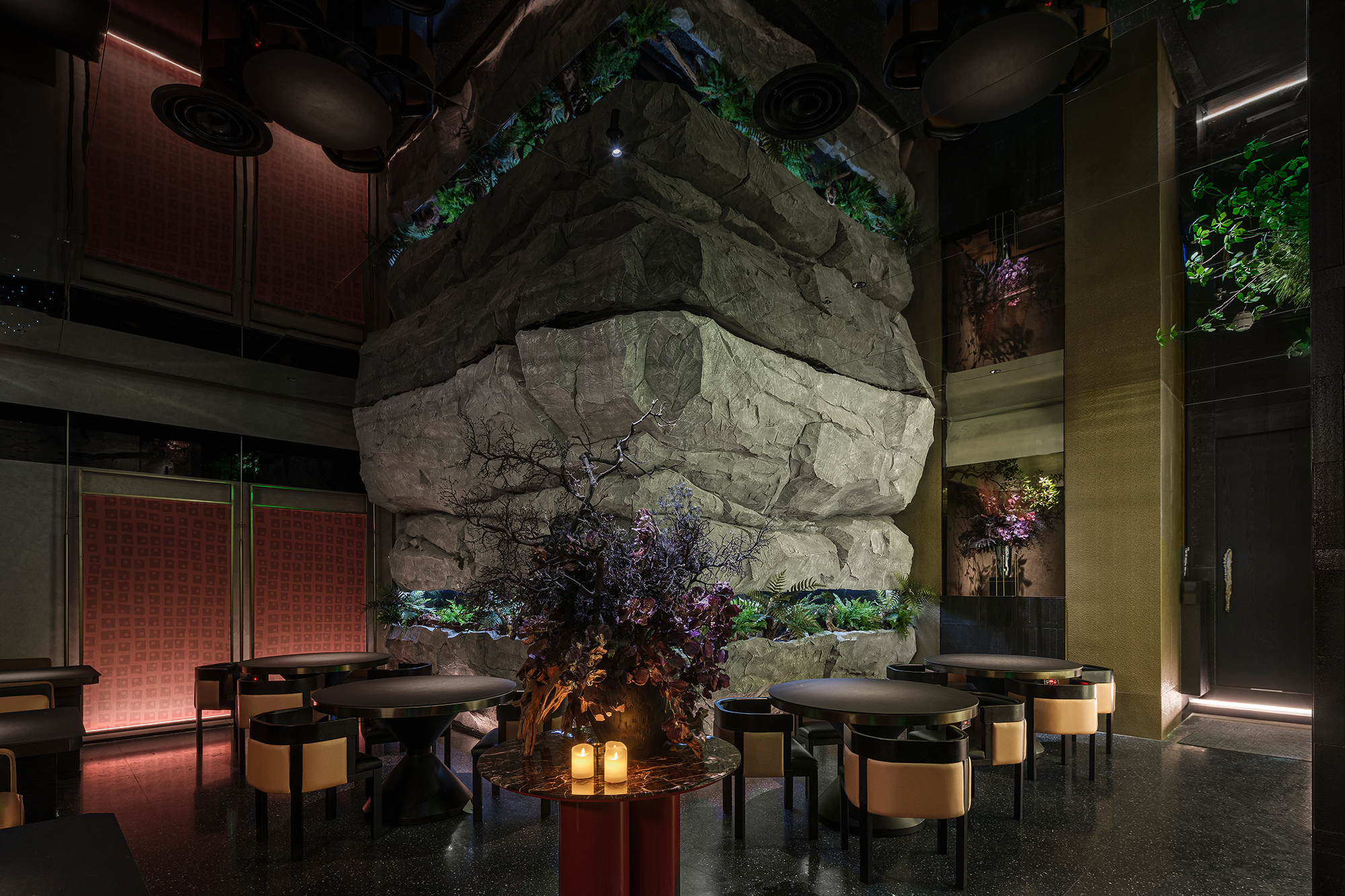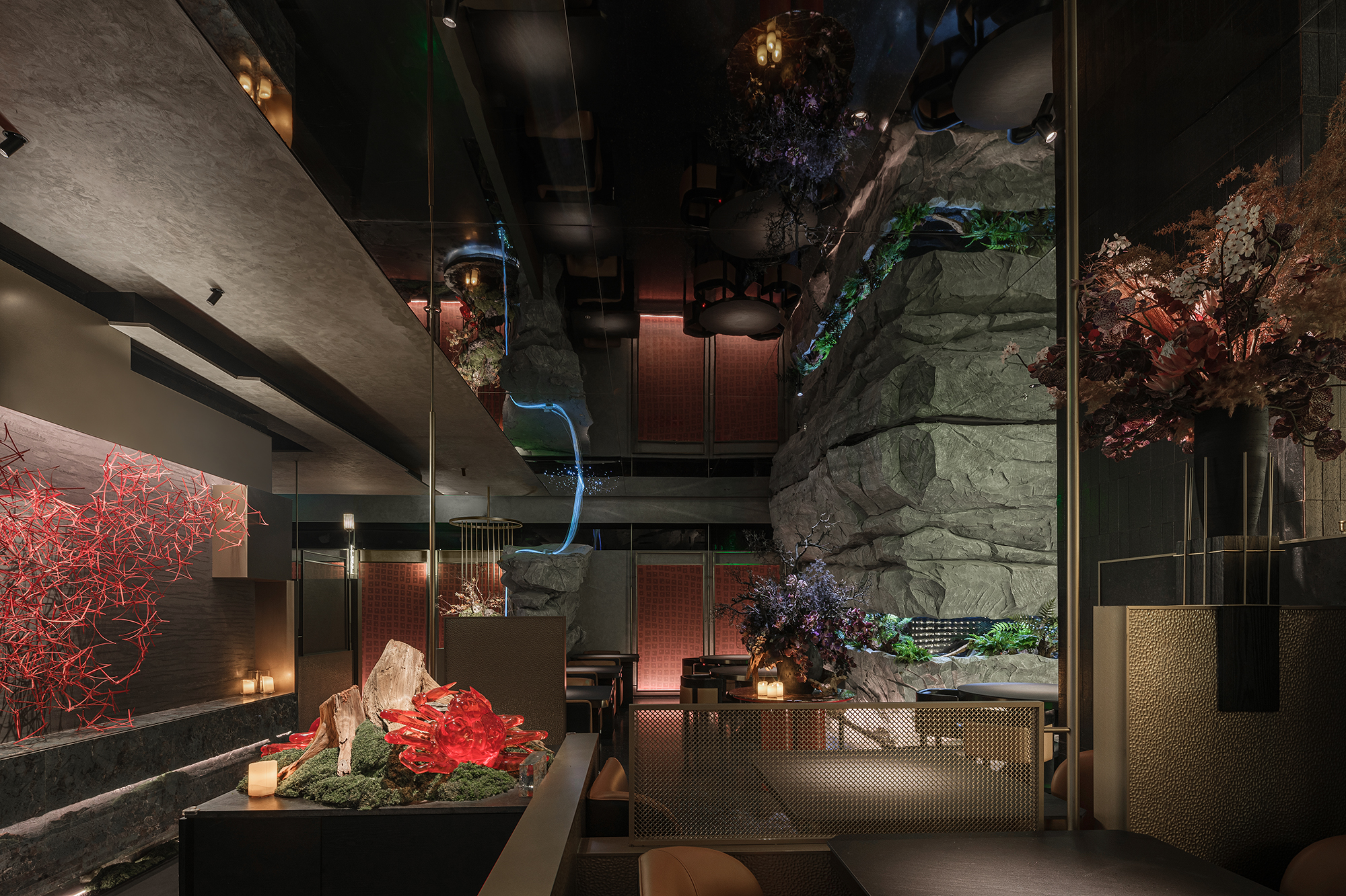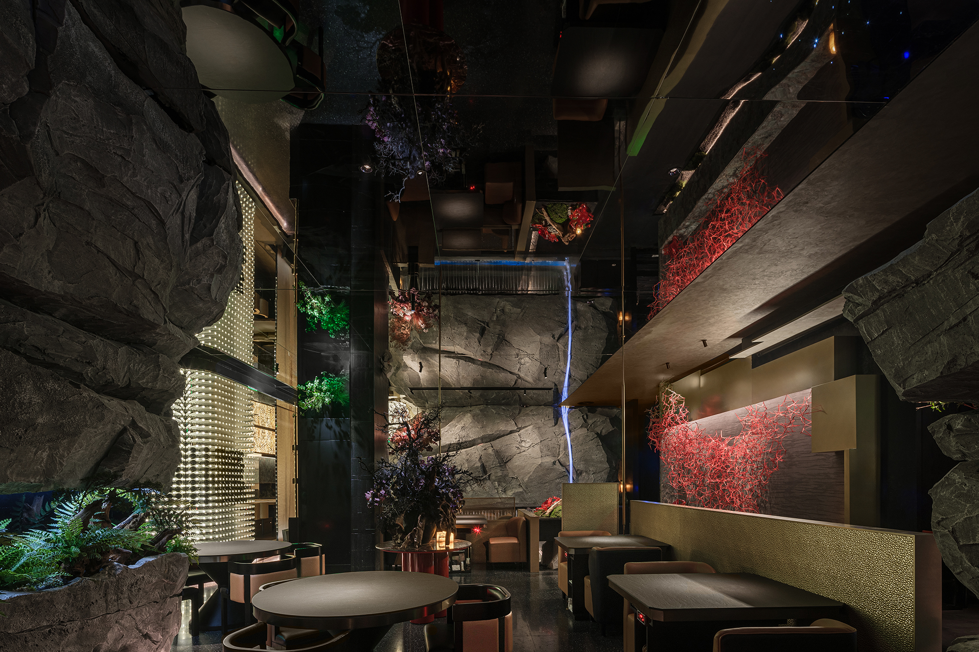 嶙峋山石如春山破墙而来,光纤水瀑似钱塘浪涛奔涌,镜面天花将这野趣盛景加倍铺展,恍若游宴时的“水天共色”红韵装置似花潮涌动,与暗金桌椅的雅致碰撞;奢石吧台泛着沉绿光泽,与花树装置的明艳交辉,恰似“花娇柳娜”的春景落进了繁华场。