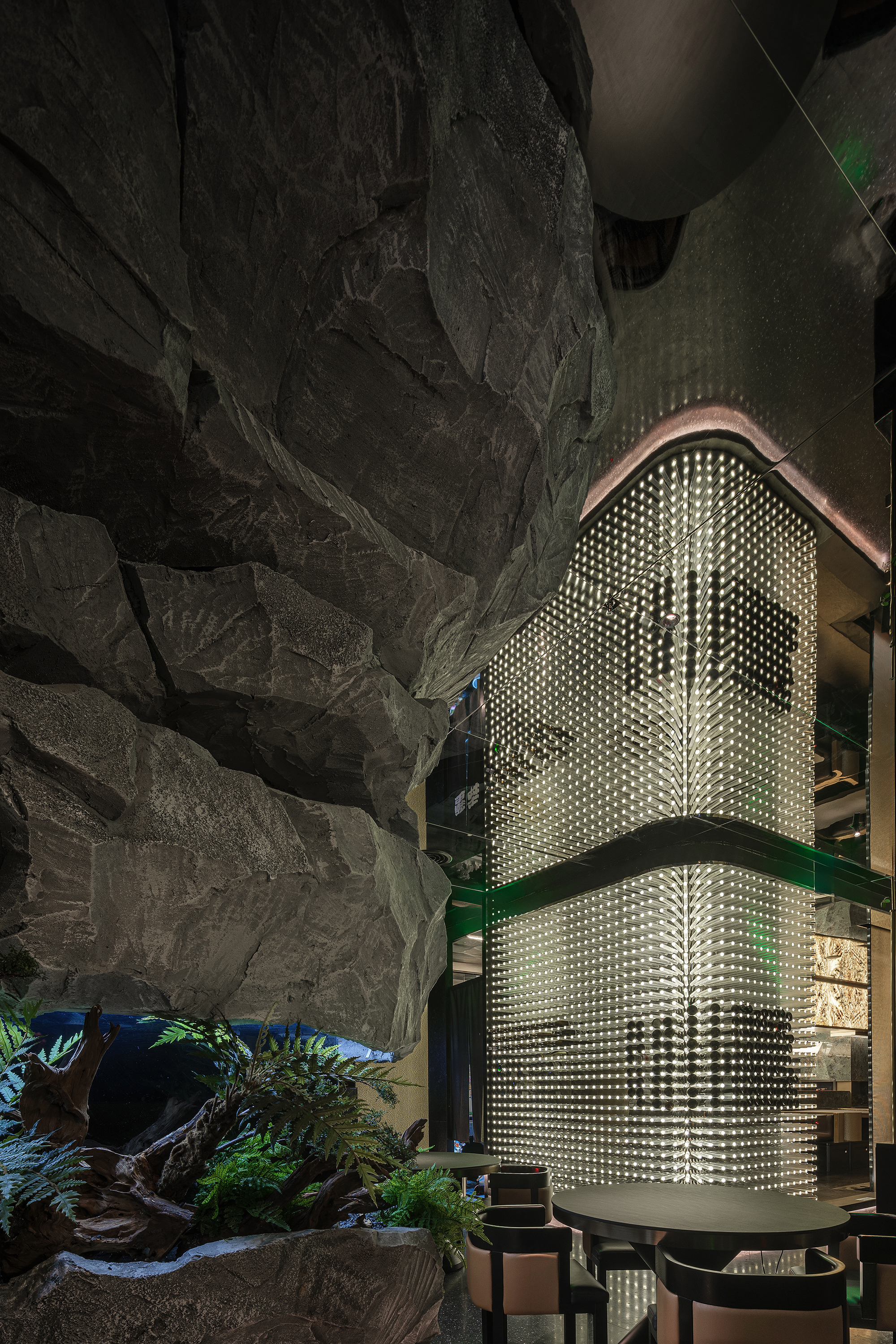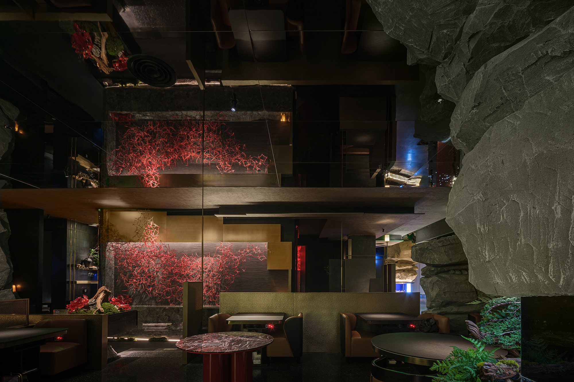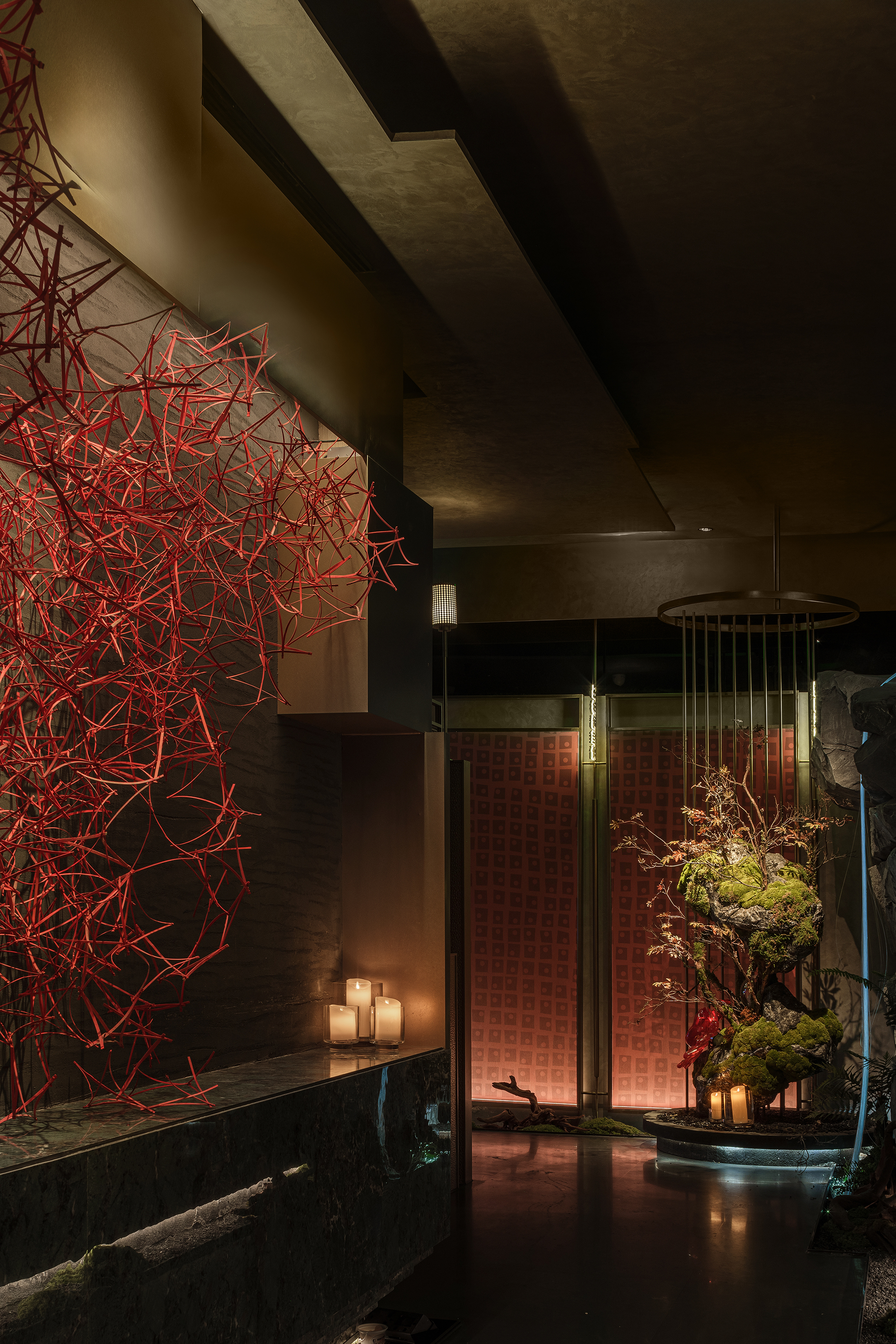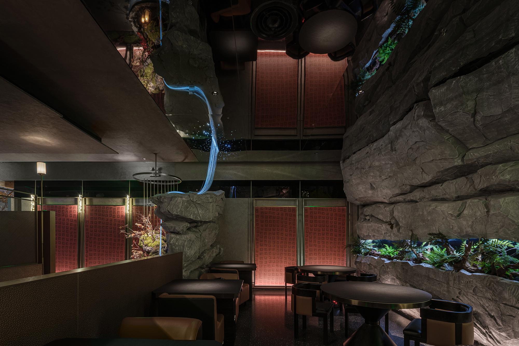 嶙峋山石如春山破墙而来,光纤水瀑似钱塘浪涛奔涌,镜面天花将这野趣盛景加倍铺展,恍若游宴时的“水天共色”红韵装置似花潮涌动,与暗金桌椅的雅致碰撞;奢石吧台泛着沉绿光泽,与花树装置的明艳交辉,恰似“花娇柳娜”的春景落进了繁华场。