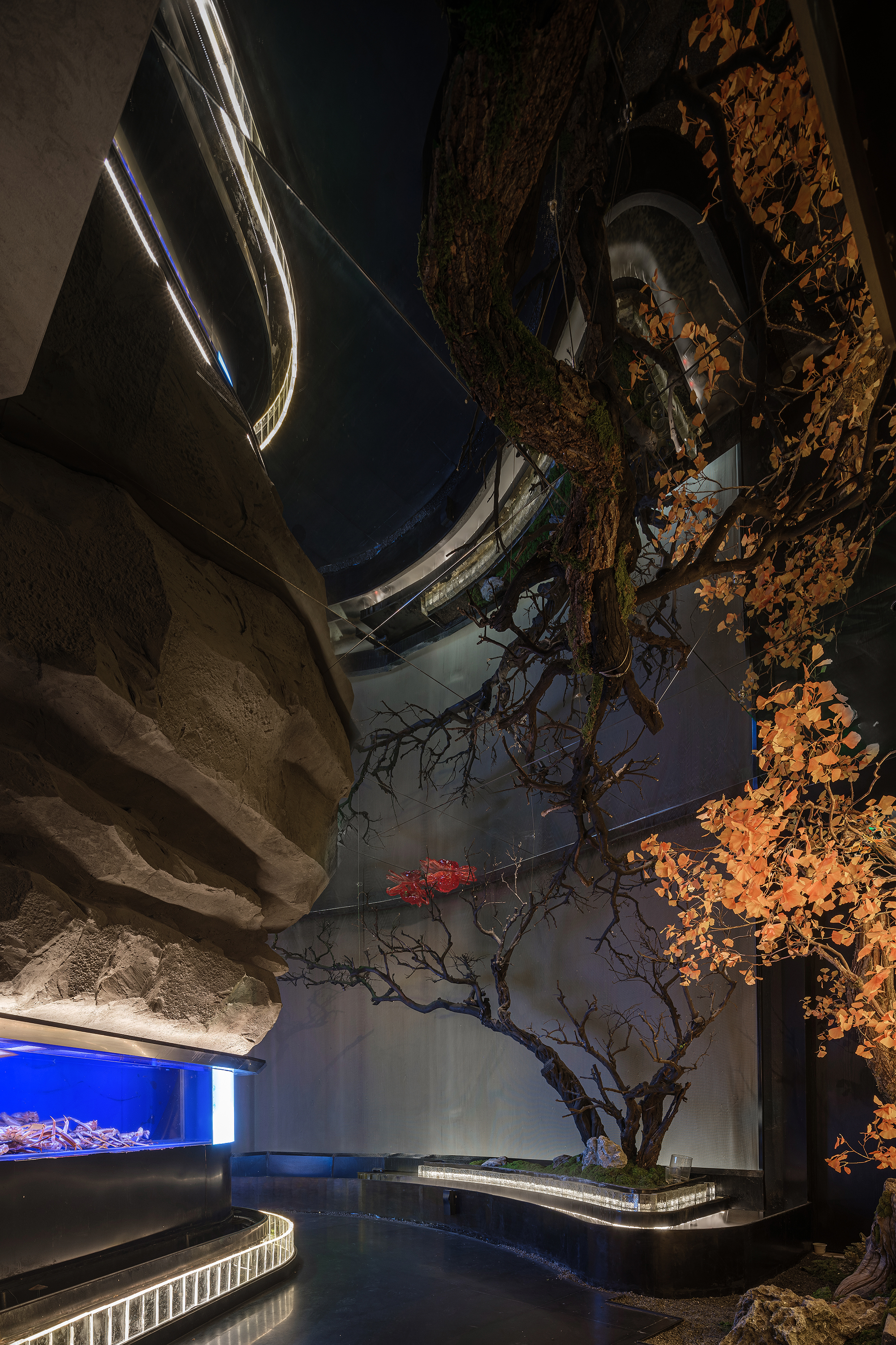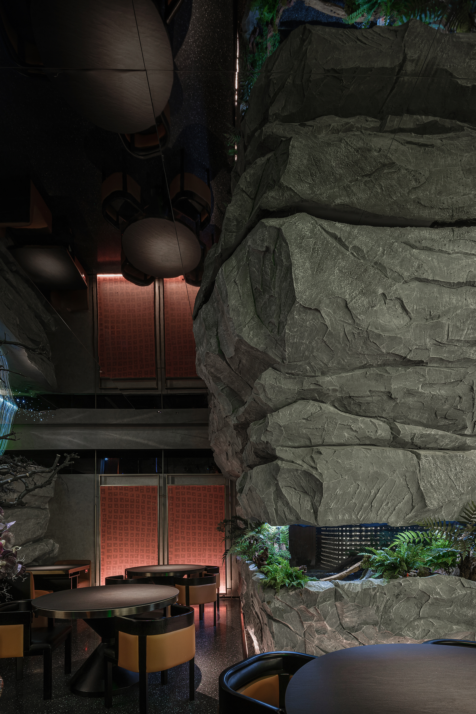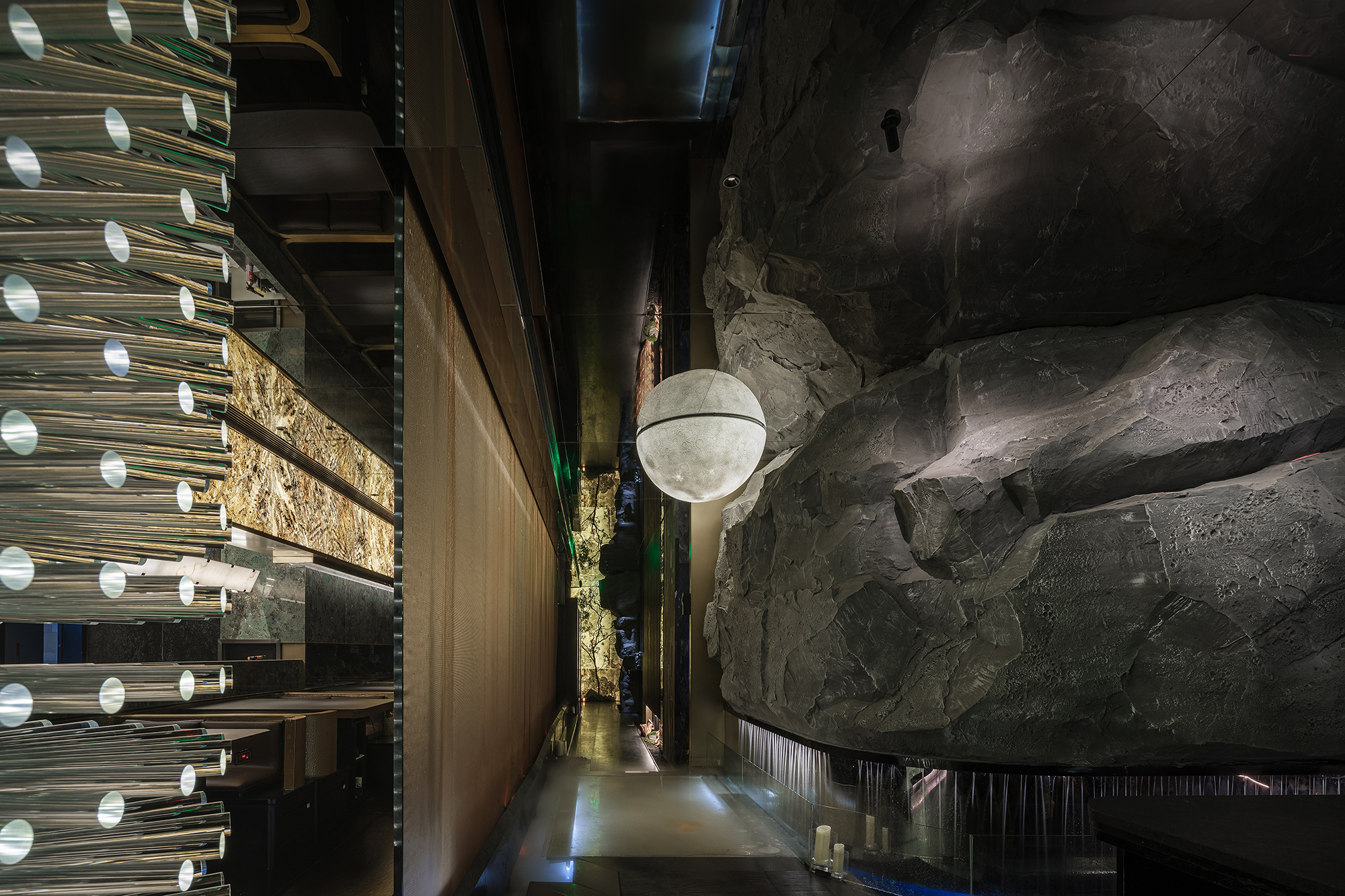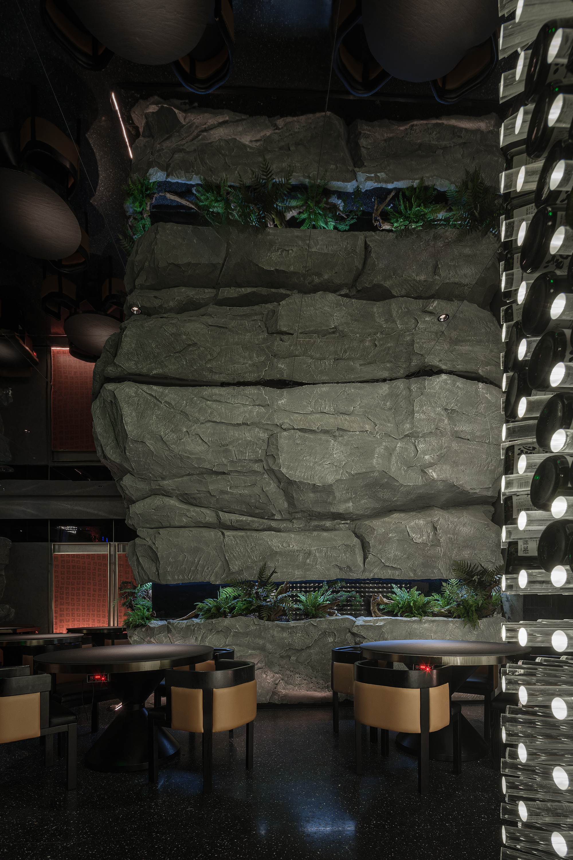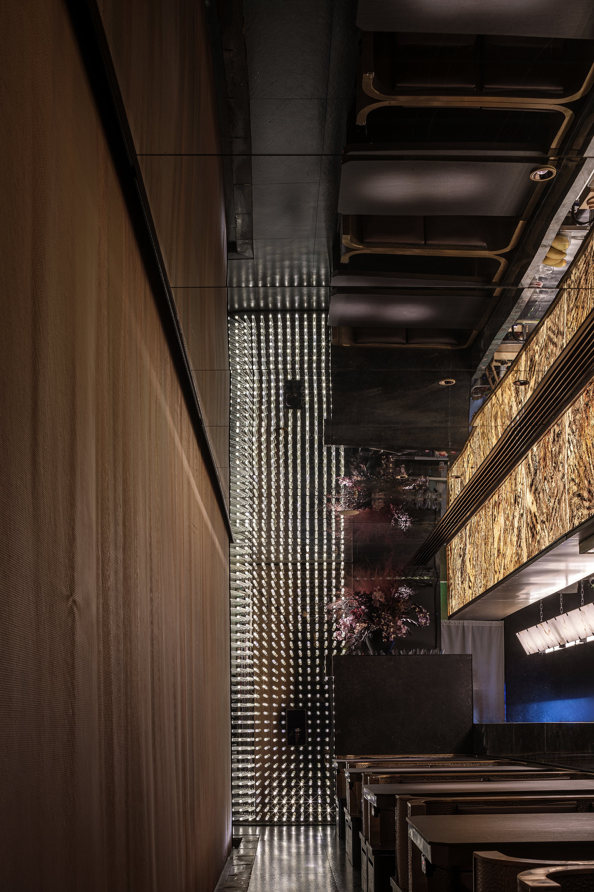 嶙峋山石如春山破墙而来,光纤水瀑似钱塘浪涛奔涌,镜面天花将这野趣盛景加倍铺展,恍若游宴时的“水天共色”红韵装置似花潮涌动,与暗金桌椅的雅致碰撞;奢石吧台泛着沉绿光泽,与花树装置的明艳交辉,恰似“花娇柳娜”的春景落进了繁华场。