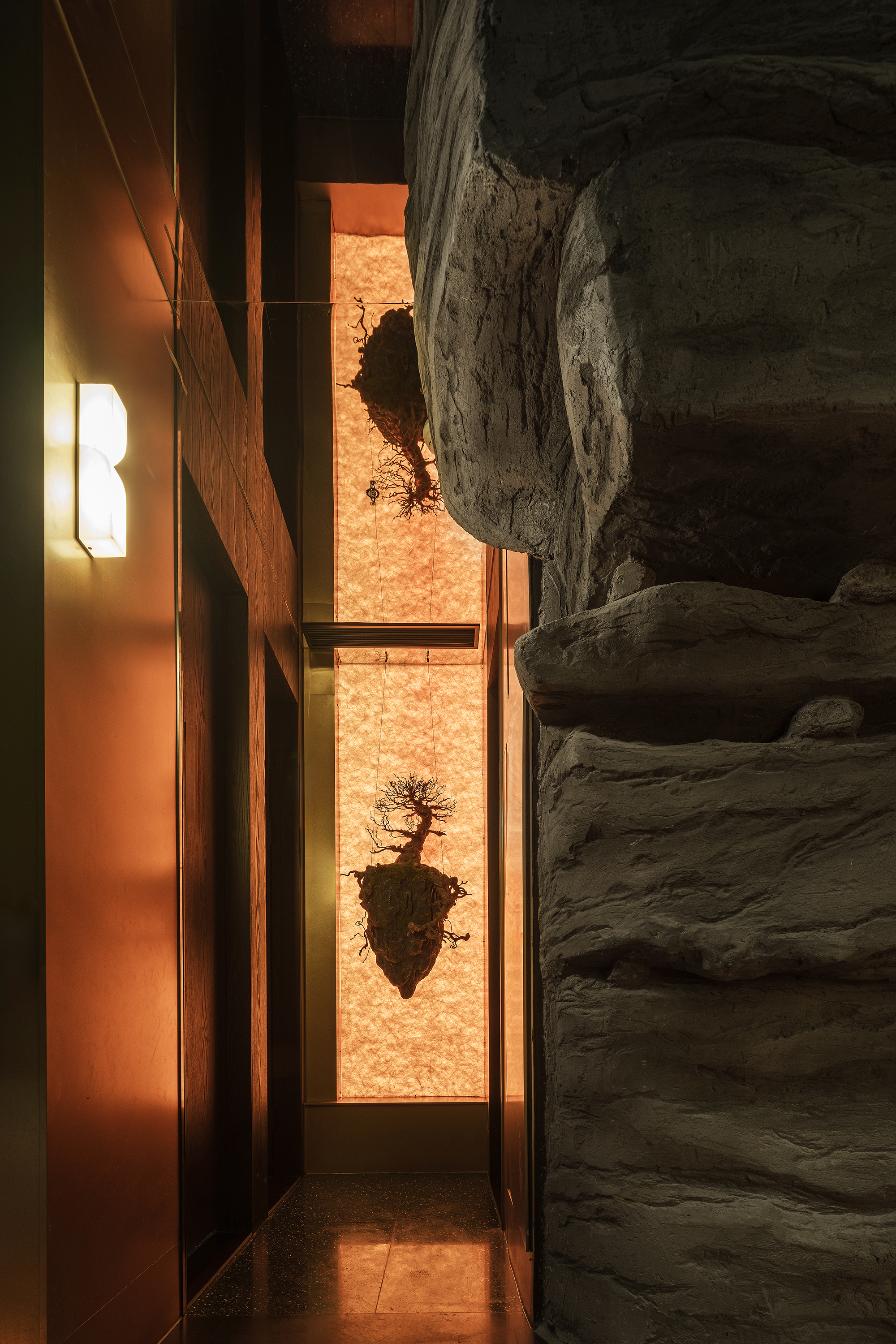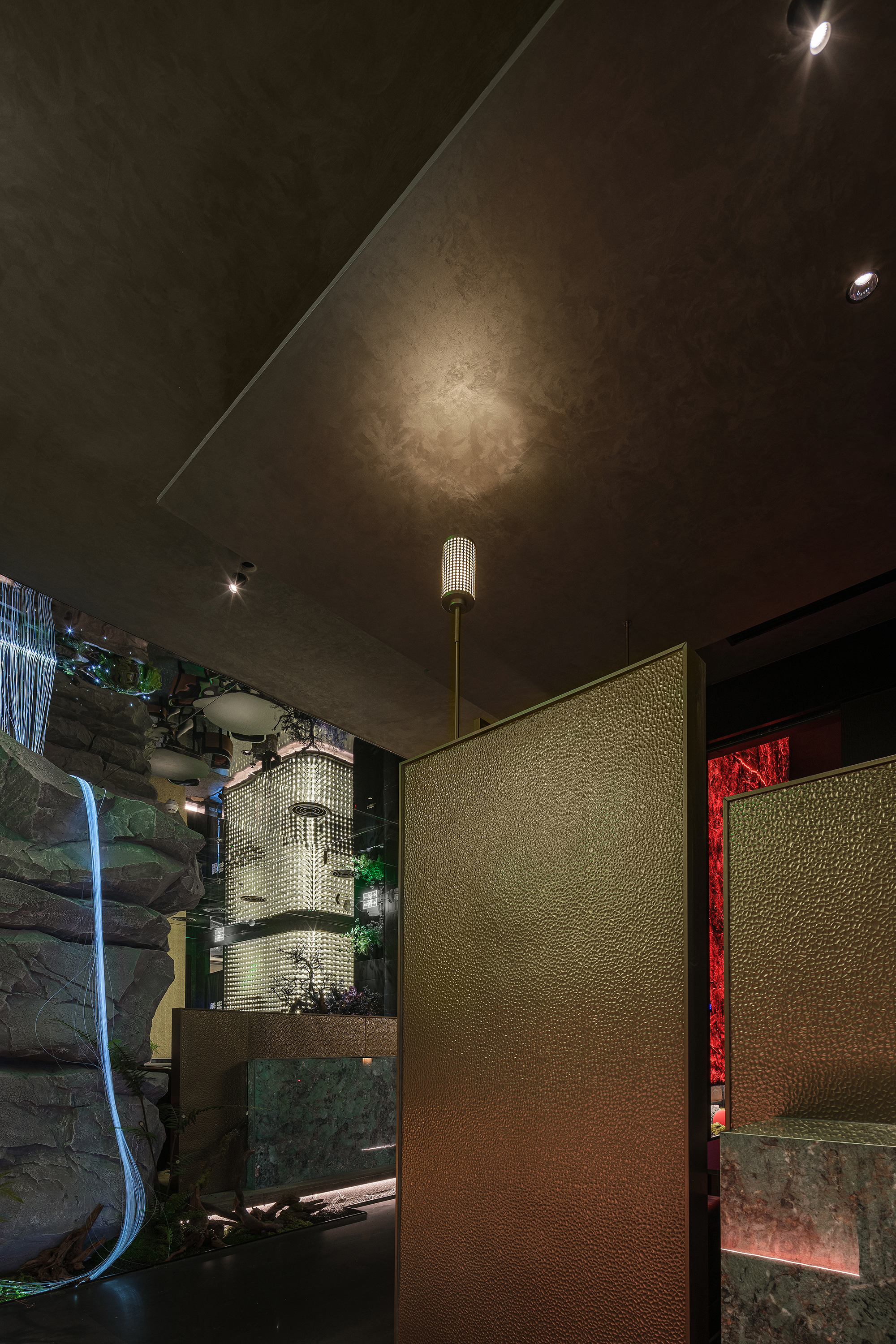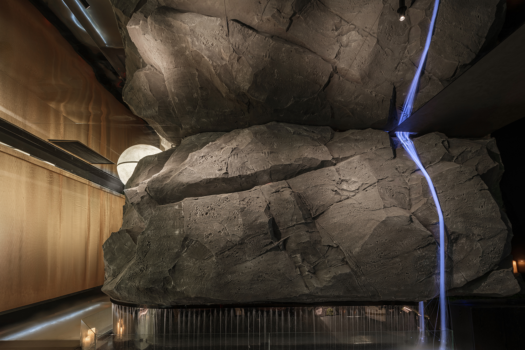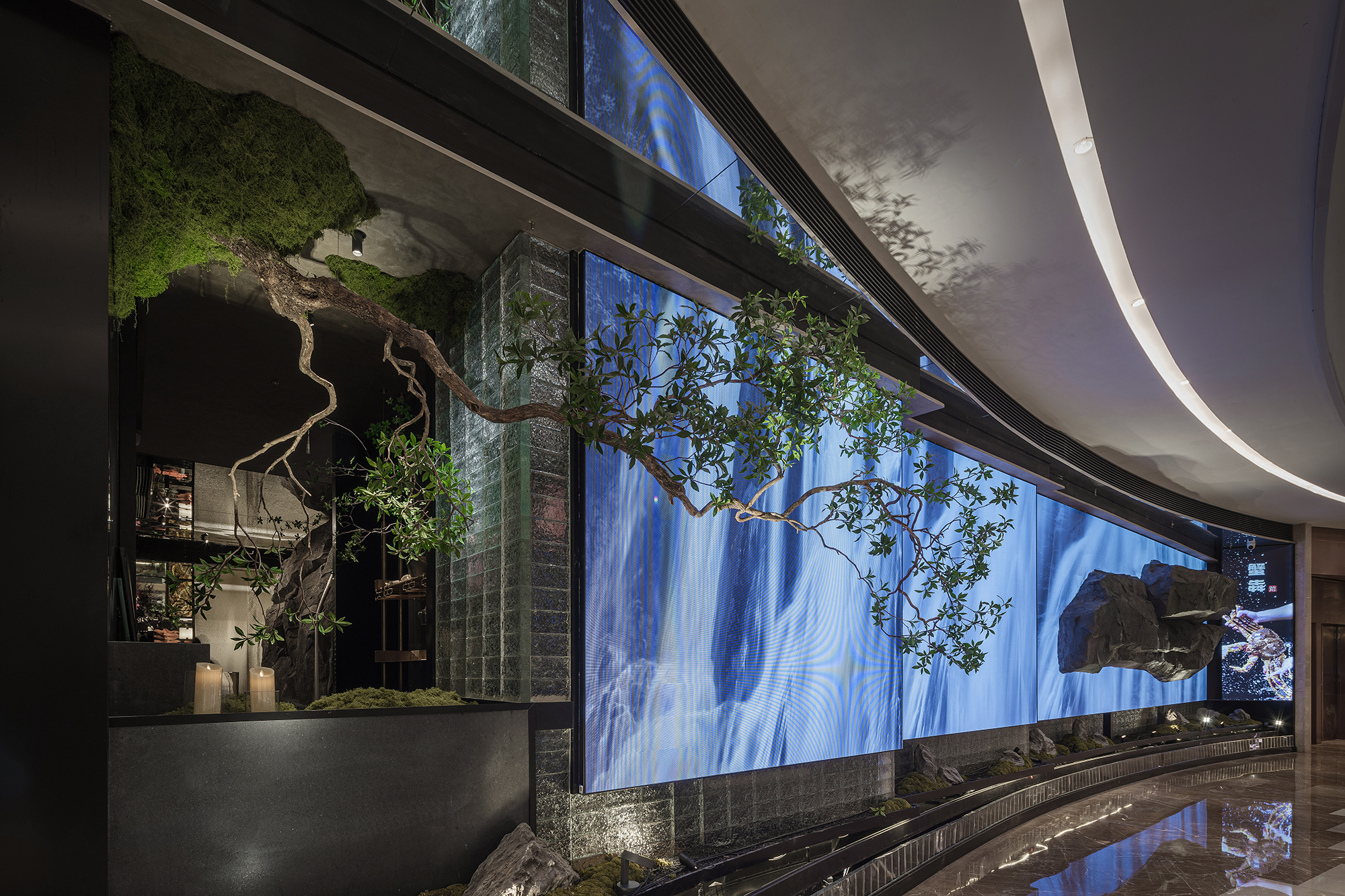 一侧是纹理如“春山肌理”的奢石墙,泛着金棕流光,似把钱塘远山的贵气凝于壁间;一侧是嶙峋山石叠出的“水瀑小景”,蓝调光带模拟溪流奔涌,苔藓与花树点缀其间,野趣盎然。