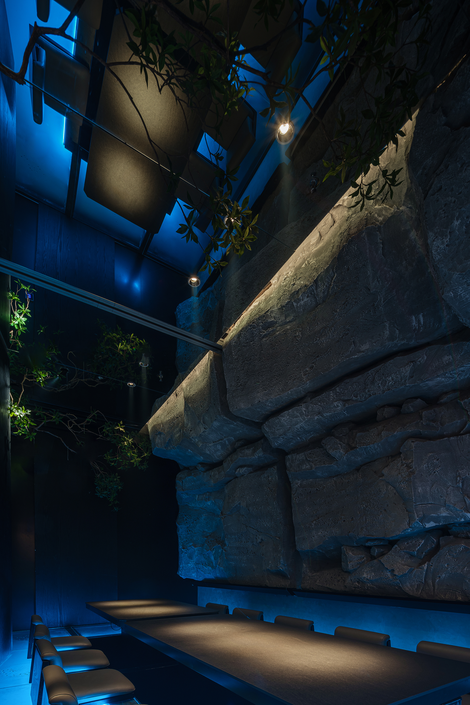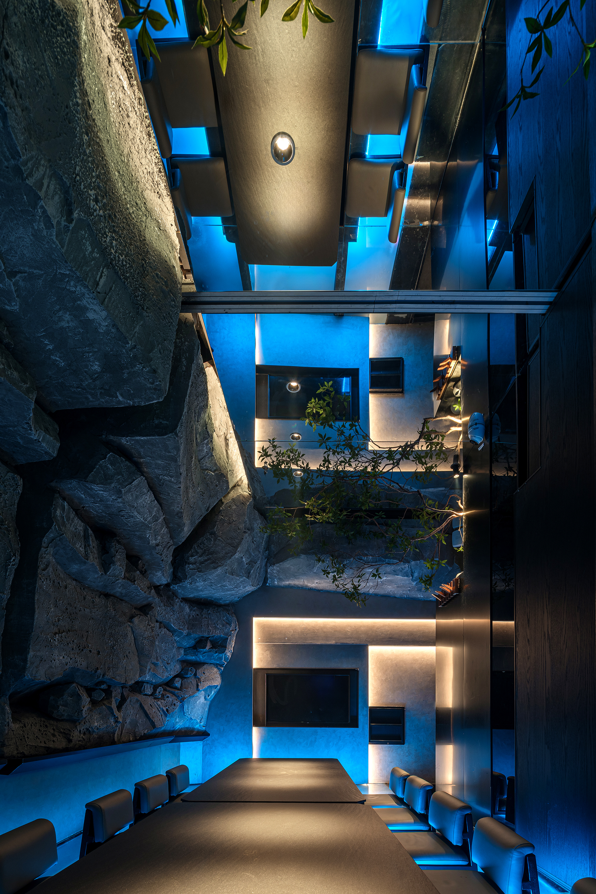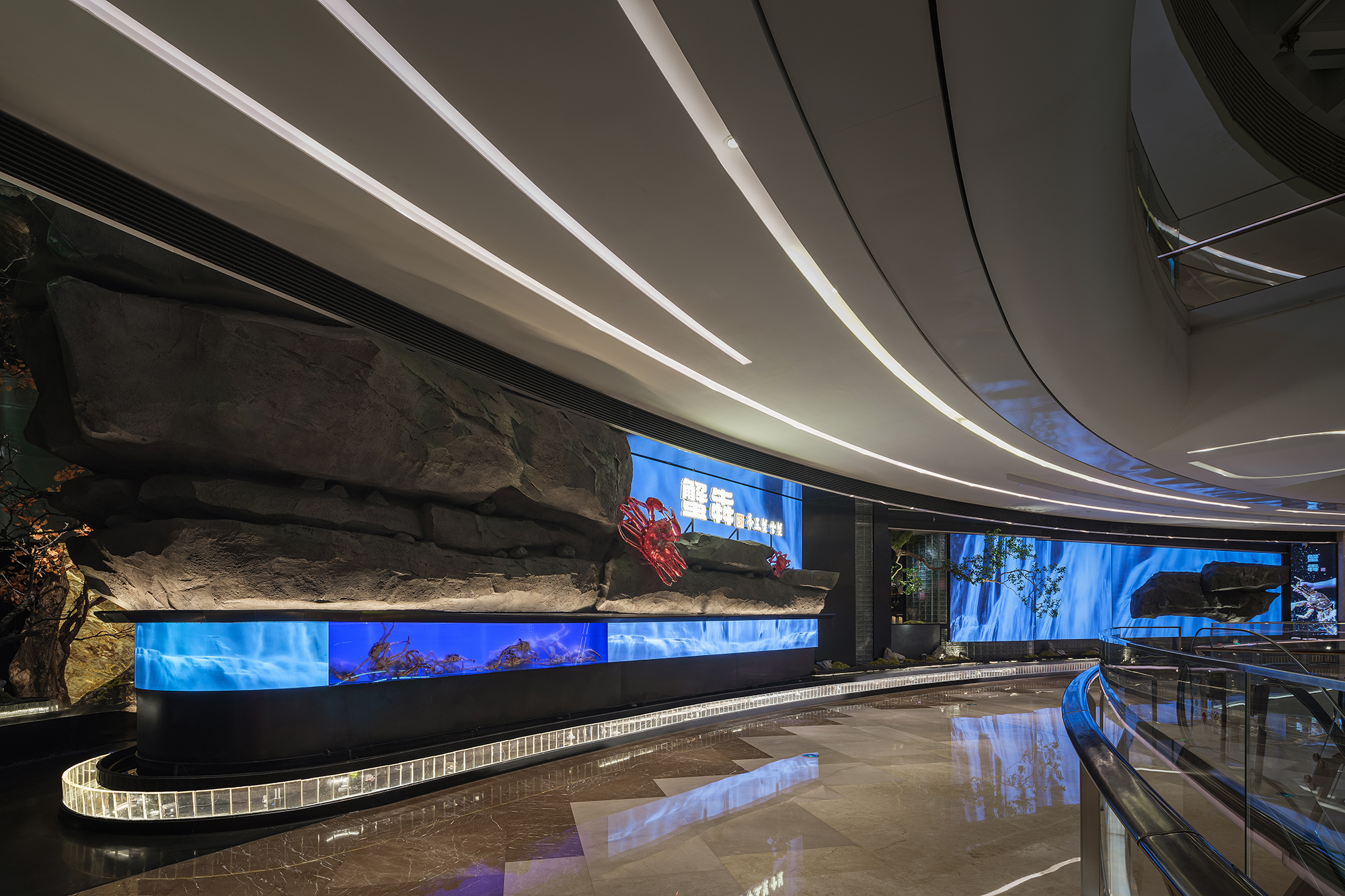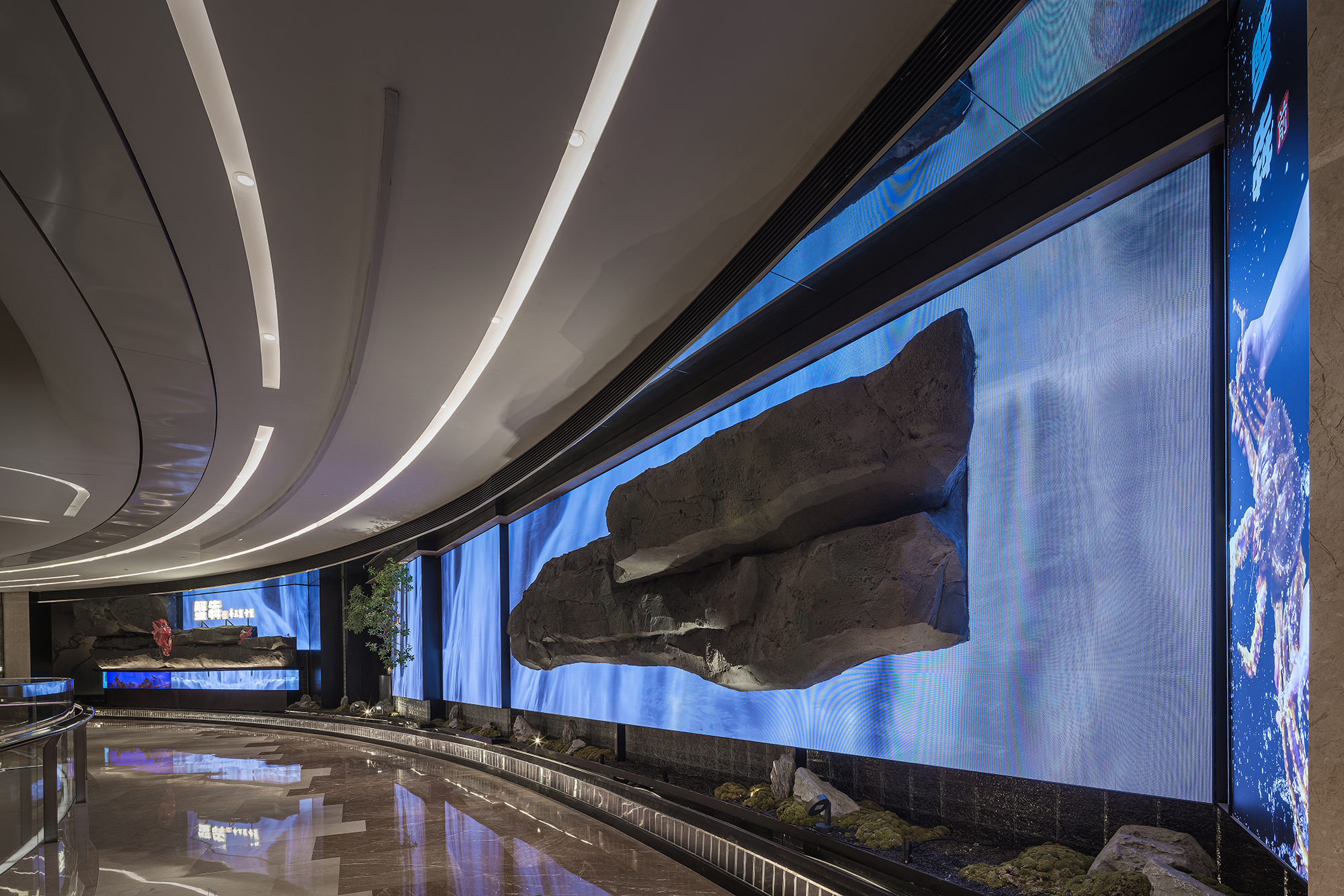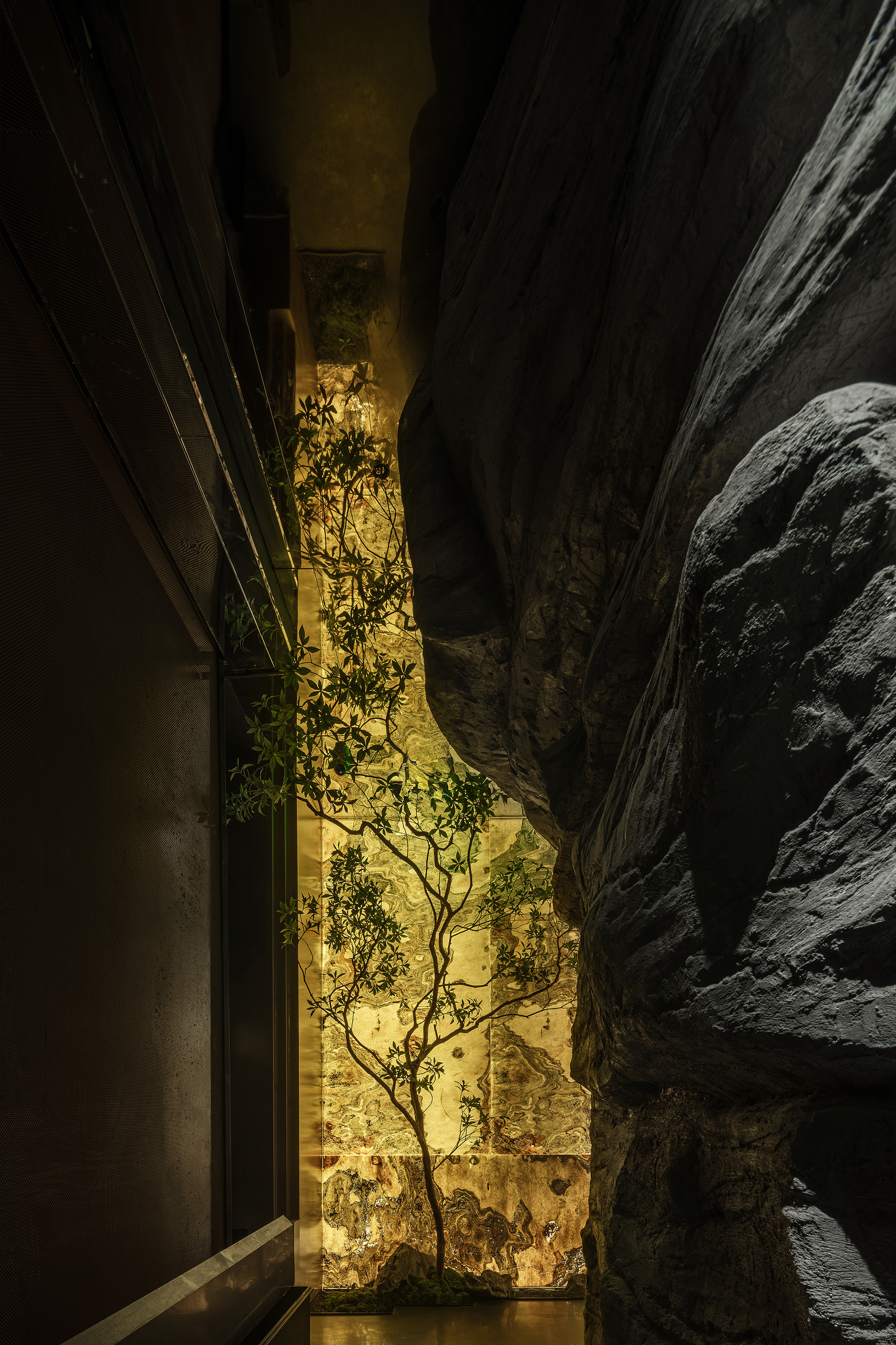 一侧是纹理如“春山肌理”的奢石墙,泛着金棕流光,似把钱塘远山的贵气凝于壁间;一侧是嶙峋山石叠出的“水瀑小景”,蓝调光带模拟溪流奔涌,苔藓与花树点缀其间,野趣盎然。