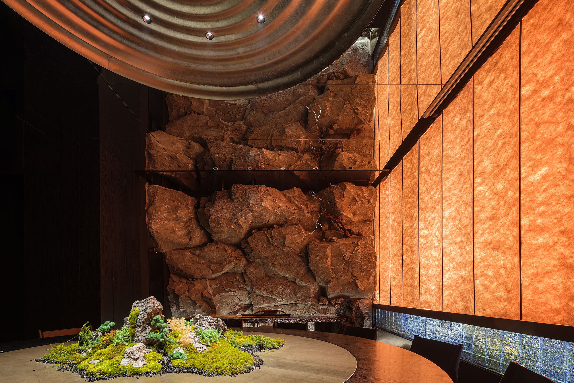 嶙峋山石如黛峰耸峙,复刻“山明水丽”的雄浑底色;暖橘屏风似落日熔金,晕染出“花娇柳娜”的温柔韵致,桌上微缩山水苔藓鲜润,恍若把去年春游的野趣盛景嵌于席间。