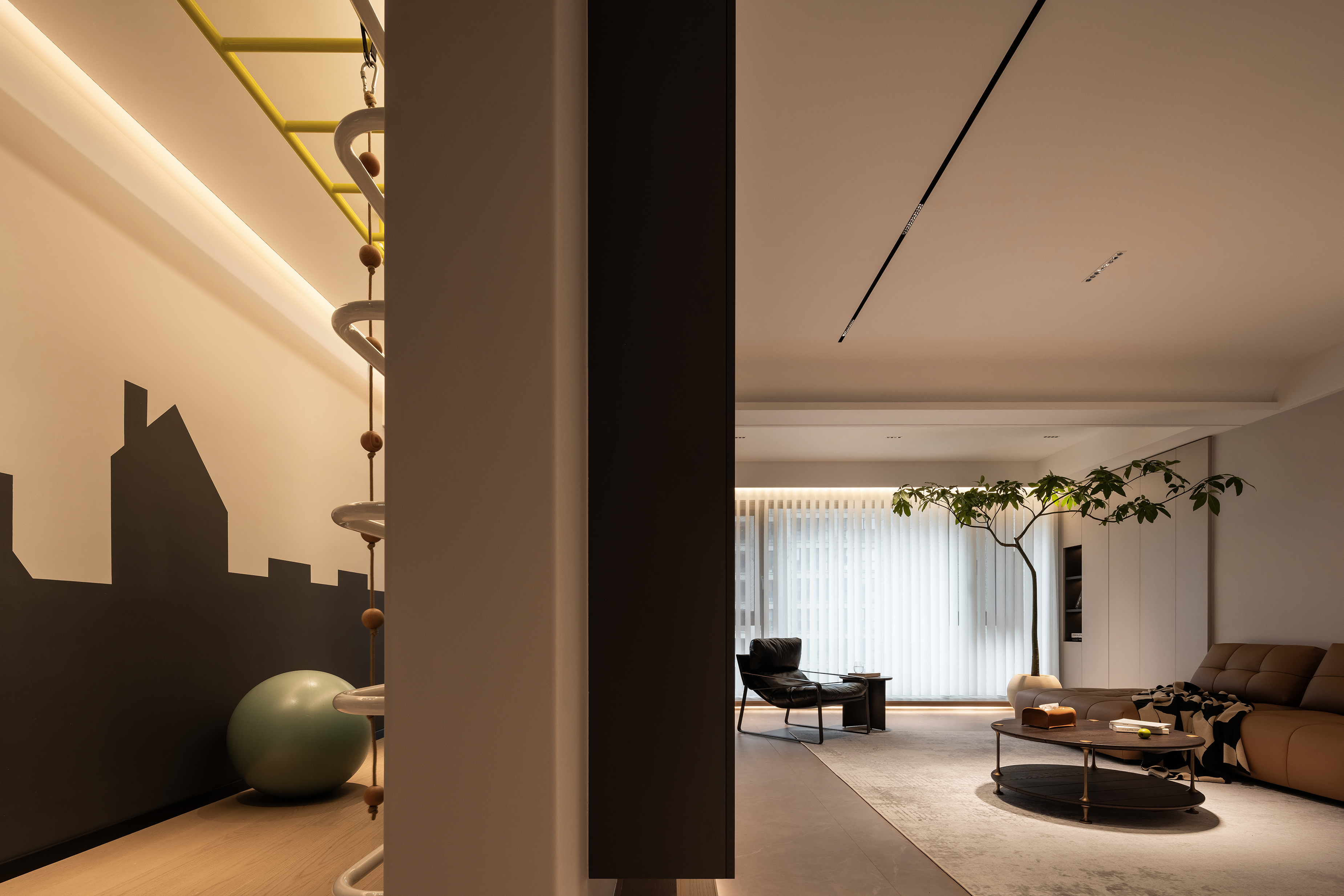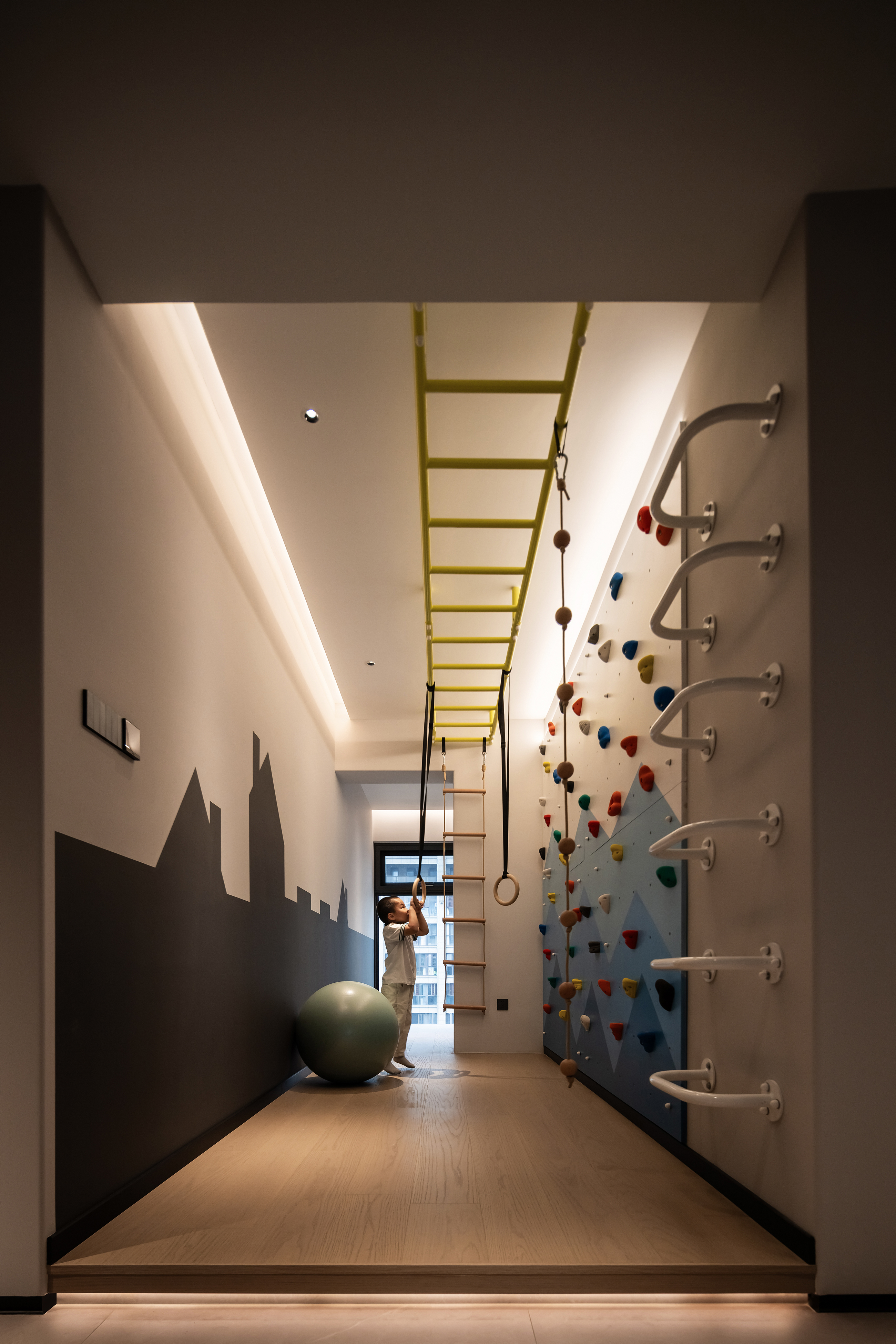 电视背景墙后暗藏玄机——一条专为双胞胎弟弟设计的“时光隧道”跃然眼前。左侧建筑剪影黑板漆激发创造力,记录着天马行空的涂鸦;右侧攀爬墙、软梯与吊环组成迷你游乐场,让孩子们的活力尽情释放。