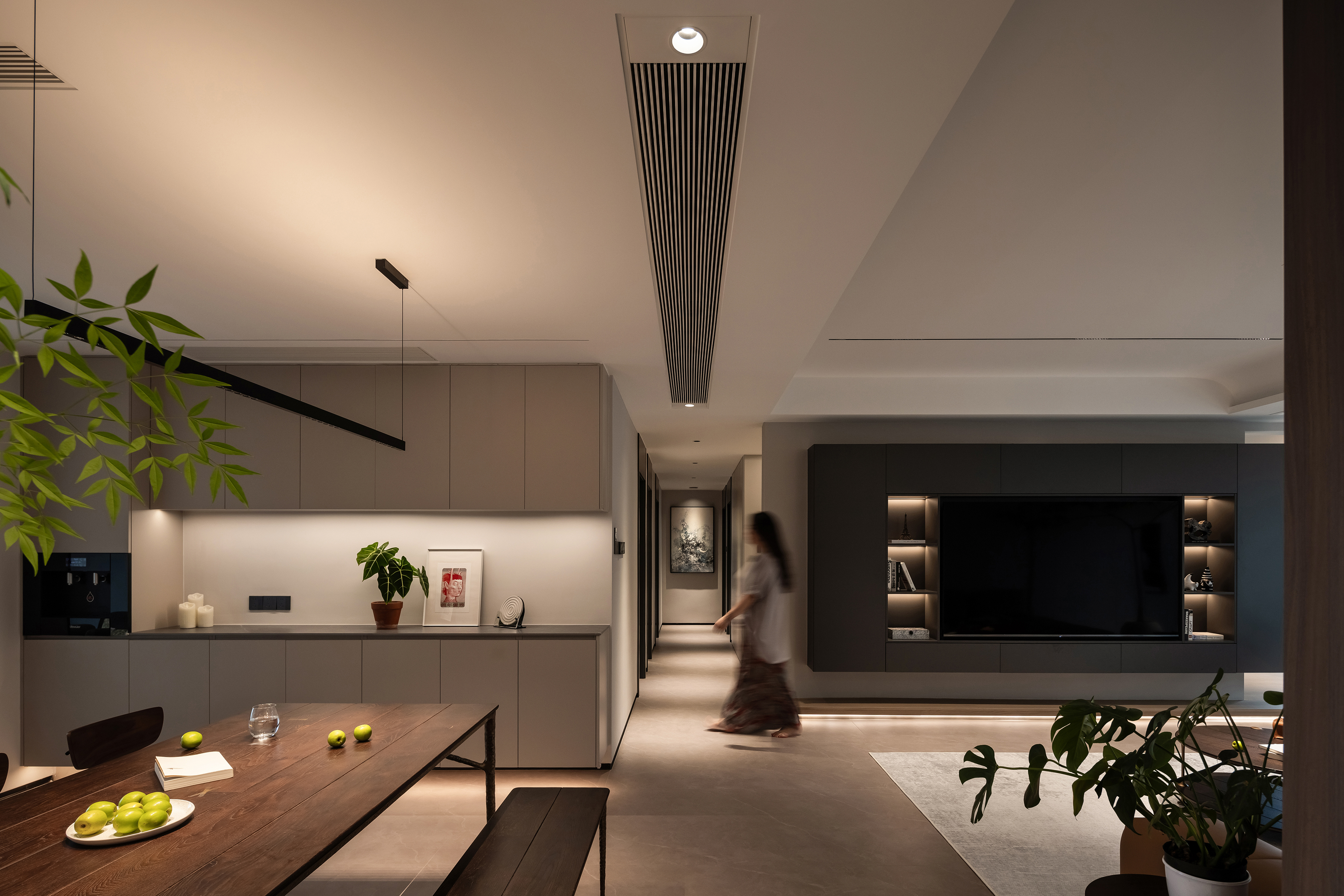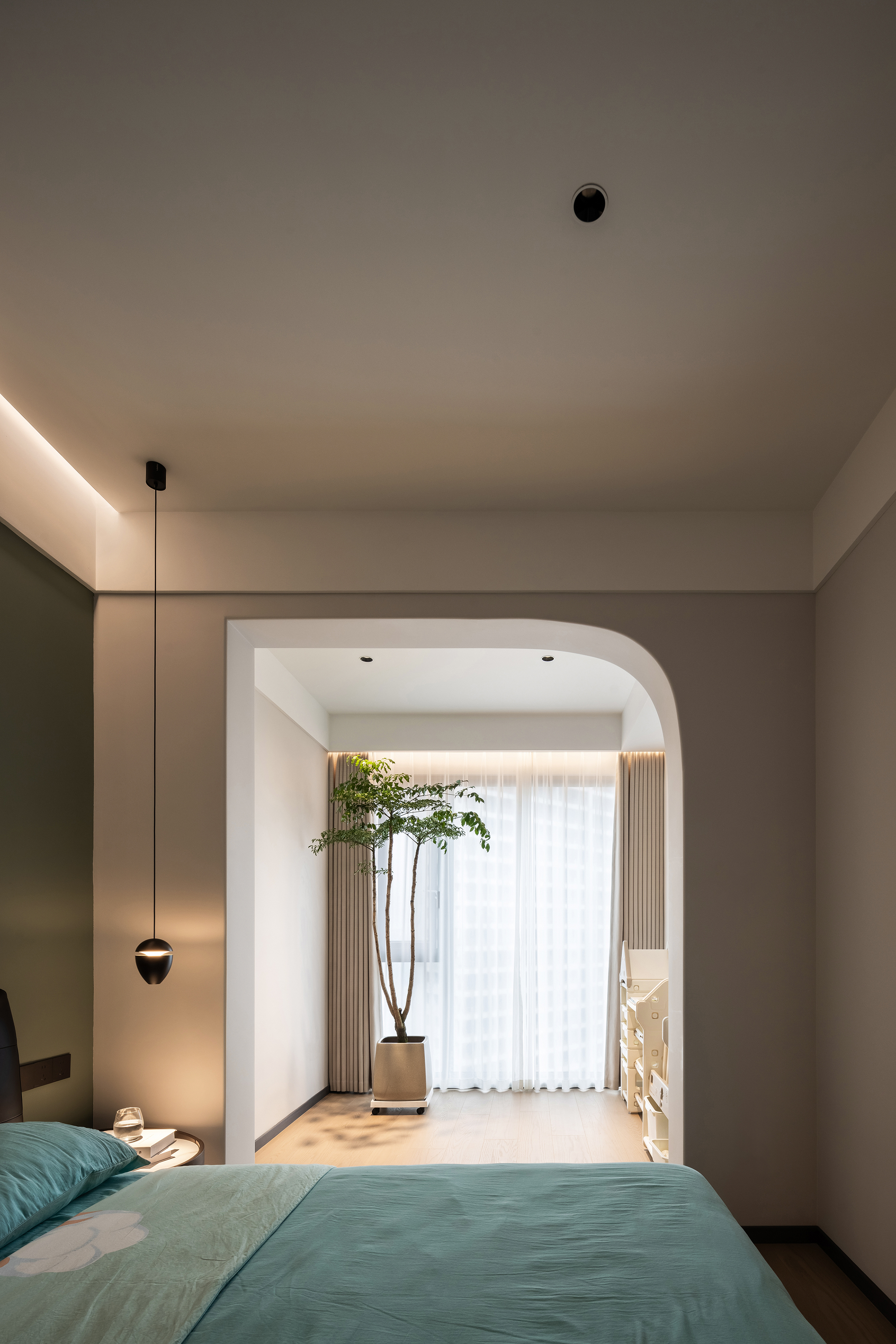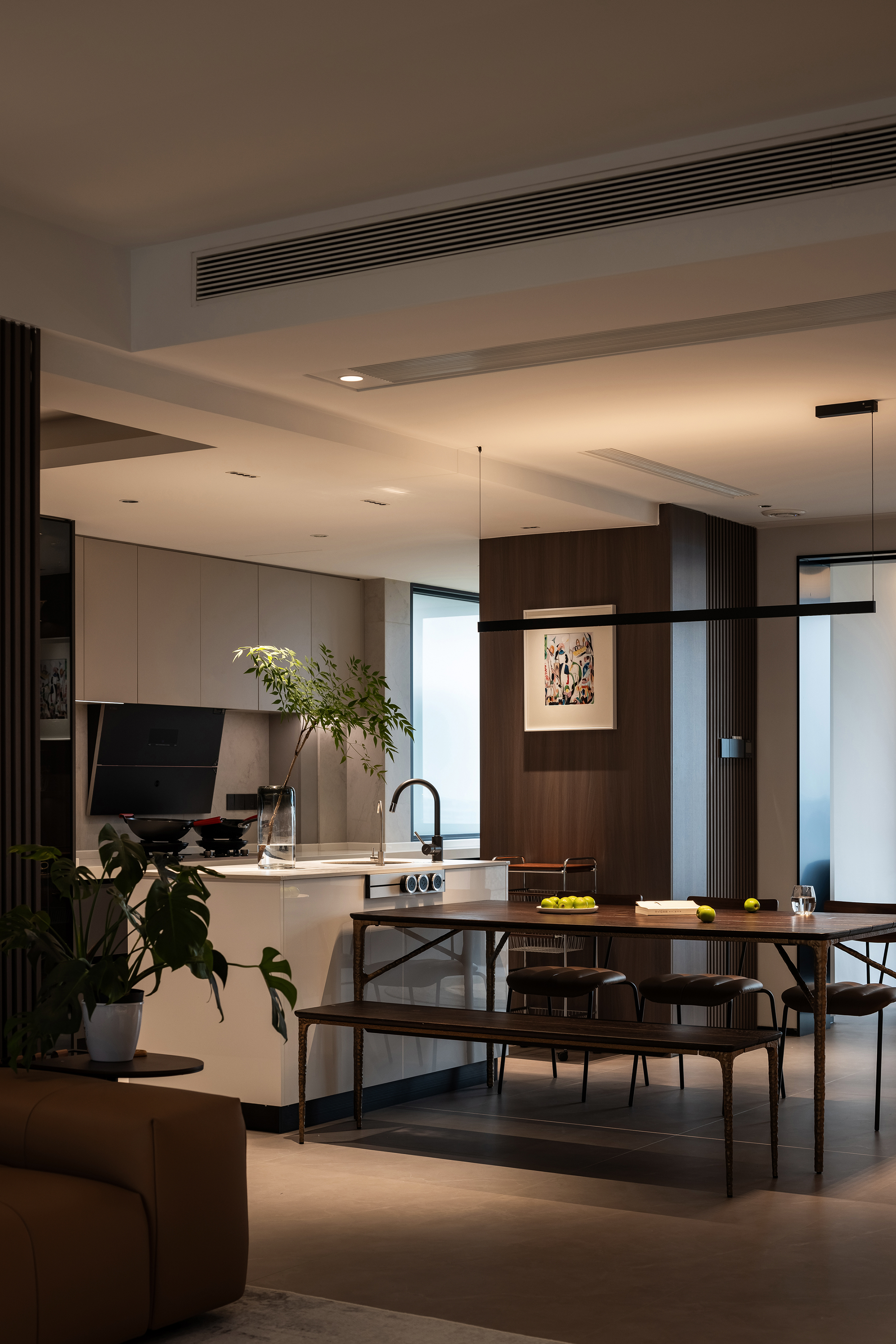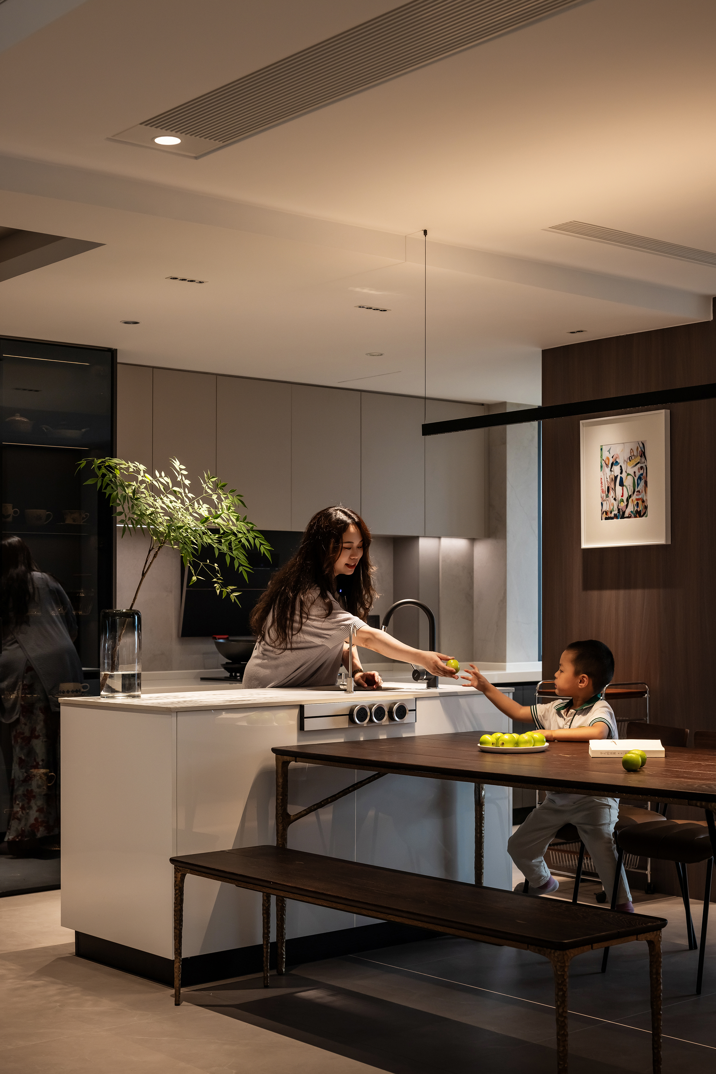 开放式厨房与岛台餐桌形成洄游动线,在烹饪的同时也能与孩子互动。餐厅阳台巧用口袋门,开合之间切换空间尺度——关上门,这里便成为一处独立静谧的角落,天花隐藏的换气扇确保空气清新流动;打开门,与客餐厅浑然一体,延伸出开阔通透的视觉体验,清风与阳光顷刻融入家的呼吸。 -