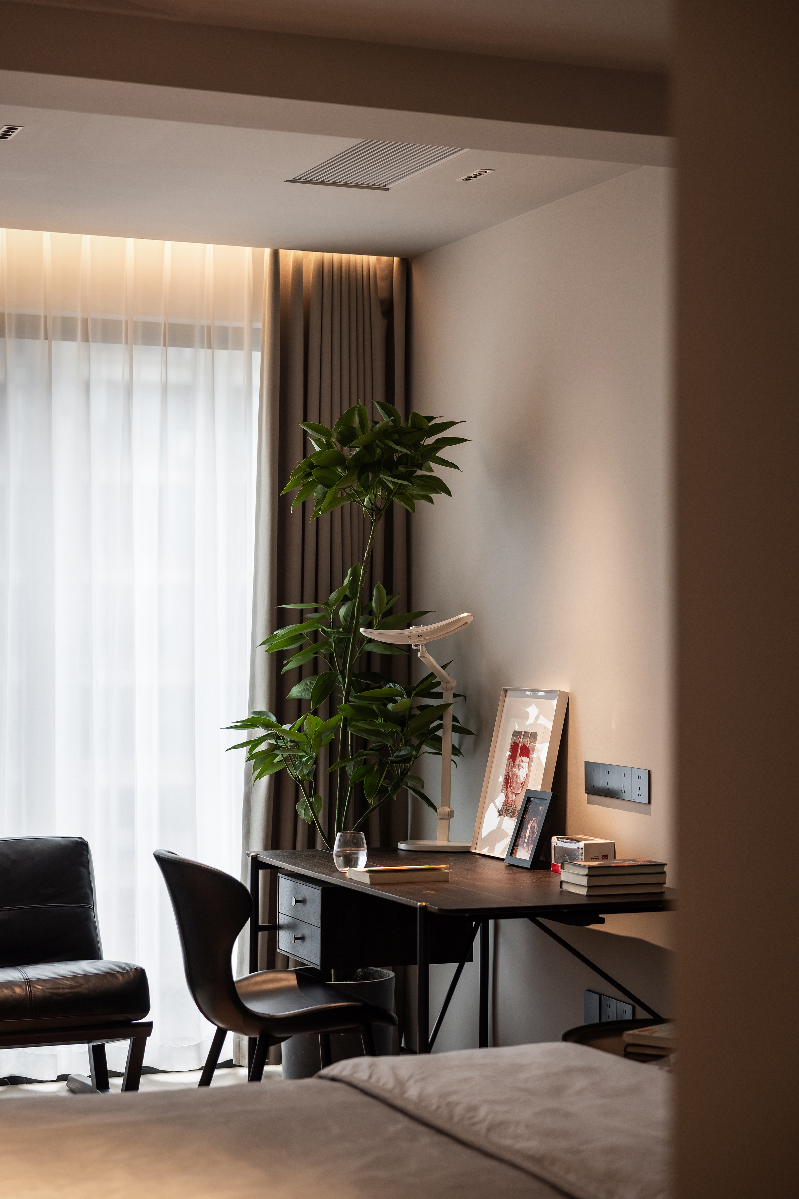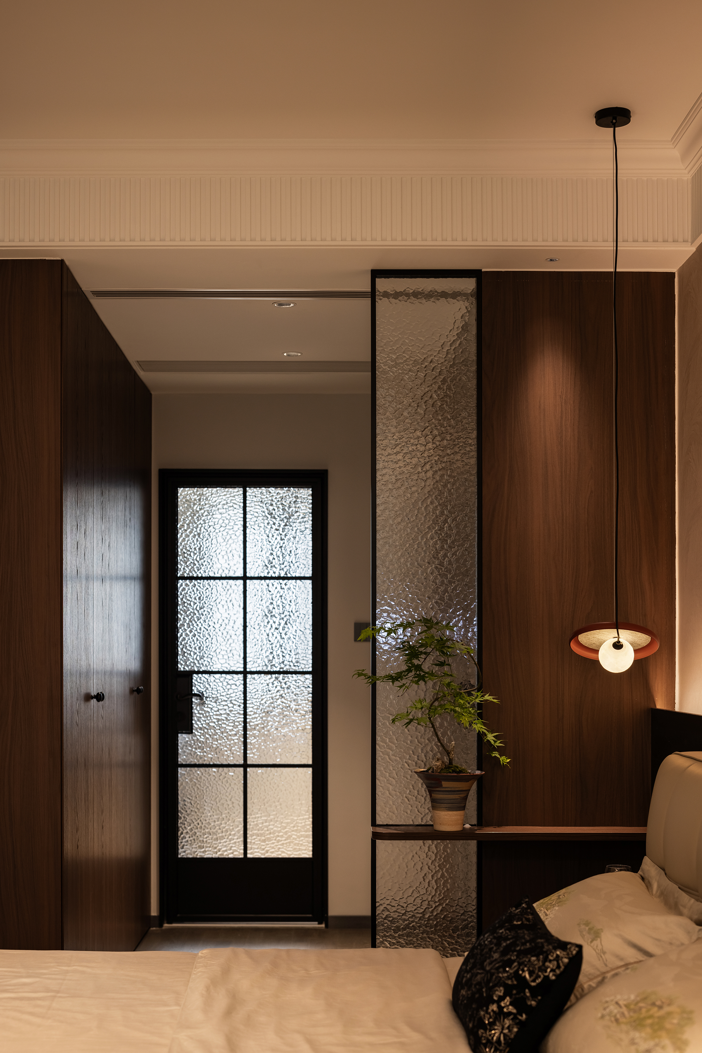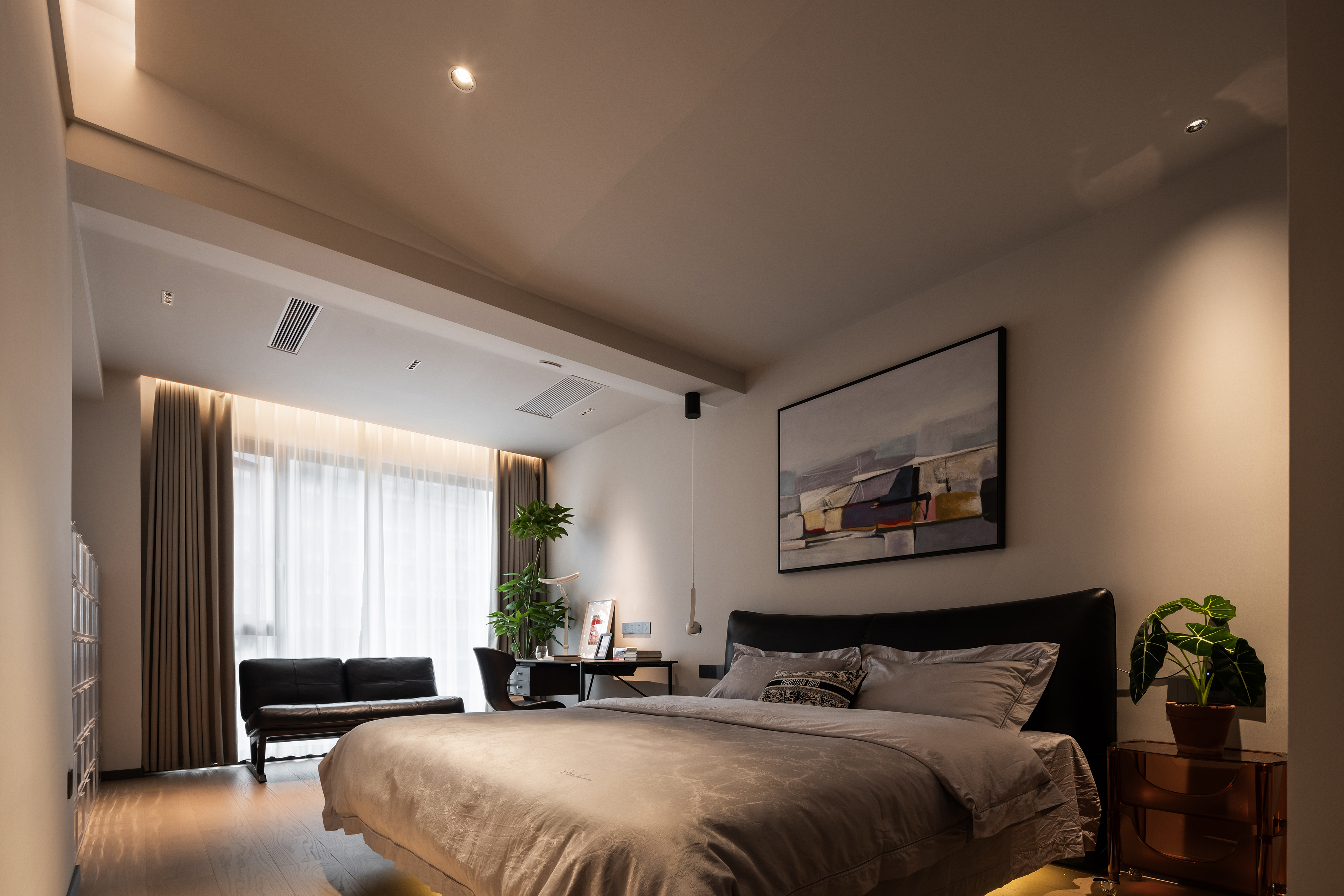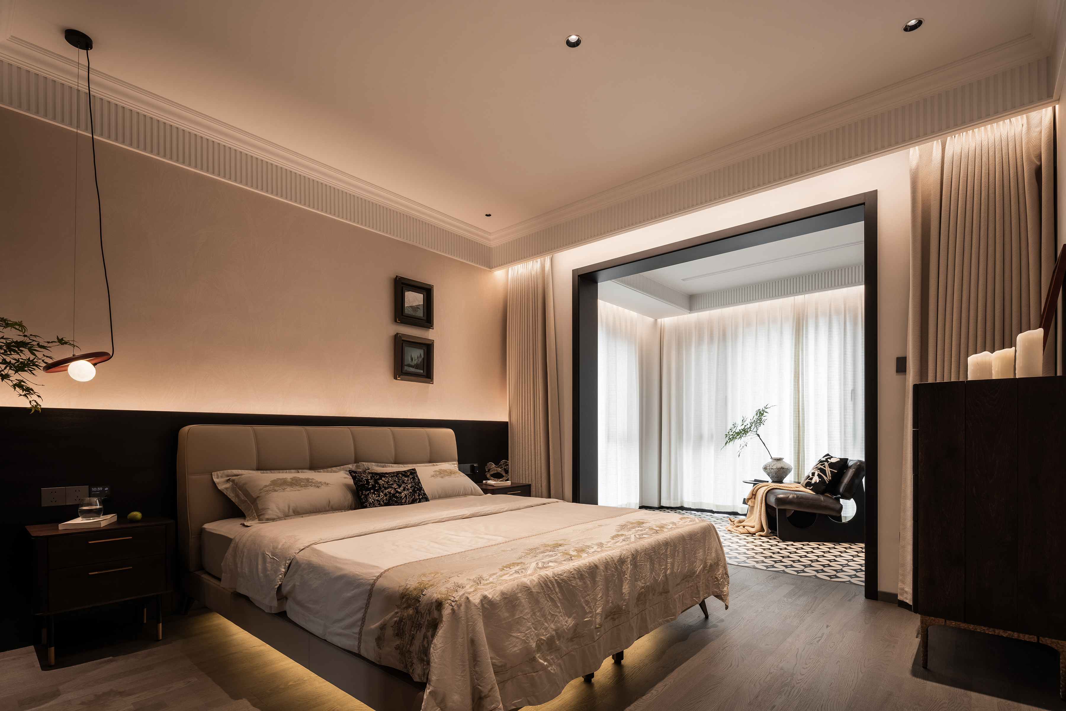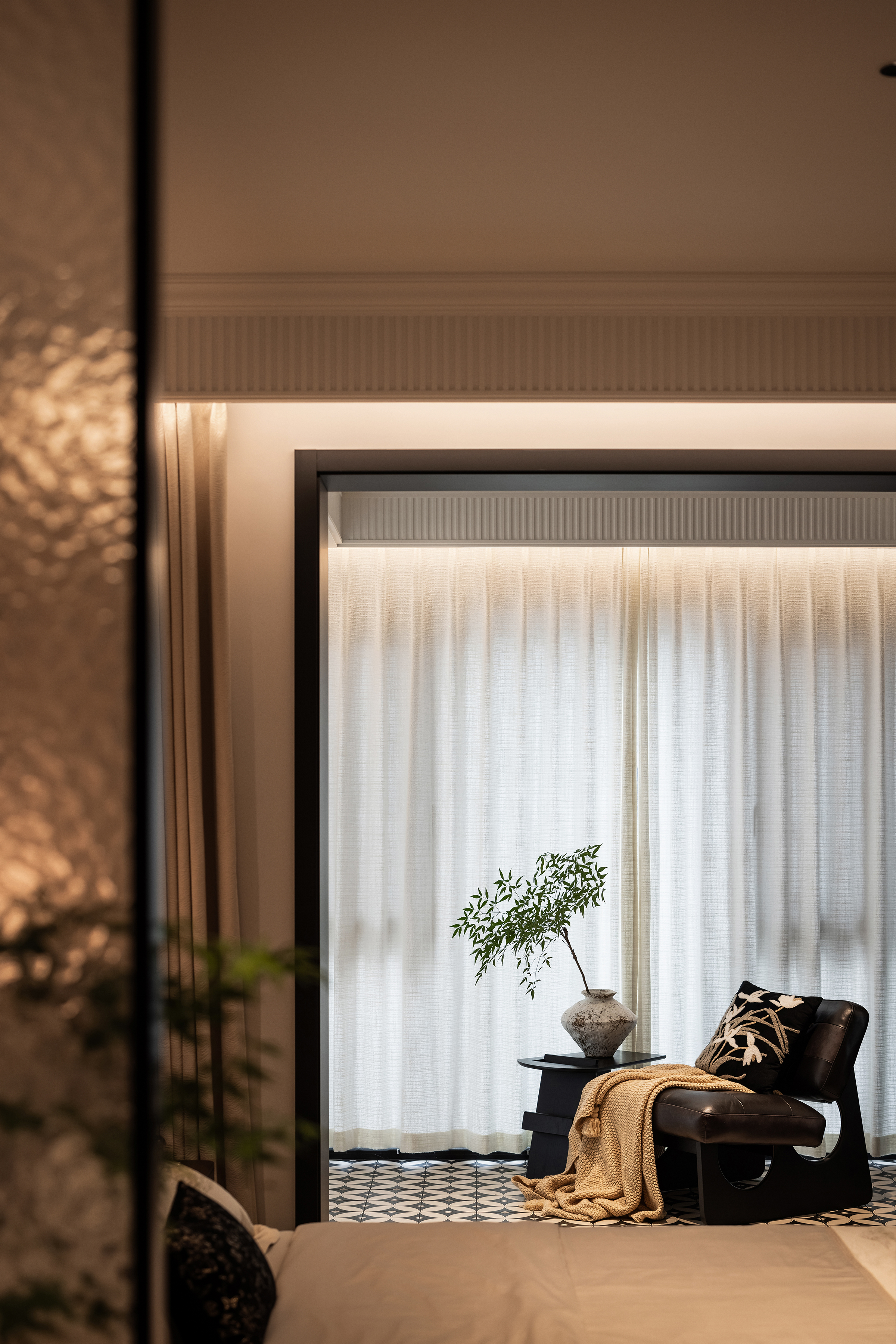主卧以黑色半墙床板与天花线条勾勒复古基调,两幅小挂画增添艺术气息。衣帽间以艺术玻璃隔断,朦胧中透出现代感。休闲小阳台化身女主人的秘密角落,镜面衣柜门折射晨光,单椅边几陪伴阅读或放空的静谧时光。 -