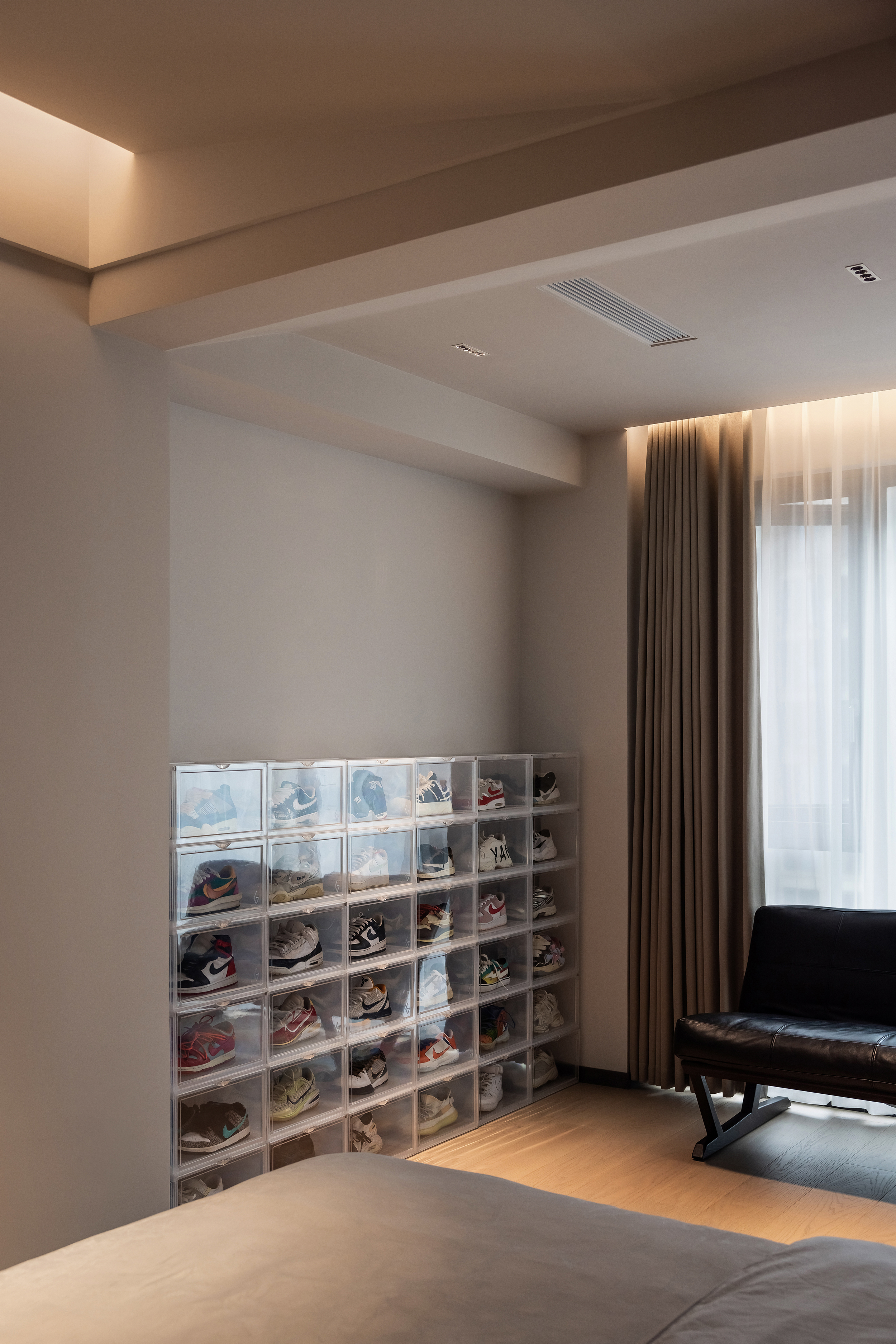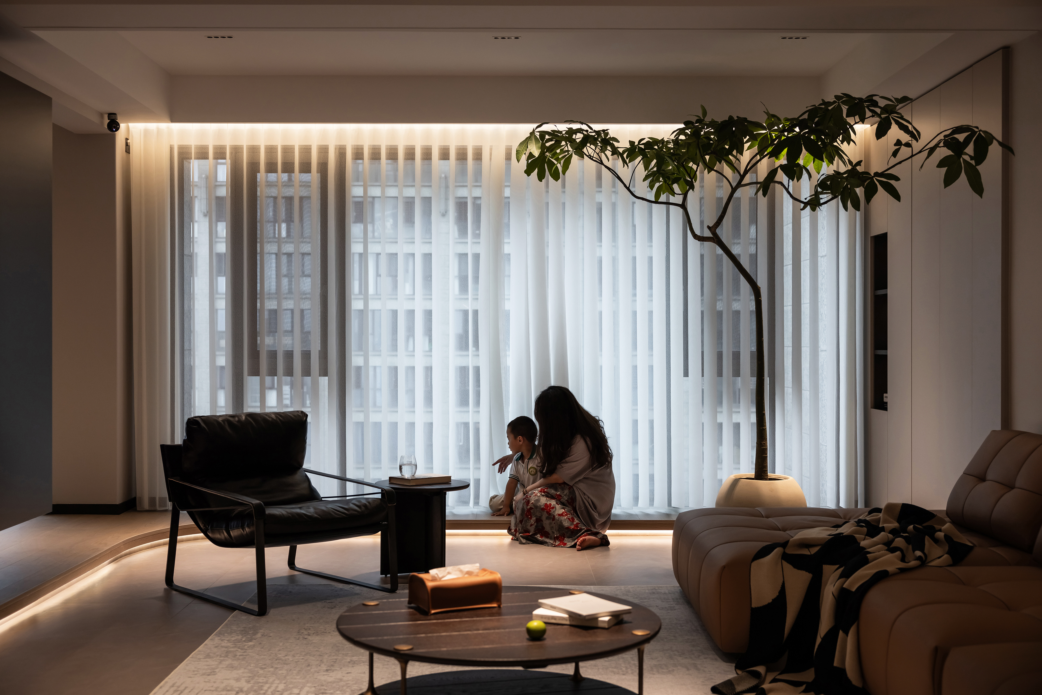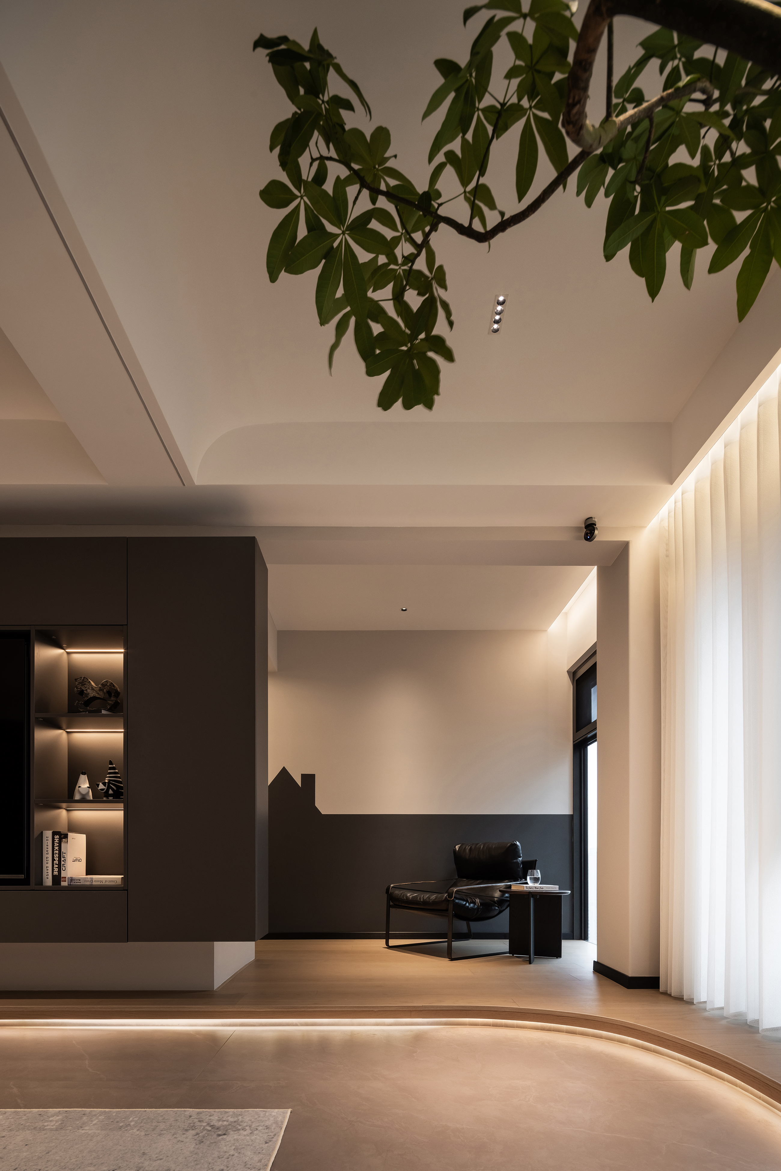 客厅以沉稳的木饰面为基调,意式家具的流畅线条与一颗挺拔的绿植相映成趣,勾勒出优雅的生活场景。沙发背后的挂画暗藏巧思——全家人的生肖隐匿其中,成为专属的情感符号。抬高的地面嵌入灯带,仿佛一条发光的路径,连接现实与童趣世界。 -