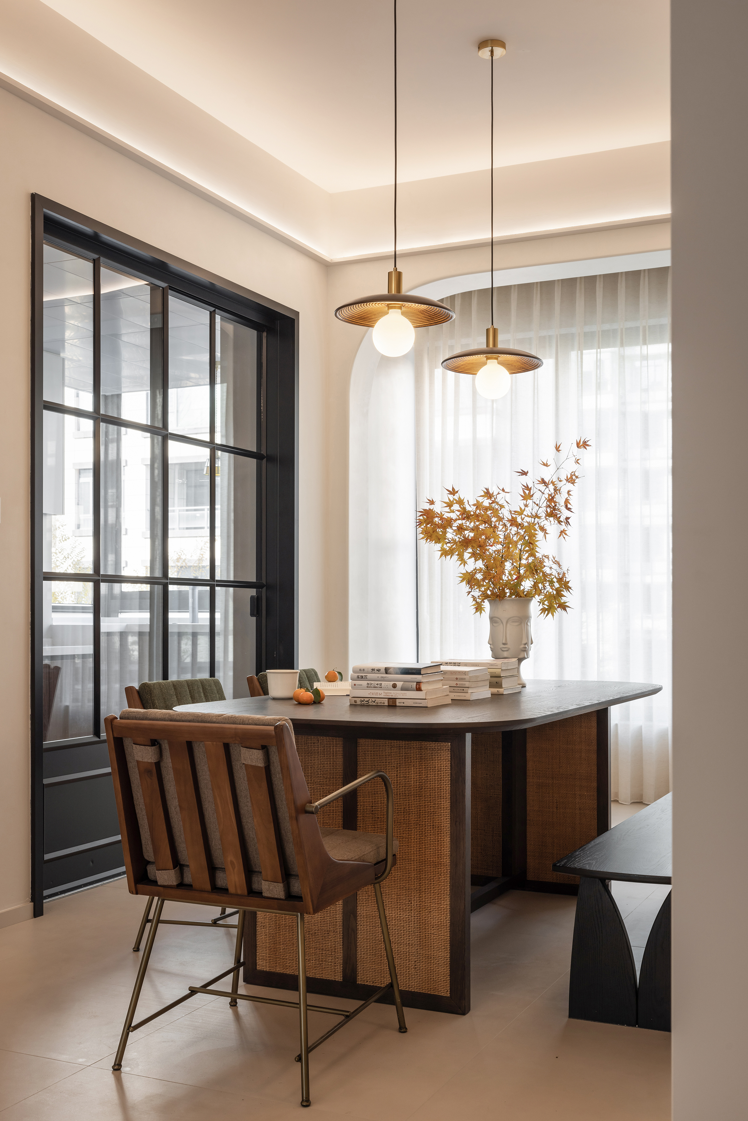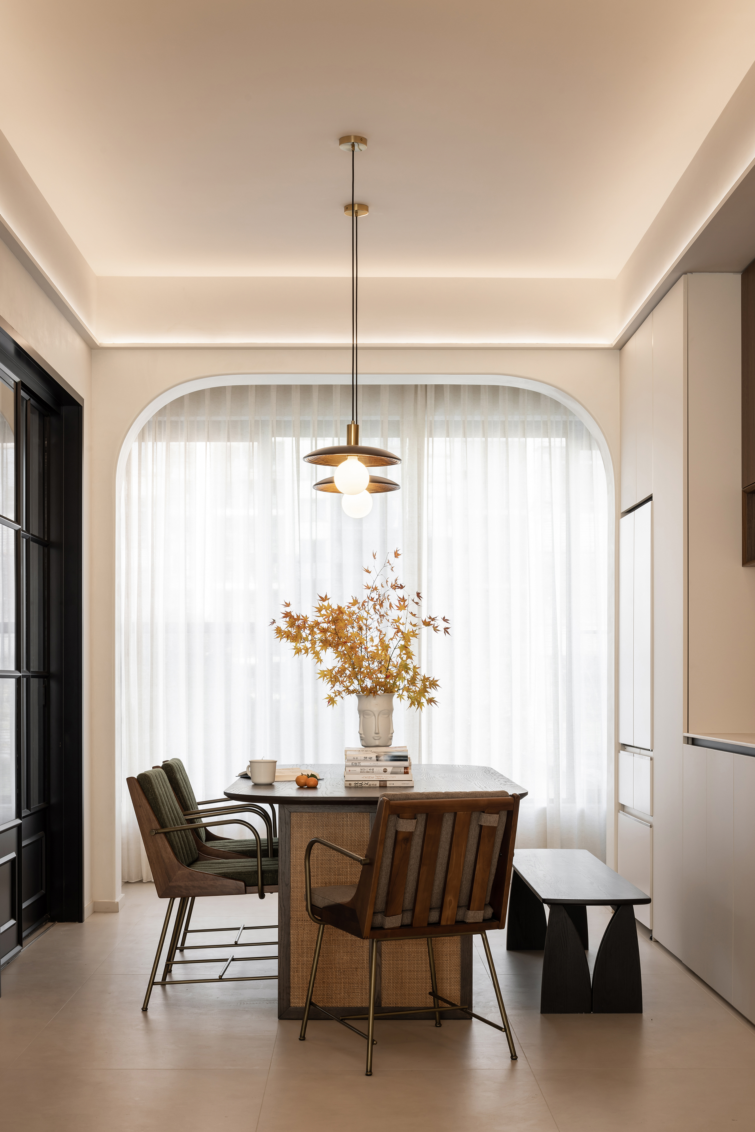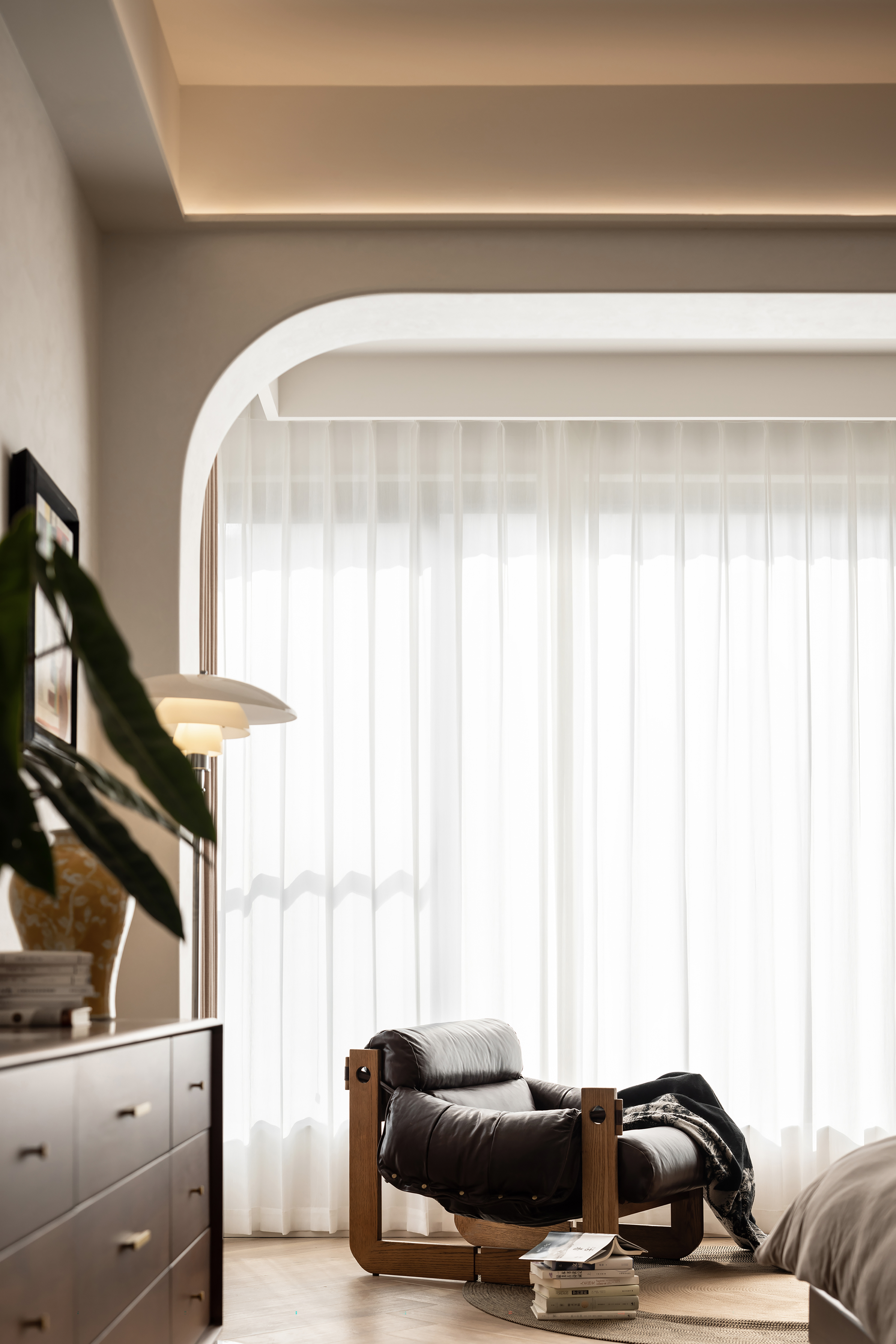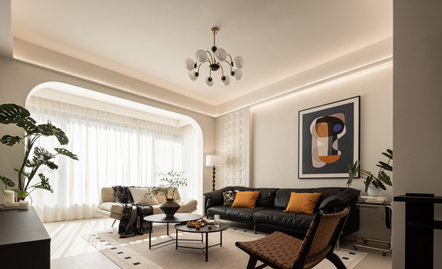 设计选材:亚麻窗帘以其柔和的质感和温暖的色调,不仅调节了室内光线,还巧妙地营造出一种私密而宁静的氛围。室内色调设计上追求整体统一,通过精心搭配,使整个空间呈现出一种和谐统一且层次分明的美感。