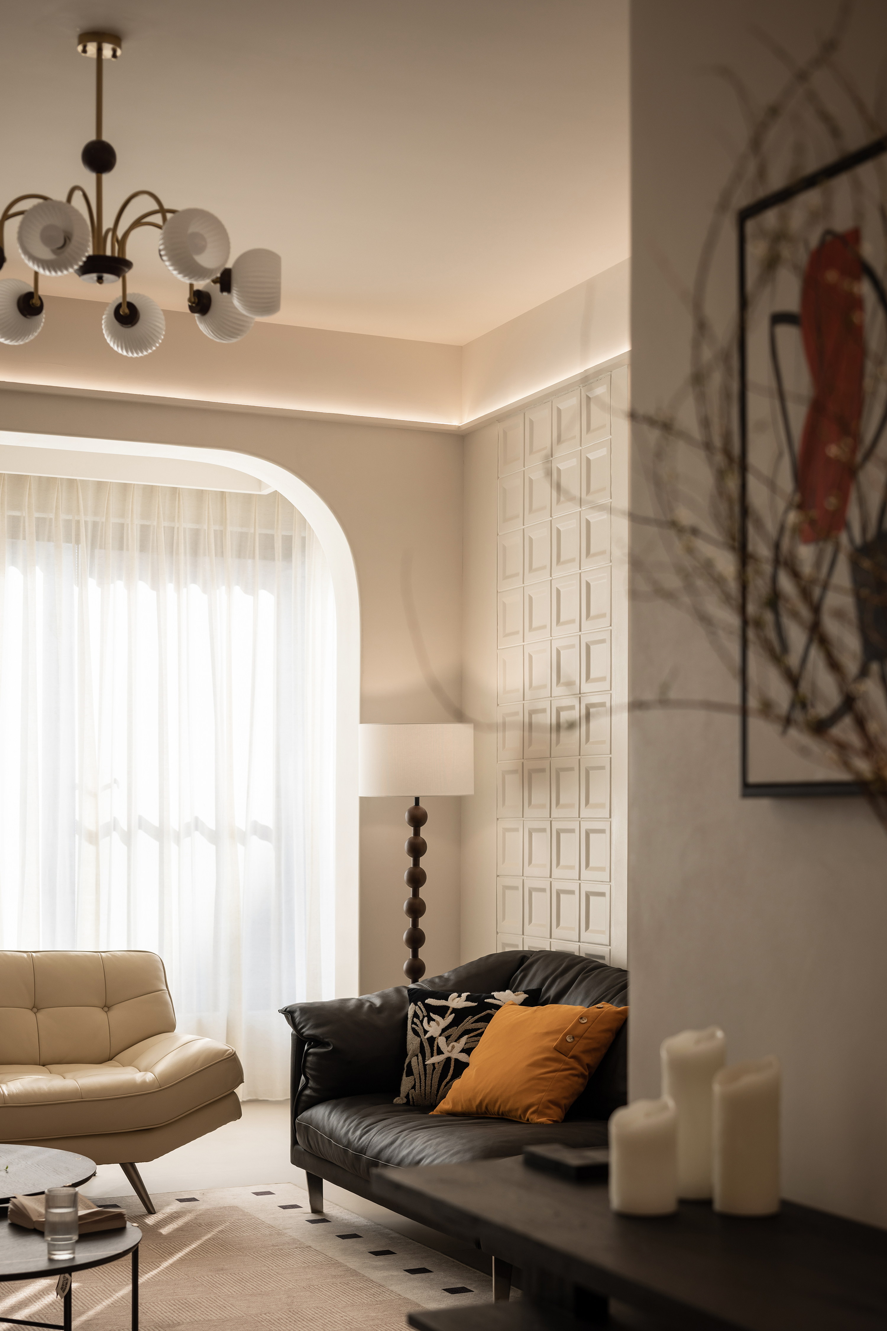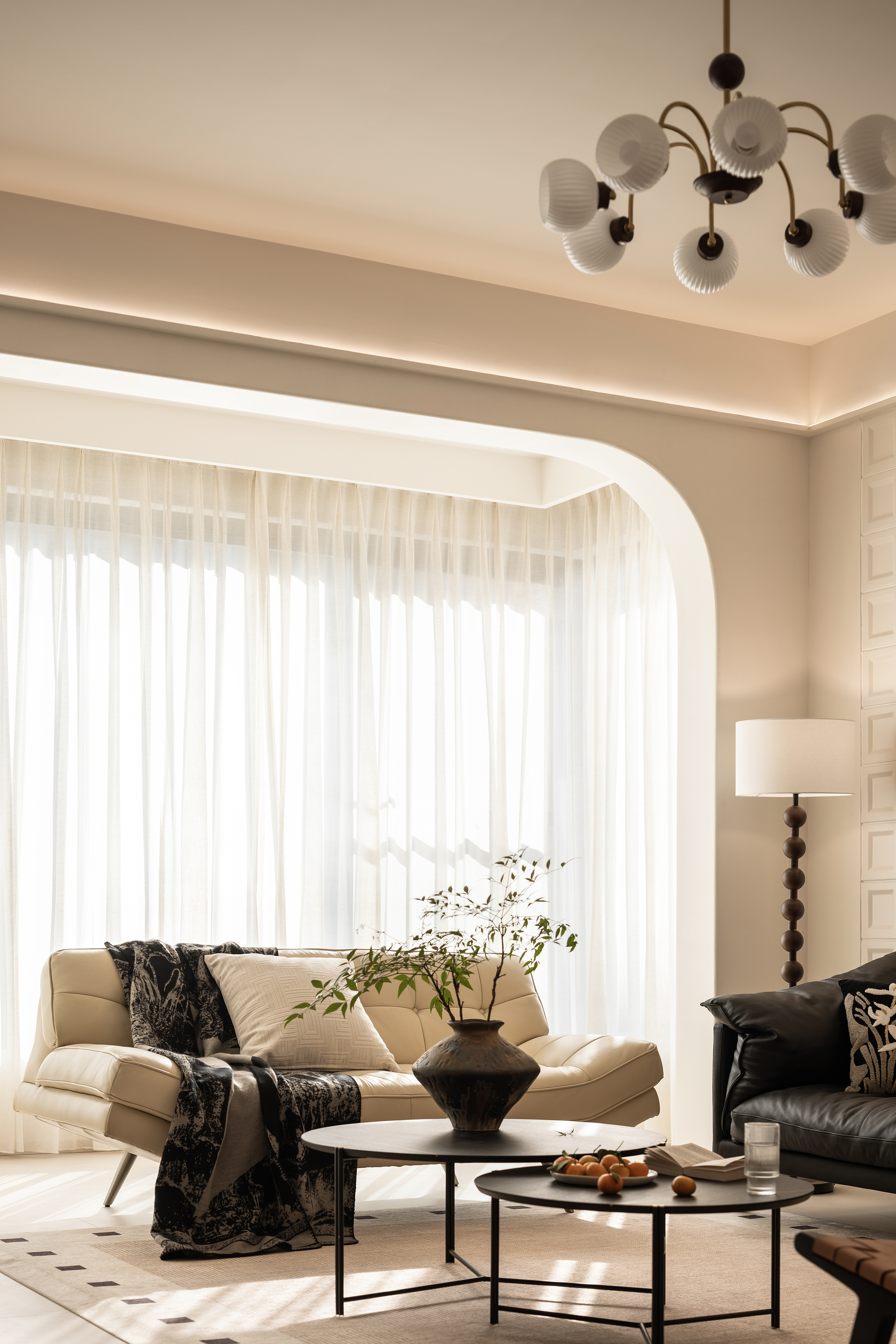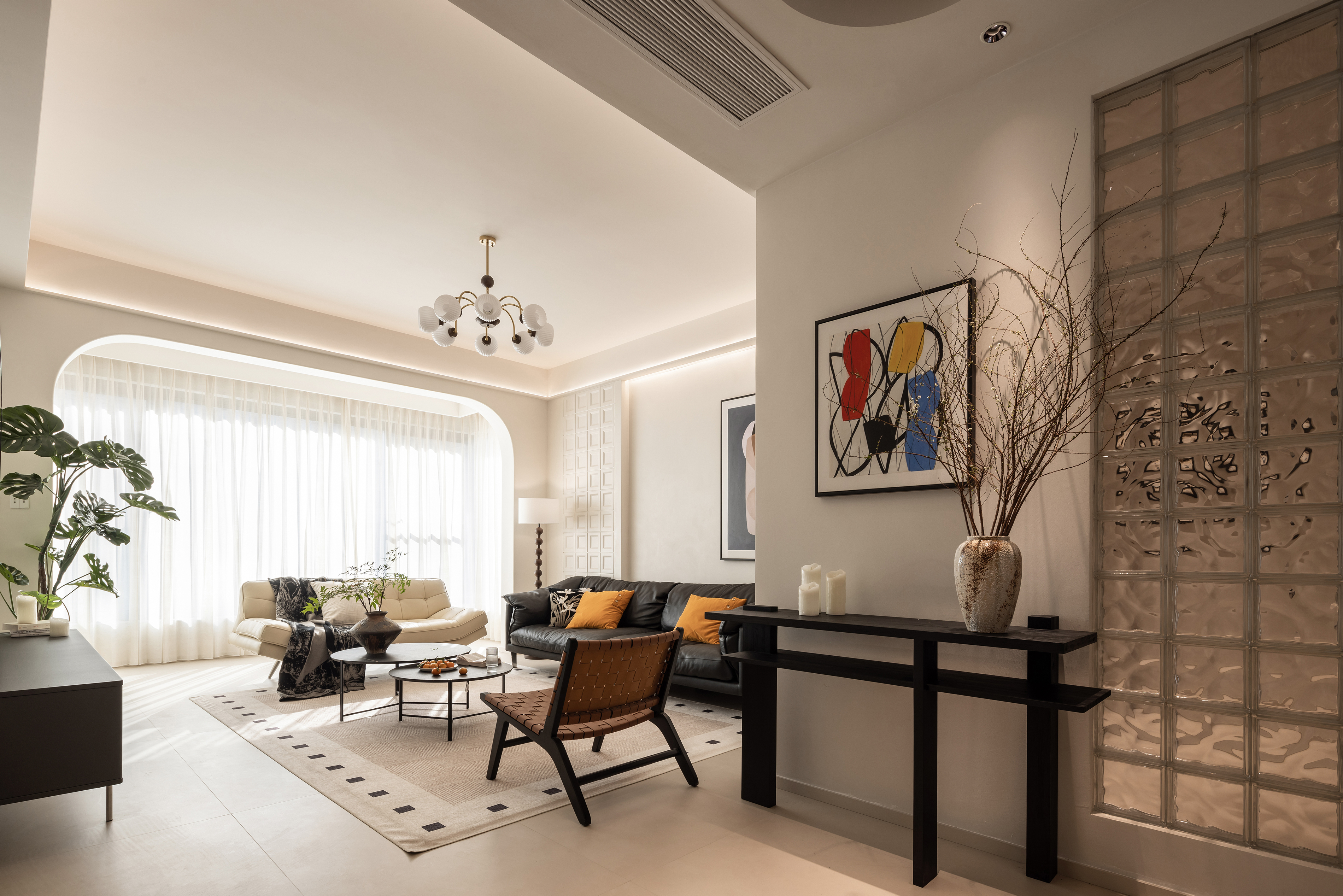 设计选材:亚麻窗帘以其柔和的质感和温暖的色调,不仅调节了室内光线,还巧妙地营造出一种私密而宁静的氛围。室内色调设计上追求整体统一,通过精心搭配,使整个空间呈现出一种和谐统一且层次分明的美感。