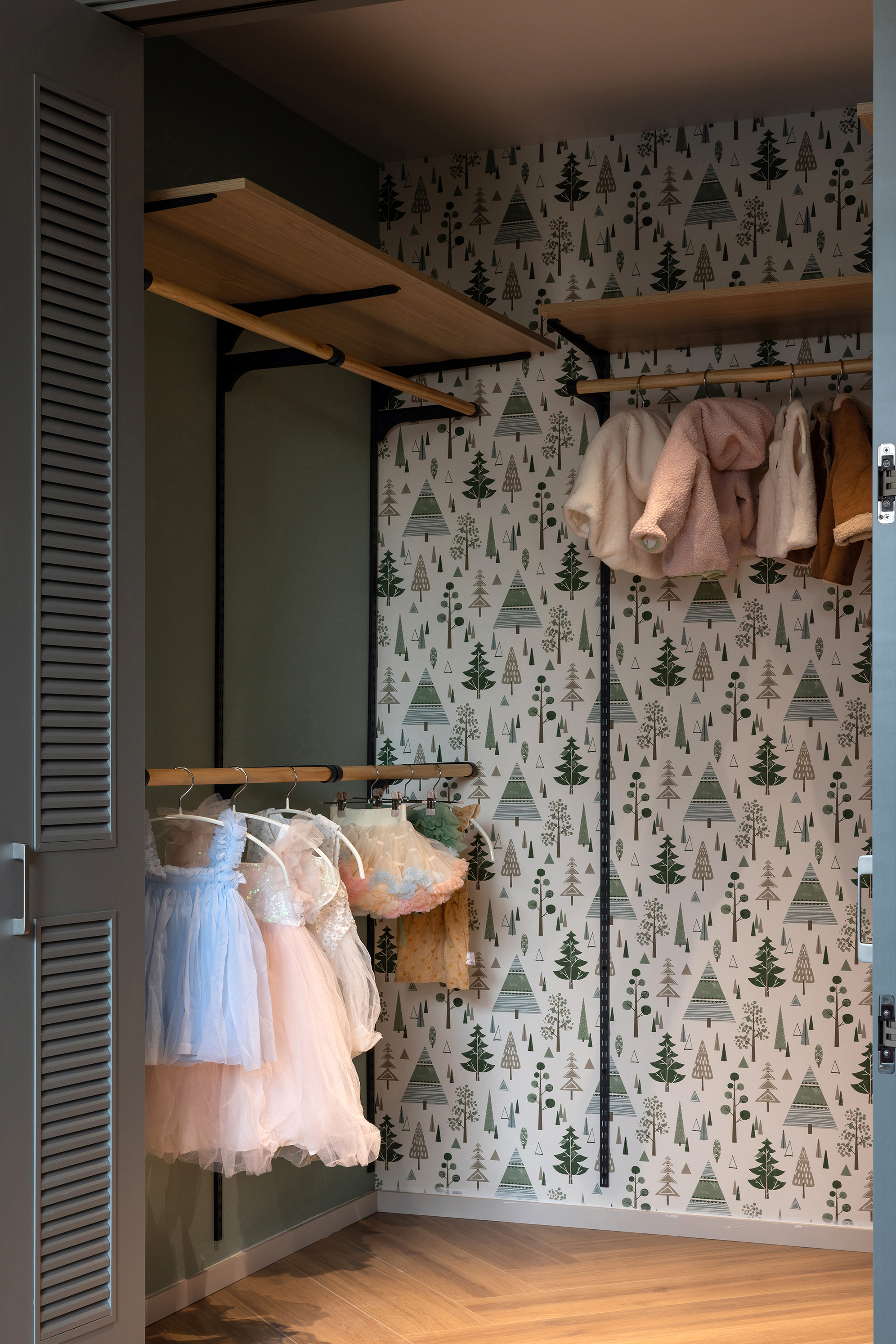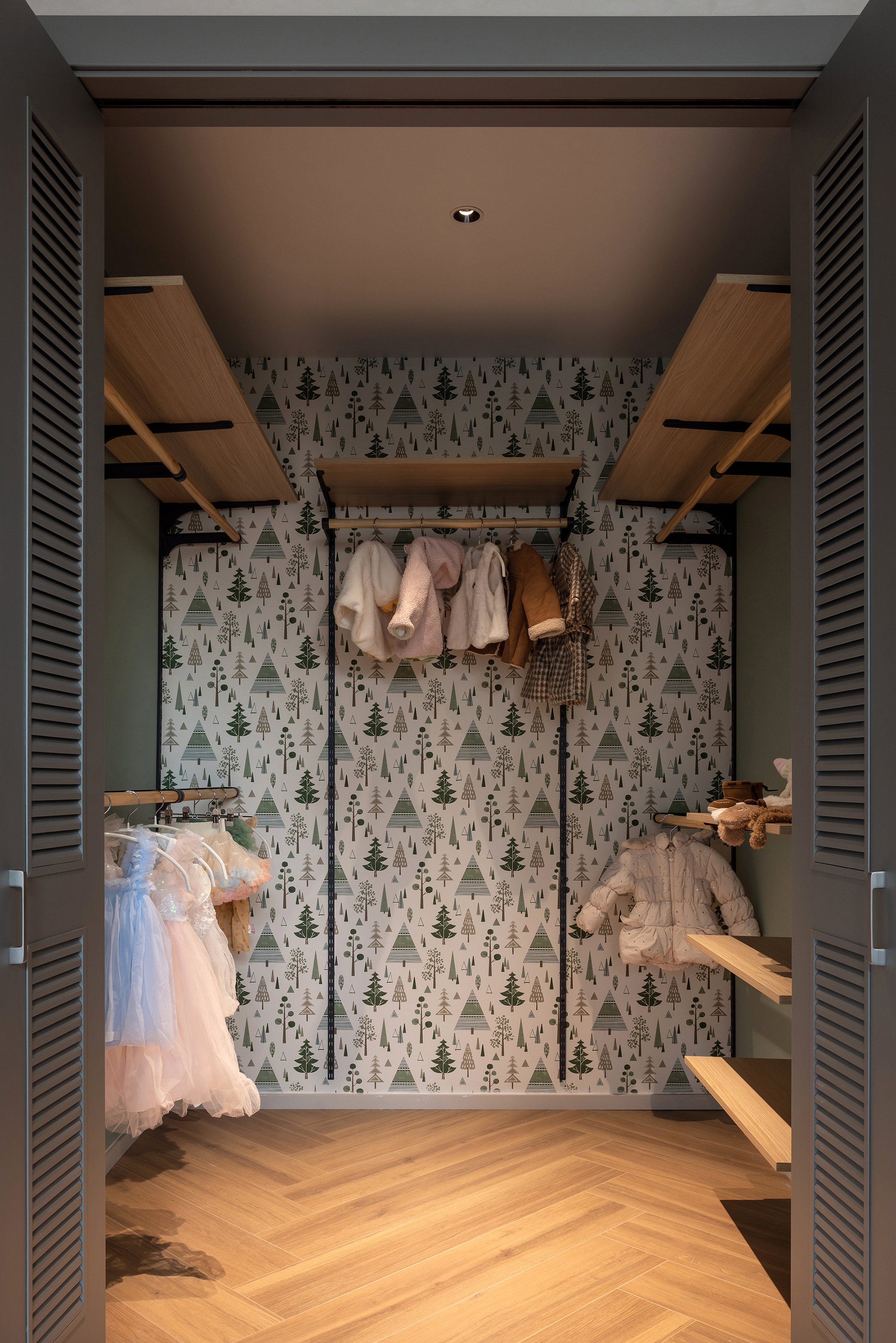 户型中央的储物间被重新设计,预留为未来的儿童娱教区,这一前瞻性规划展现了我们对居住者未来生活的美好愿景。小孩房的衣帽间设计兼顾了童趣与实用性,通过乳胶漆与墙纸的巧妙结合,创造出一个既美观又实用的储物空间。