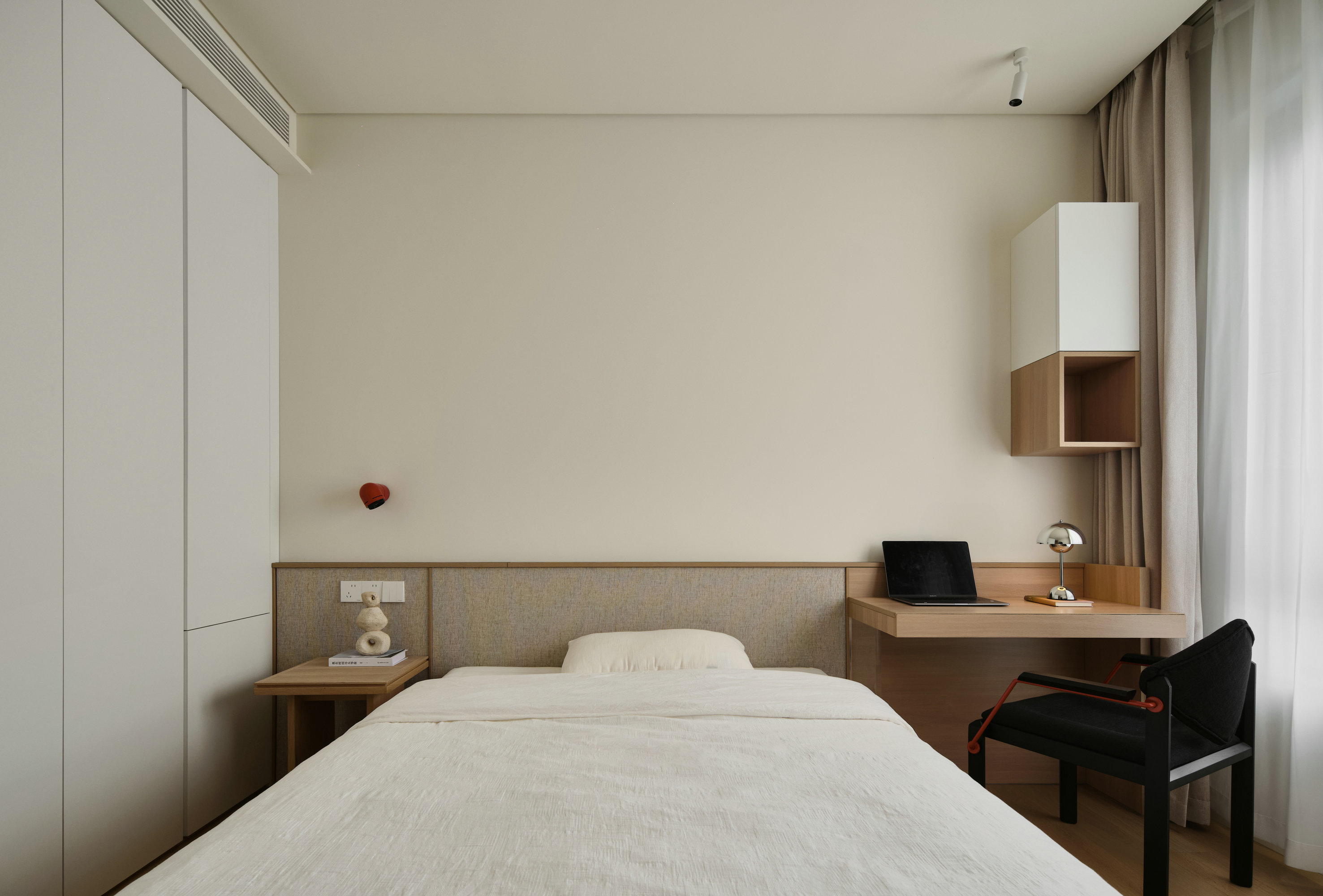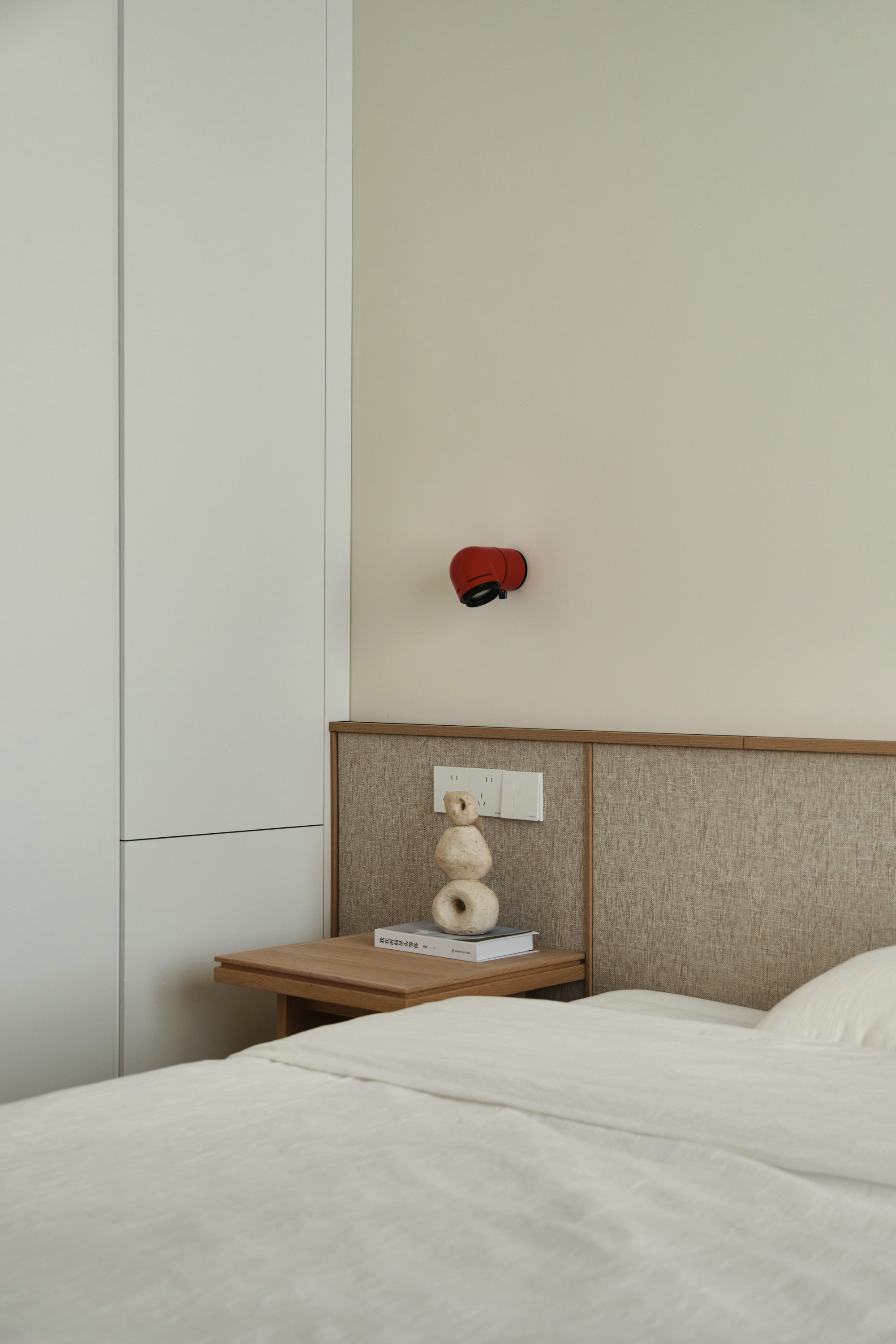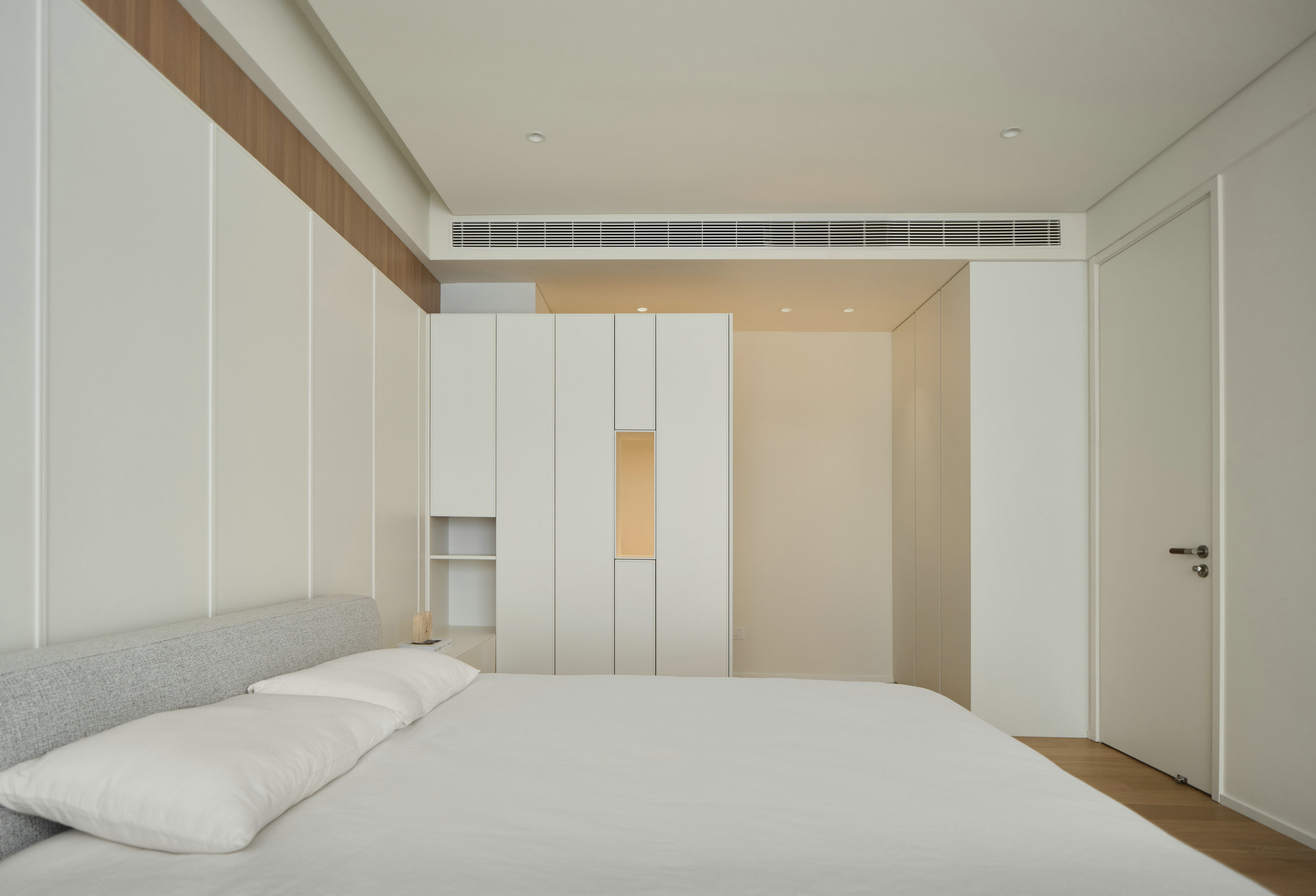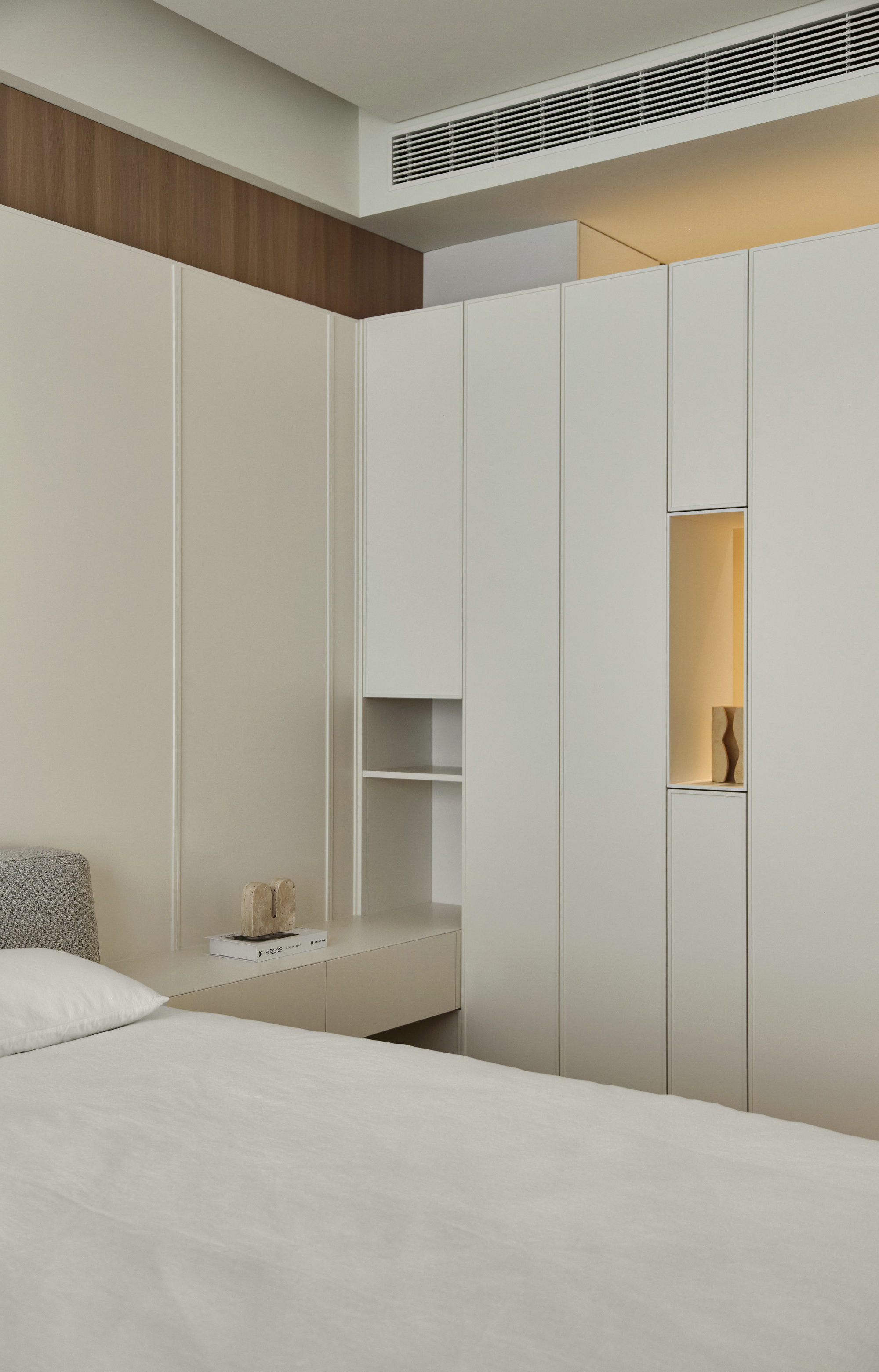 主卫门正对卧室床怎么办?用一道多功能墙体(L型衣柜) 重新定义空间关系。不仅挡住了卫生间门,形成了视觉和心理上的双重屏障。无论是从床上还是卧室门口,再也看不到卫生间啦。“顶空+中空” 的设计避免了实墙带来的拥堵和压抑感。 -