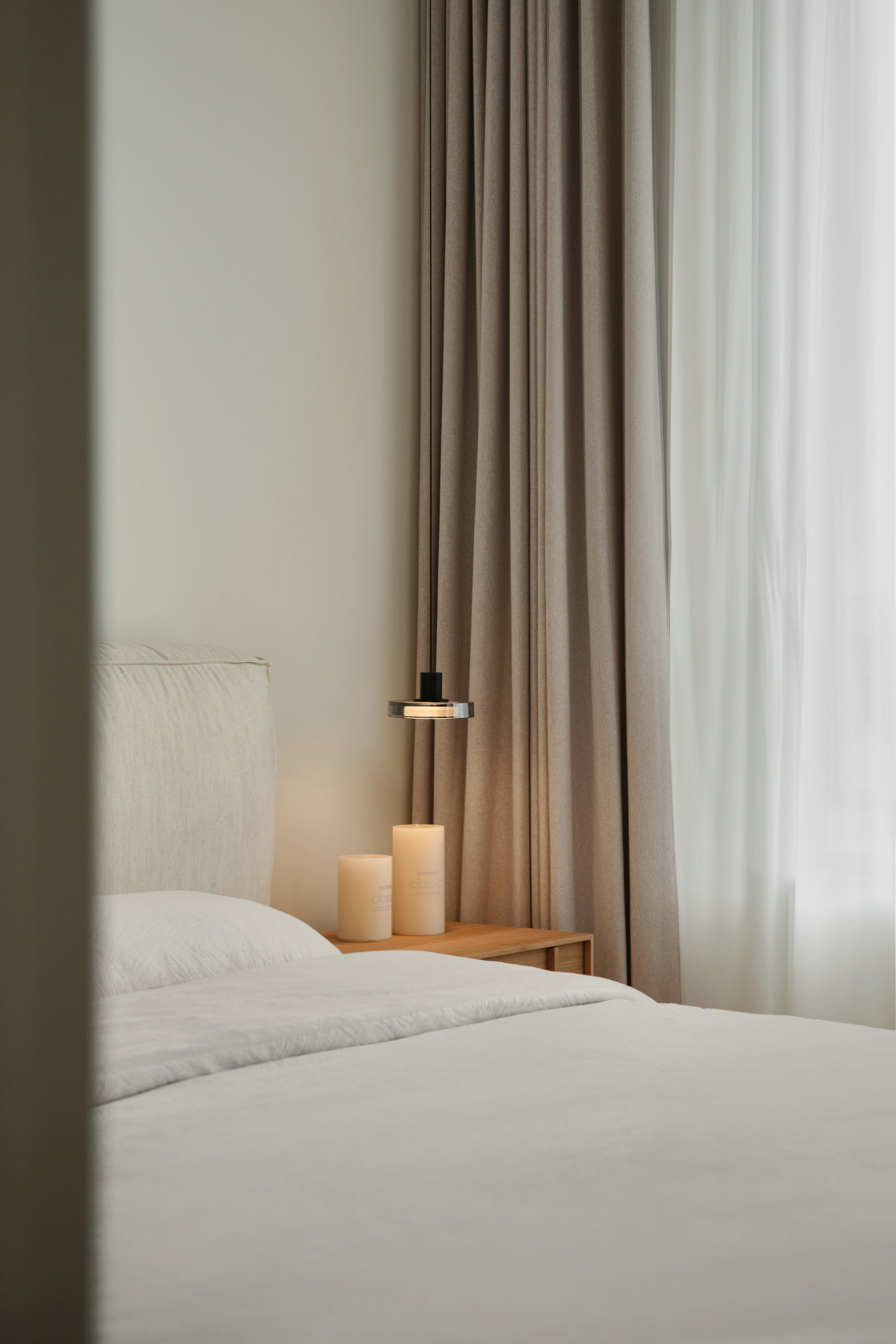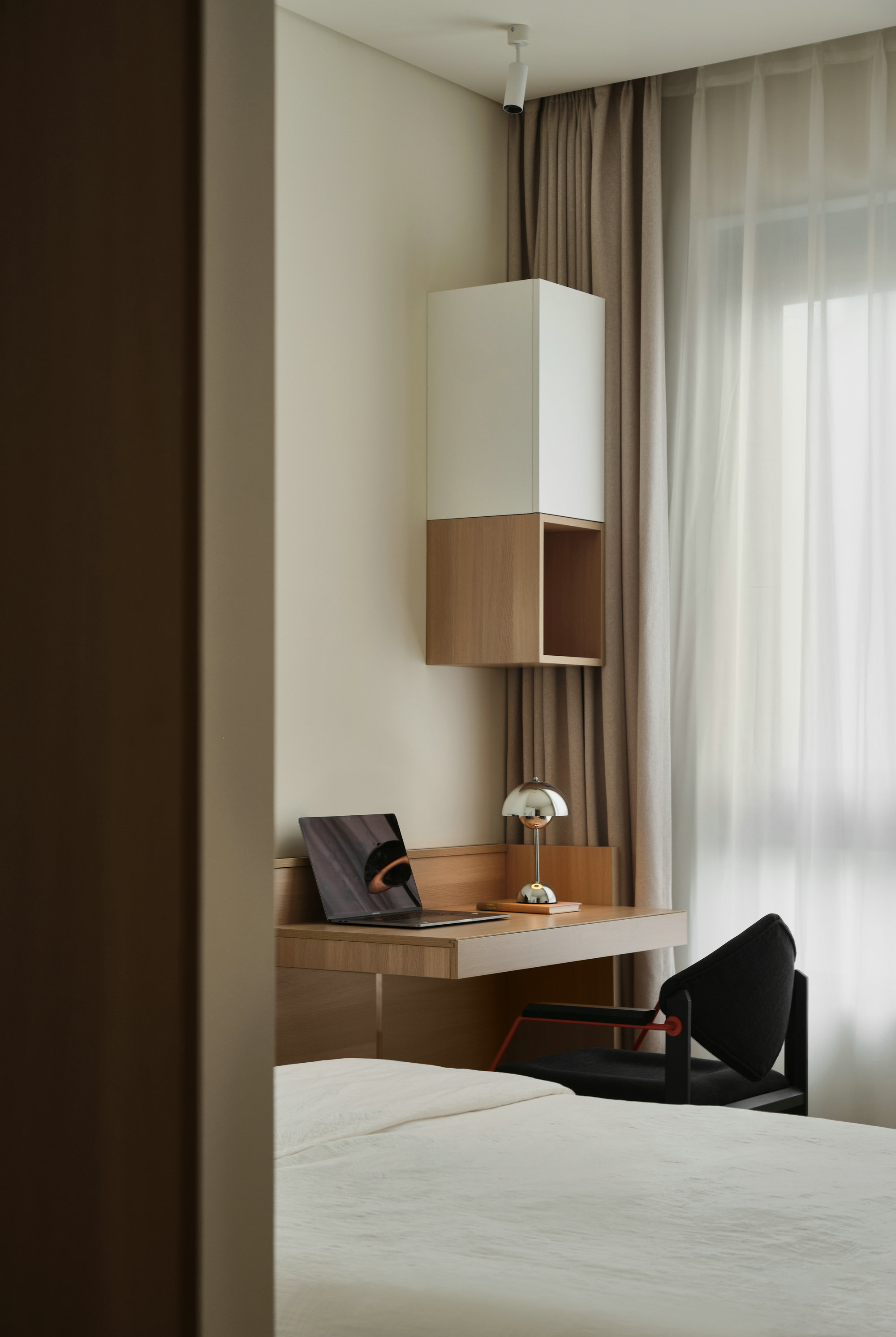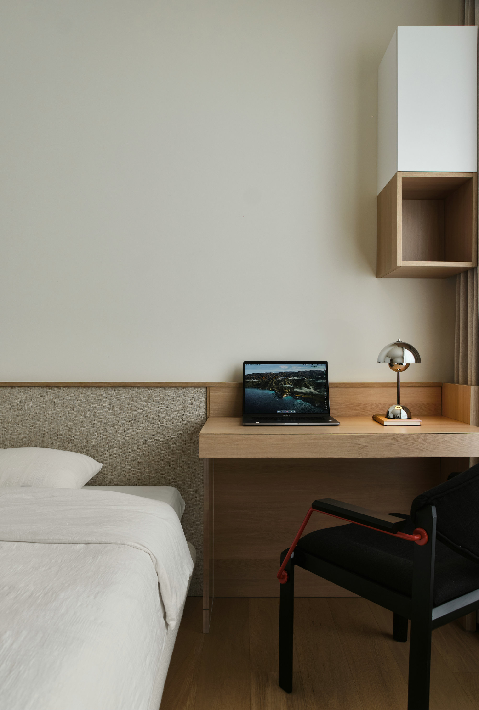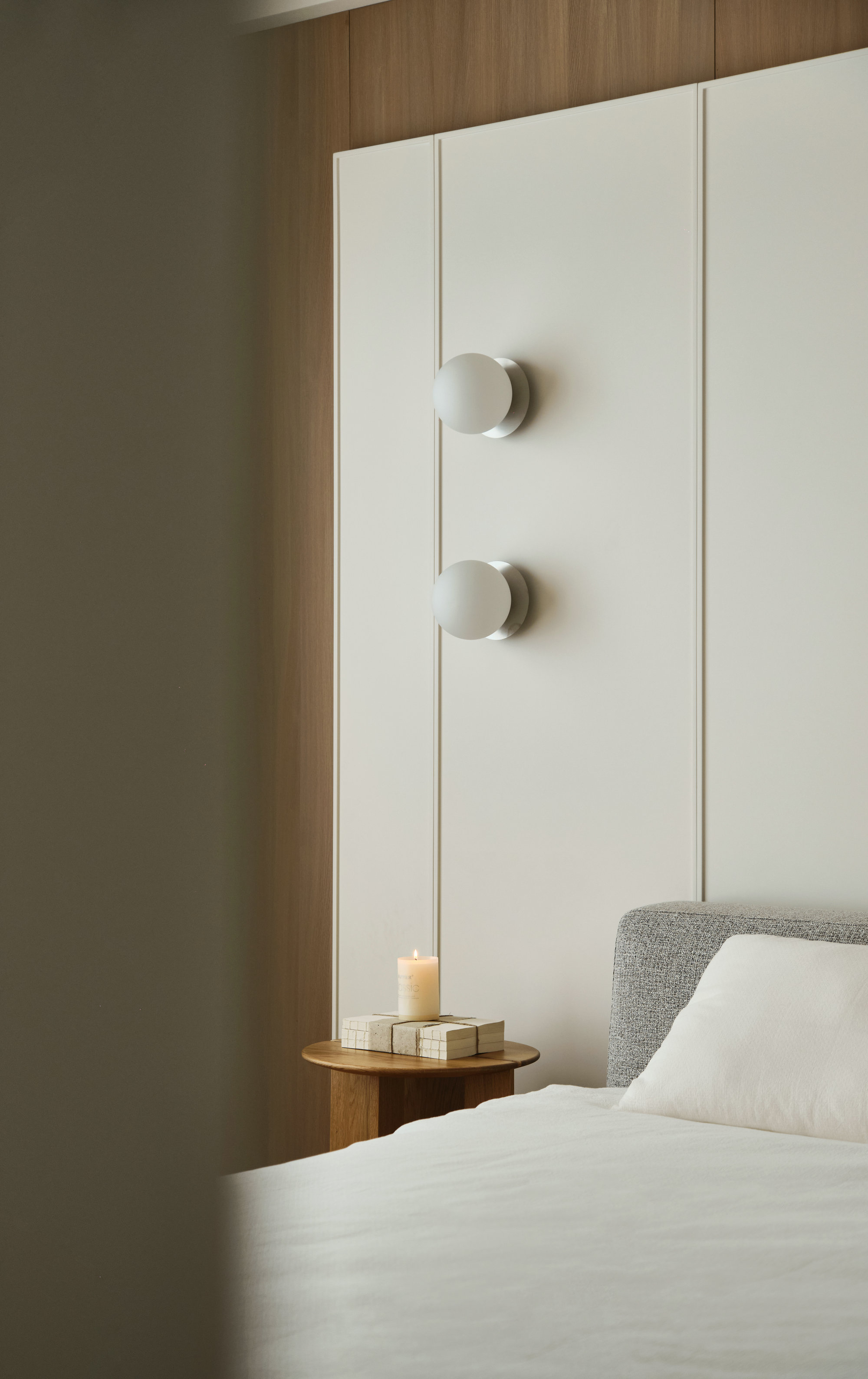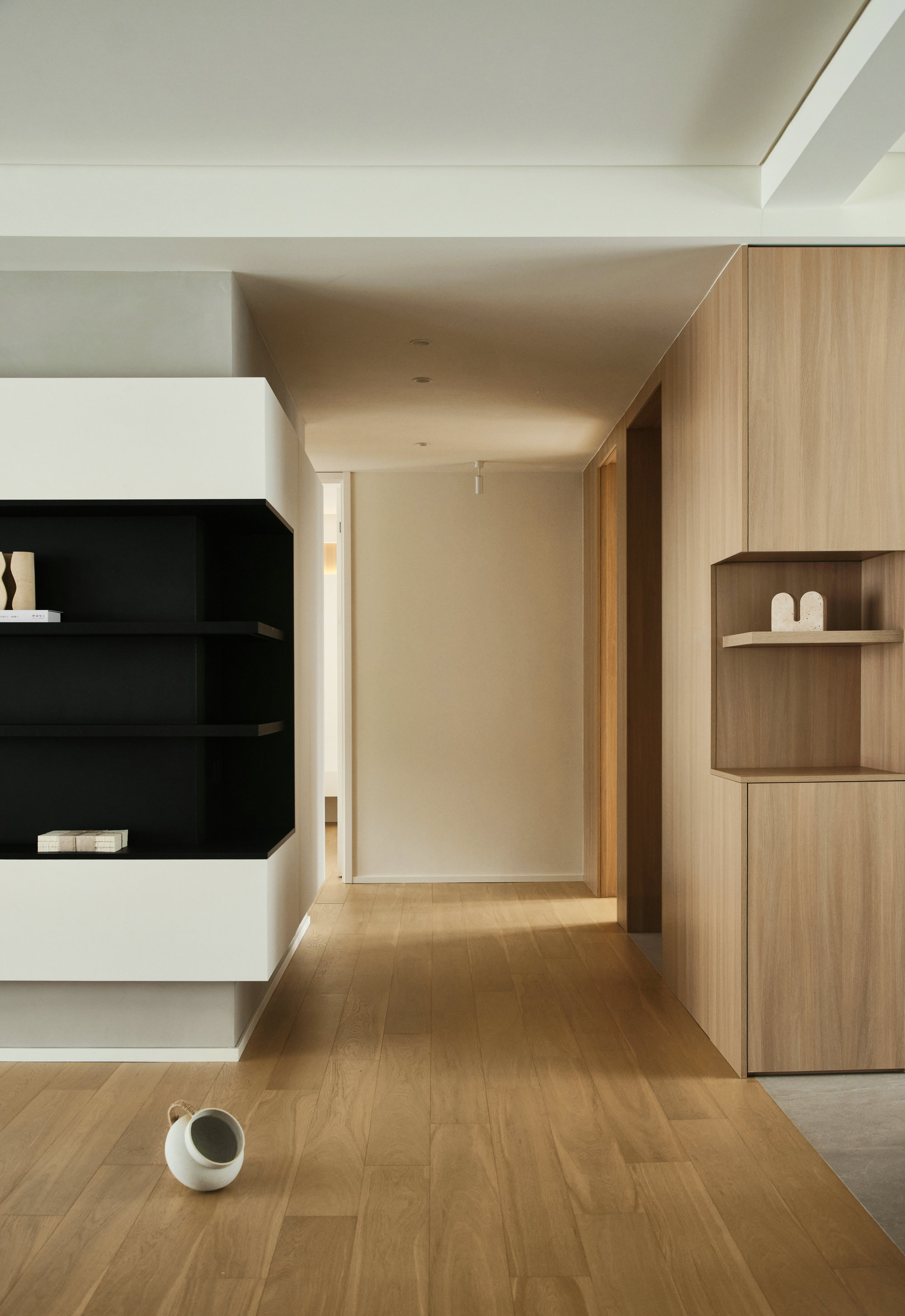 主卫门正对卧室床怎么办?用一道多功能墙体(L型衣柜) 重新定义空间关系。不仅挡住了卫生间门,形成了视觉和心理上的双重屏障。无论是从床上还是卧室门口,再也看不到卫生间啦。“顶空+中空” 的设计避免了实墙带来的拥堵和压抑感。 -