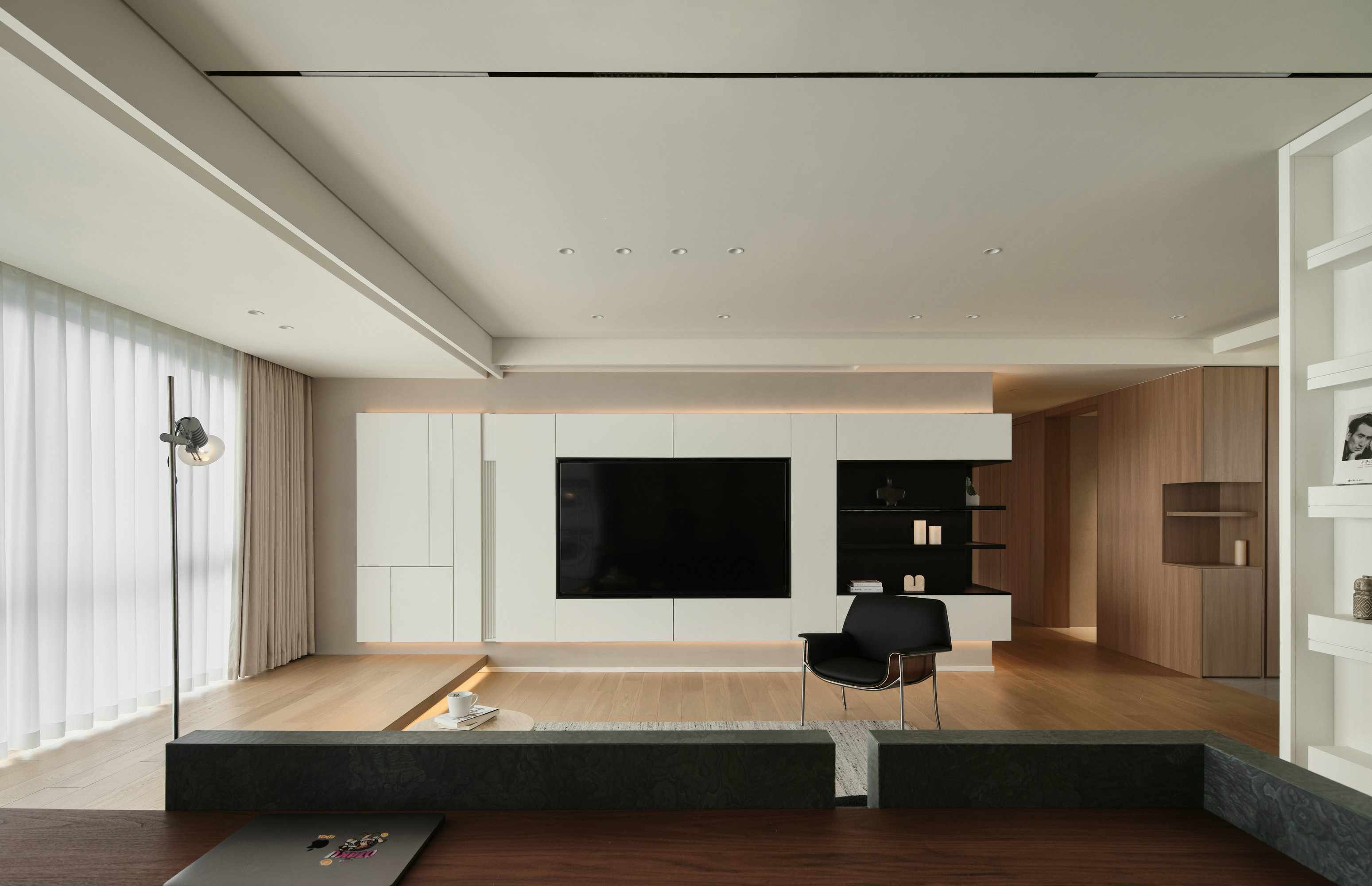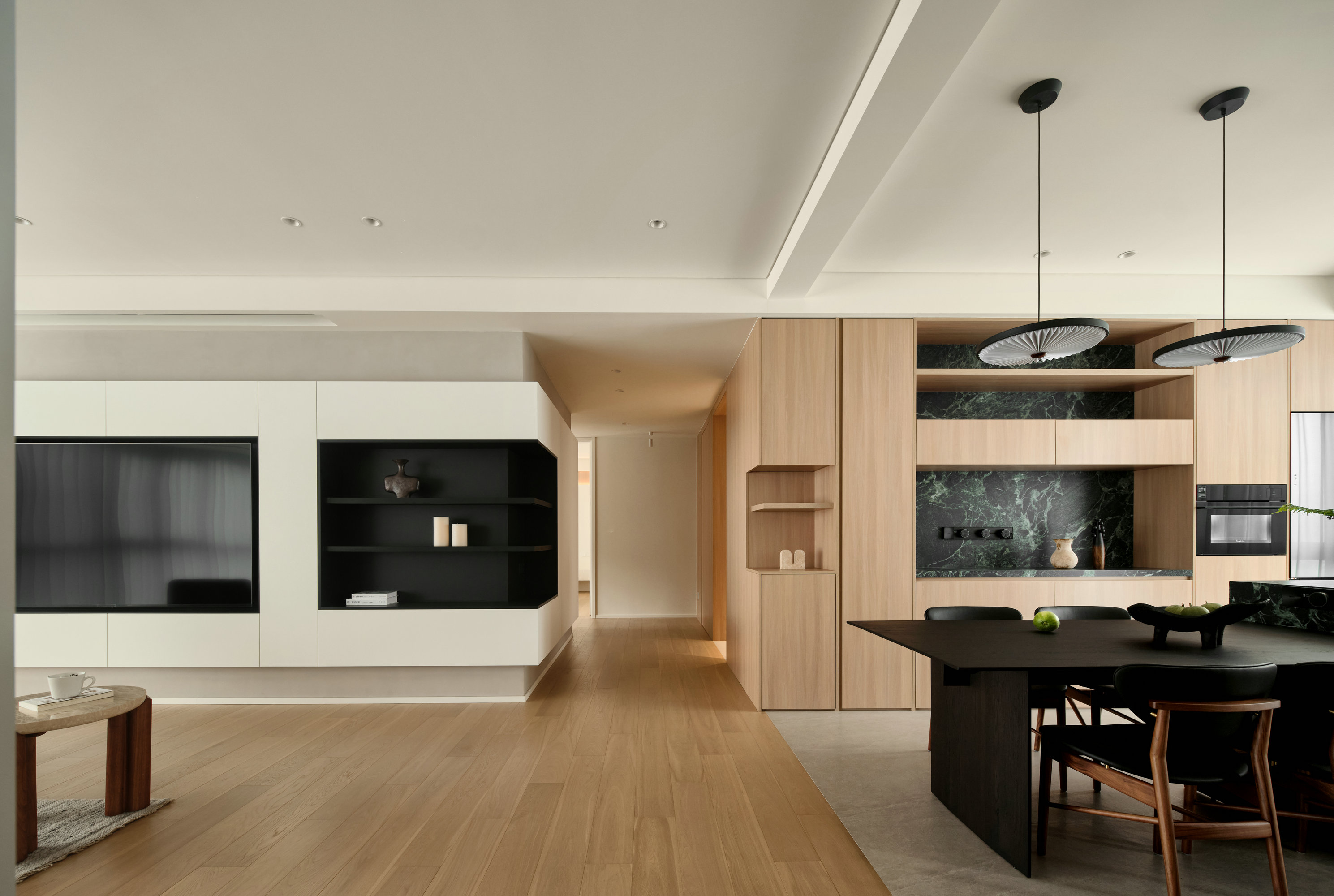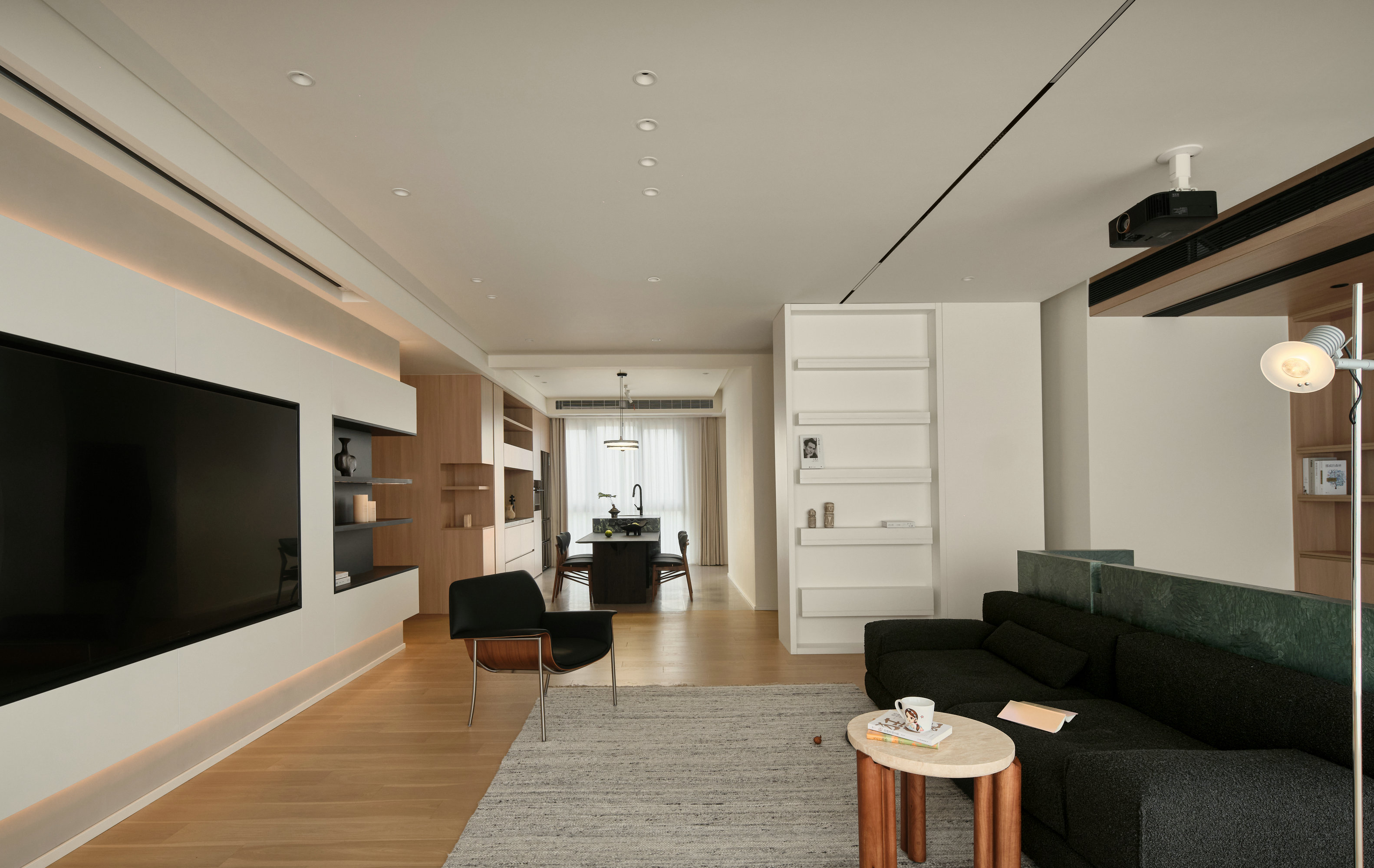 “收纳延伸式电视墙”,打破了传统意义上“电视背景墙”只是一个独立面的概念,而是将其视为一个连续的、整体的画面。